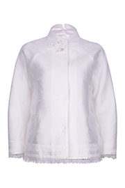 This blouse is made of 100% mulberry silk, with lace stitching and a metallic ribbon on the front. An elegant and timeless item for spring summer season.