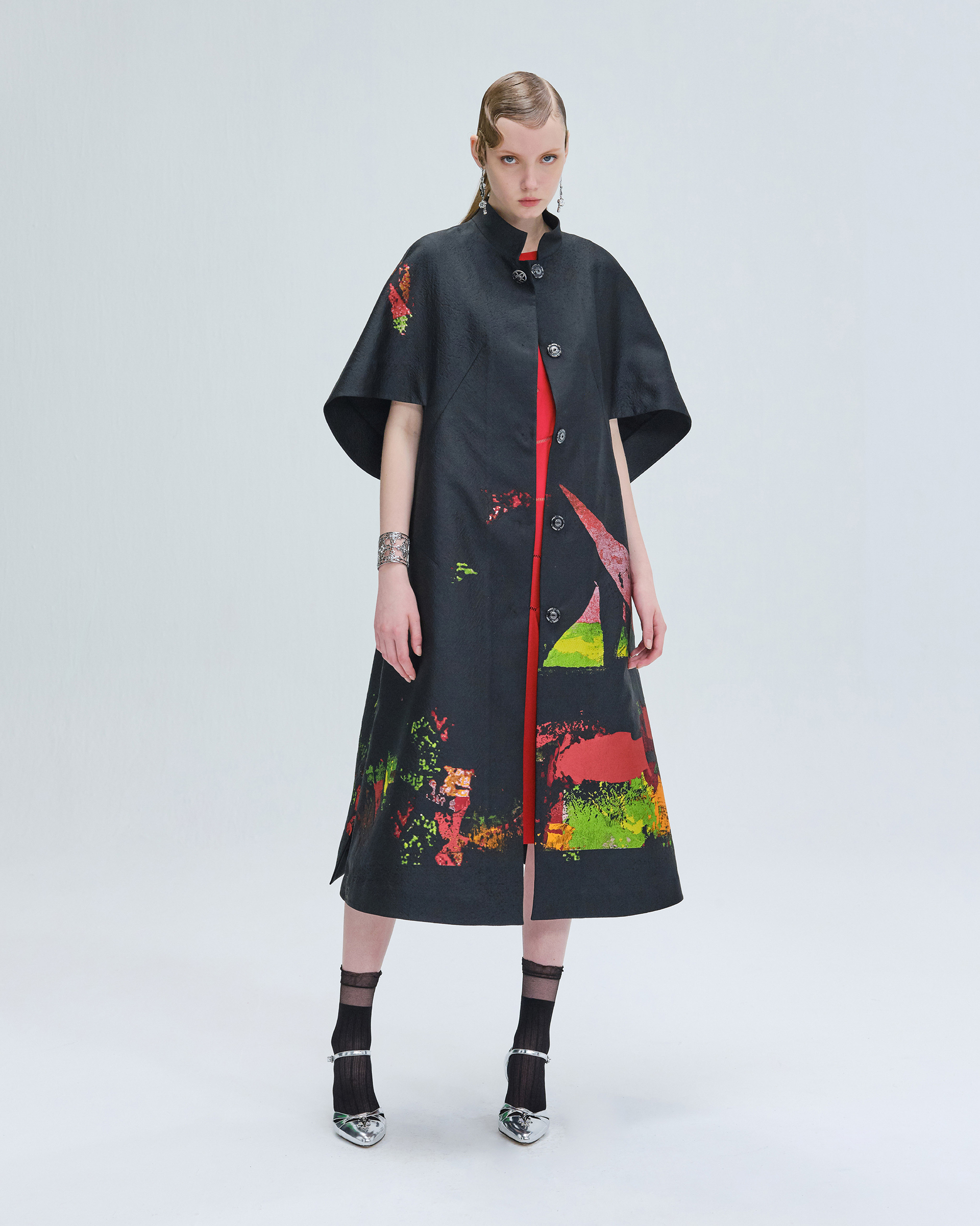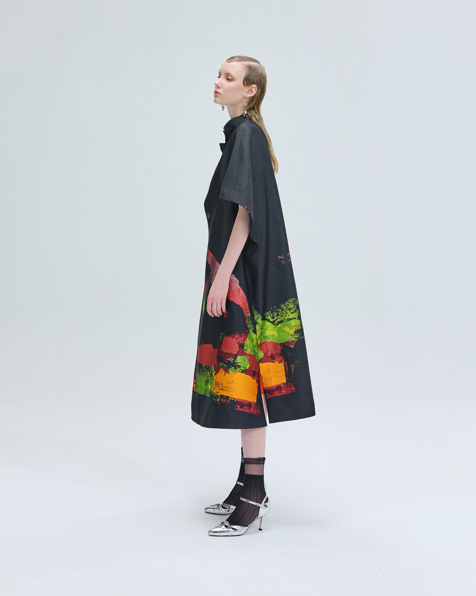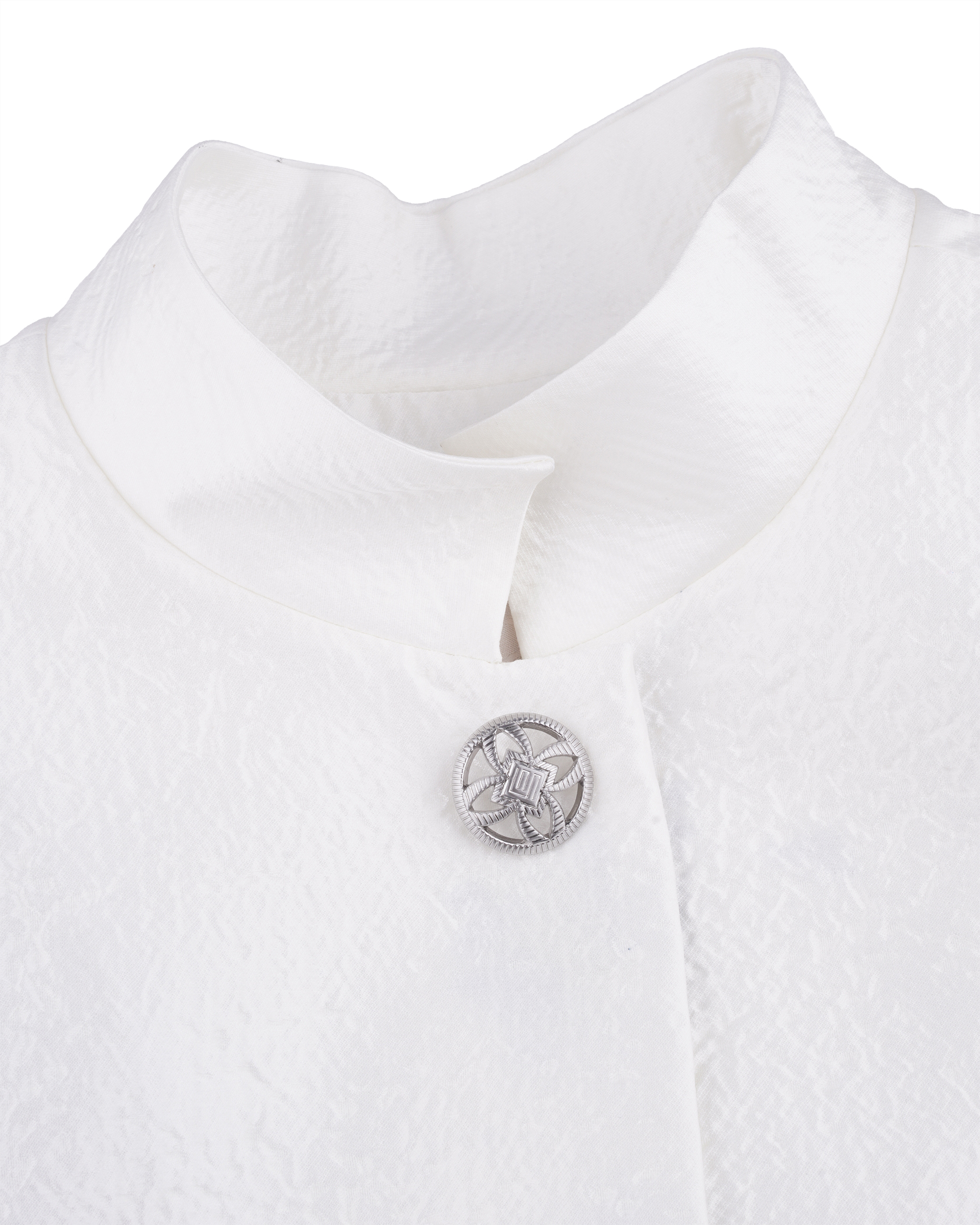 This collar long jacket is made of silk-blend fabric with totem print, which retains the traditional classics while incorporating modern fashion elements.