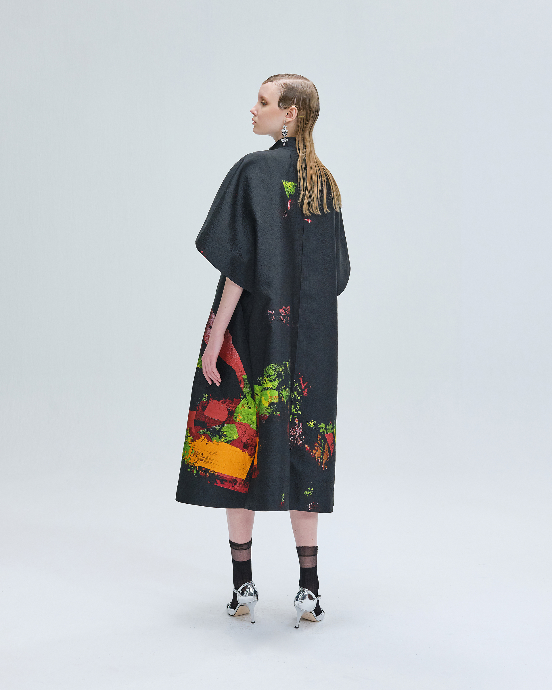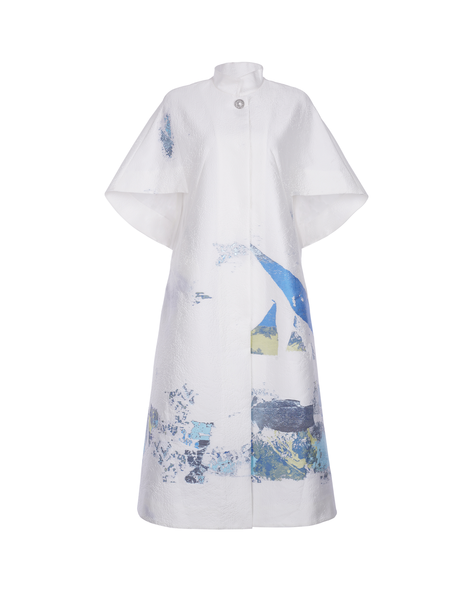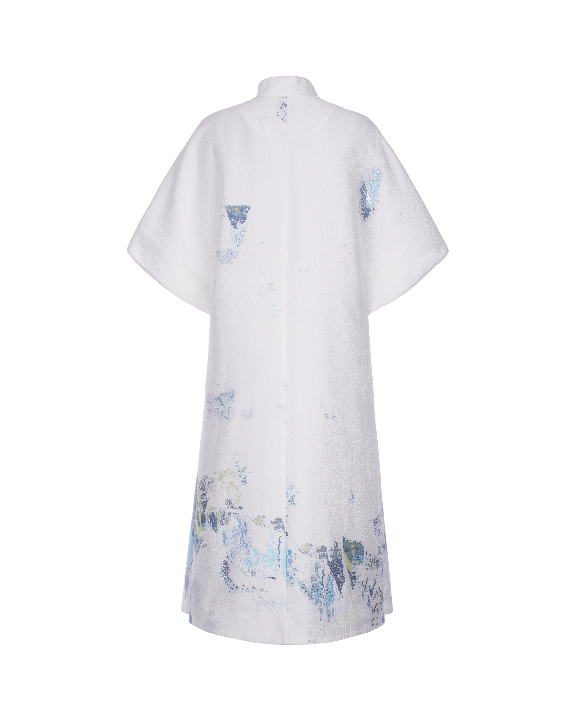 This collar long jacket is made of silk-blend fabric with totem print, which retains the traditional classics while incorporating modern fashion elements.