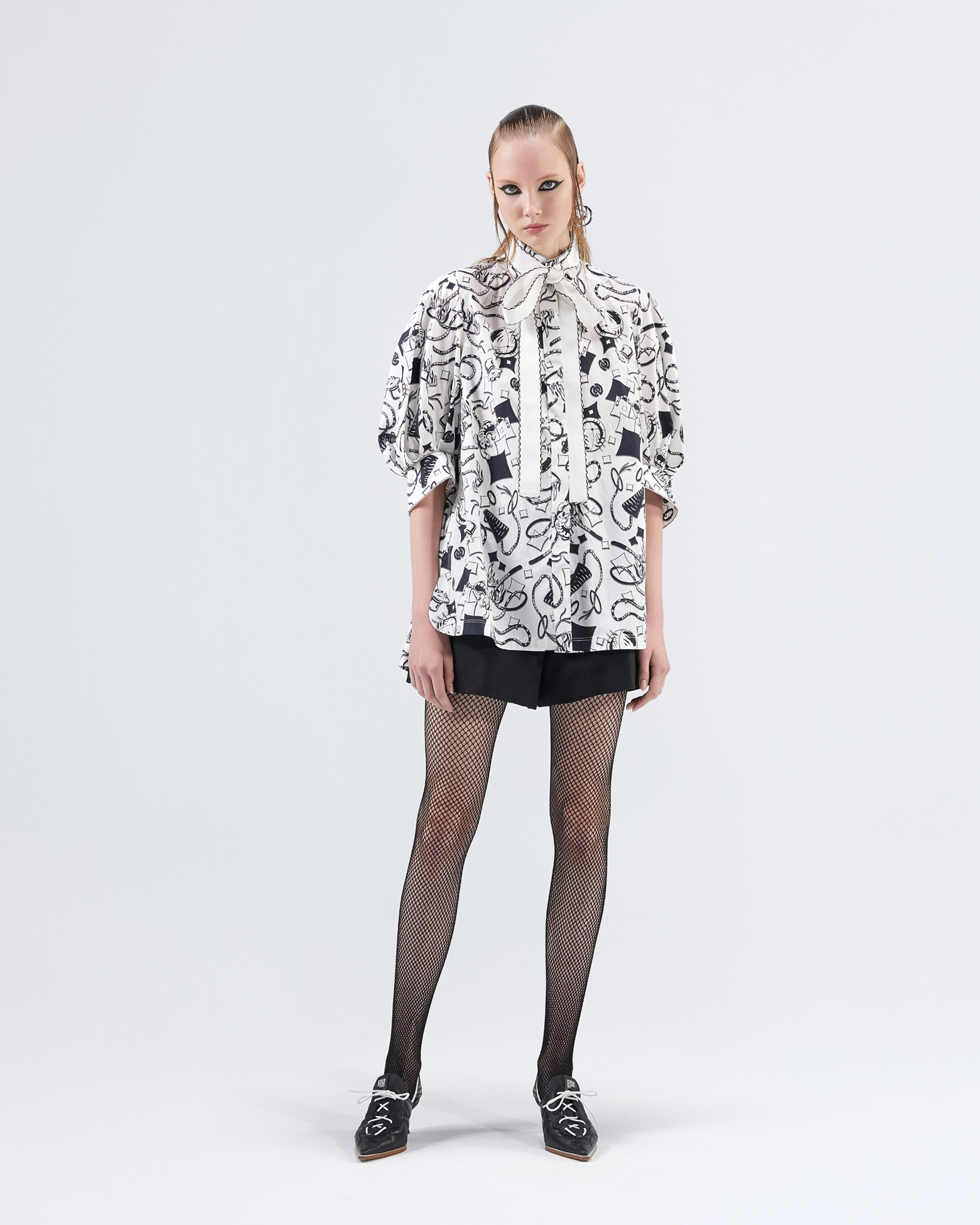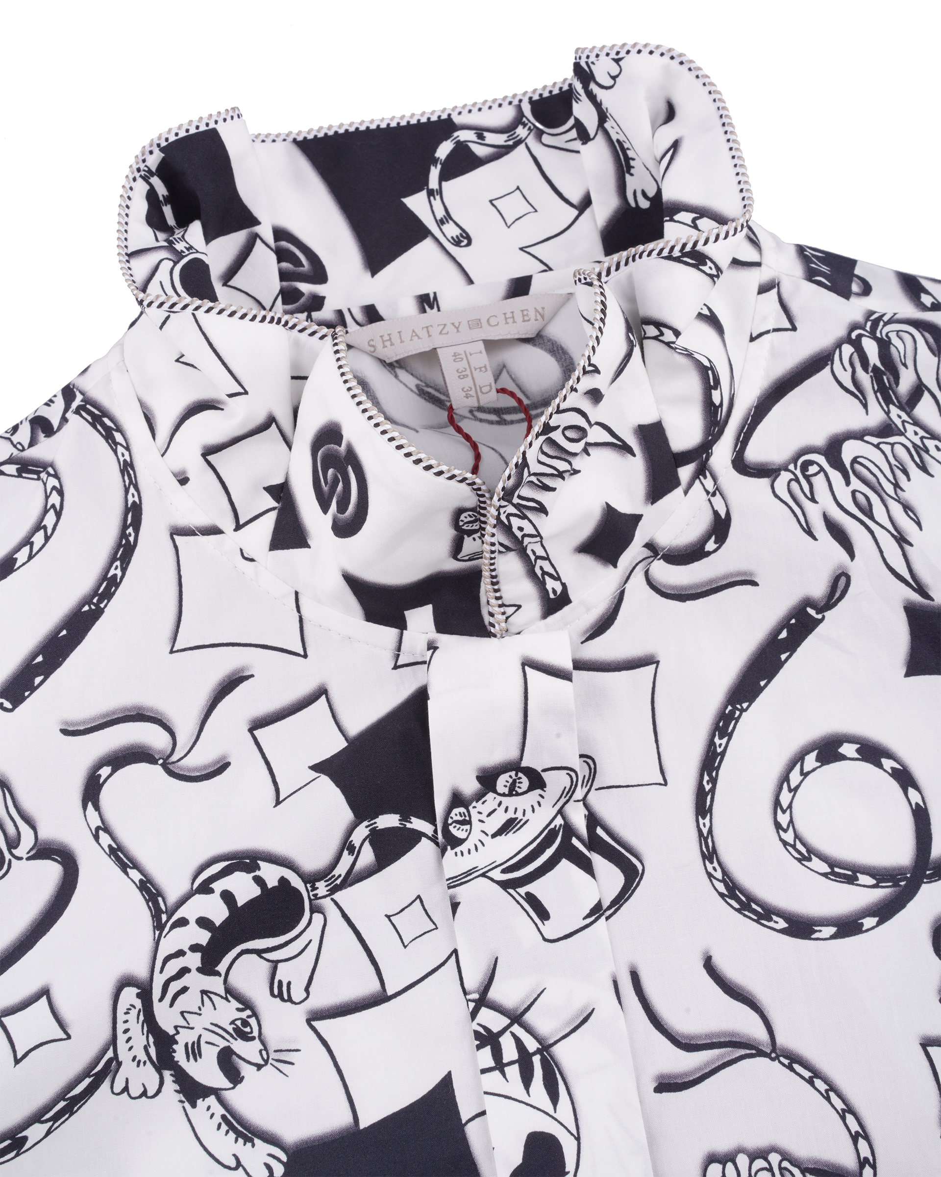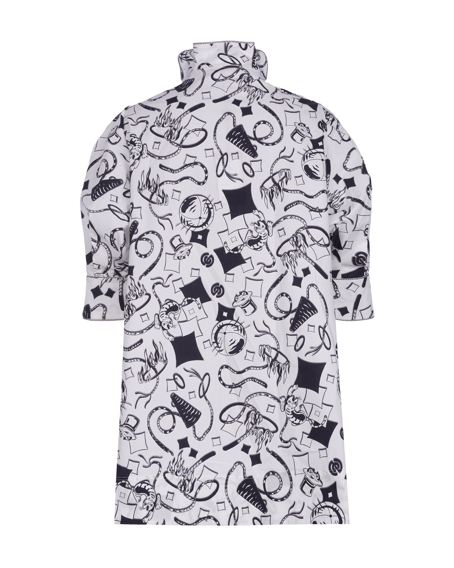 This season's dazzling colorful printed totem perfectly brings out the circus's joyful and wonderful main axis, specially made in Italy, printed on skin-friendly high-density cotton, the overall touch is in line with the needs of spring and summer, showing a leisurely, yet individualistic style. In addition to the fit of the short-sleeved wide Mandarin stand-up collar shirt with a youthful feel, this women's top is combined with a full totem, combining the classic and youthful cool style.