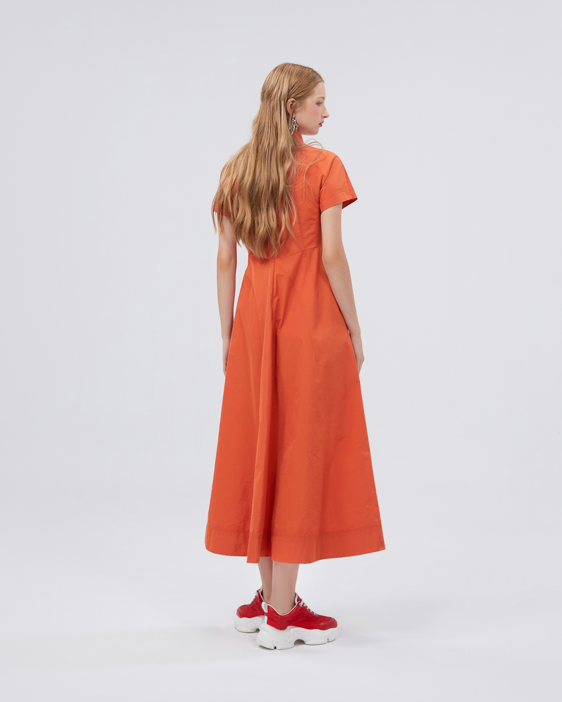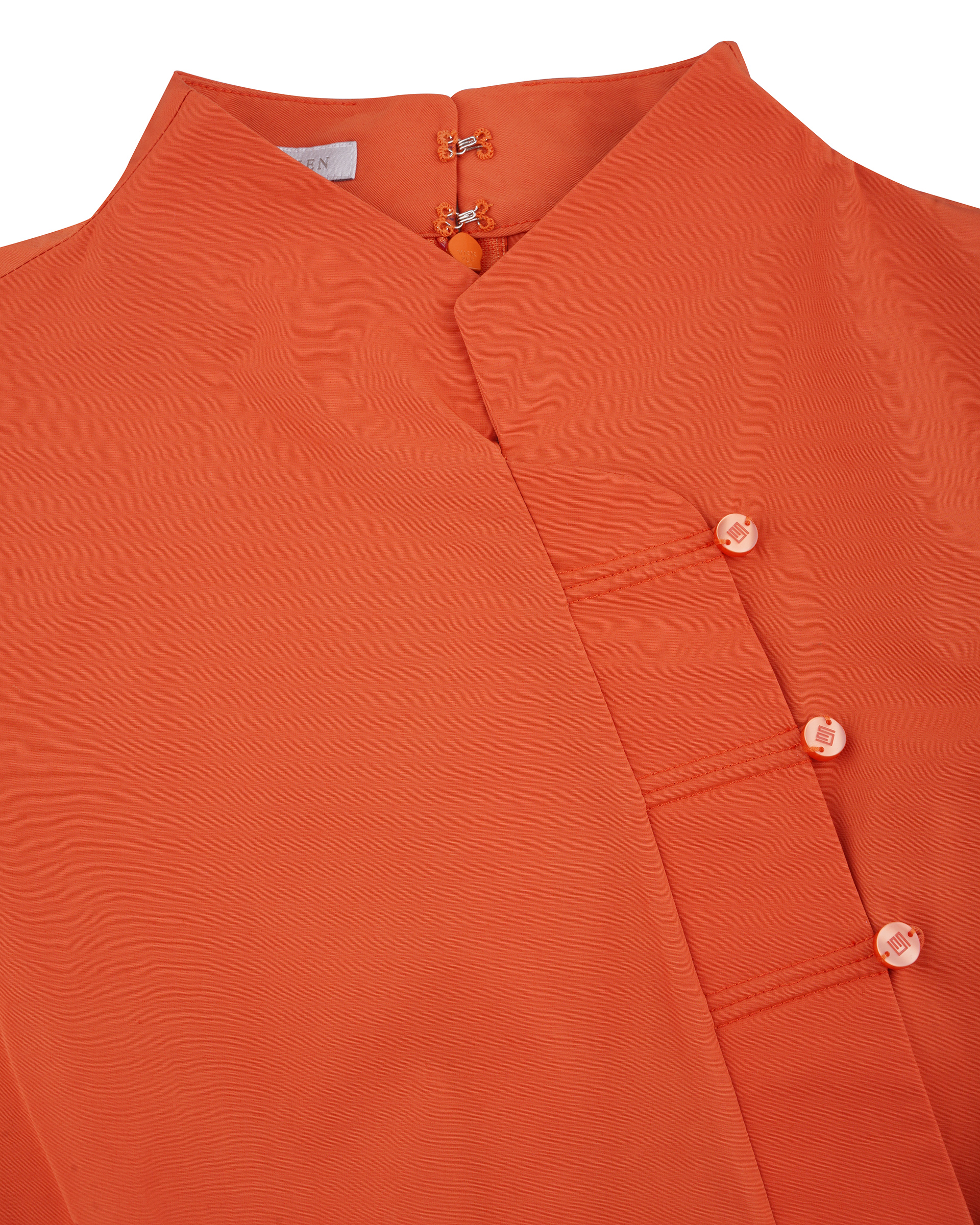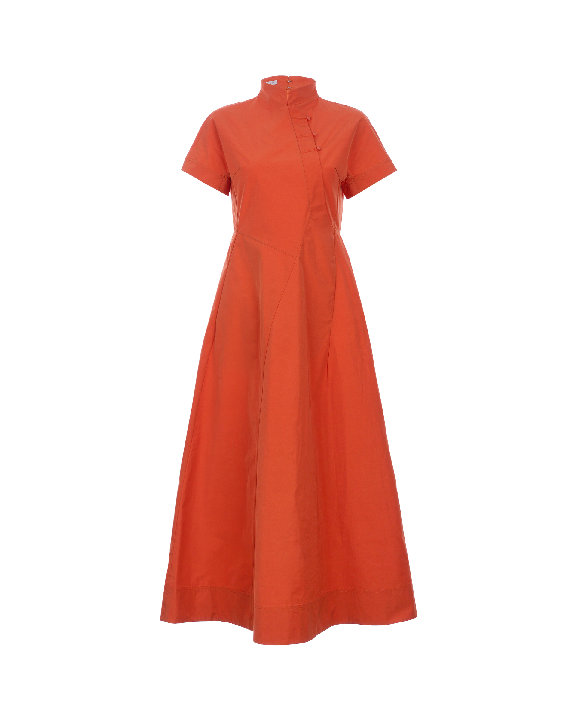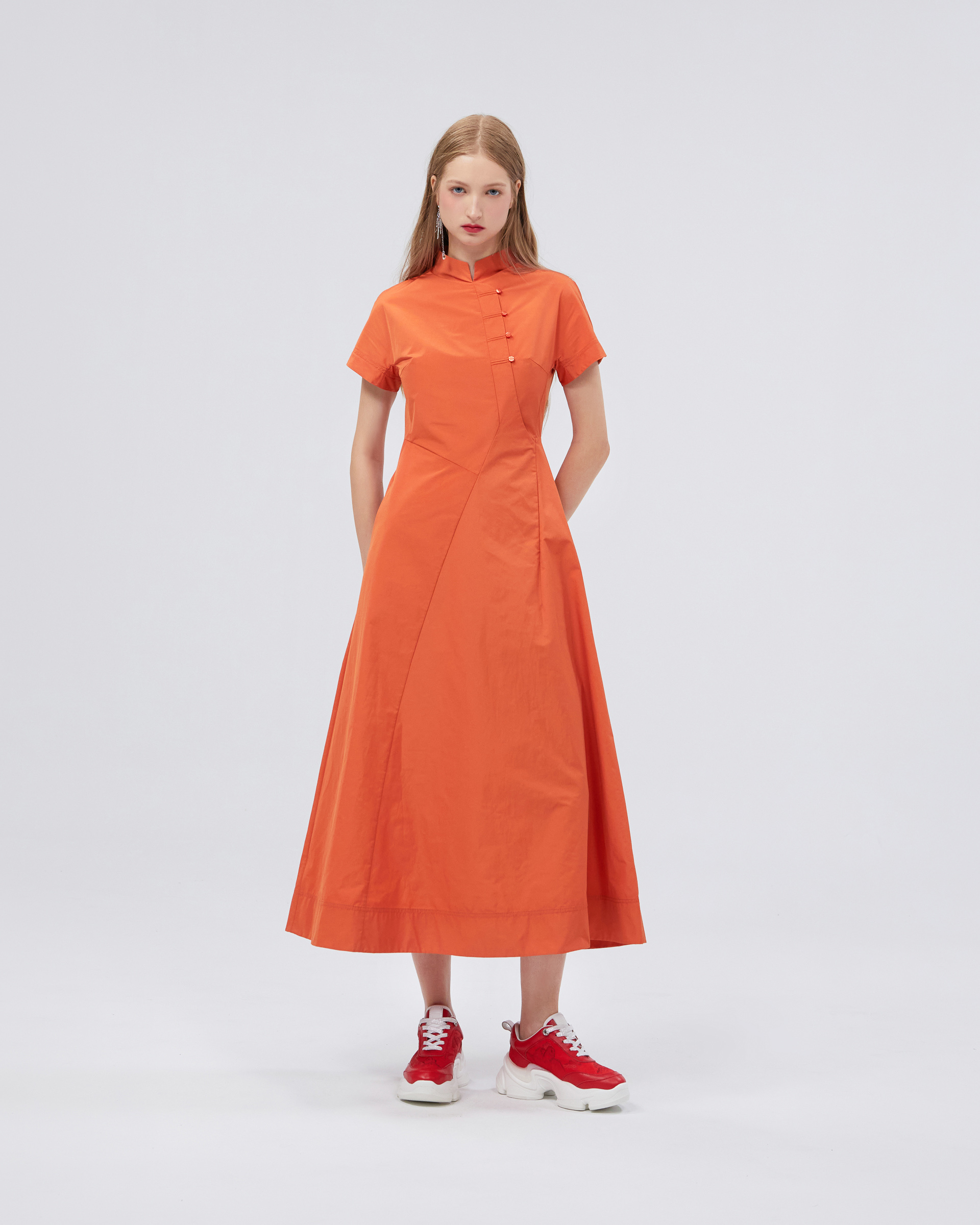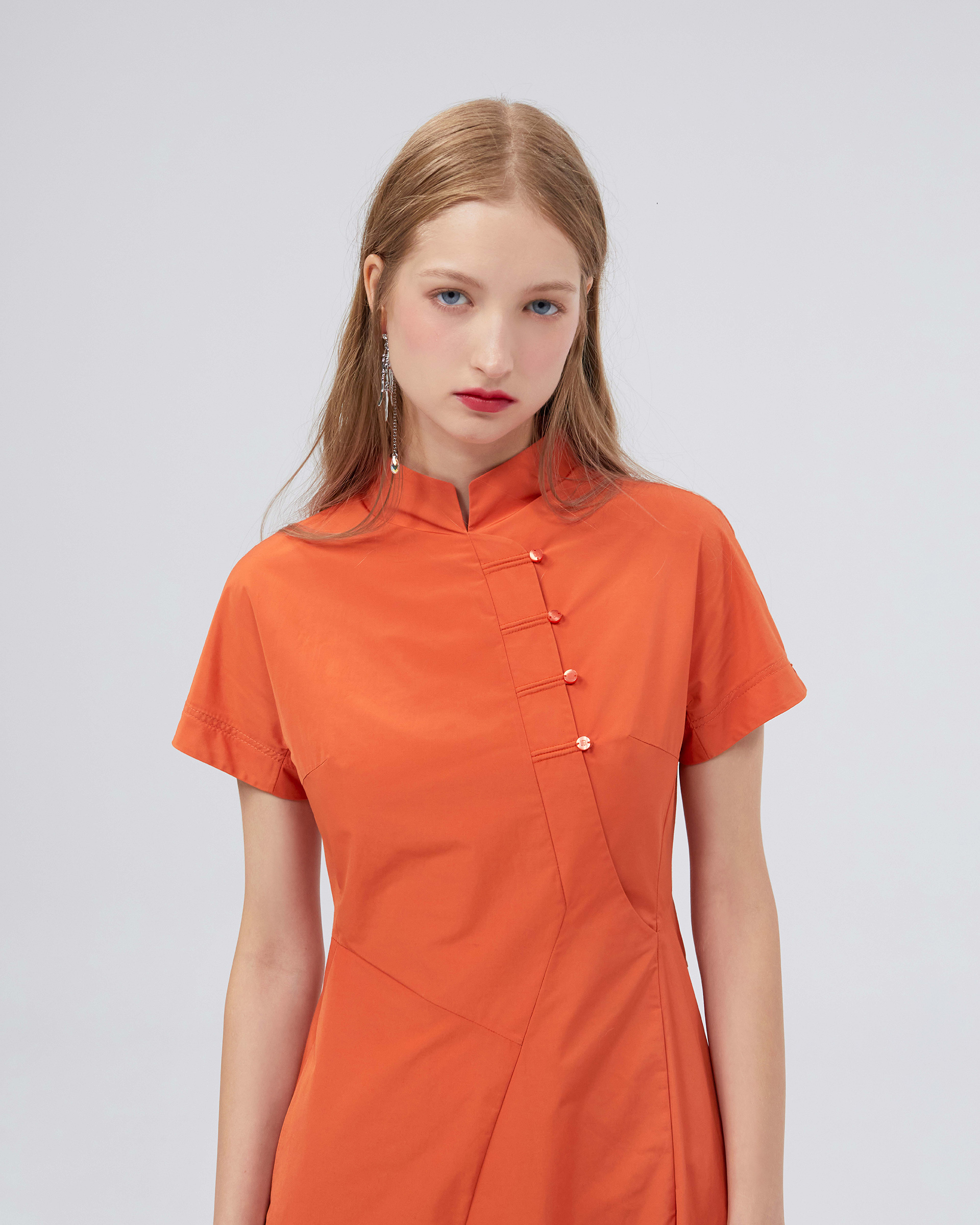 This series continues the breath of youth and elegant posture, smooth and rounded contour and material bring gentle visual effects to the whole. This dress is made of skin-friendly fabric, with a classic mandarin stand-up collar, showing the indifferent but still angular quality of spring, and oblique display of the low-key luxury craftsmanship in the Eastern aesthetic.