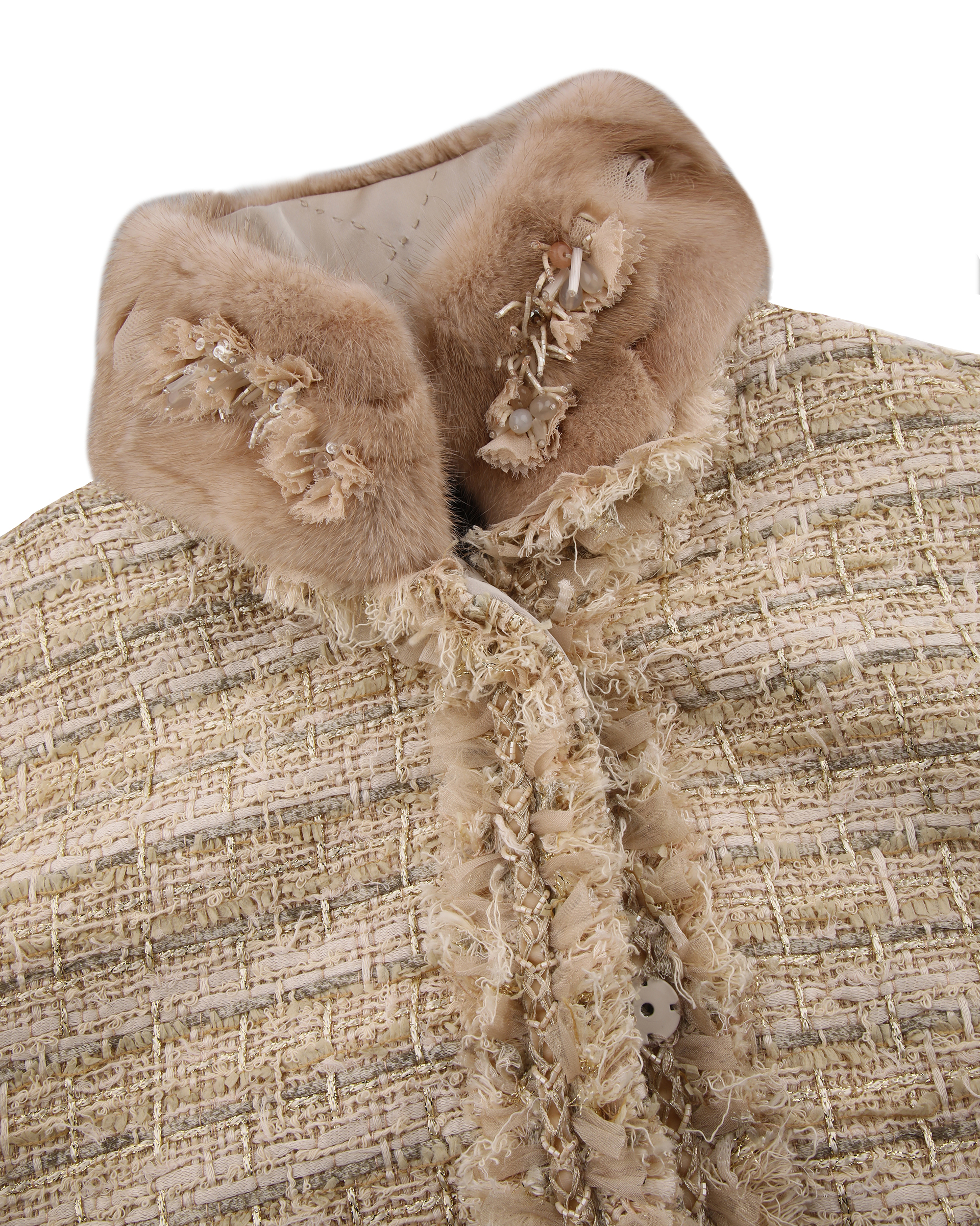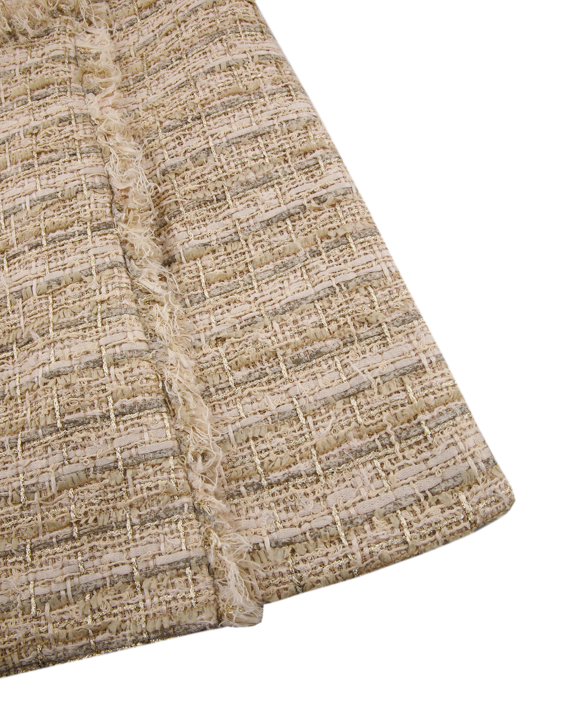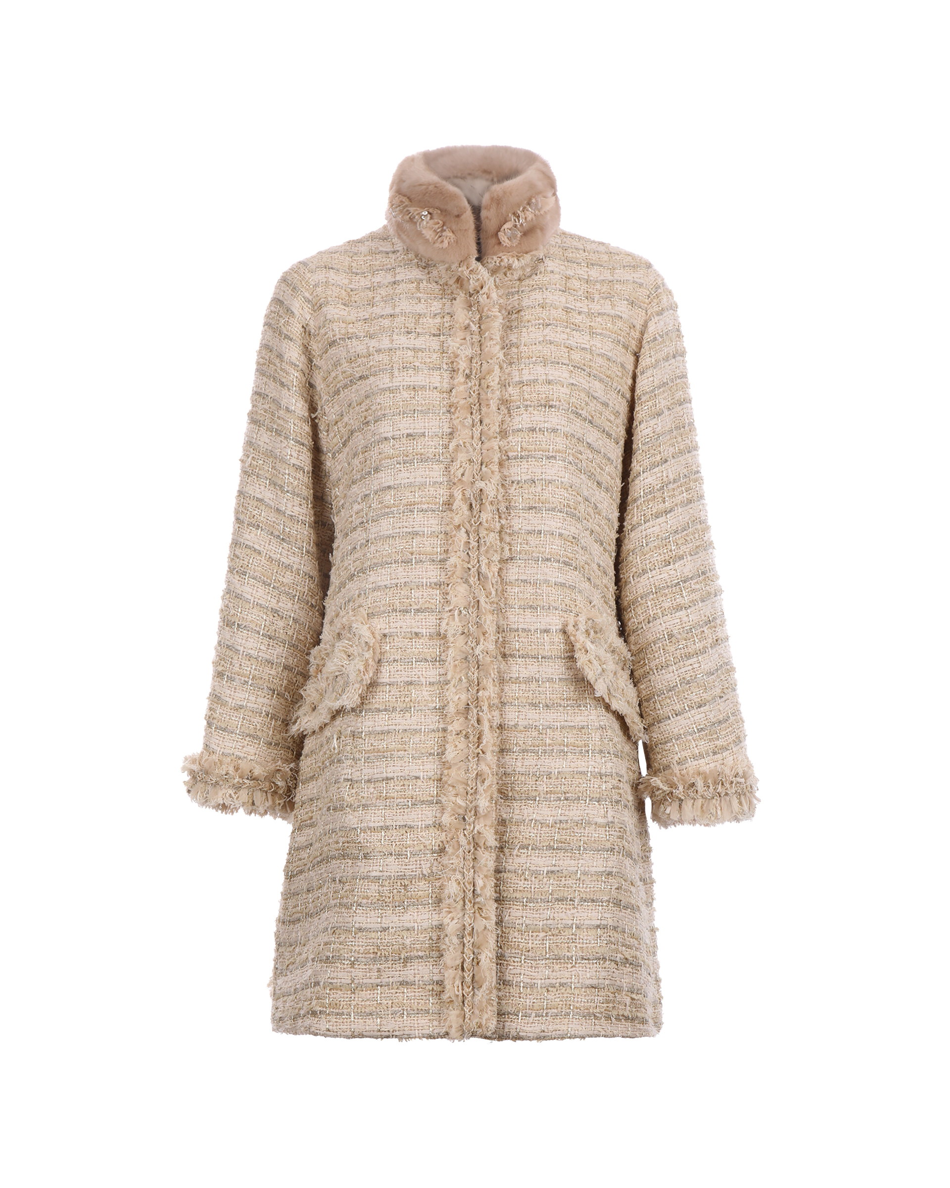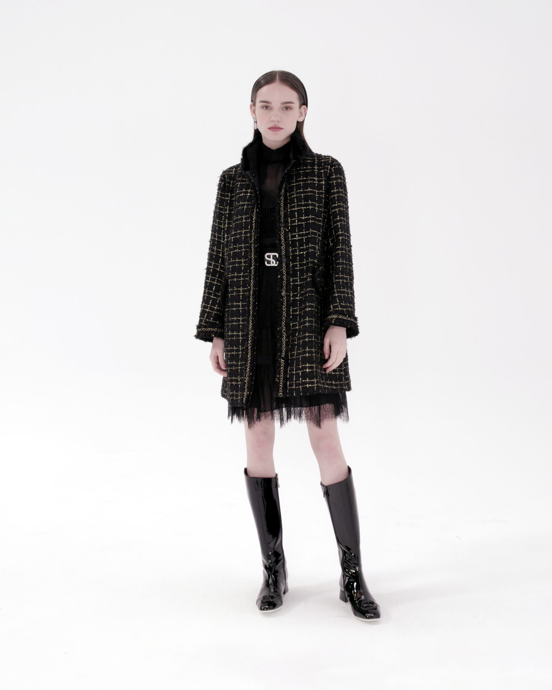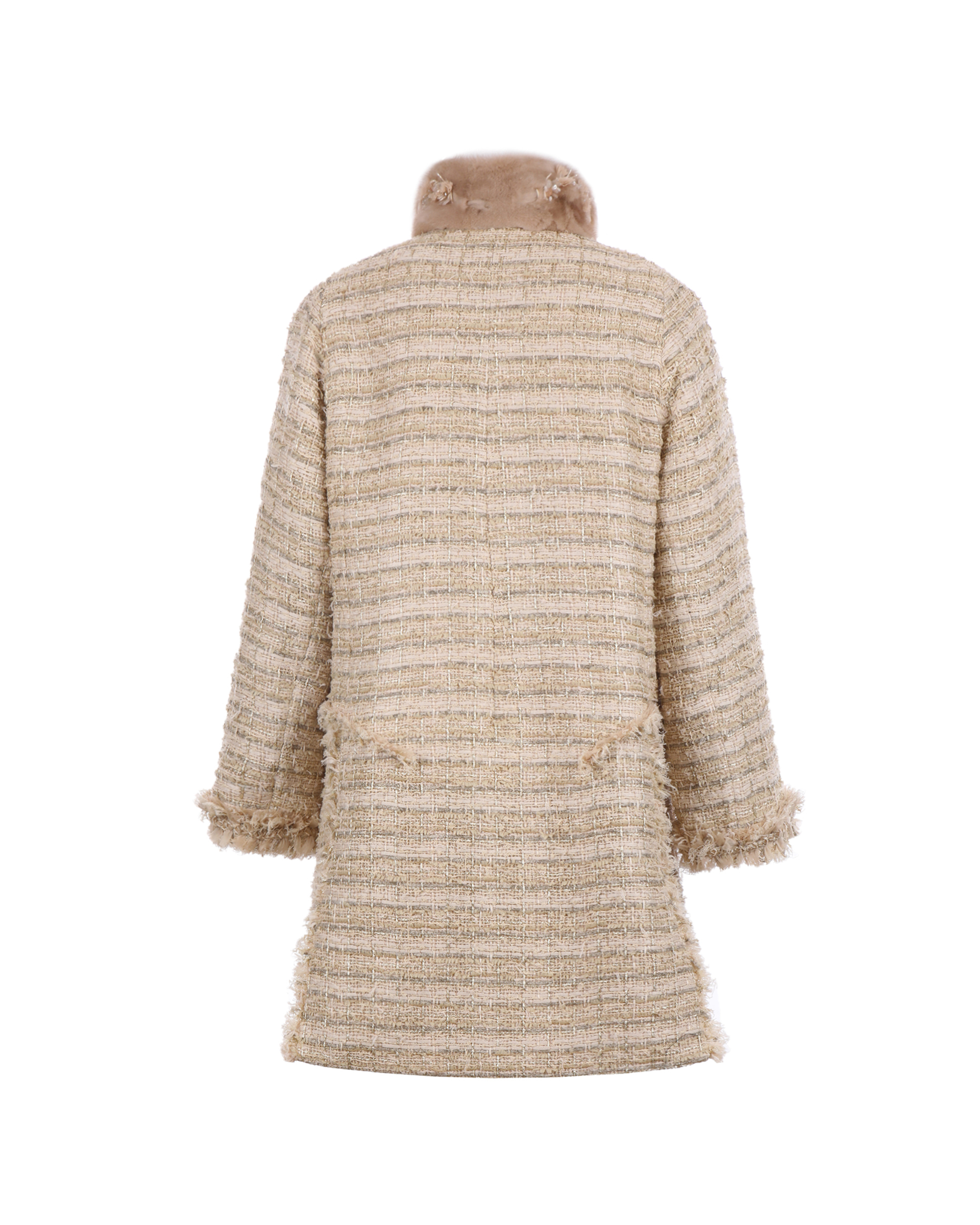 The coat is made of mixed wool fabric, which contains metallized lines to add luxury to an understated design. It can be paired with the same series of pants to create a beautiful look.