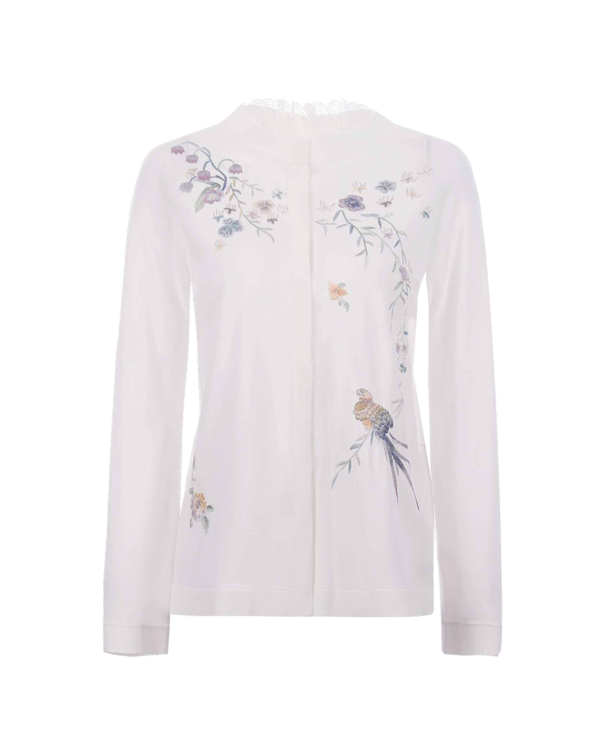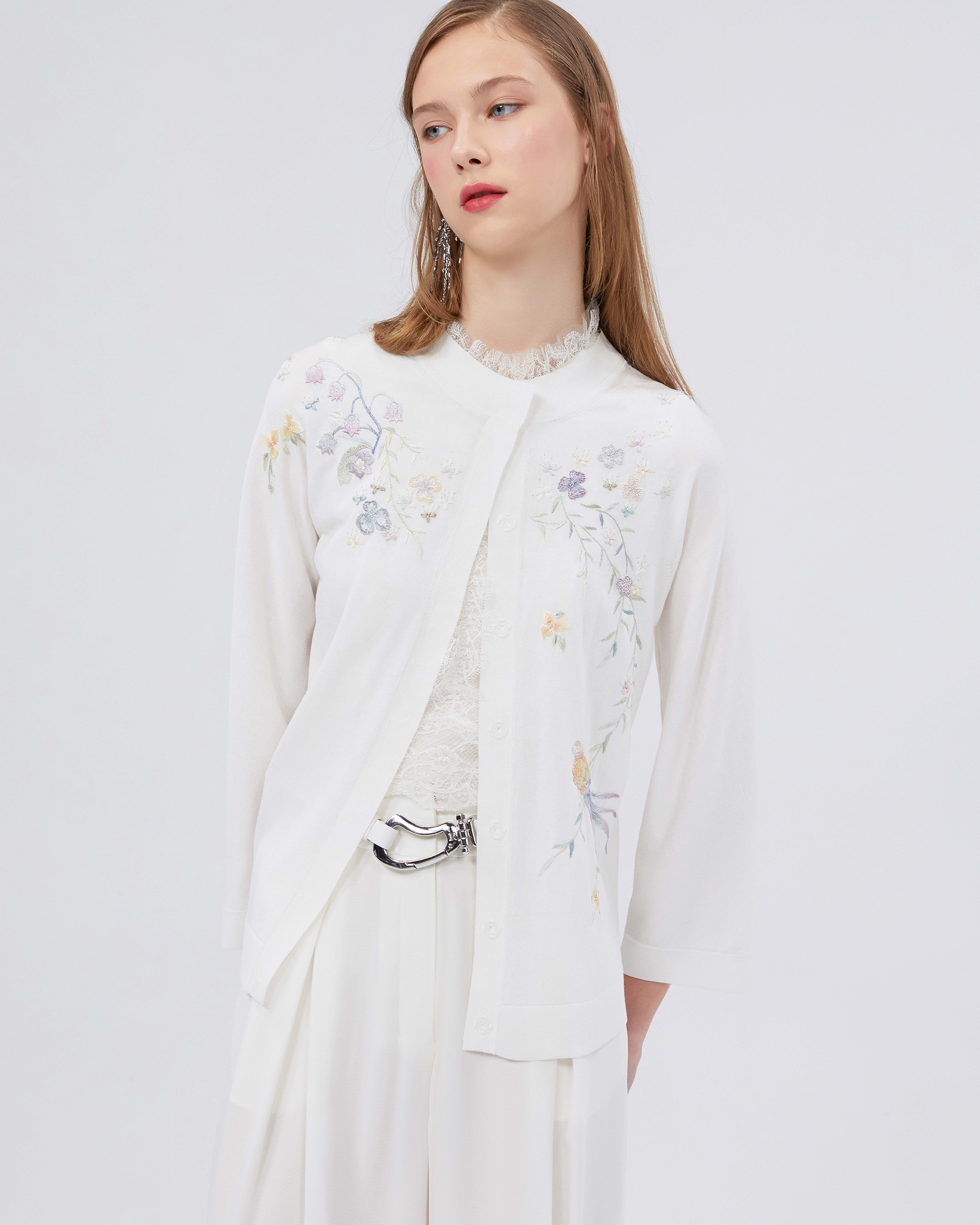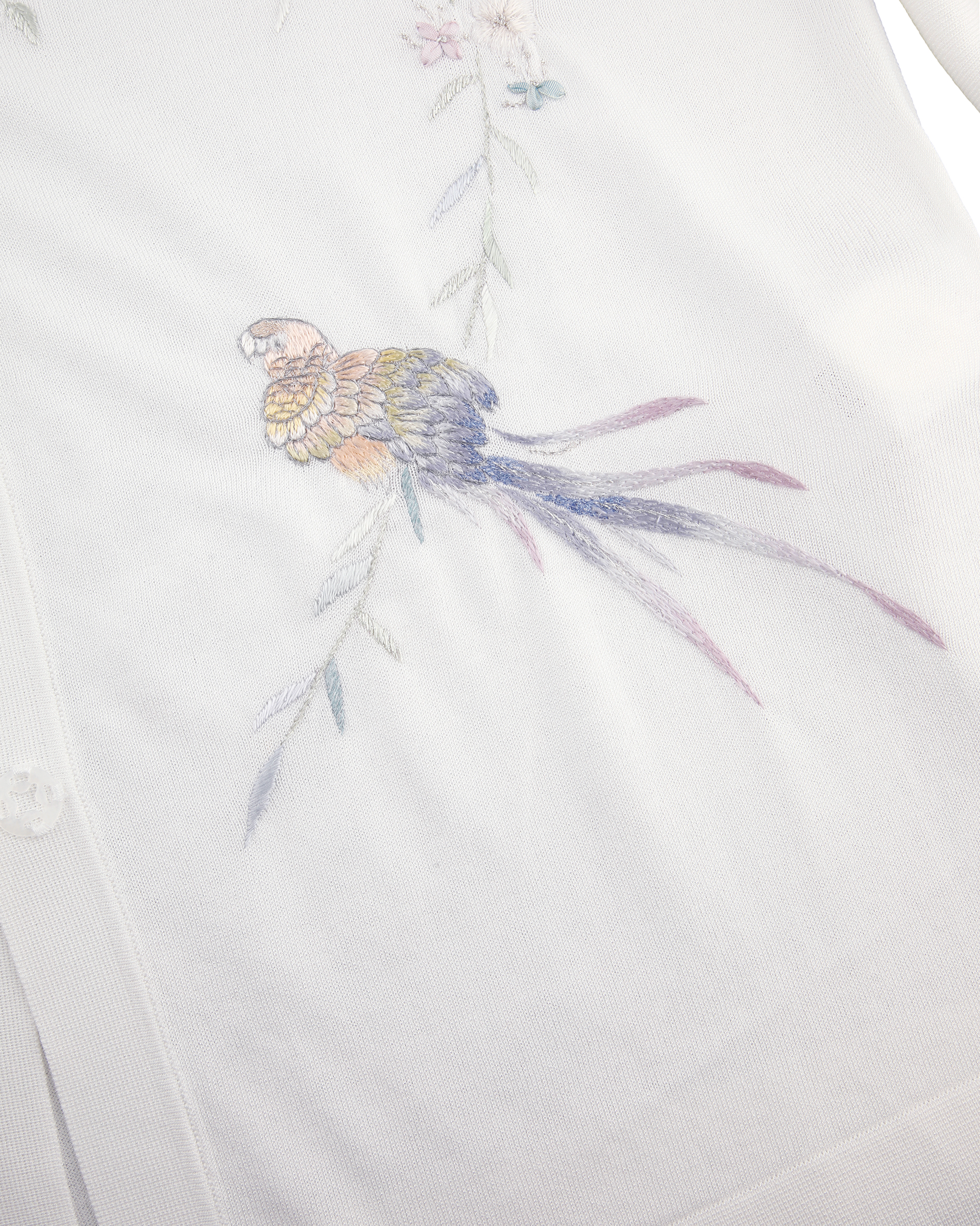 This series takes spring flowers as the main totems, and parrots as the focus to show the impression of abundant colors, birds' singing and flowers in spring. This cardigan is made of cotton blended fabric. A large amount of ginseng needle embroidery is used on the body to show delicate color, and a small amount of seed embroidery adds tridimensional texture.