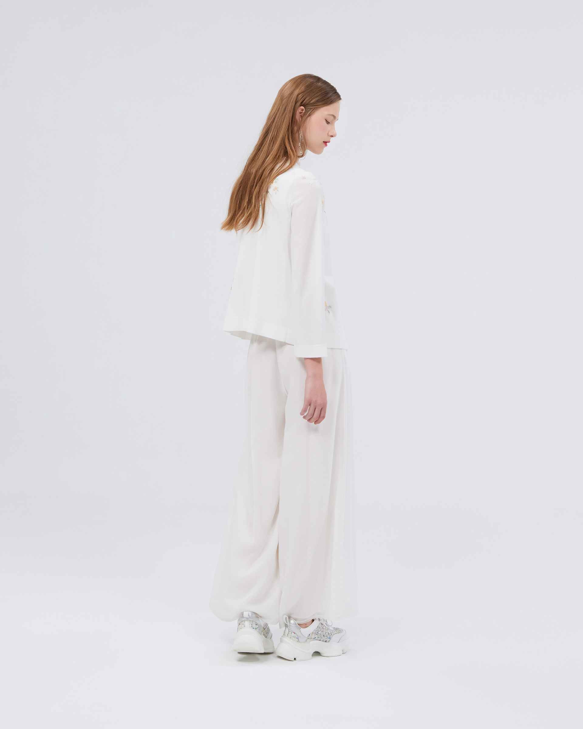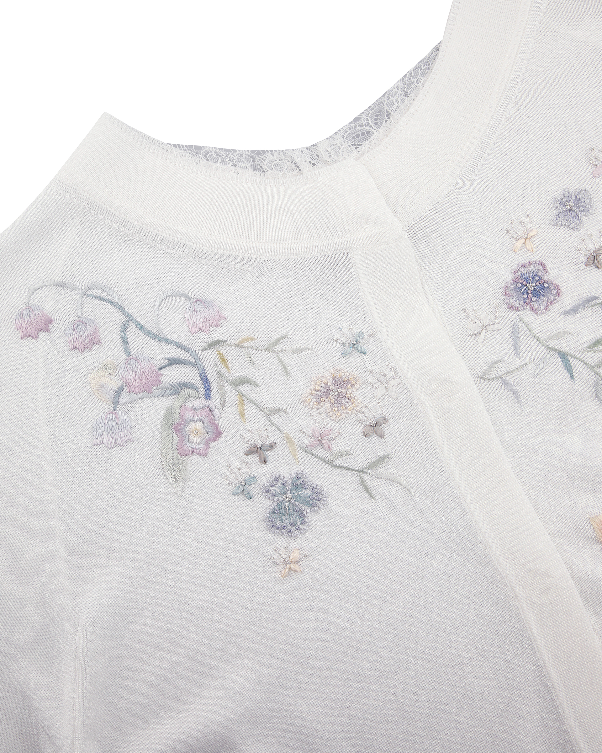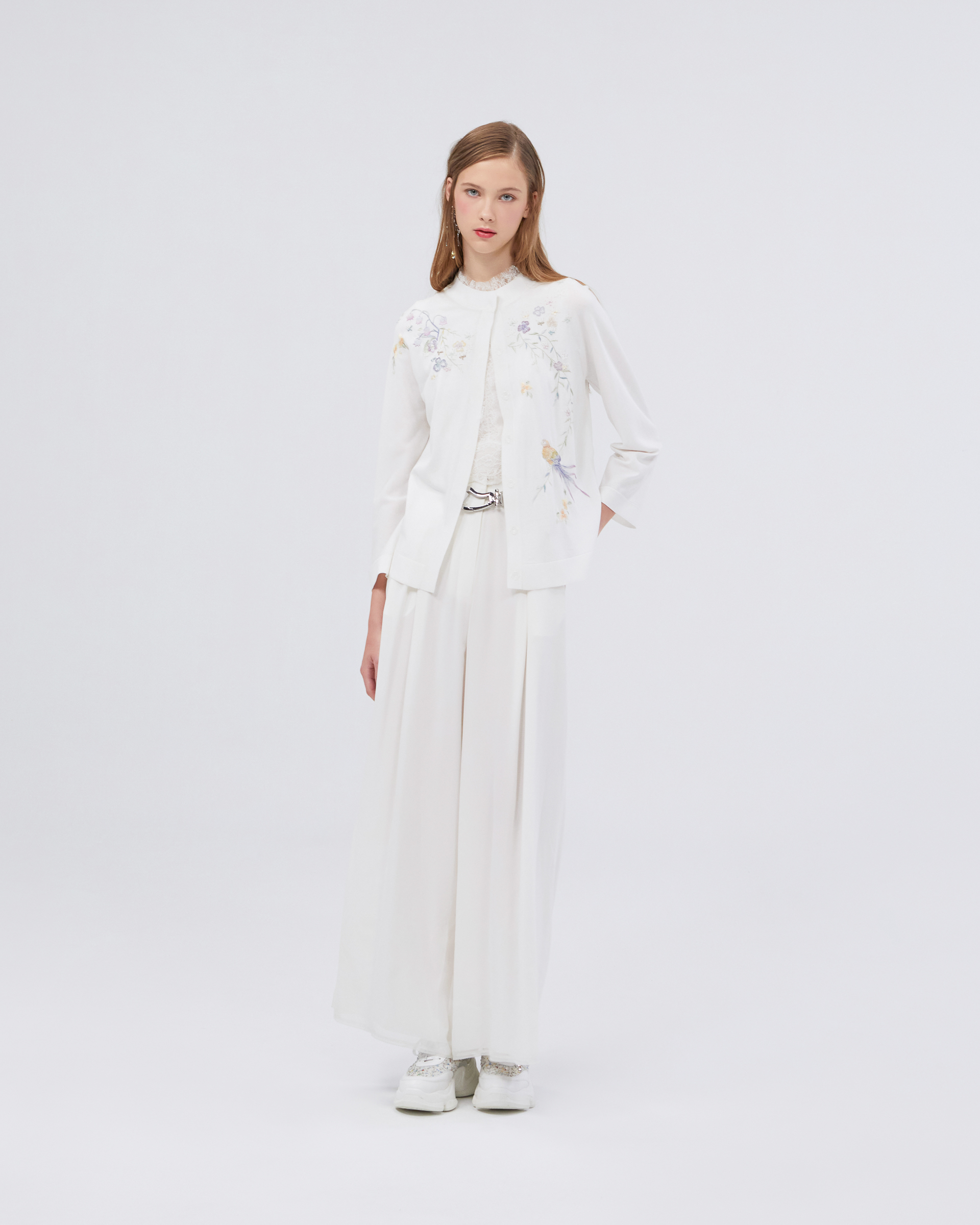 This series takes spring flowers as the main totems, and parrots as the focus to show the impression of abundant colors, birds' singing and flowers in spring. This cardigan is made of cotton blended fabric. A large amount of ginseng needle embroidery is used on the body to show delicate color, and a small amount of seed embroidery adds tridimensional texture.