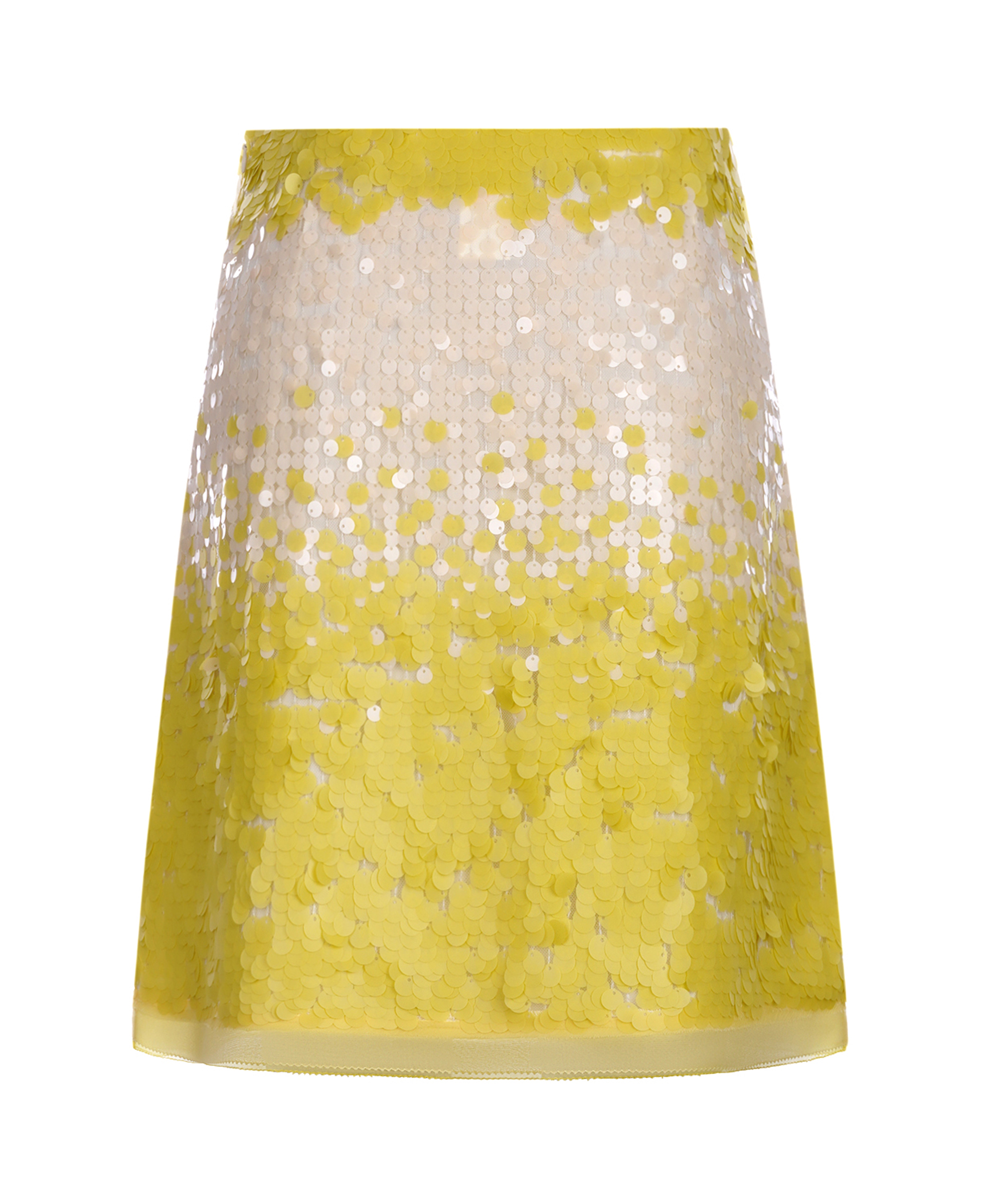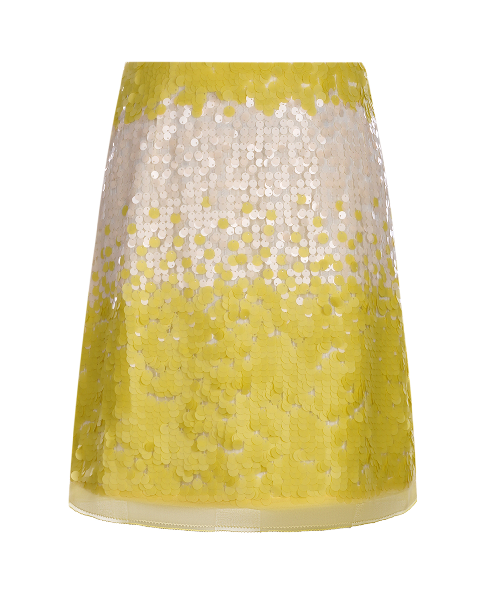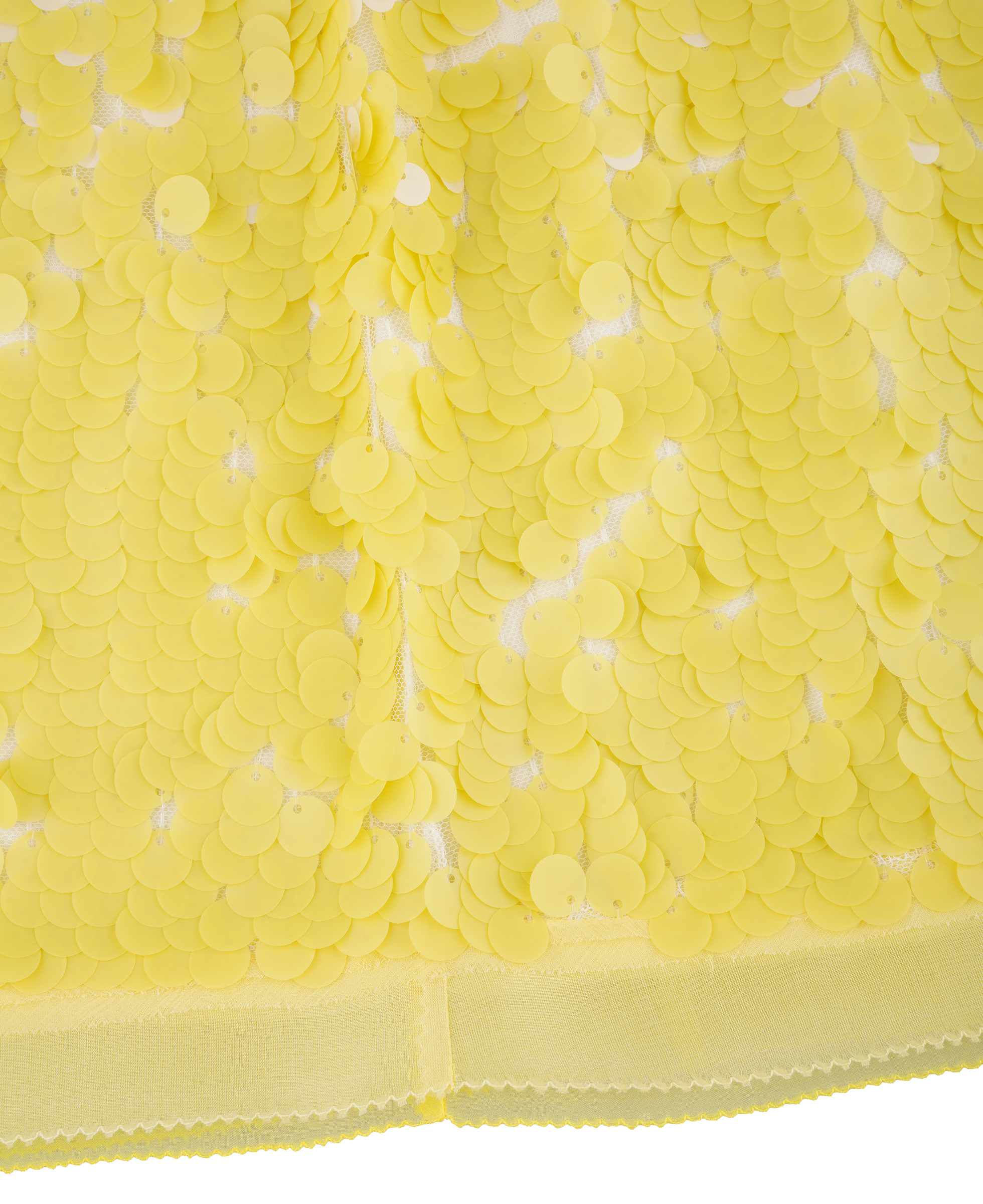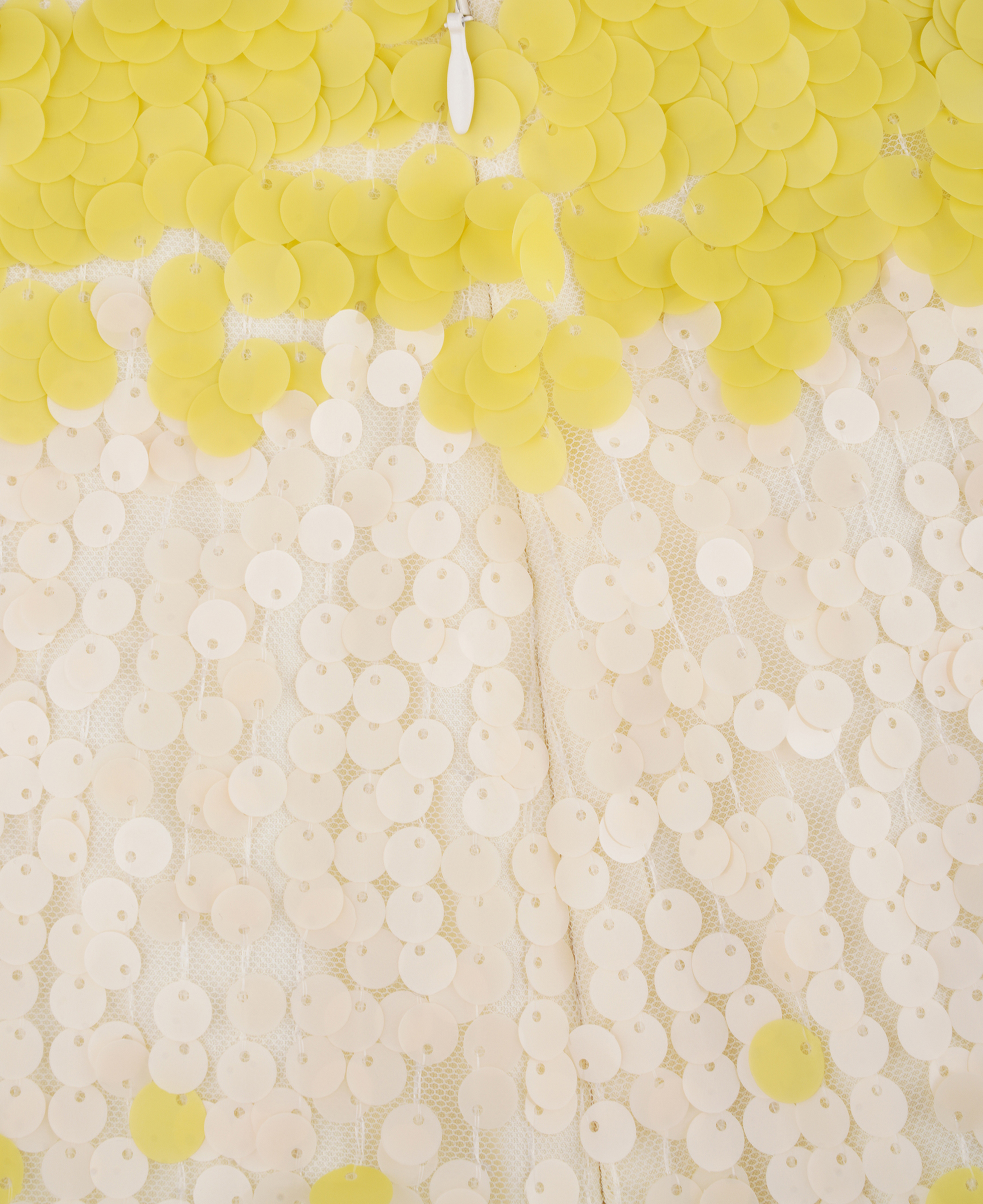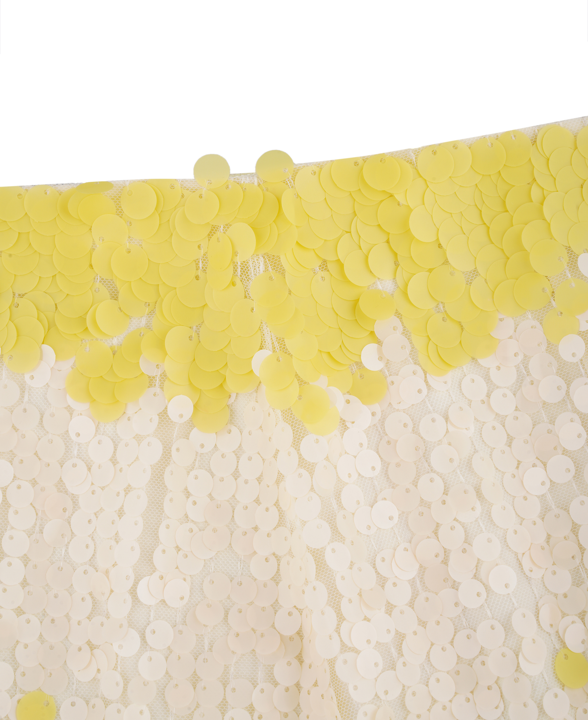 The sequined fabric showed the fearlessness of the '60s in a broad, two-tone stripe look. This sequin skirt is the perfect balance of glitzy glitz through a bright, spiritual yellow system and a comfortable, slim cut, reliving the '60s fashion that burst out through a woman's thin body.