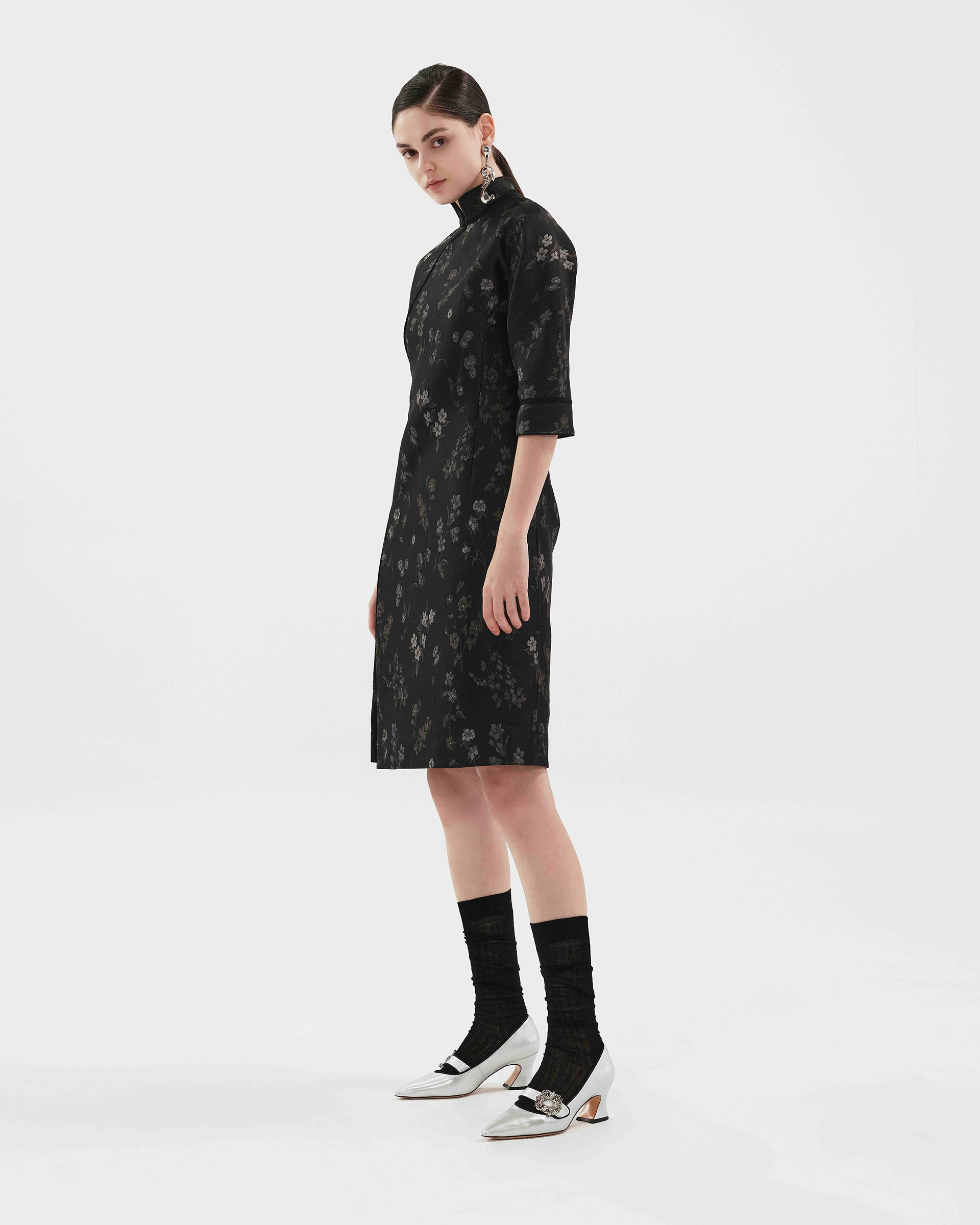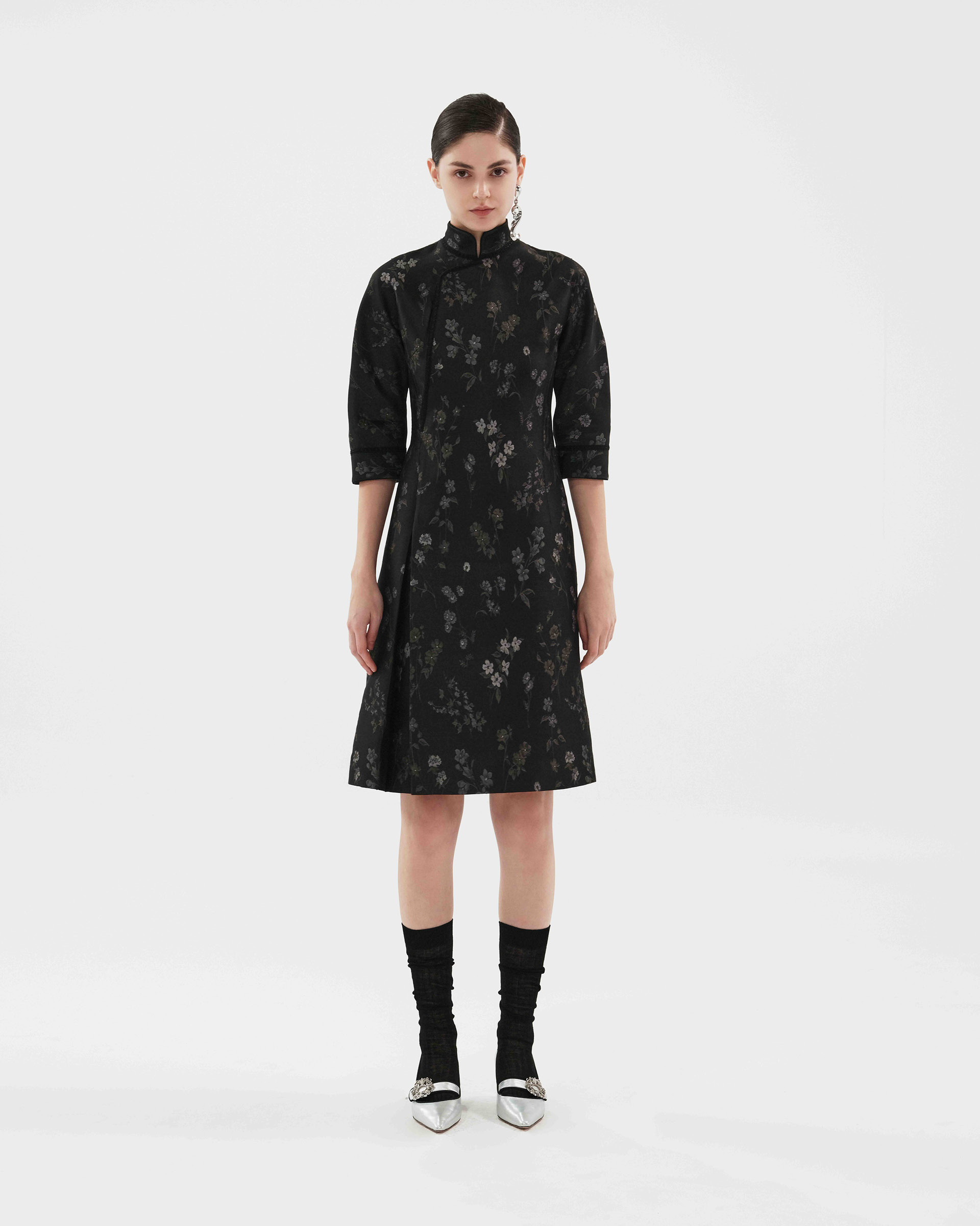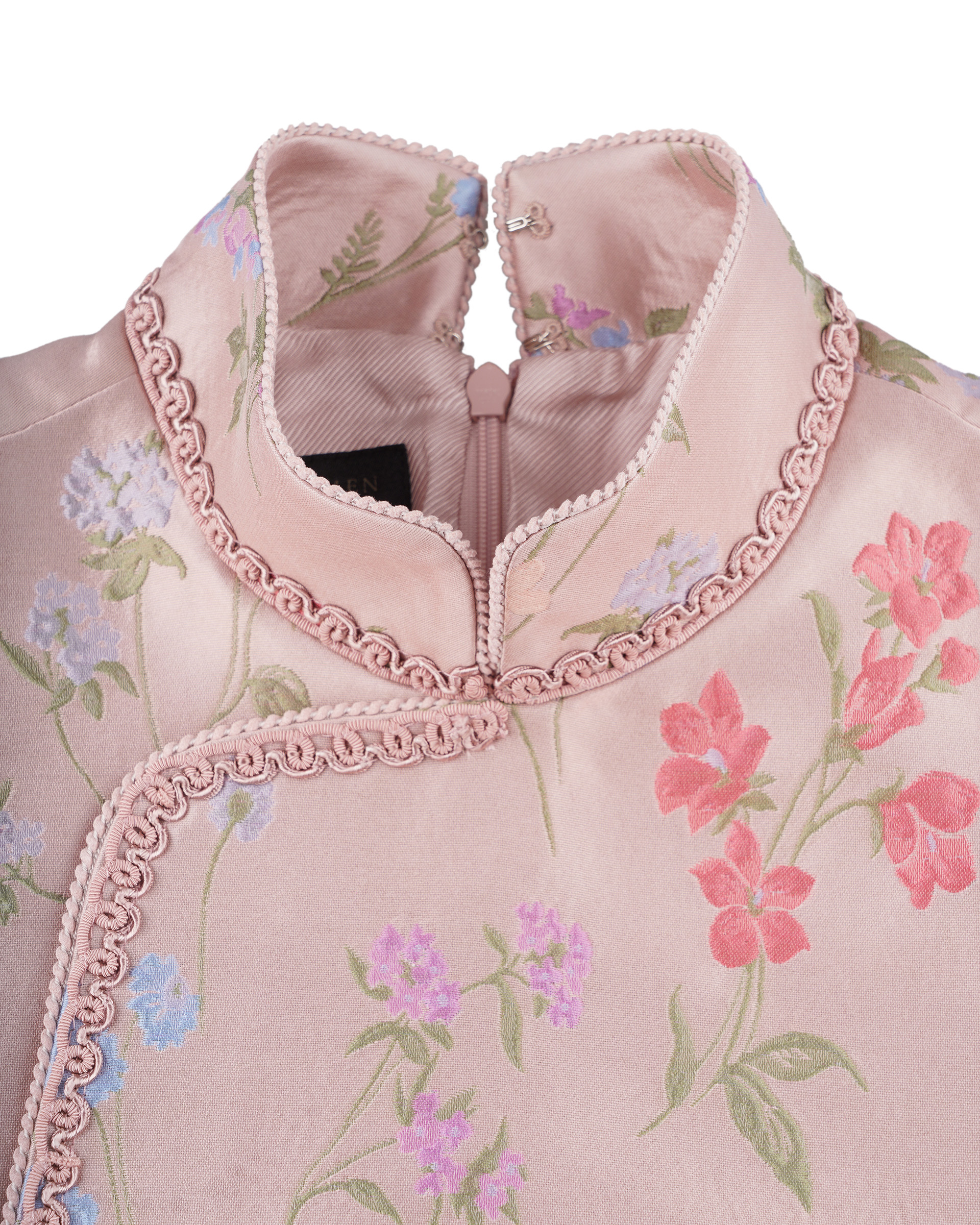 The piece is made of silk blend fabric, and the exterior design continues the classical theme, with delicate flowers climbing on the upright silk jacquard, which can be tender or mysterious depending on the color of the cloth. The cut runs back and forth between the Western version and the classic style of SHATZYCHEN, and the characteristics of East and Western fusion are carried out here.