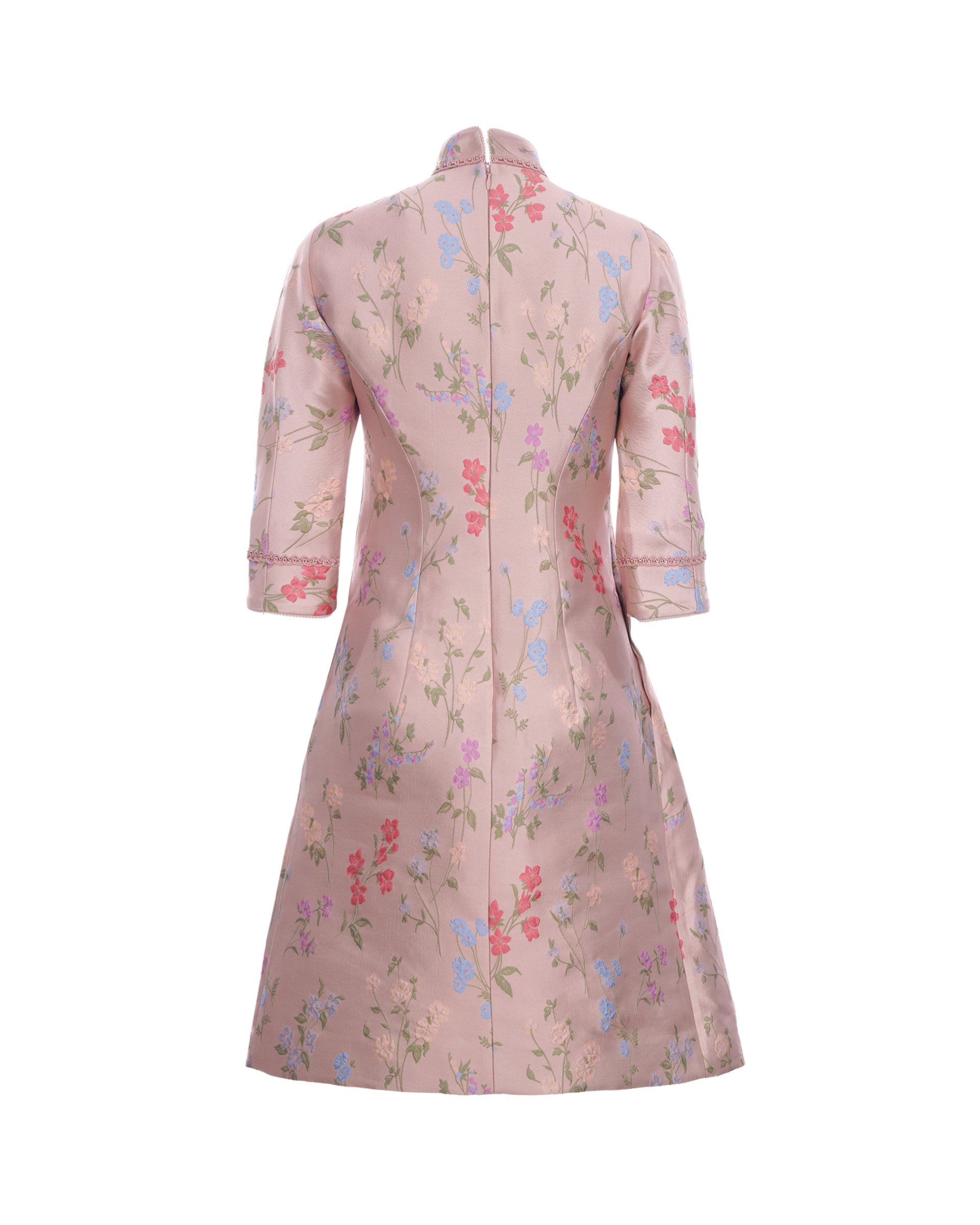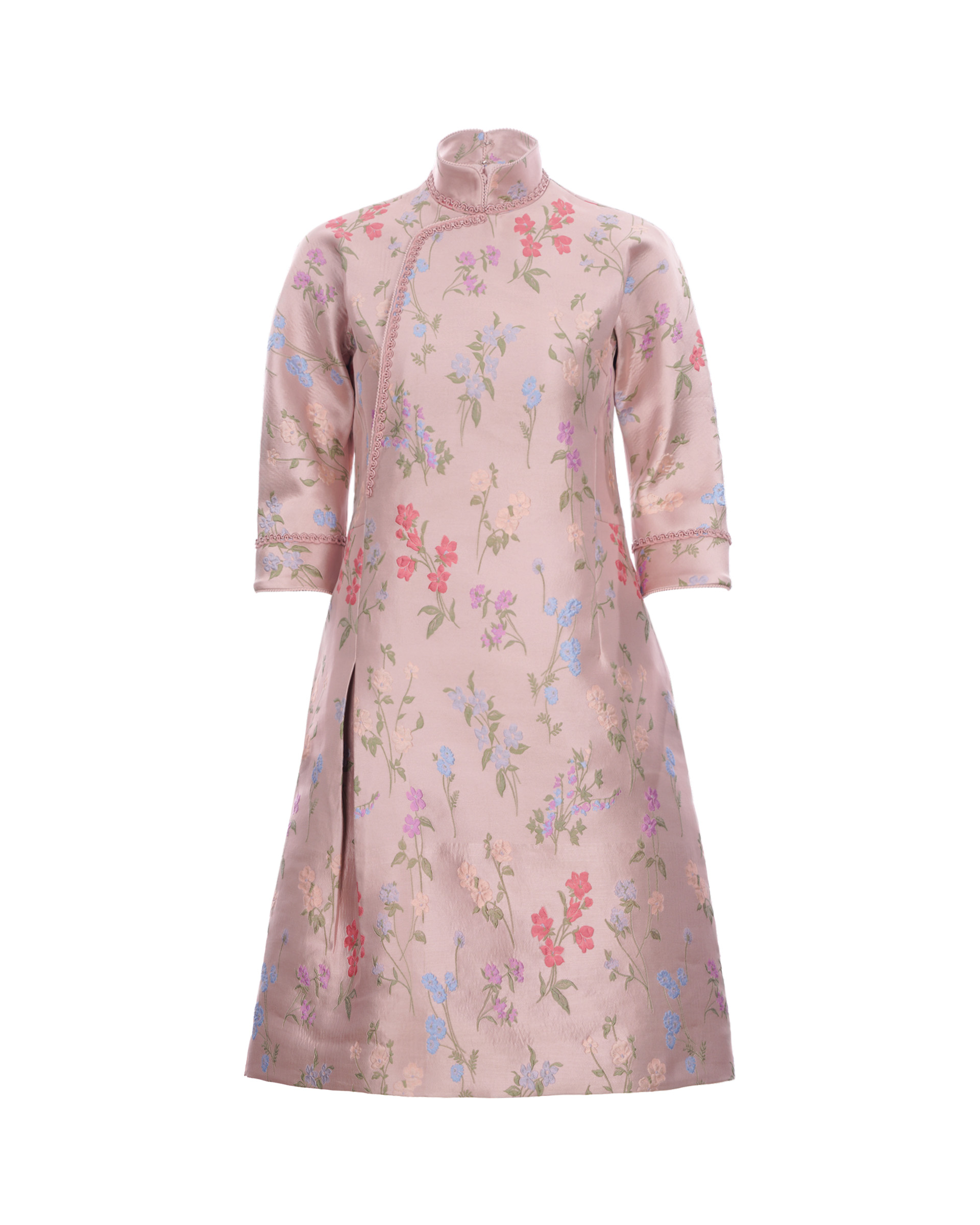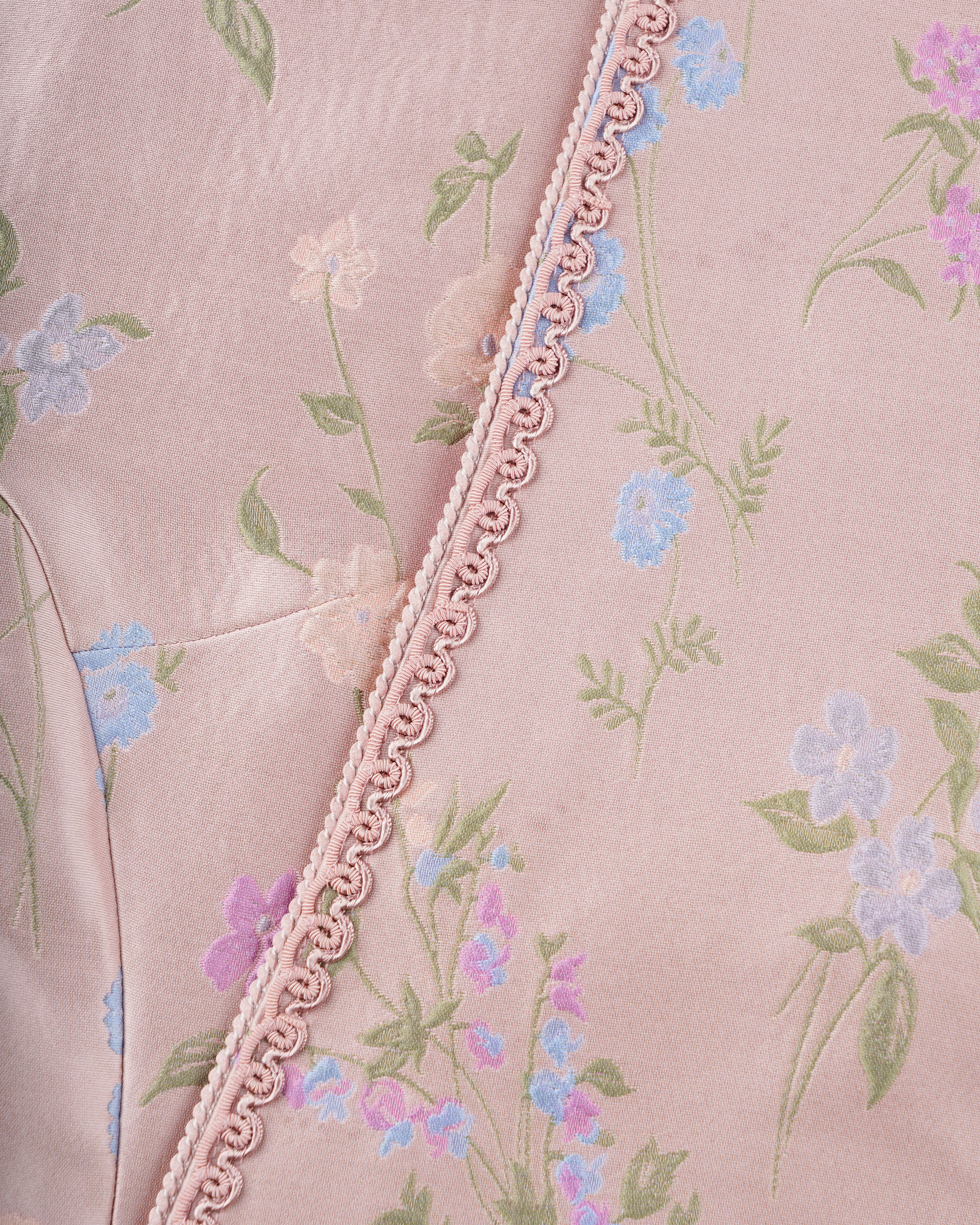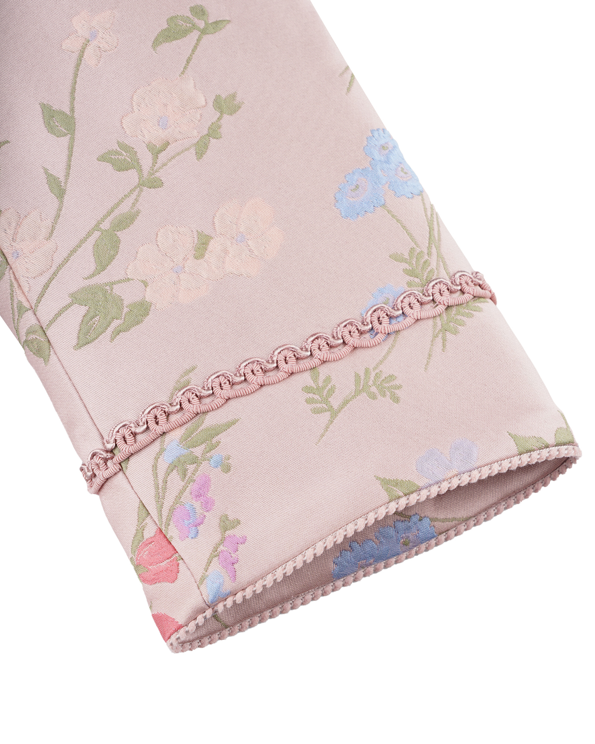 The piece is made of silk blend fabric, and the exterior design continues the classical theme, with delicate flowers climbing on the upright silk jacquard, which can be tender or mysterious depending on the color of the cloth. The cut runs back and forth between the Western version and the classic style of SHATZYCHEN, and the characteristics of East and Western fusion are carried out here.