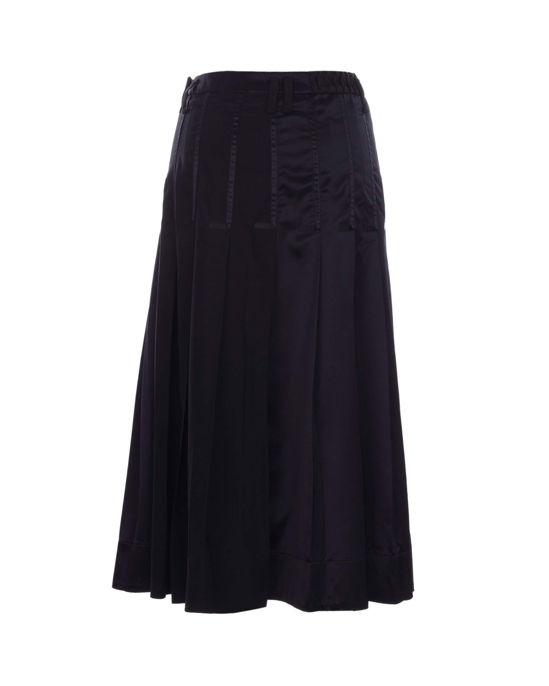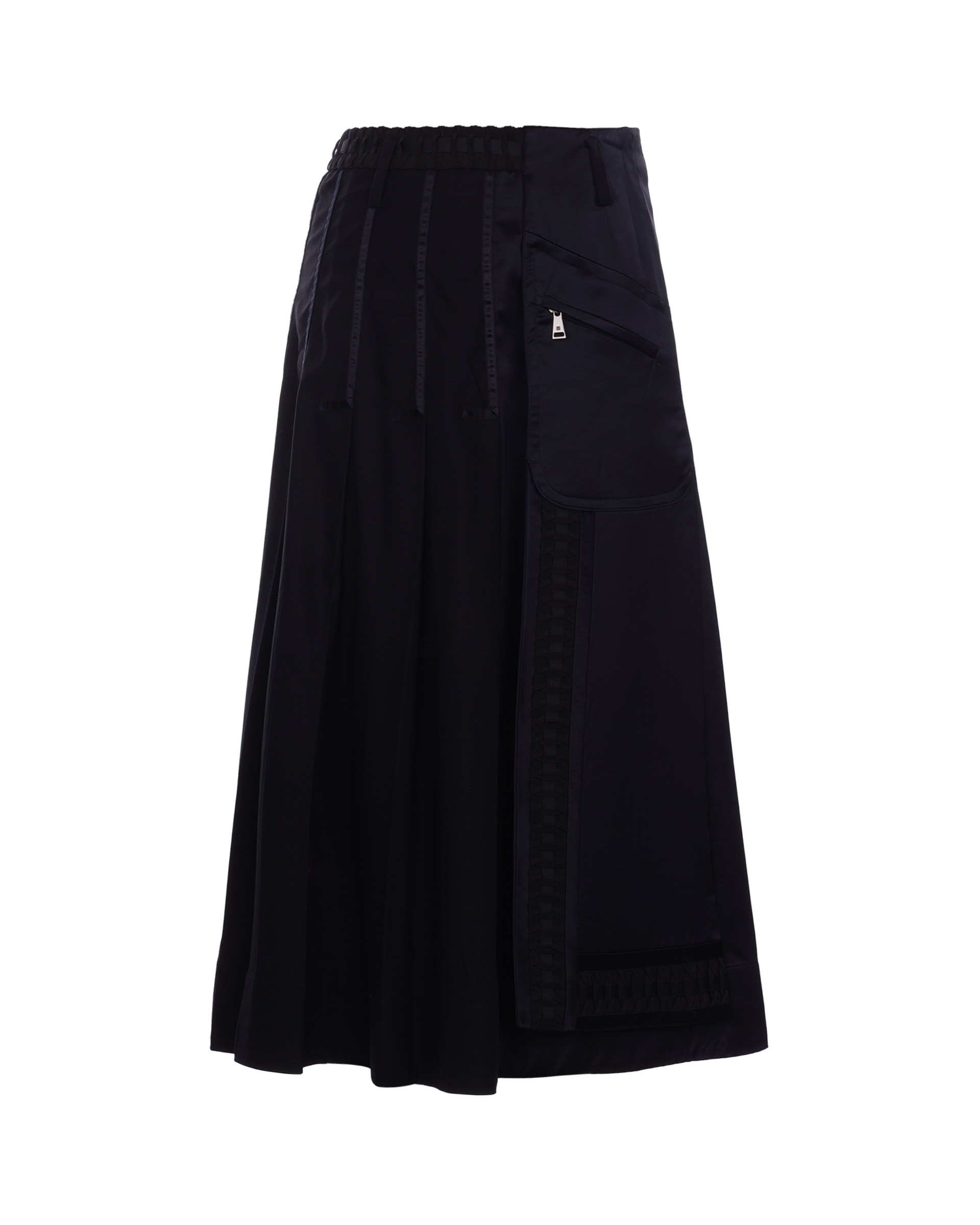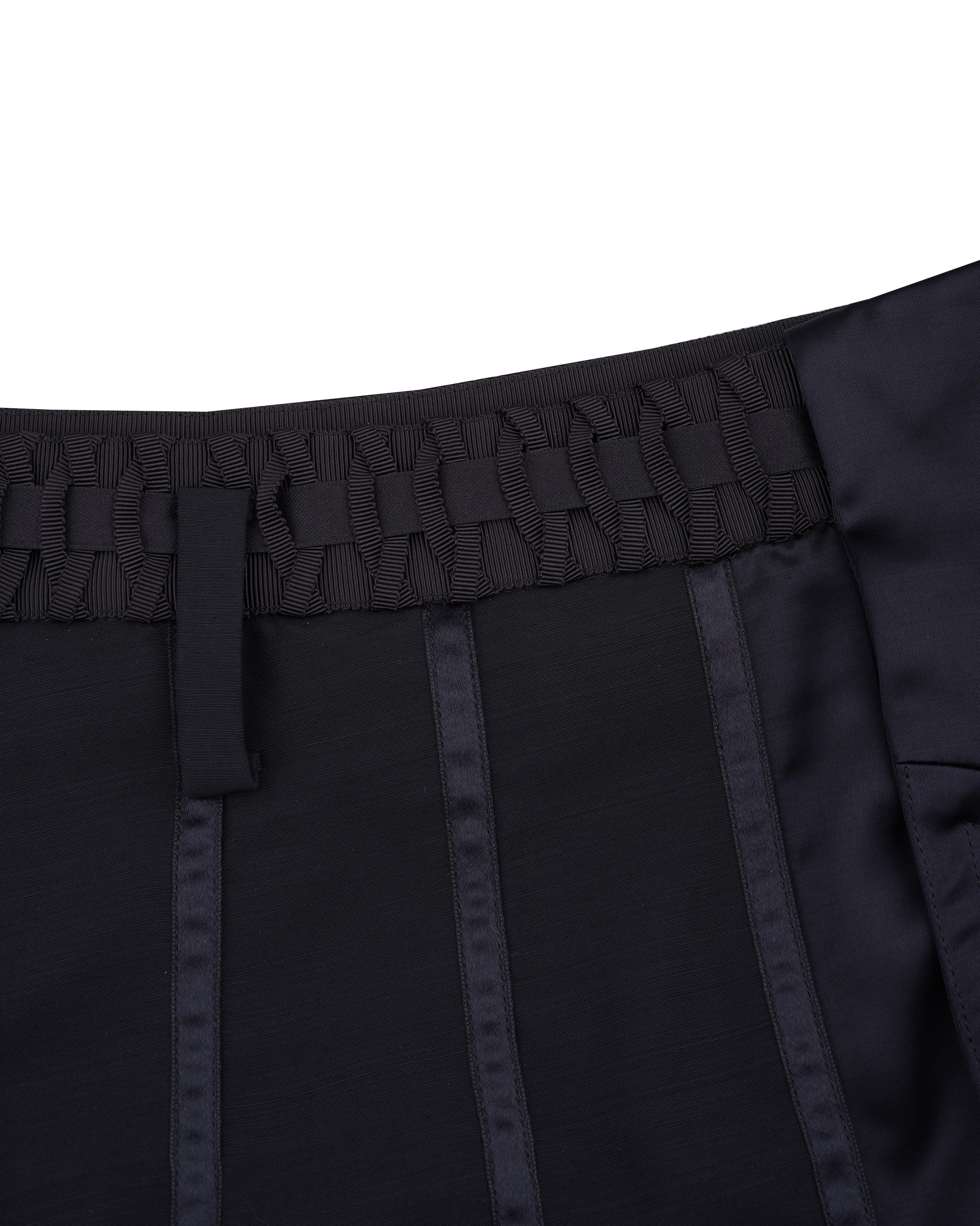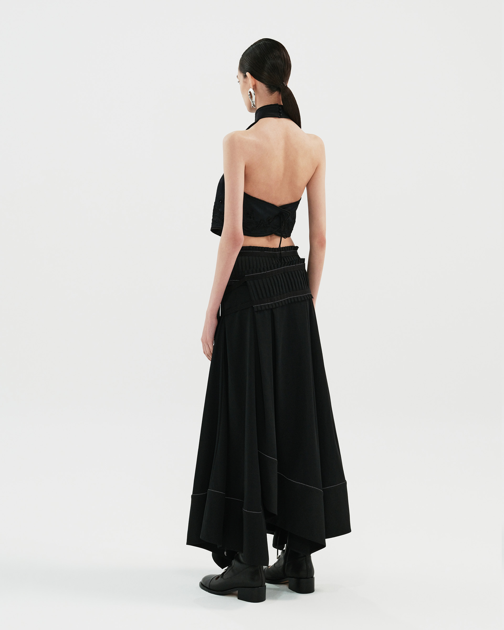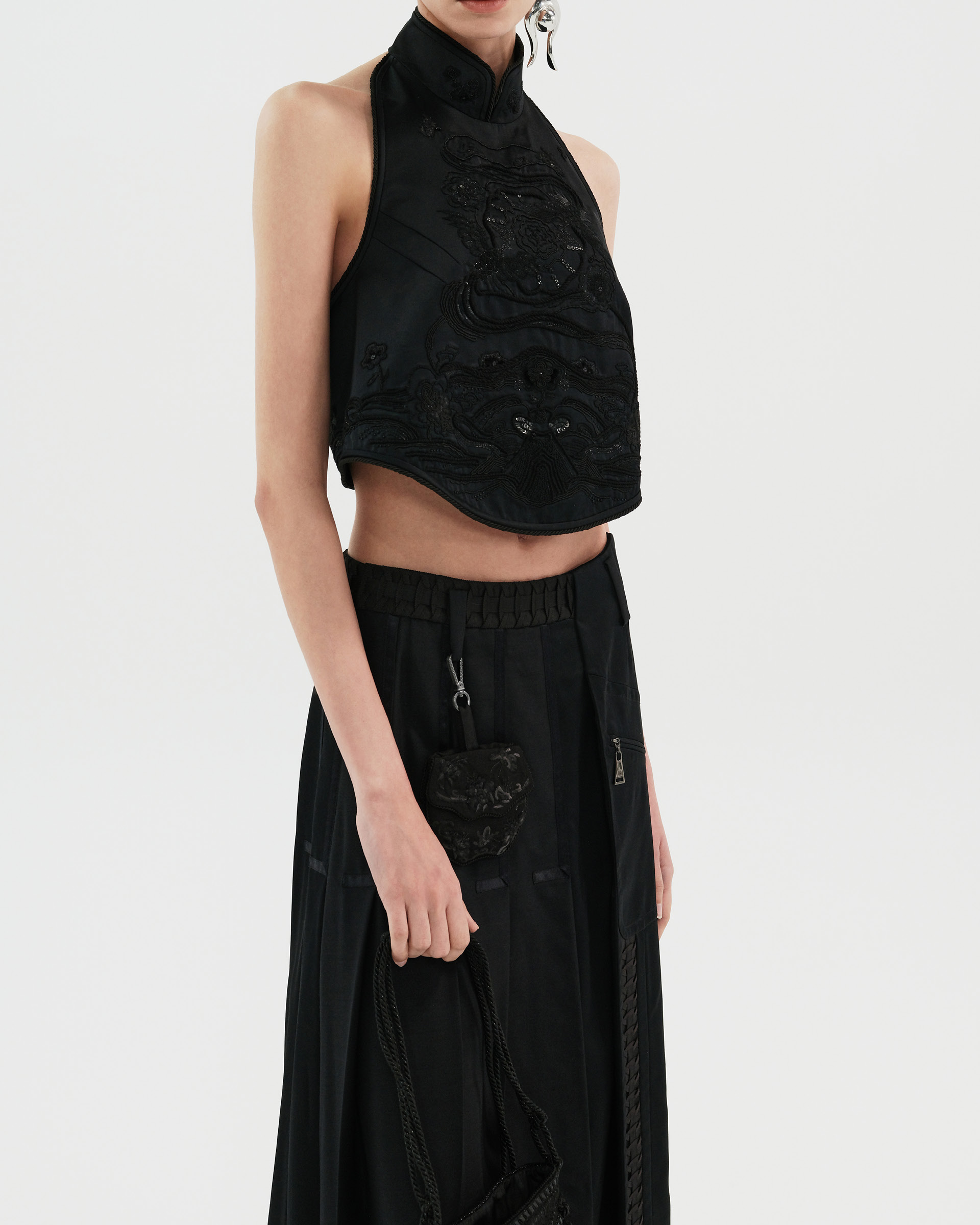 The sleek classical pleated skirt breaks the tradition with asymmetrical shape and pocket zipper, using webbing instead of traditional Chinese edging, and large diagonal cut to show its personality while walking, showing Oriental Zen thinking but also bringing contemporary structure.