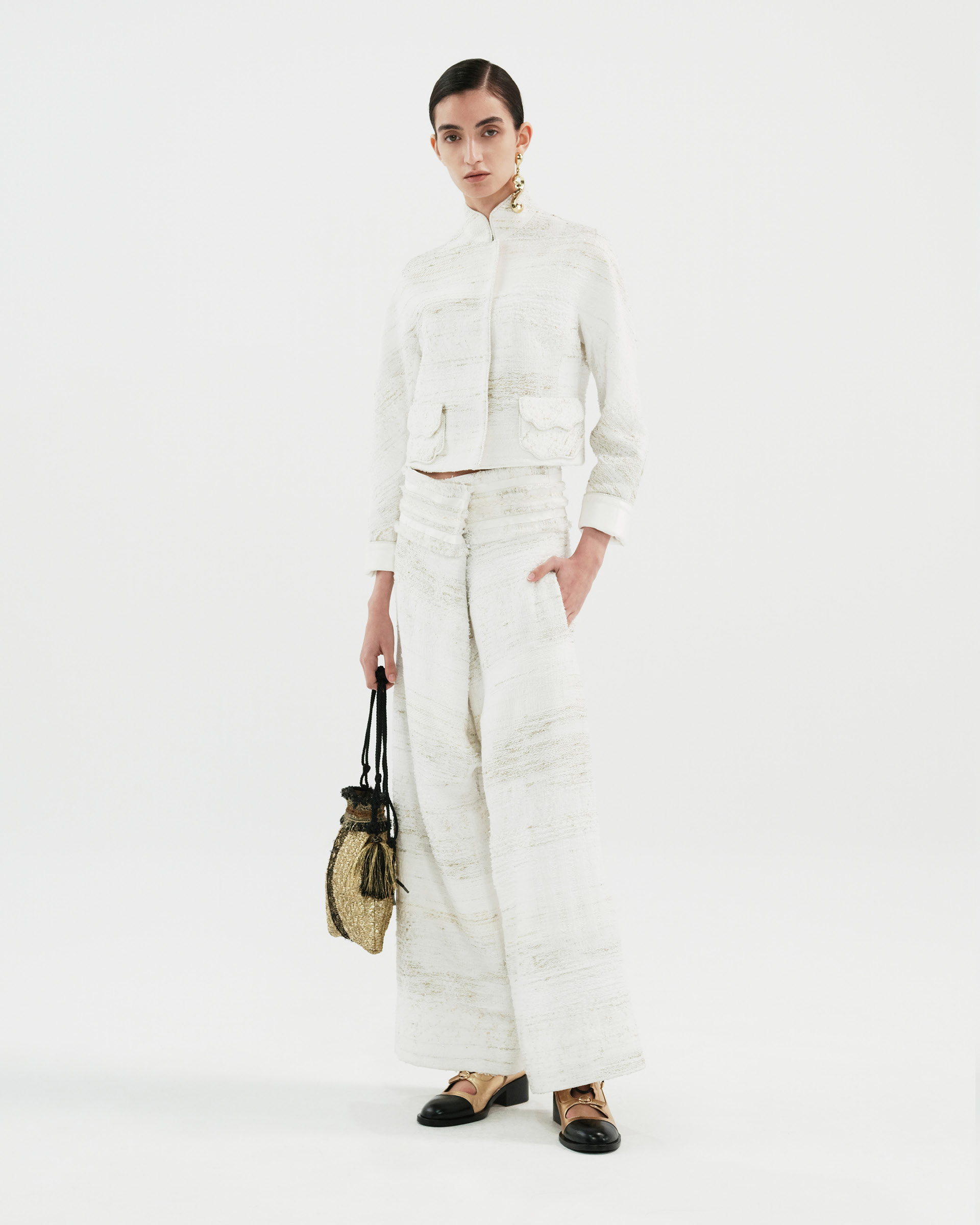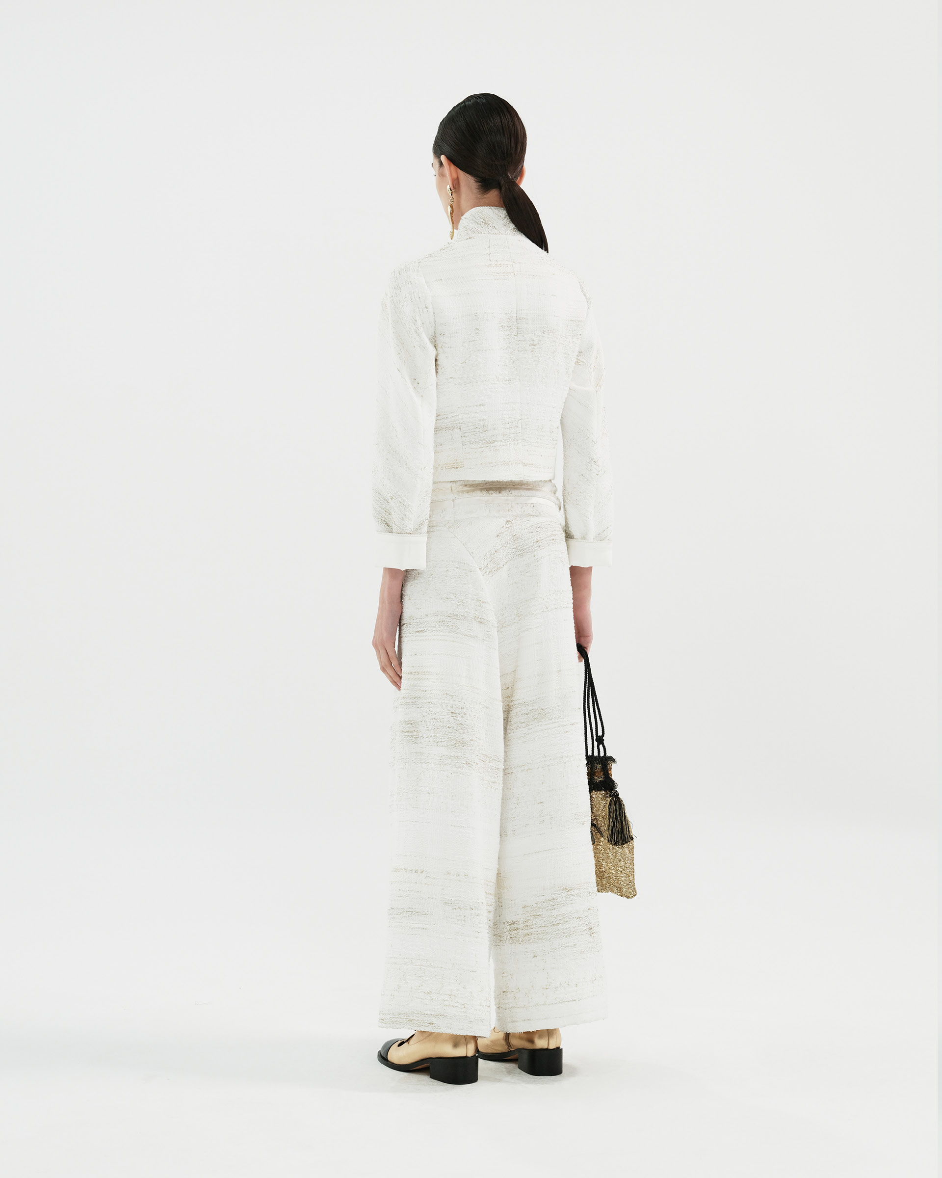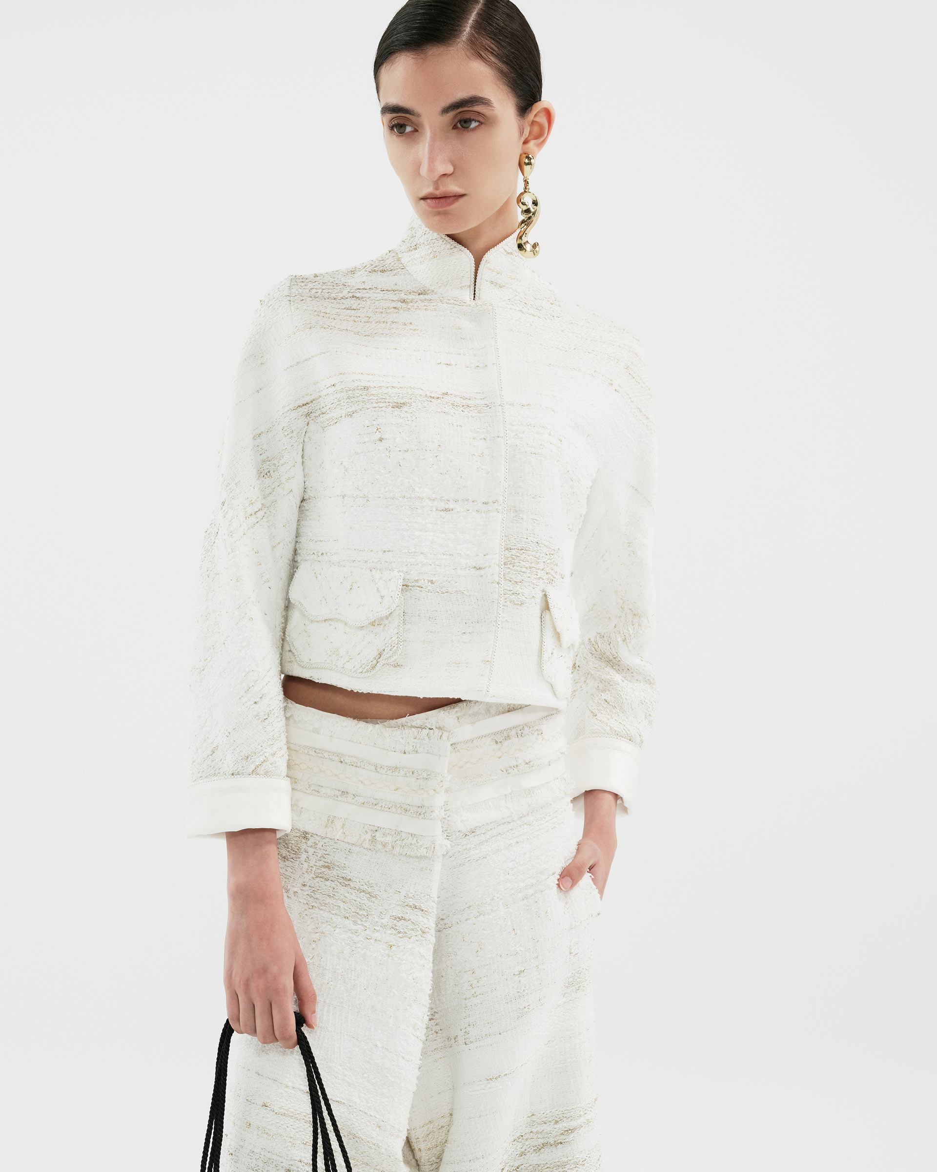 This piece uses Western woolen wool with metallic yarn, with subtle and elegant horizontal weaving to show a literary aesthetic washed by time, and the cut can be seen in the classic neckline and sleeve of SHIATZYCHEN and the upper pocket design like a small purse, which fully presents the theme of the season.