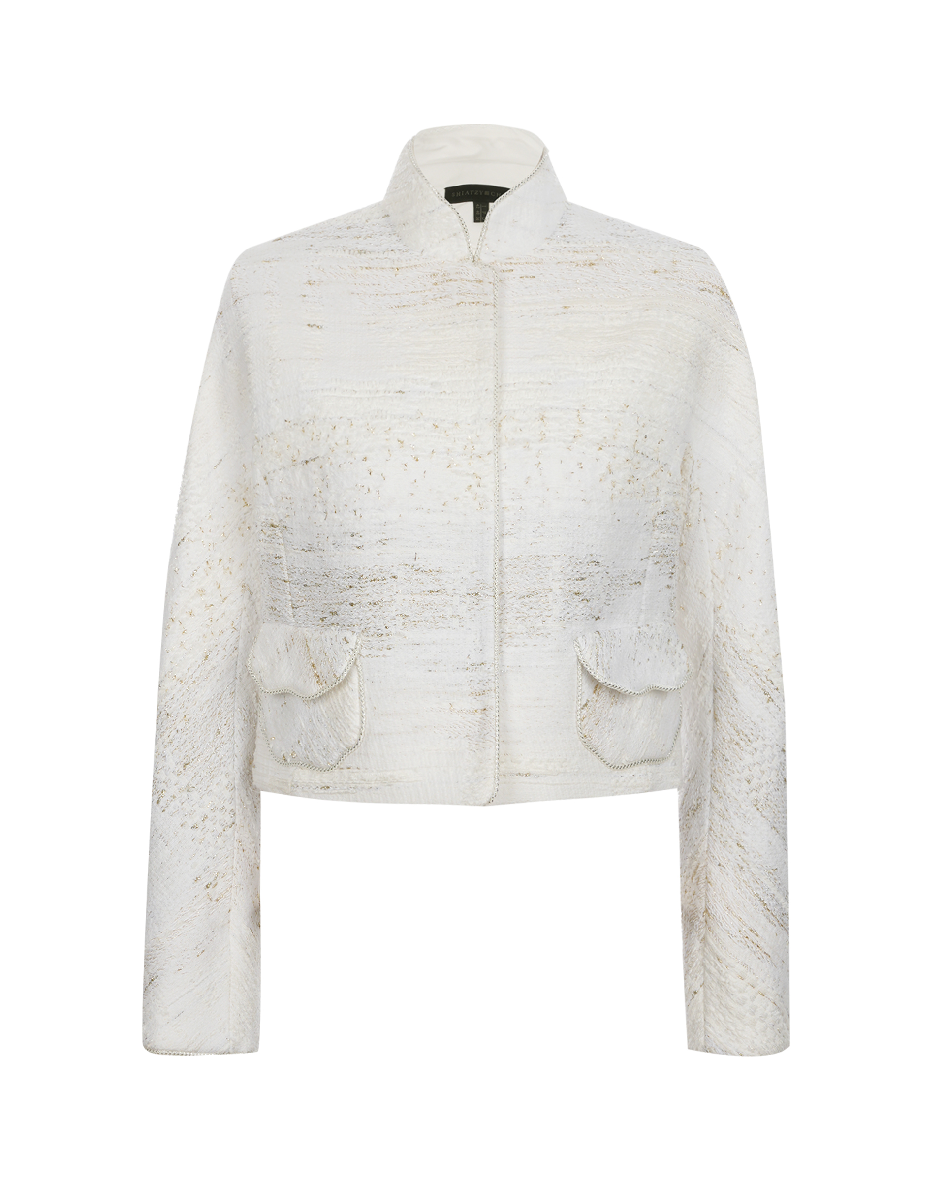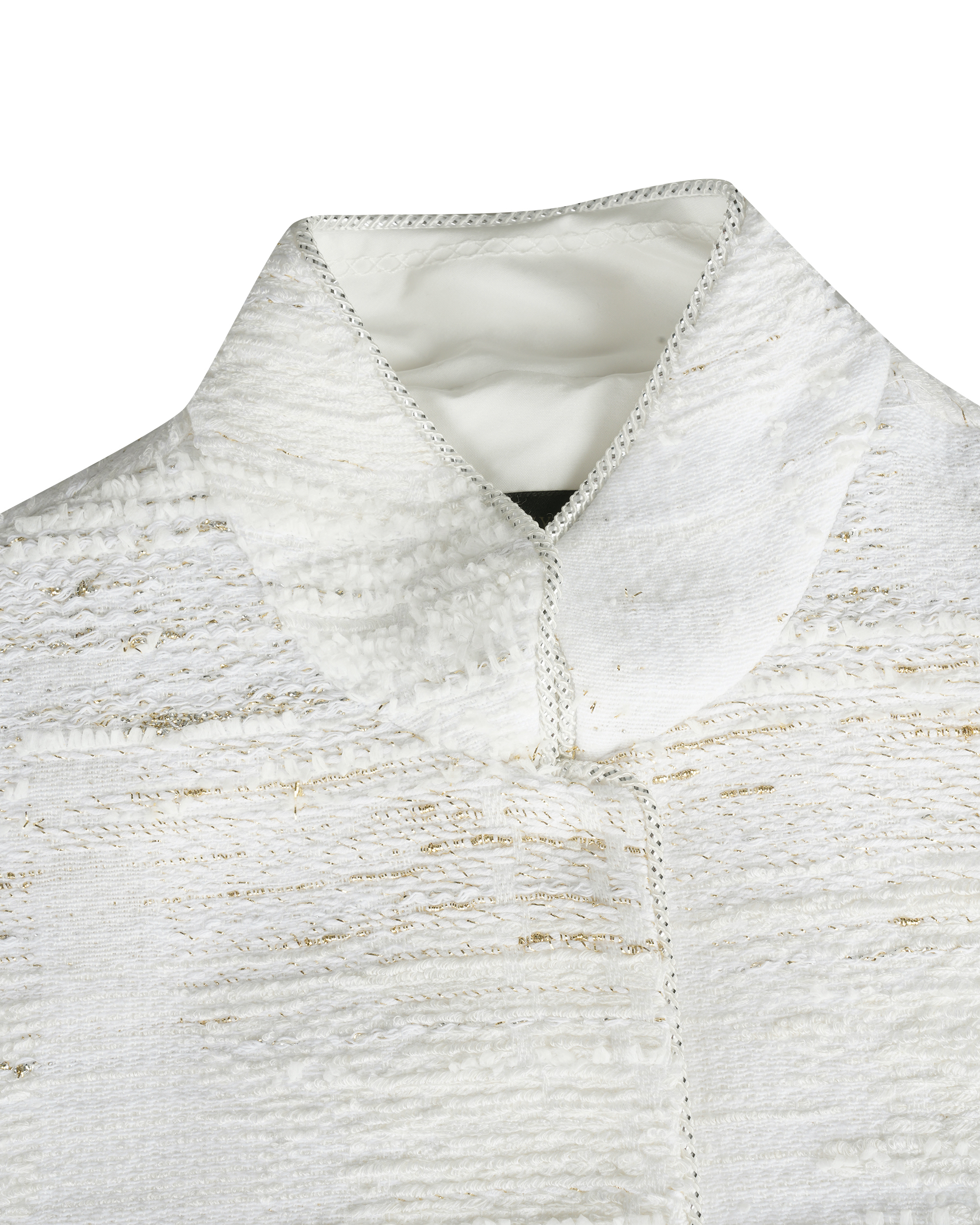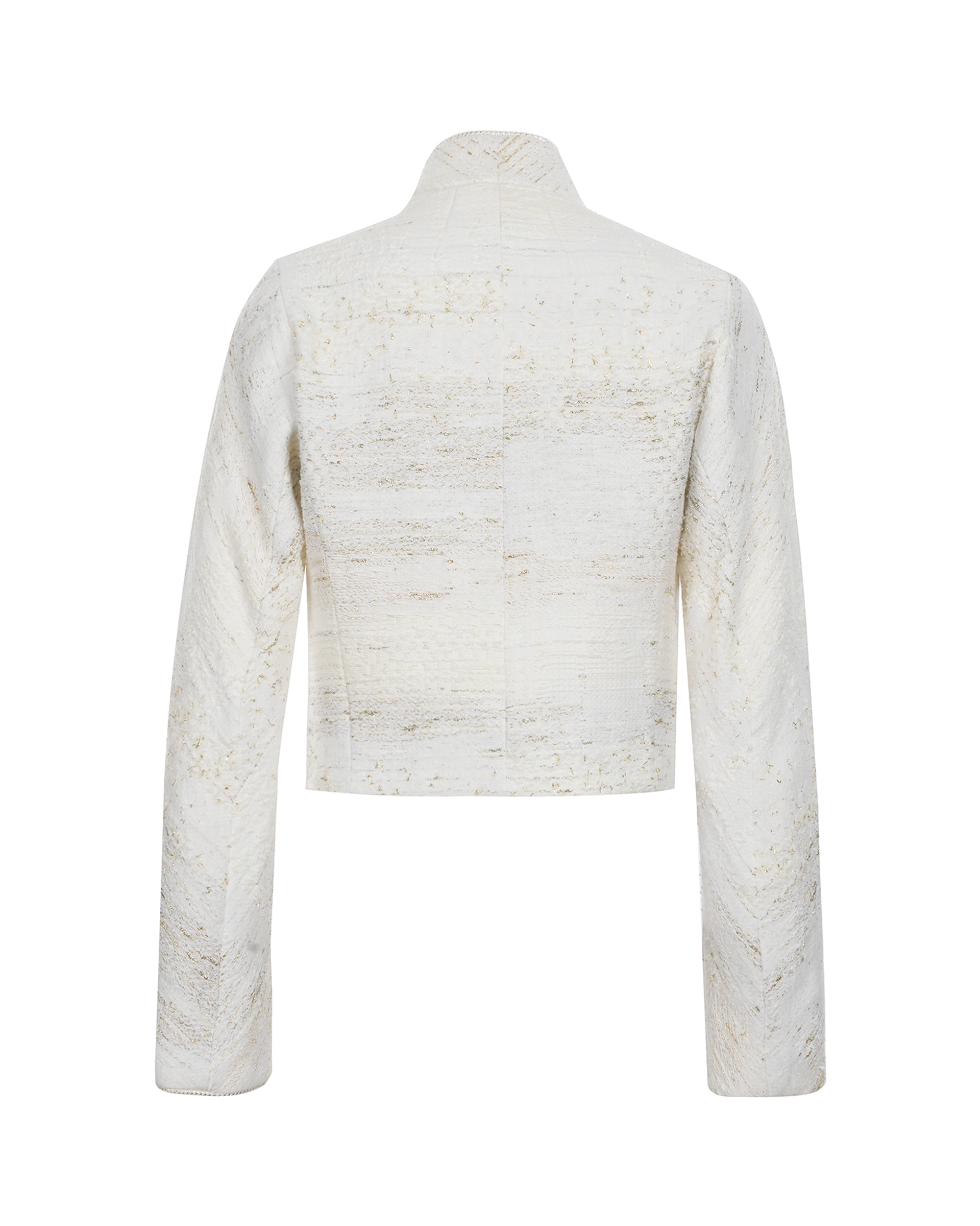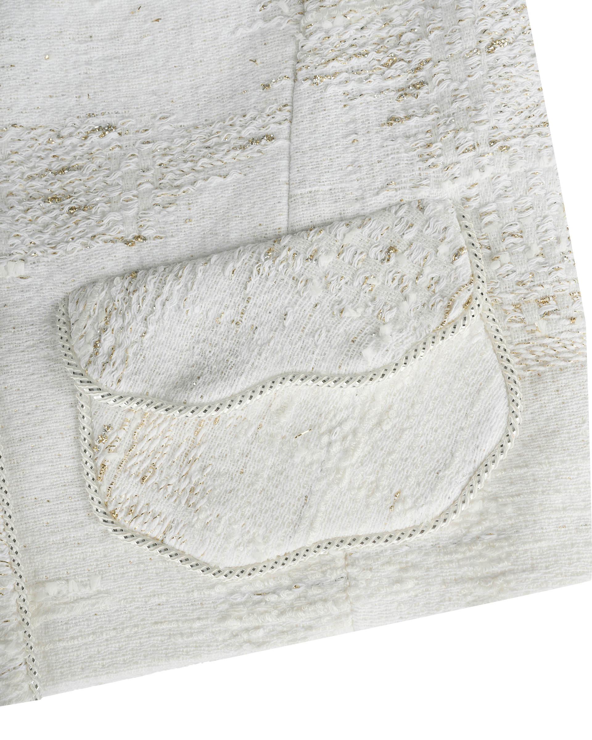 This piece uses Western woolen wool with metallic yarn, with subtle and elegant horizontal weaving to show a literary aesthetic washed by time, and the cut can be seen in the classic neckline and sleeve of SHIATZYCHEN and the upper pocket design like a small purse, which fully presents the theme of the season.
