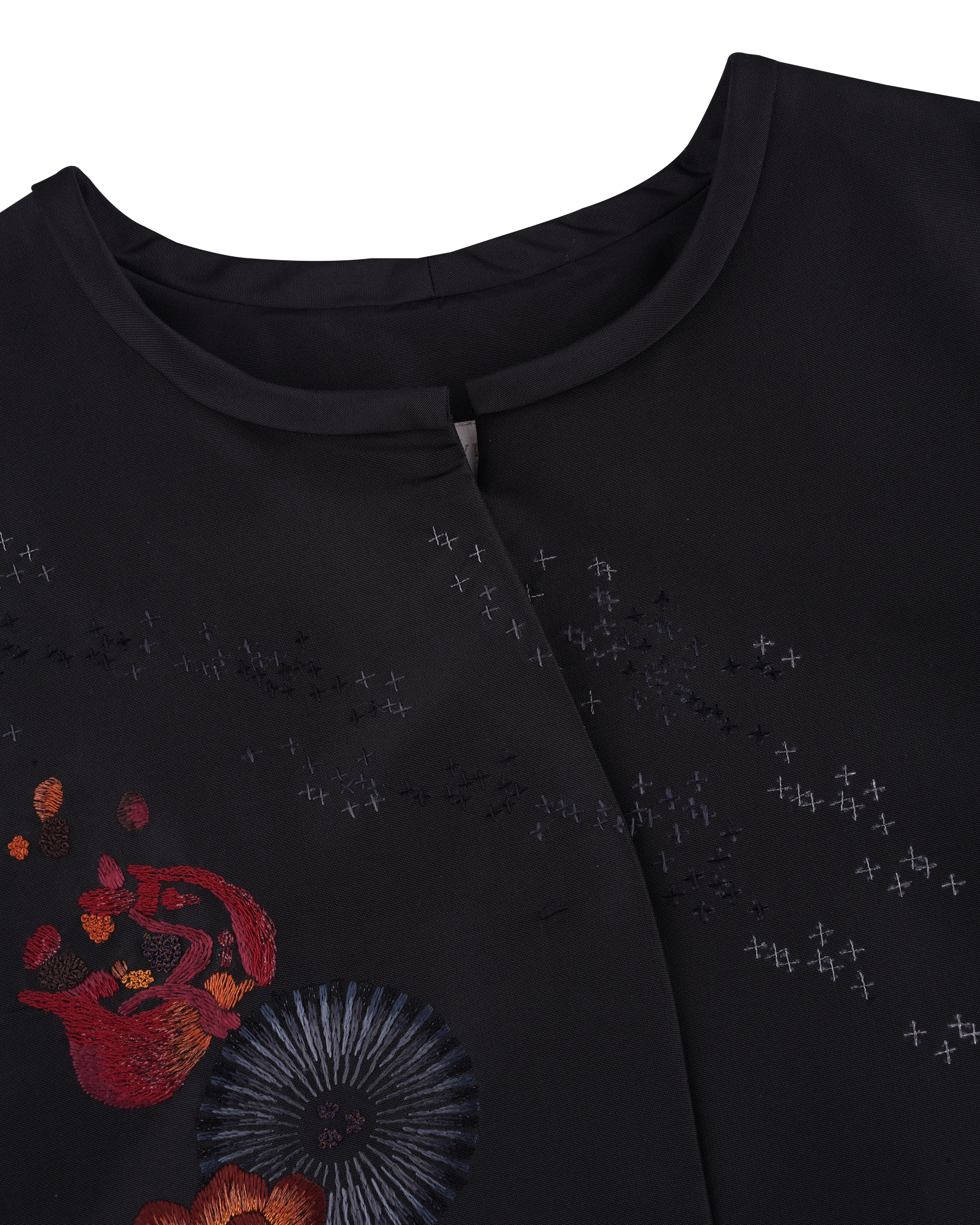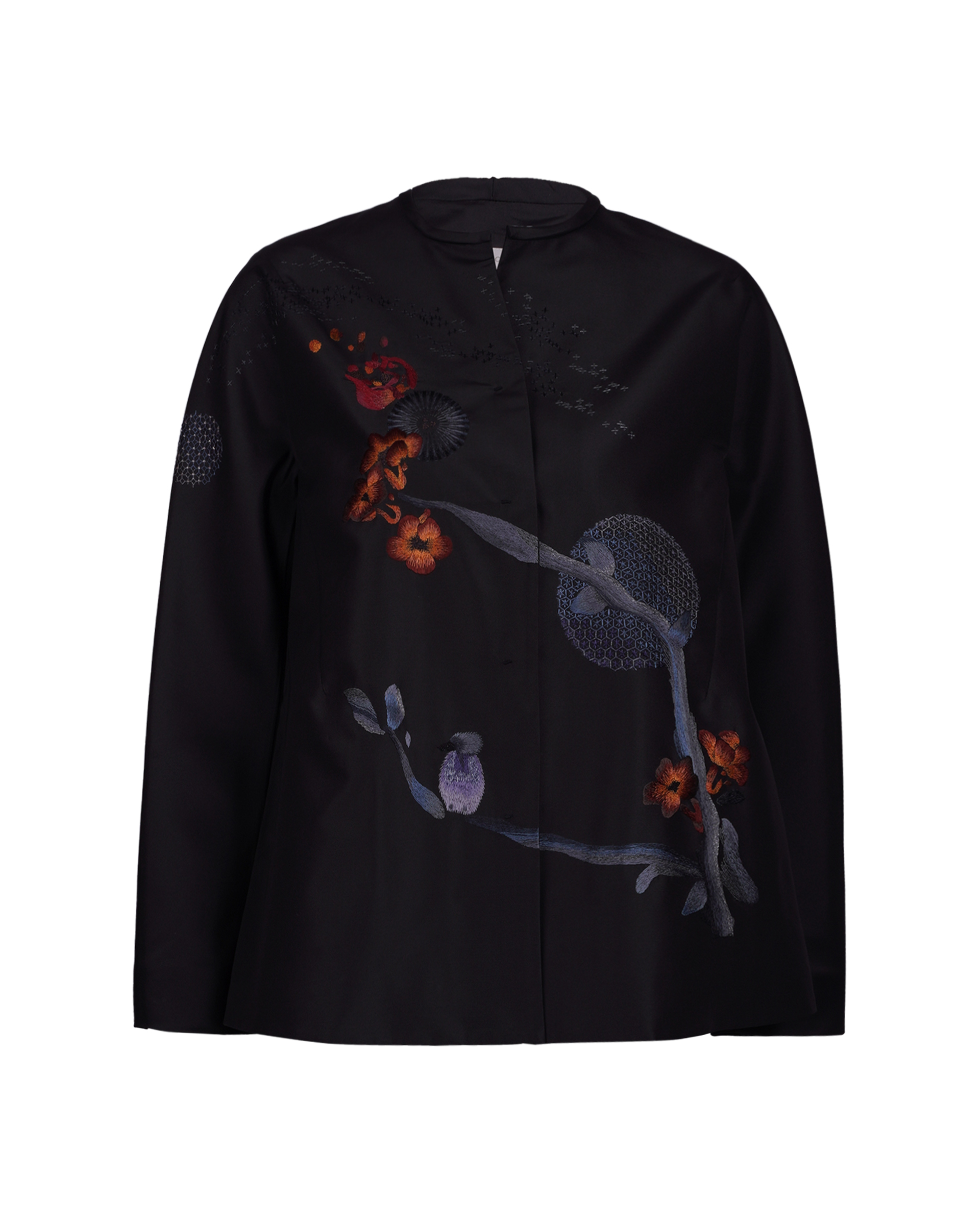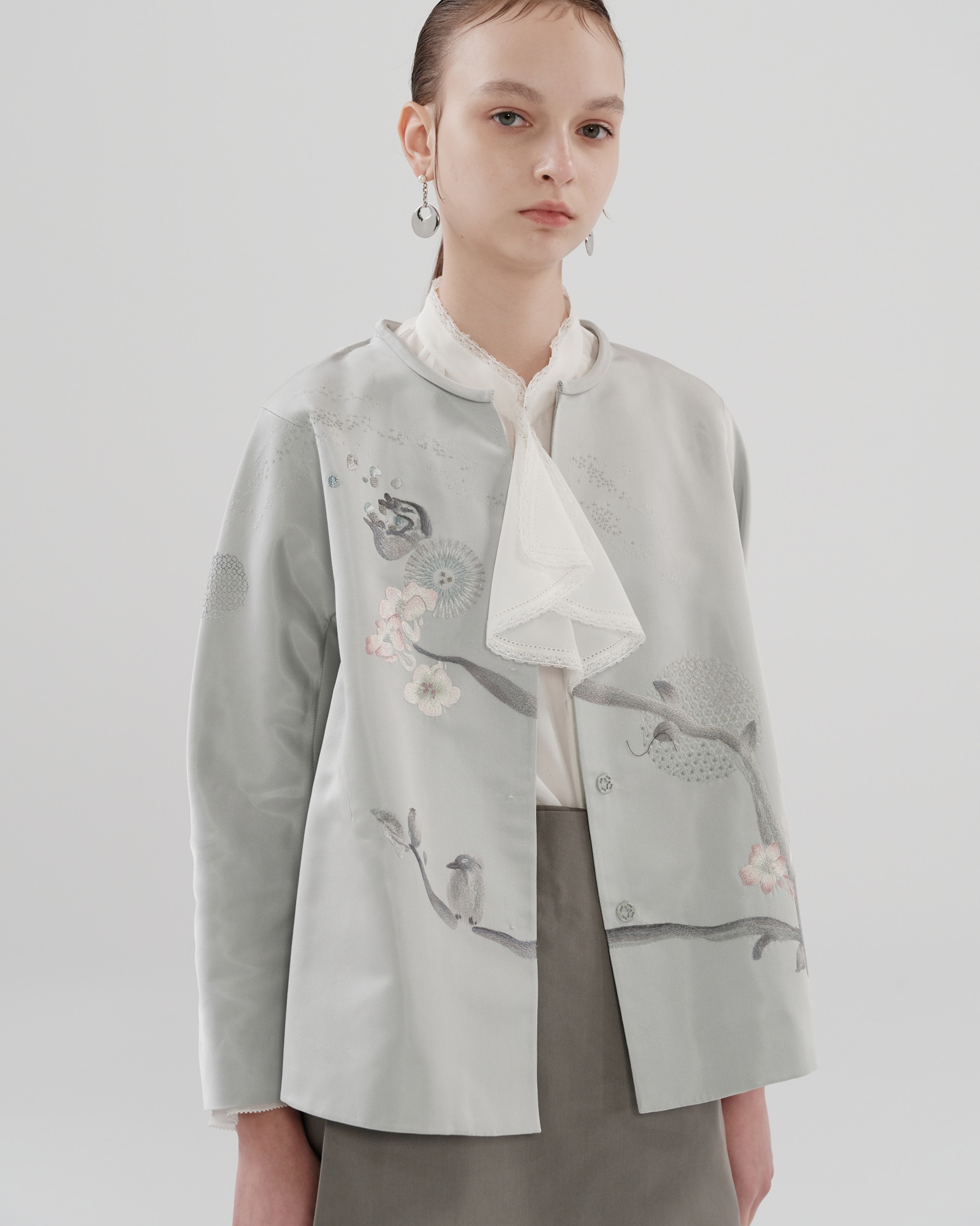 Made from 100% mulberry silk fabric, this jacket combines lightweight fabric with classic hand embroideries. With classic A-line cutting, this item stands for an elegant modern Chinese aesthetic.
