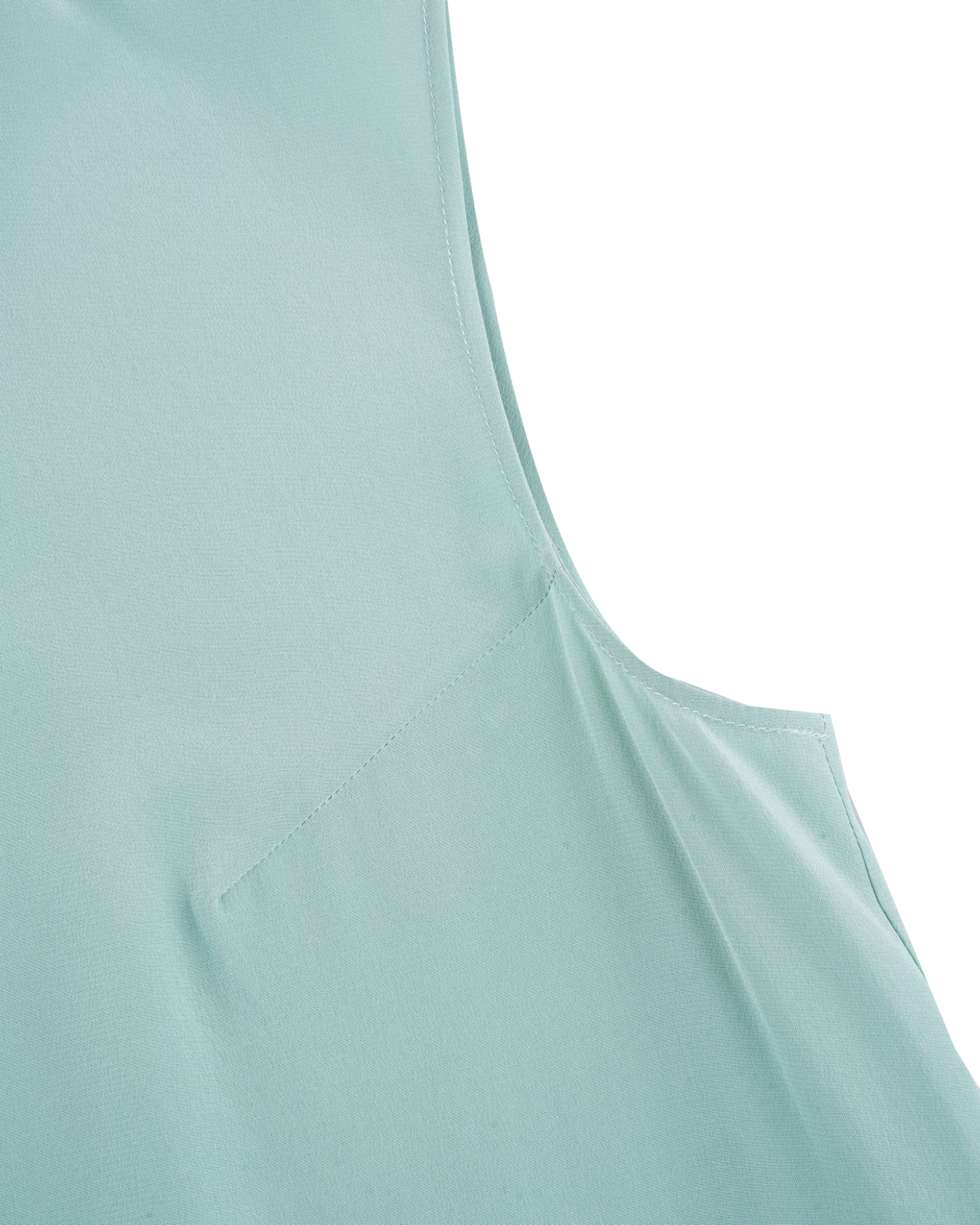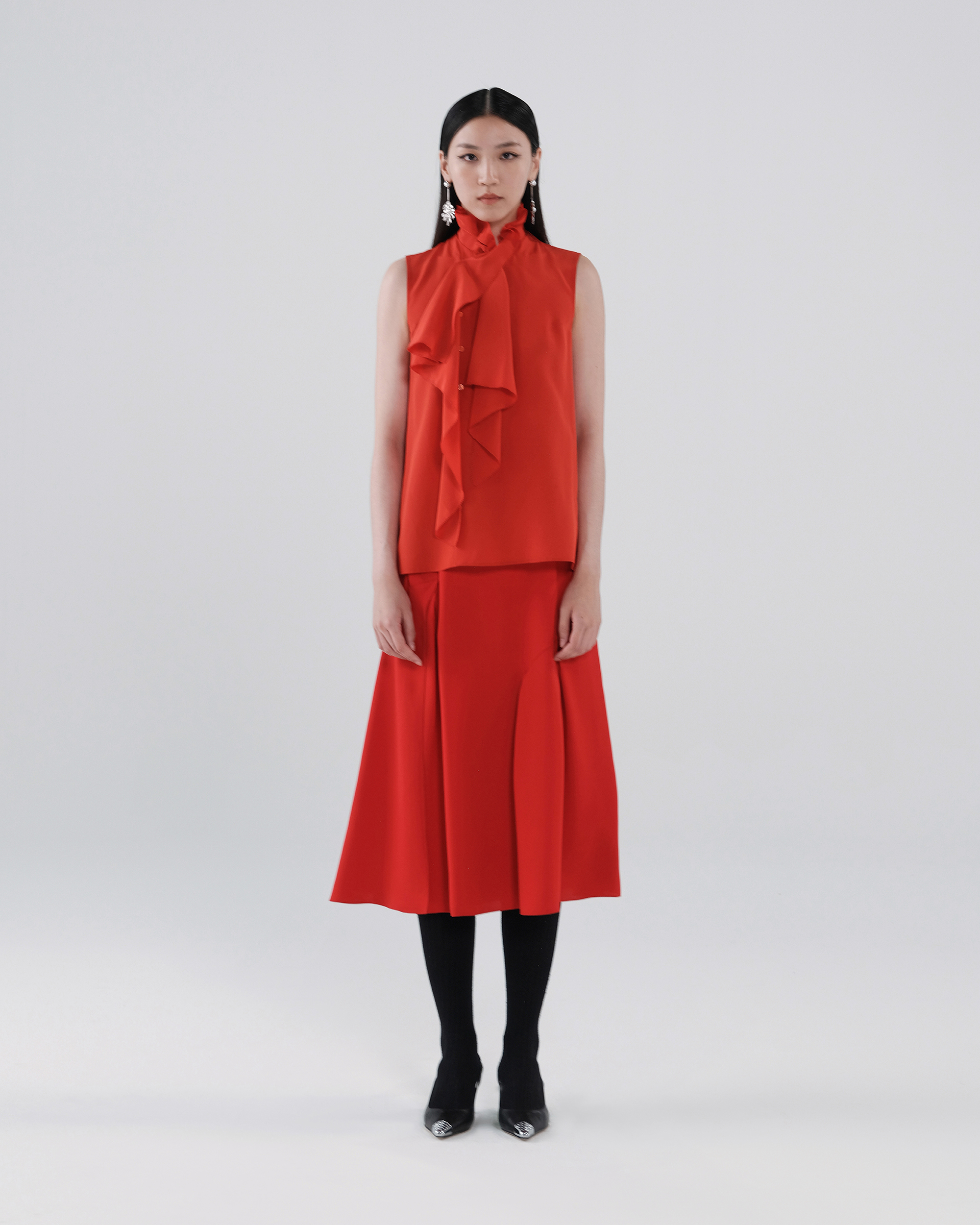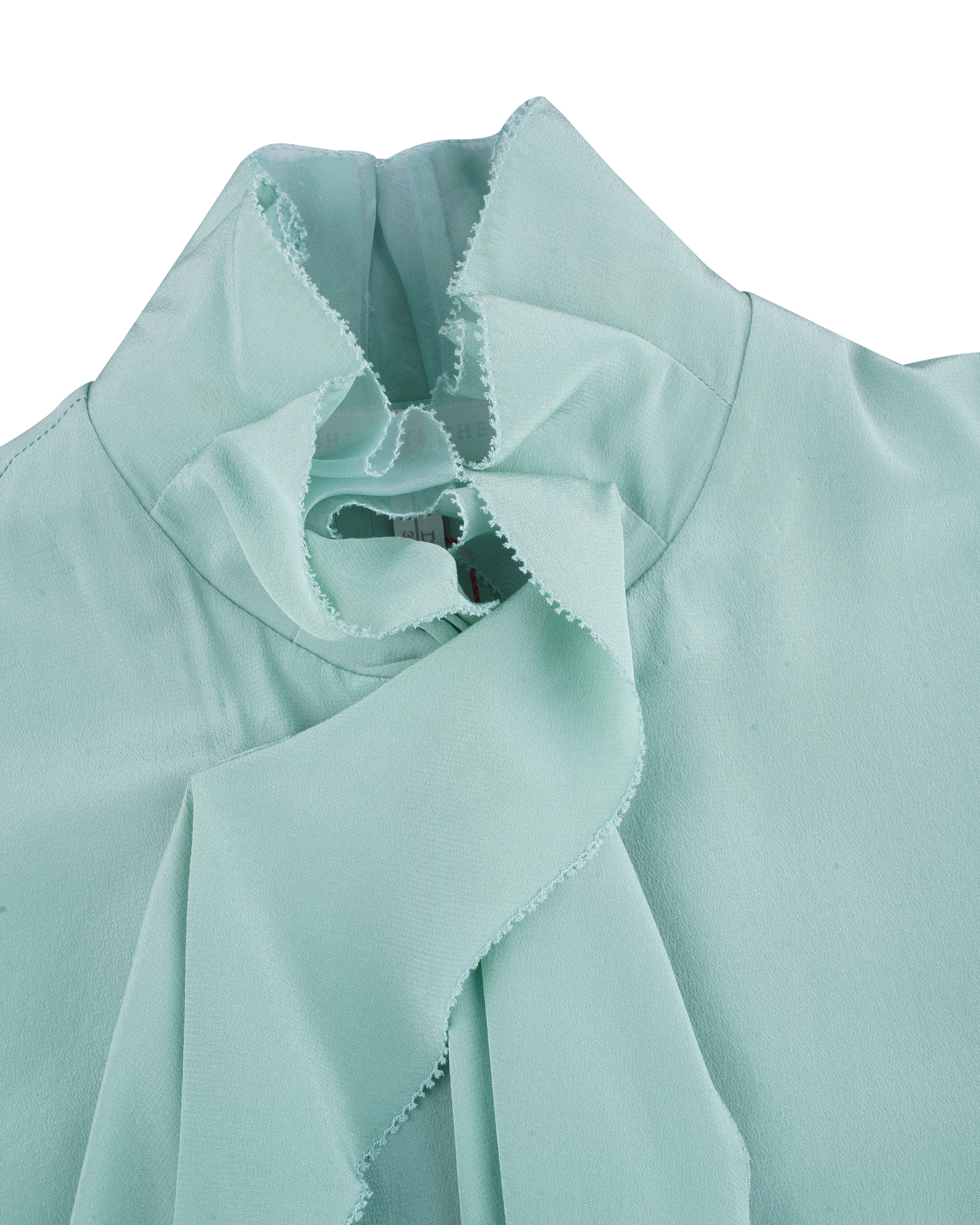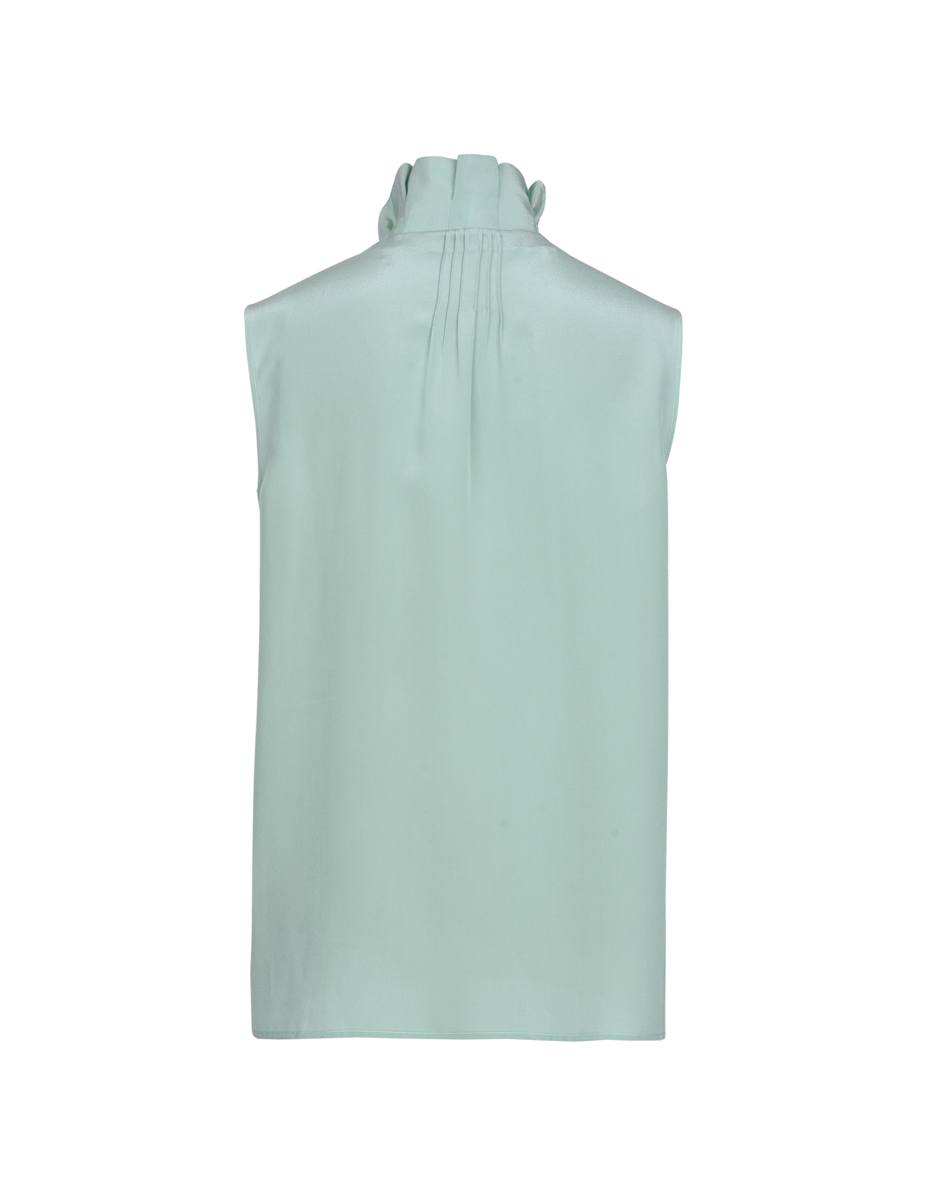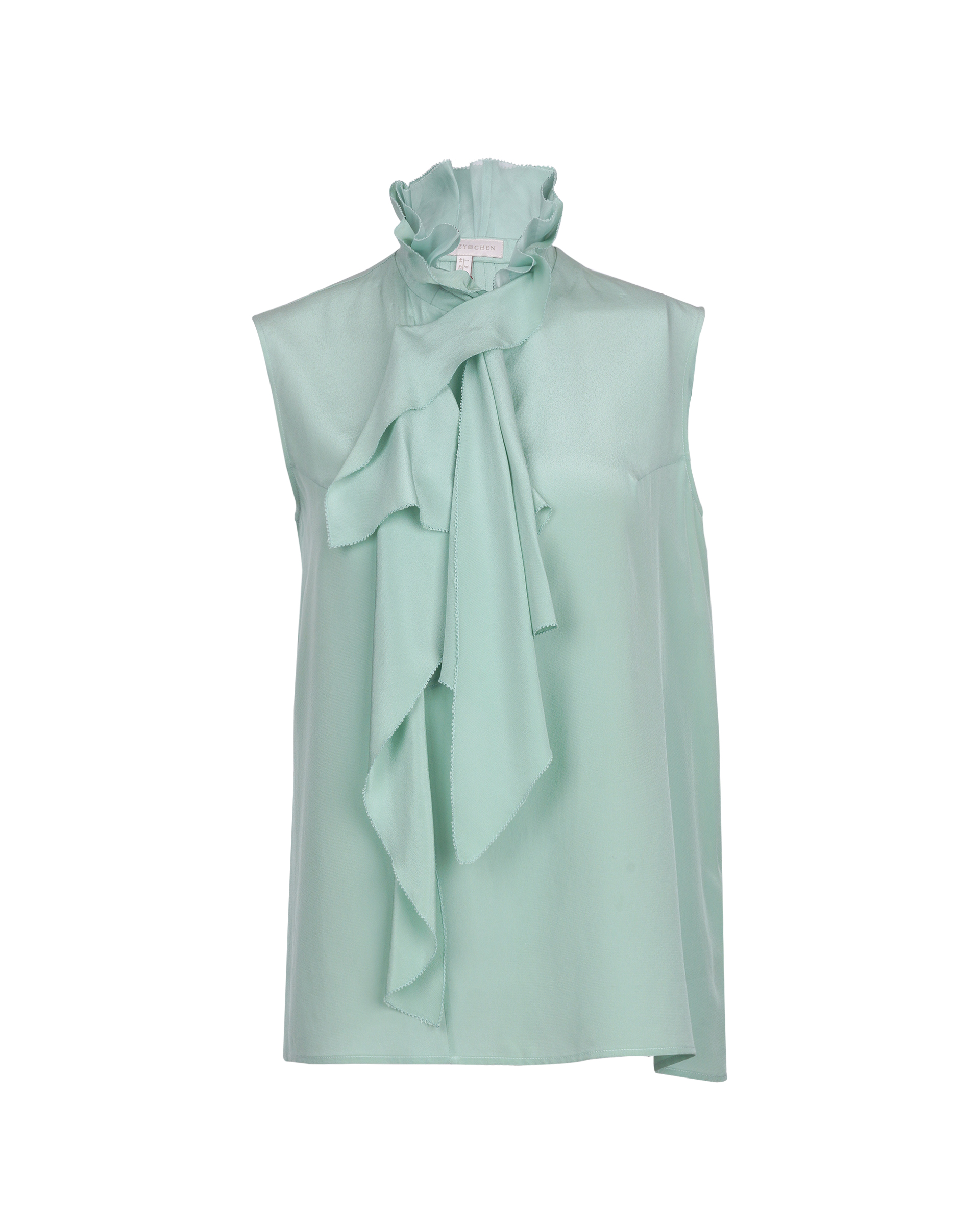 Strips of fabric pass through the buttonholes to form a loose bow tie, and the draped silk material flips the tie imagery into a feminine character. The layered front of this undershirt is a visual highlight.