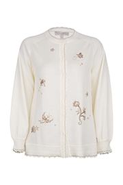 Cut from lightweight jacquard, this piece features vivid petals of orchids. A lace-stitched hem reduces bulk. A versatile item for your spring/summer closet.