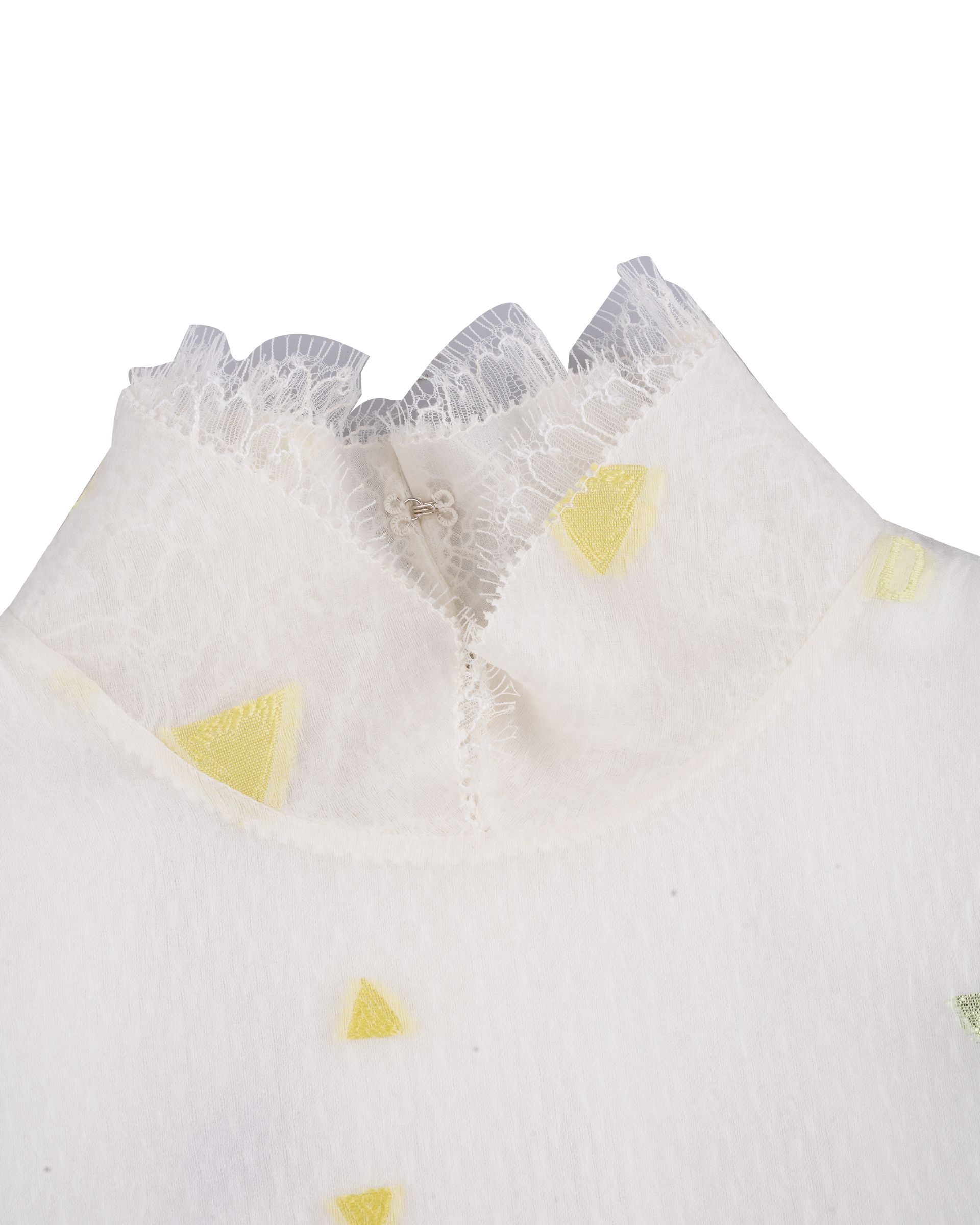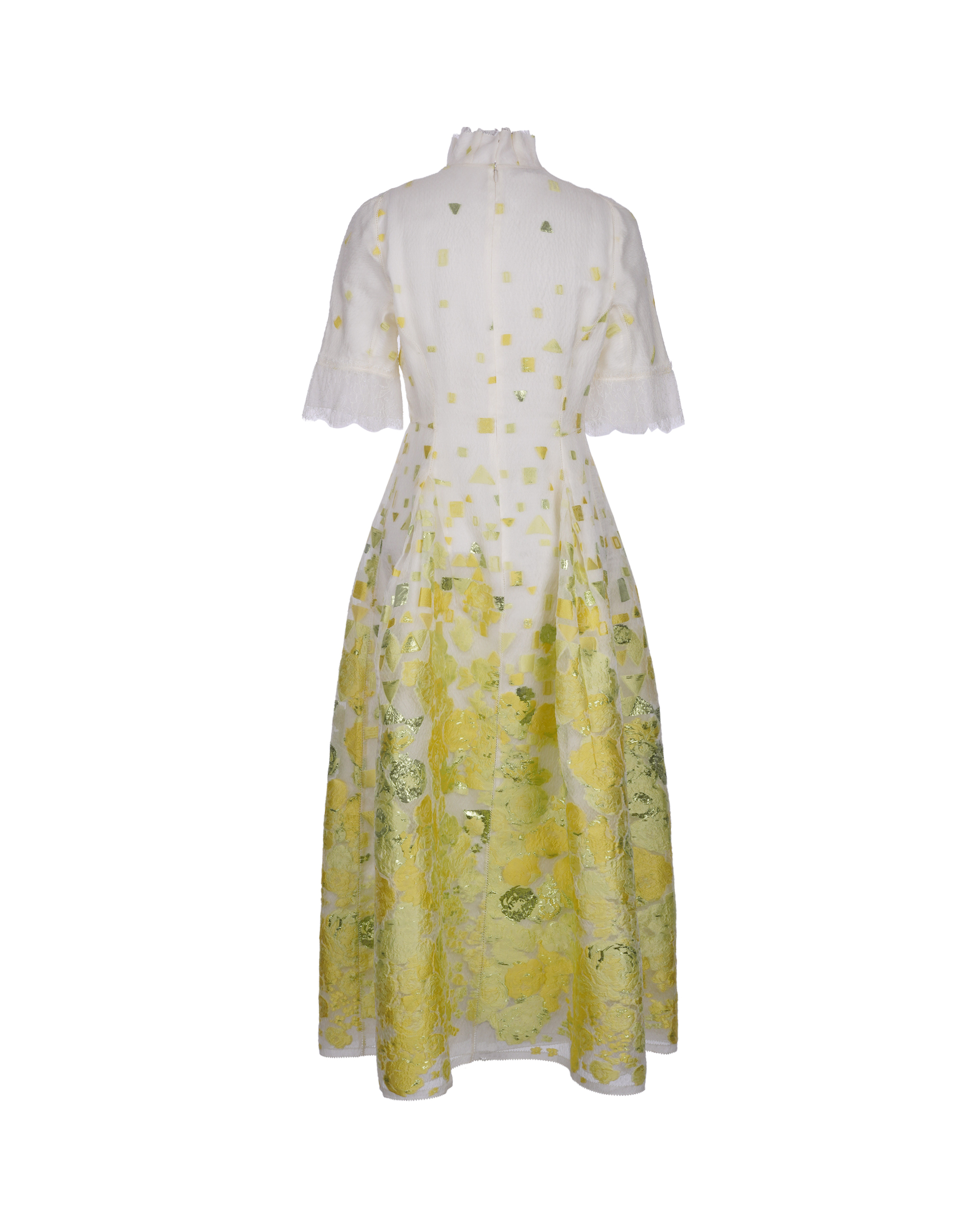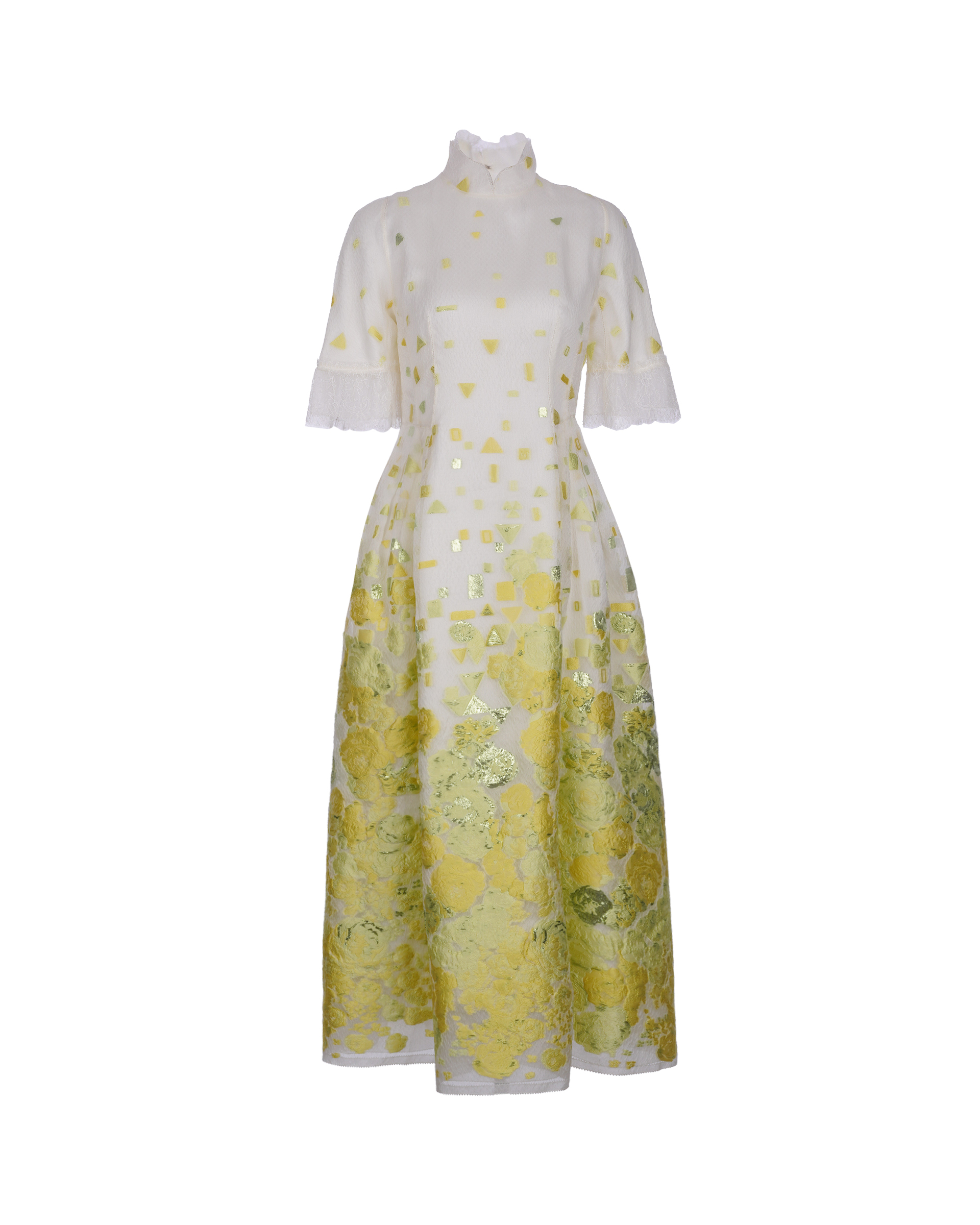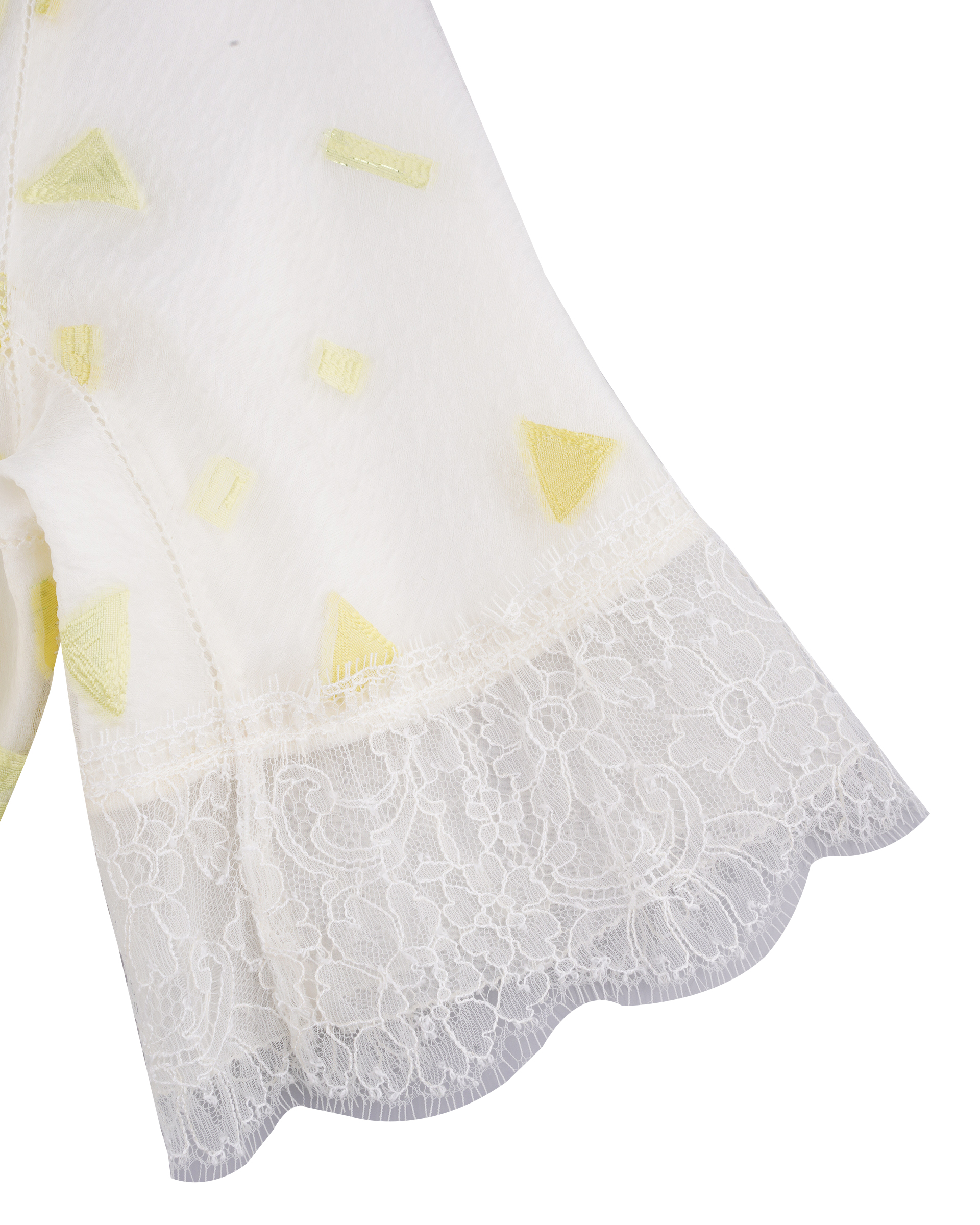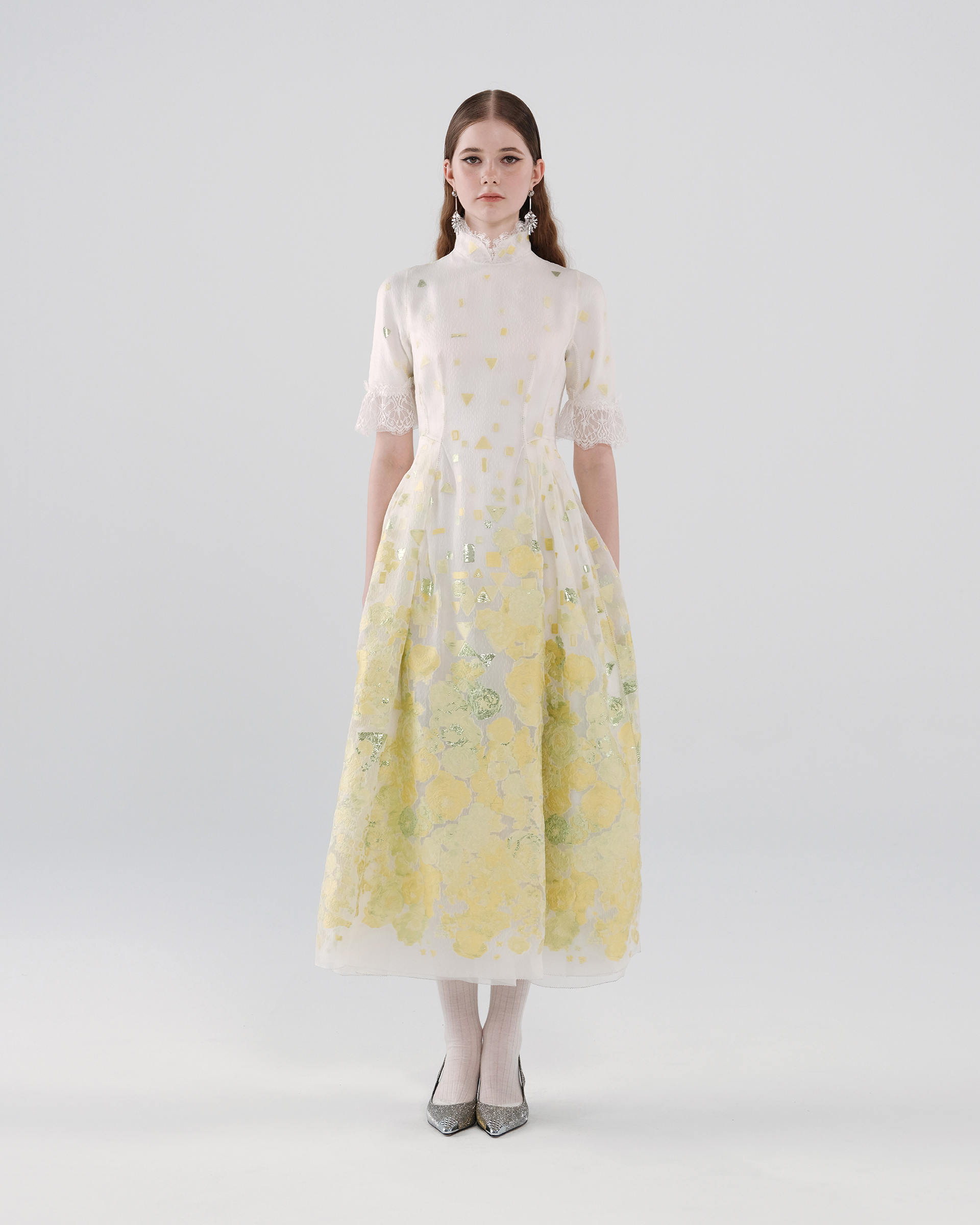 This dress is made from a special interwoven fabric. Combined with jacquard totem, it is light and airy to wear. The cuffs are spliced with soft lace to better slim the arm line.