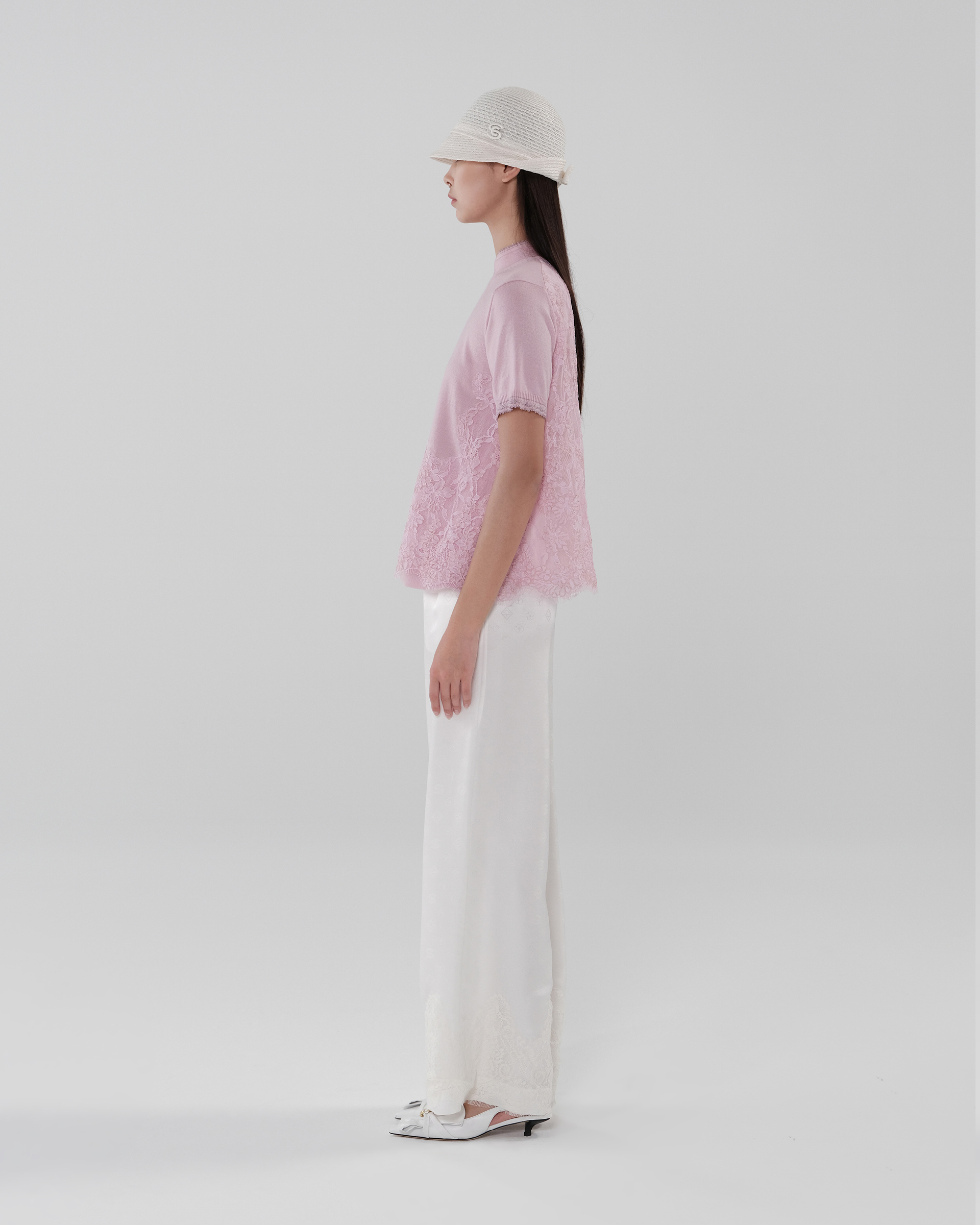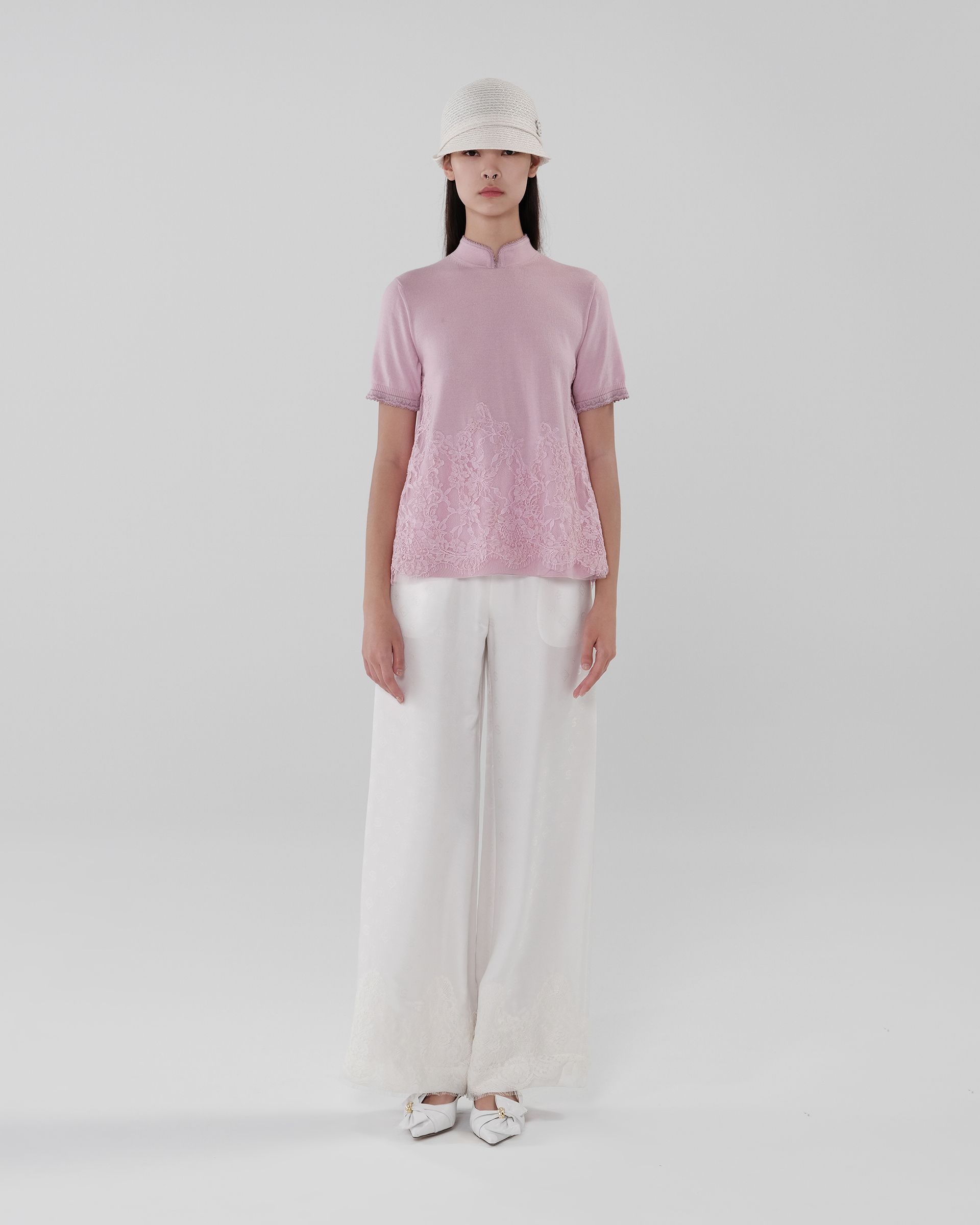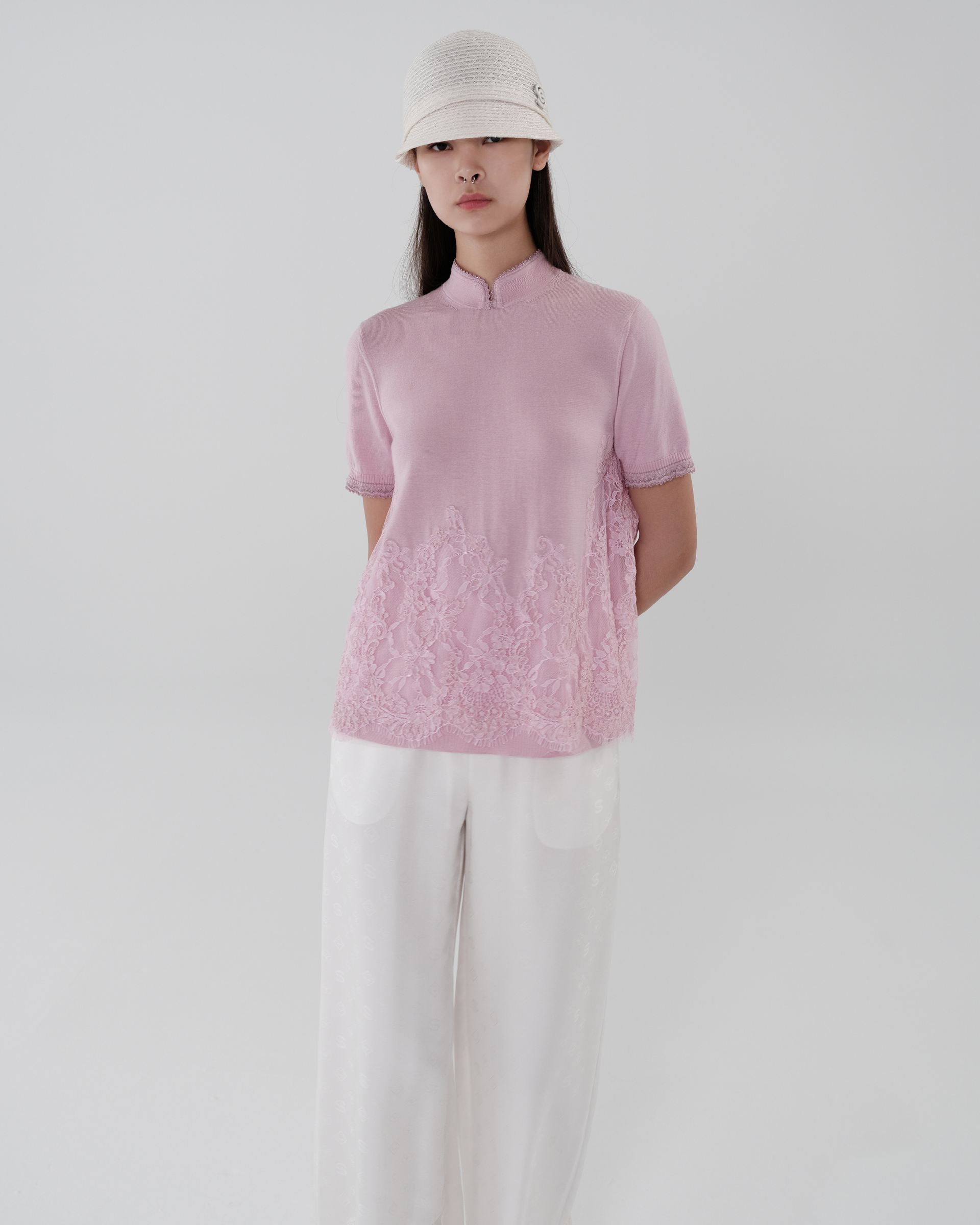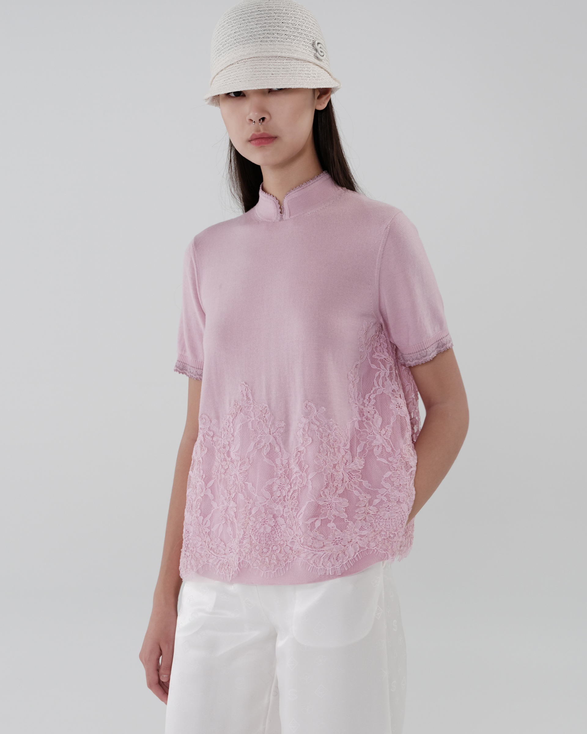 This piece is spliced with large lace at the hem, and the inner layer of silk is comfortable and flattering to the skin; the Chinese stand-up collar and slant placket design emphasizes the calm and soft femininity.