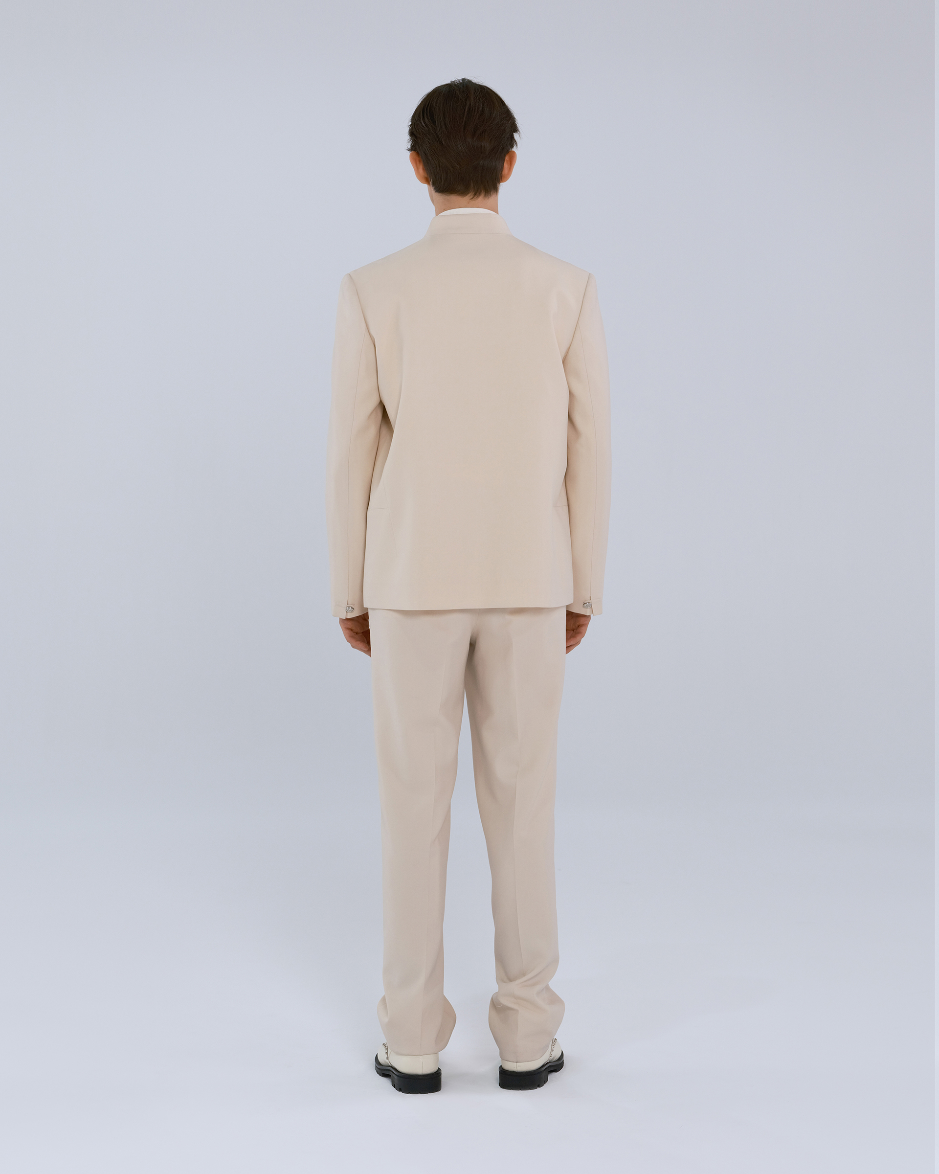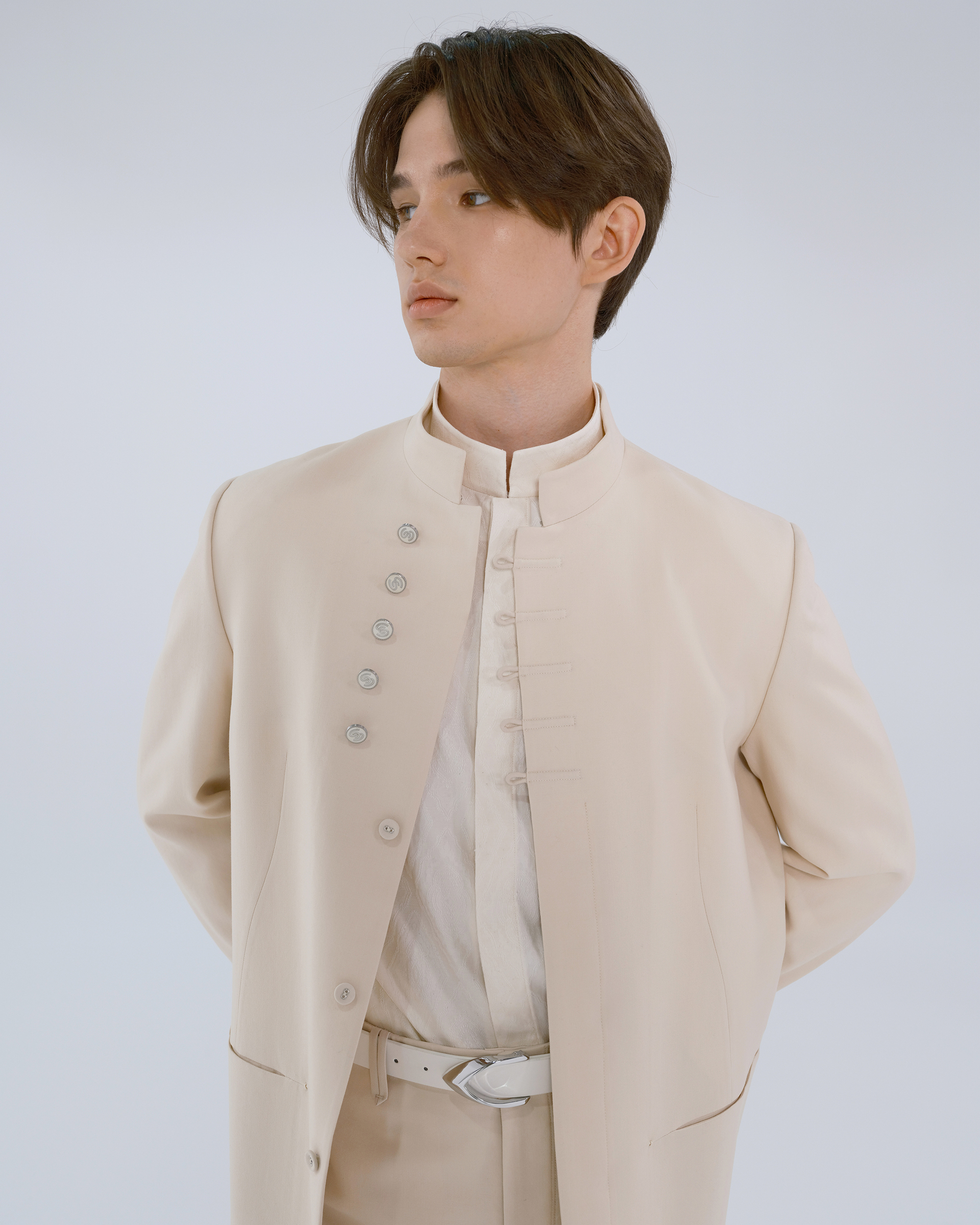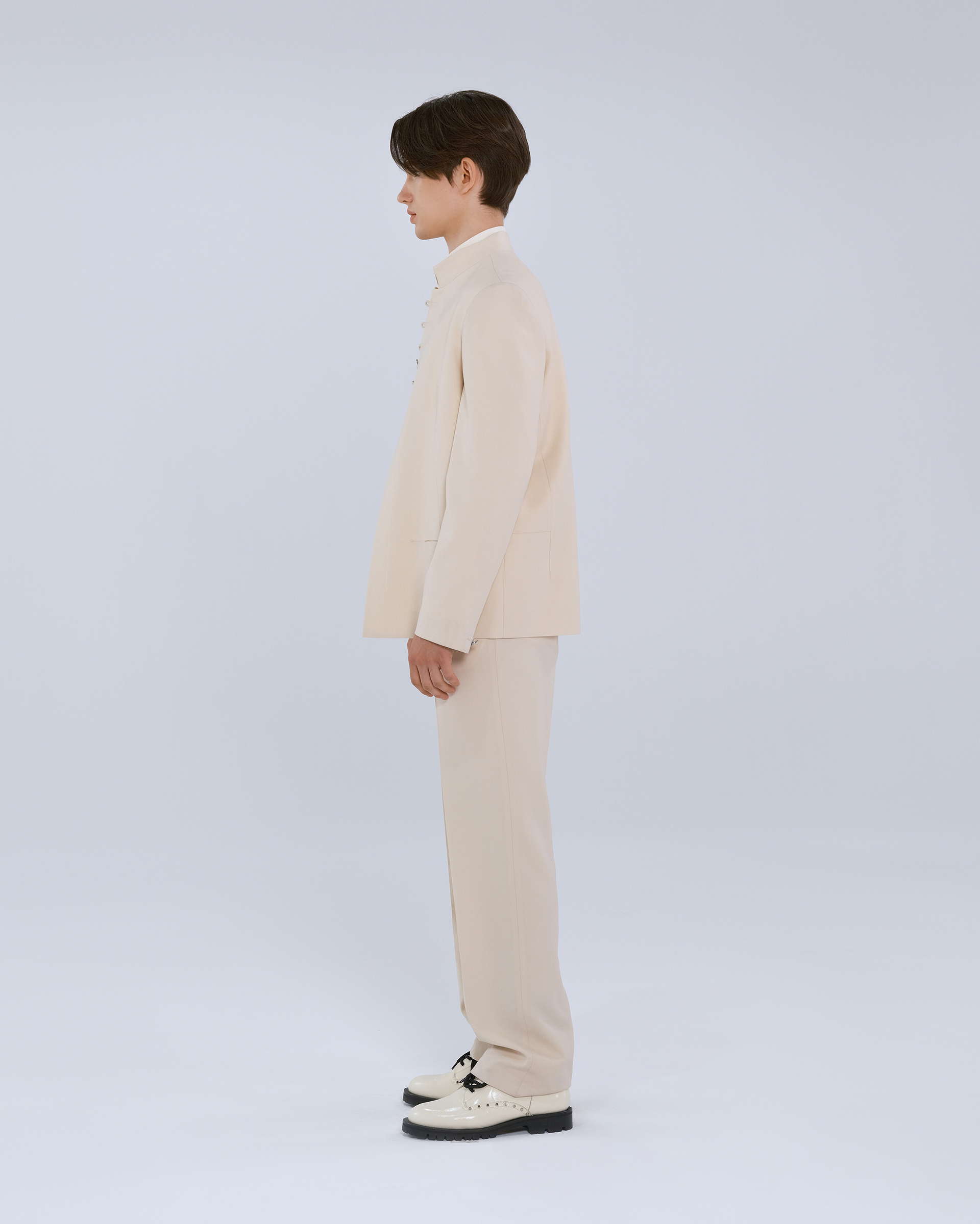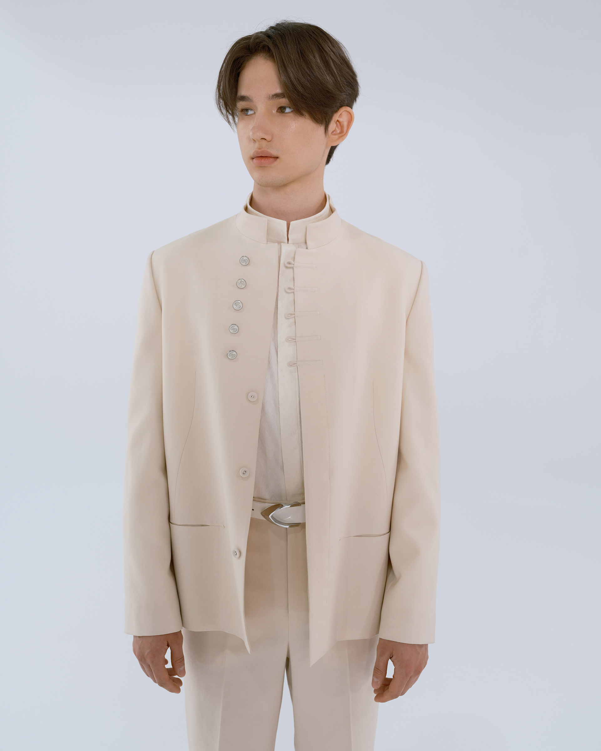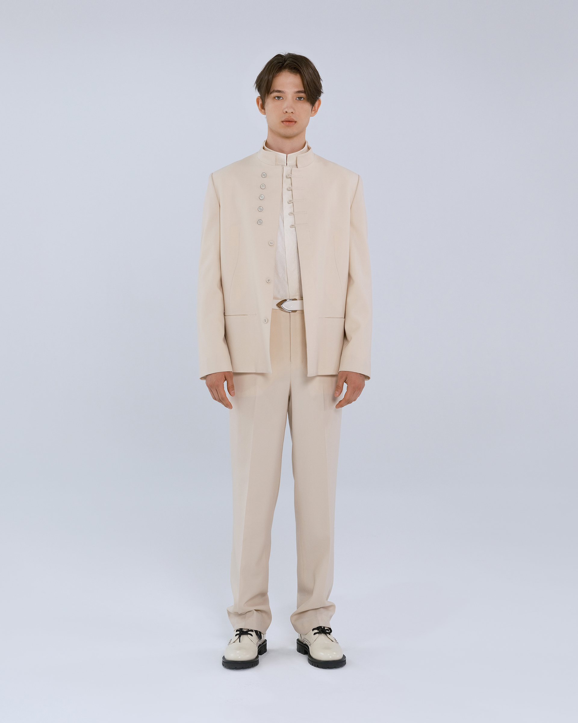 This piece is made of 100% wool fabric, with Chinese mandarin collar and button design, combining the quiet temperament of a scholar with vitality.