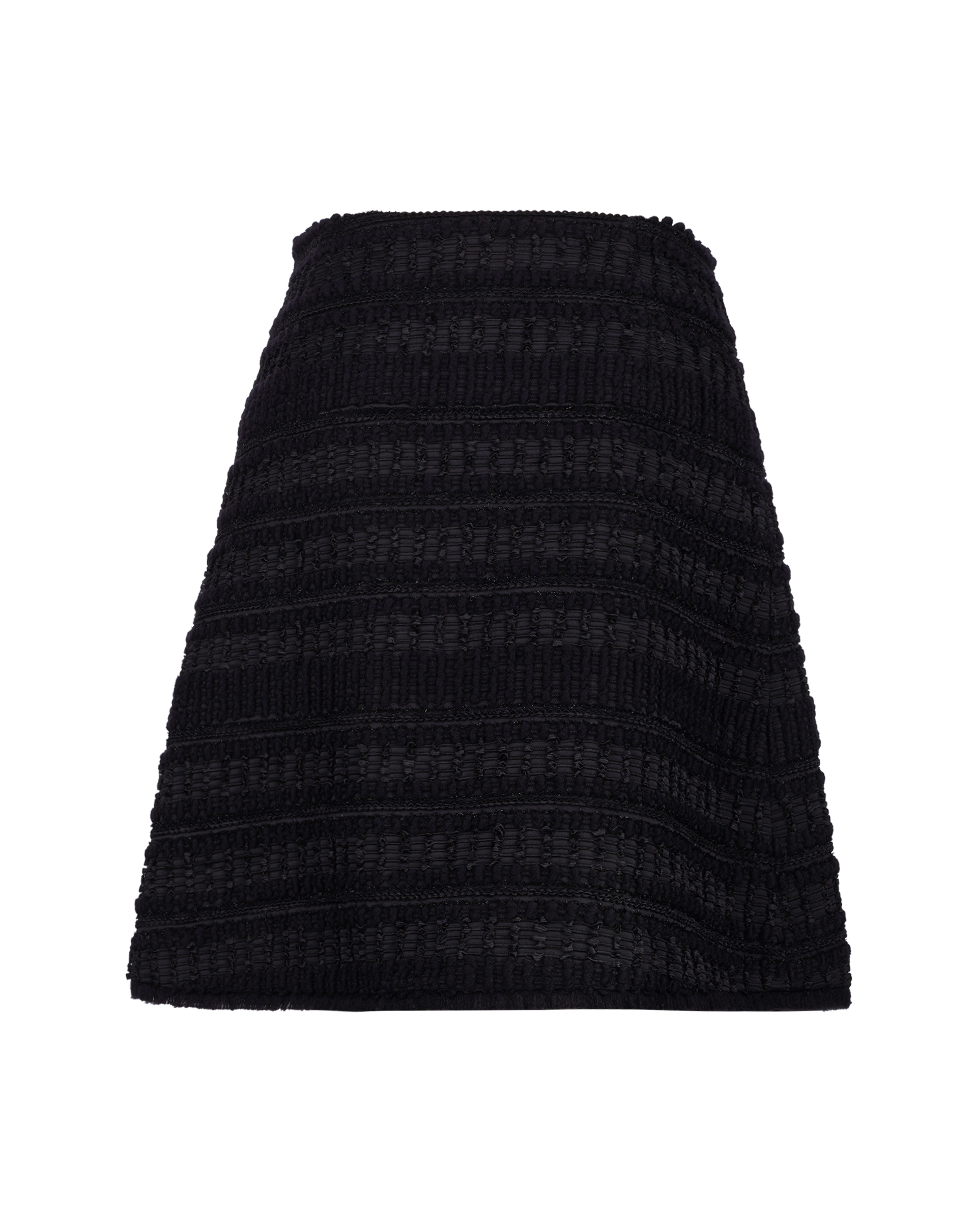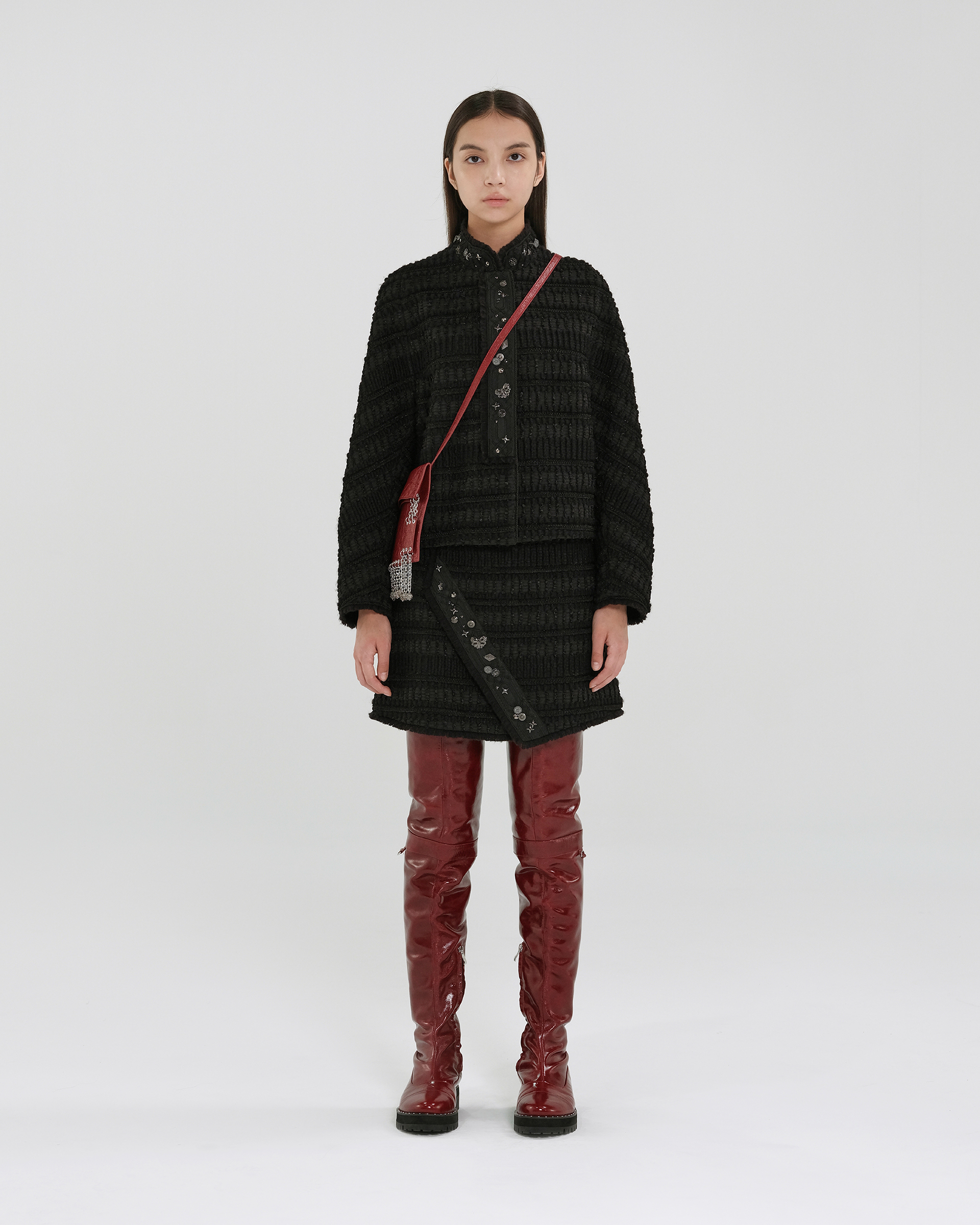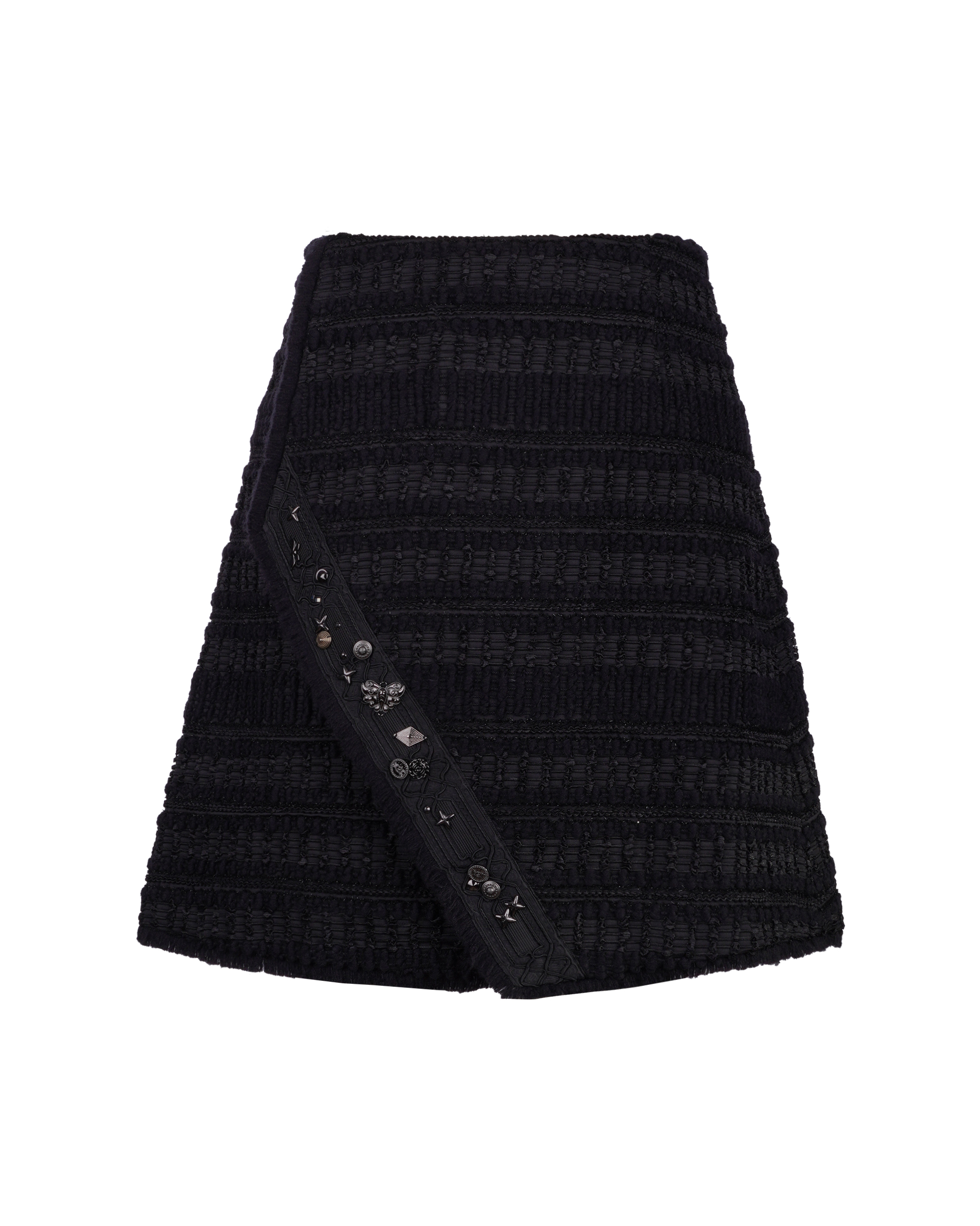 Drawing inspiration from Miao ethnic attire, the overall pattern features woven bands in varying shades, complemented by an asymmetrical cut. Pair it with the jacket from the same collection for a coordinated look.