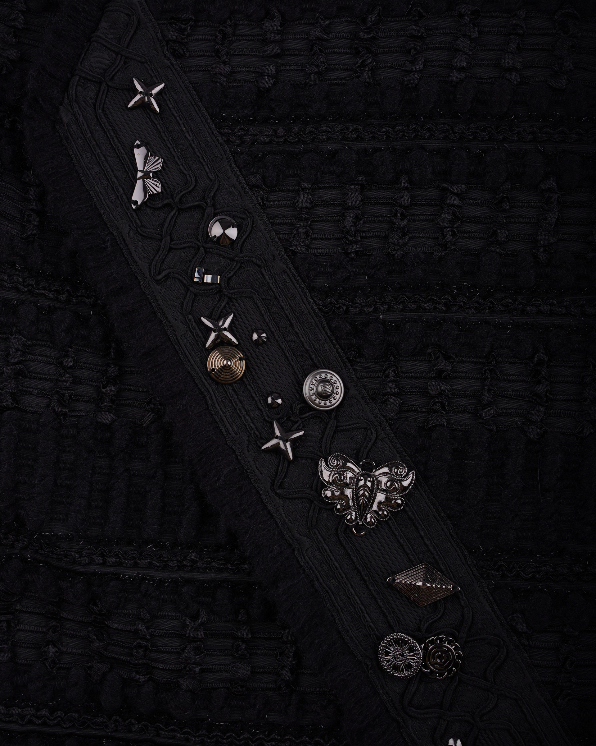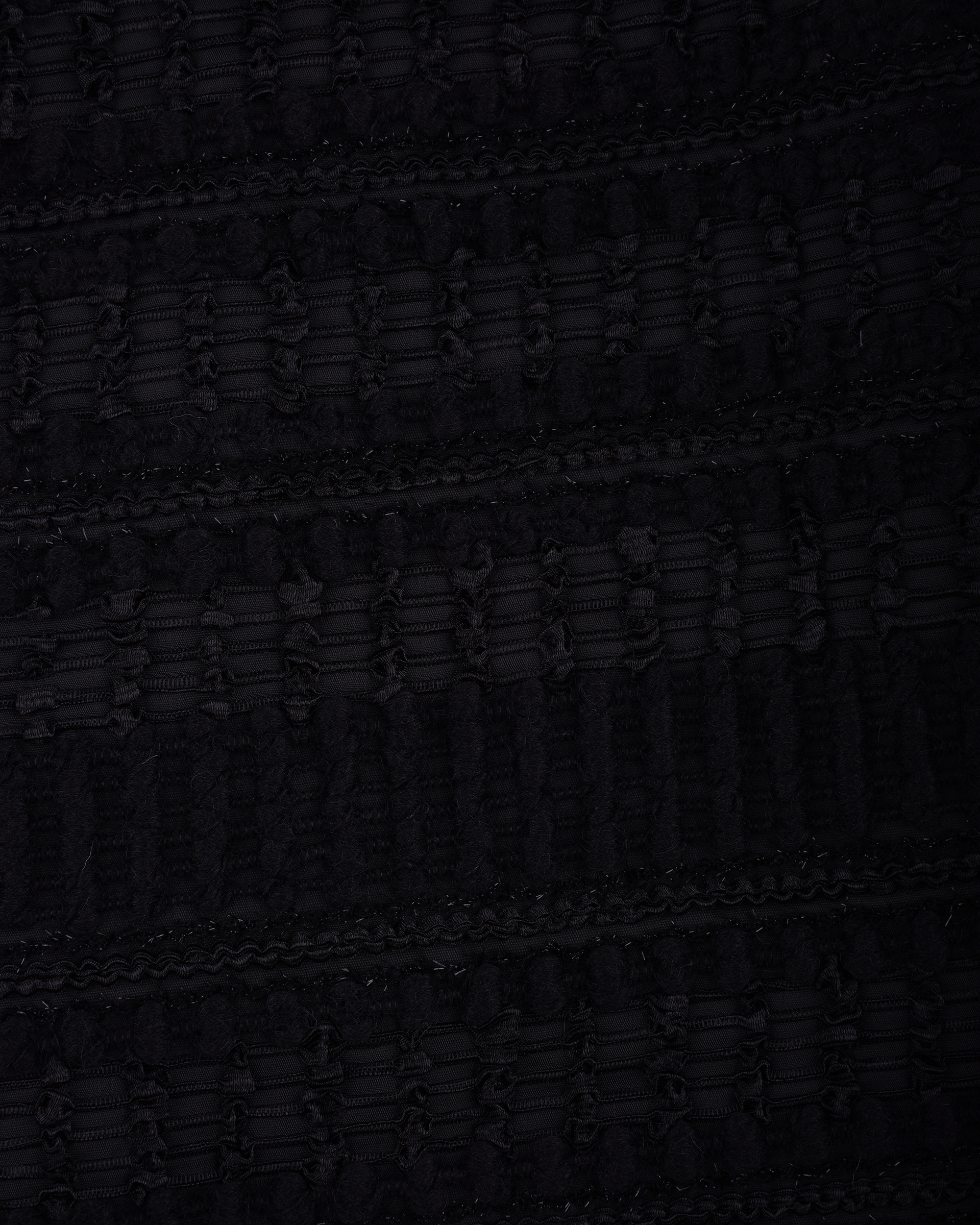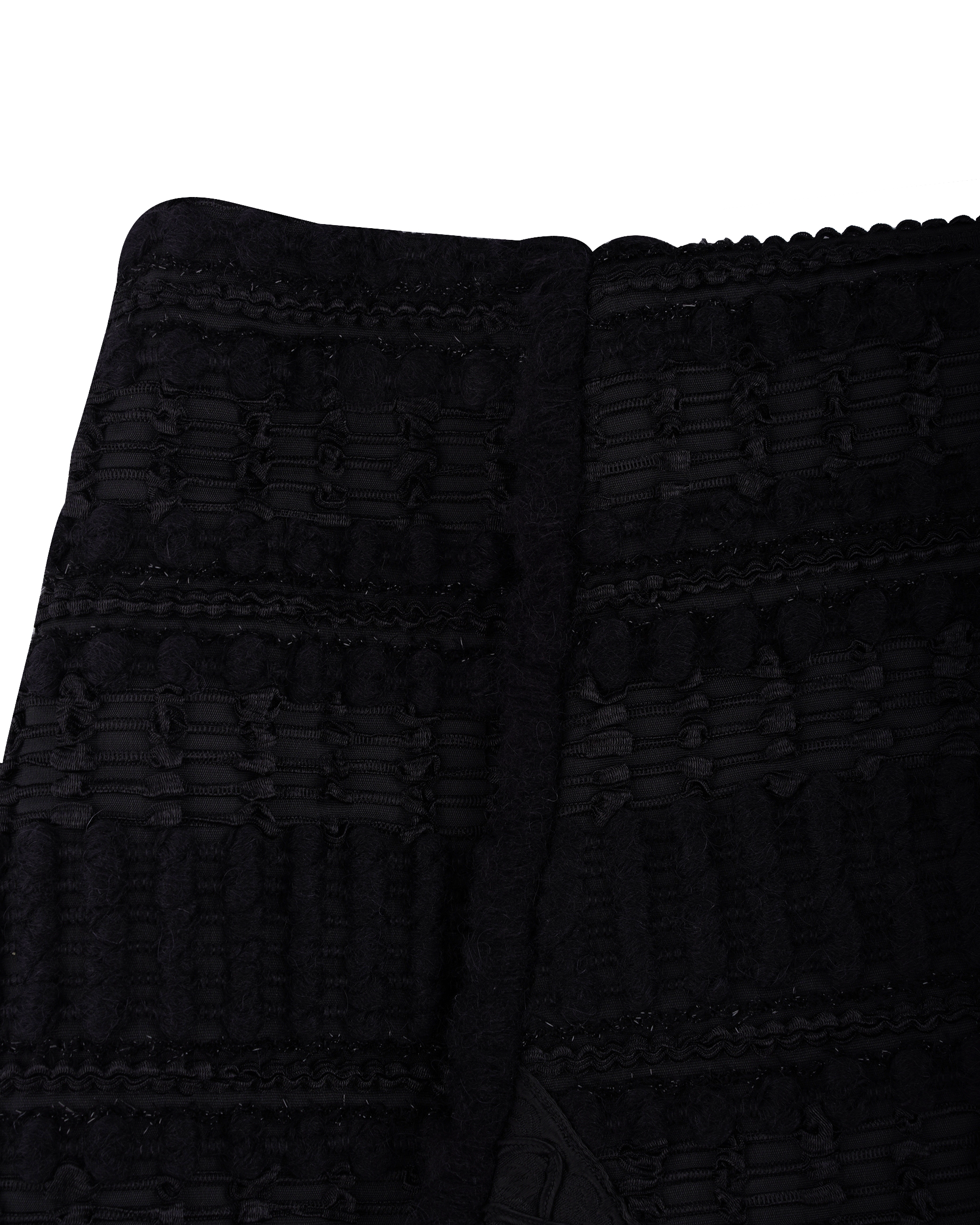 Drawing inspiration from Miao ethnic attire, the overall pattern features woven bands in varying shades, complemented by an asymmetrical cut. Pair it with the jacket from the same collection for a coordinated look.