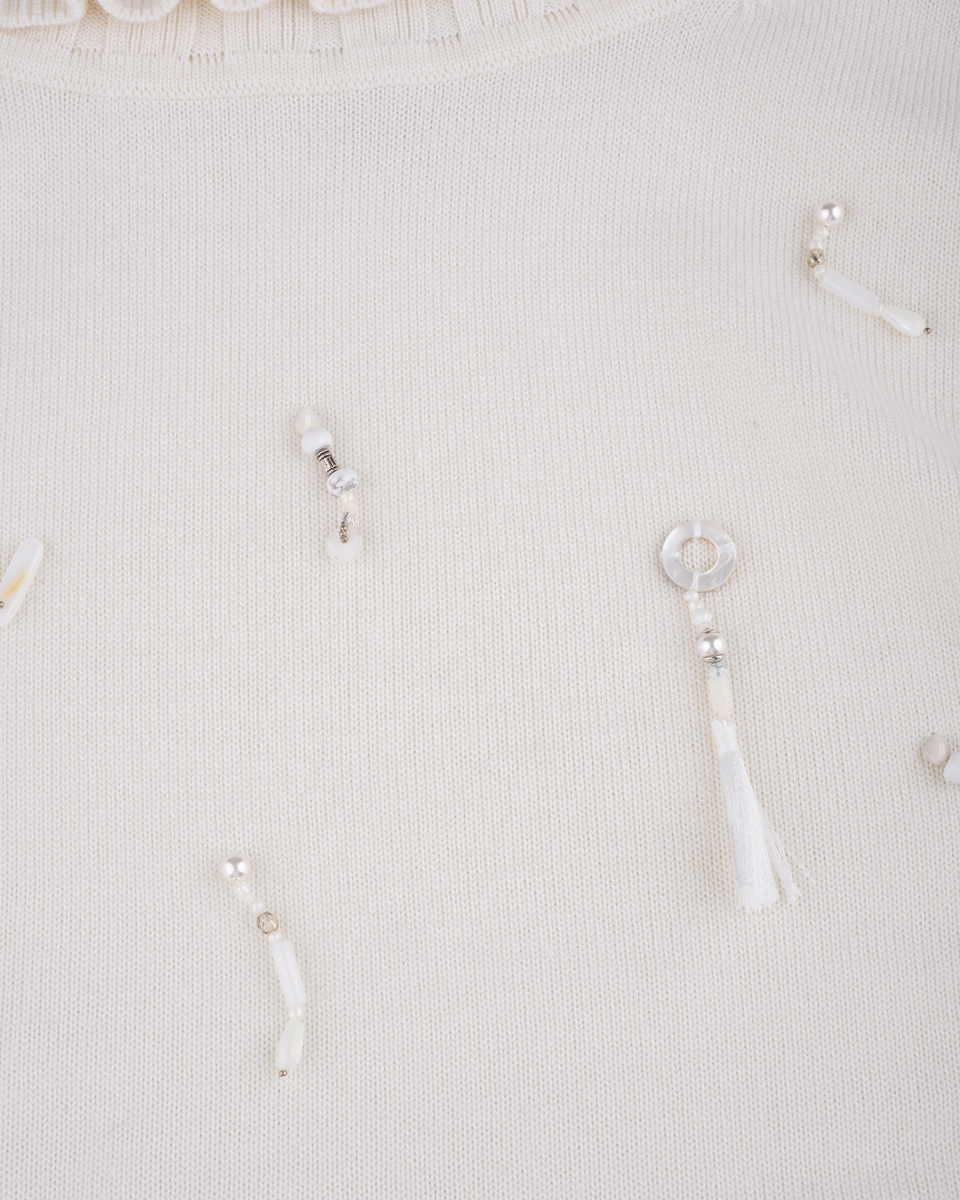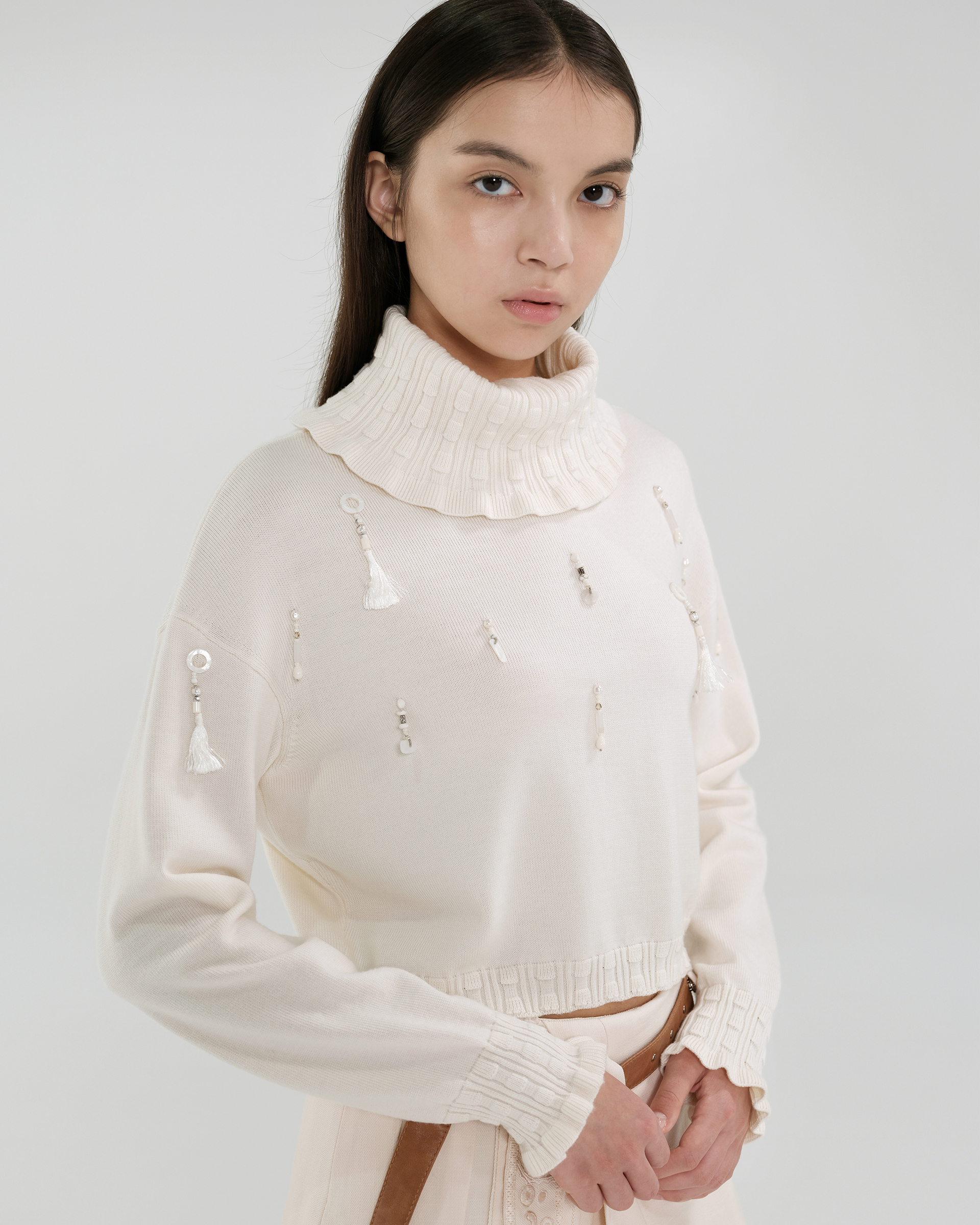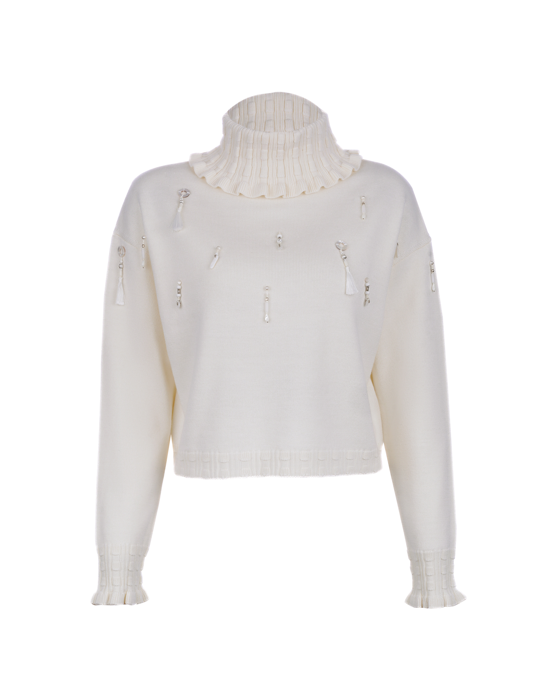 Far and Near Collection High-Neck Beaded Fringe Sweater
