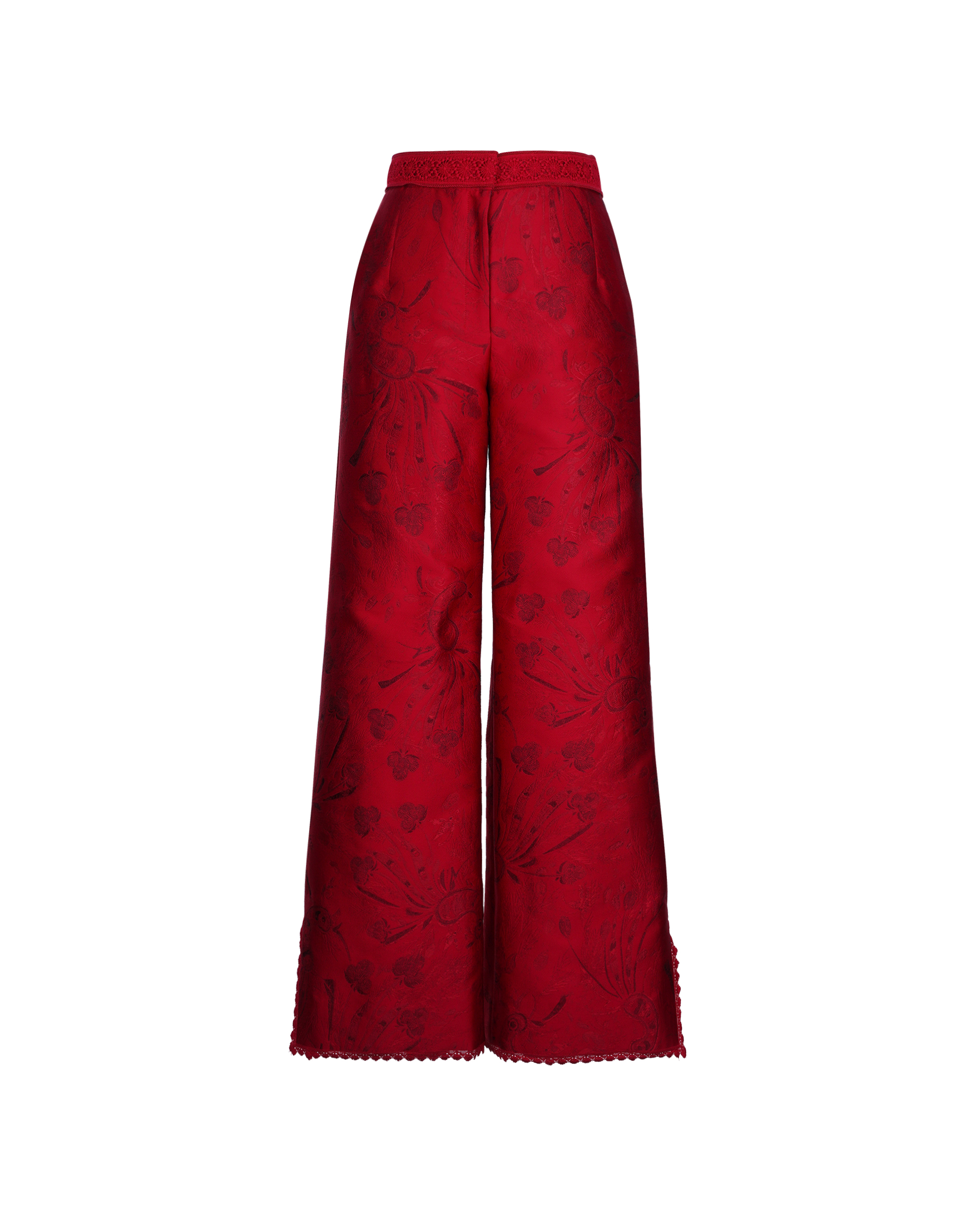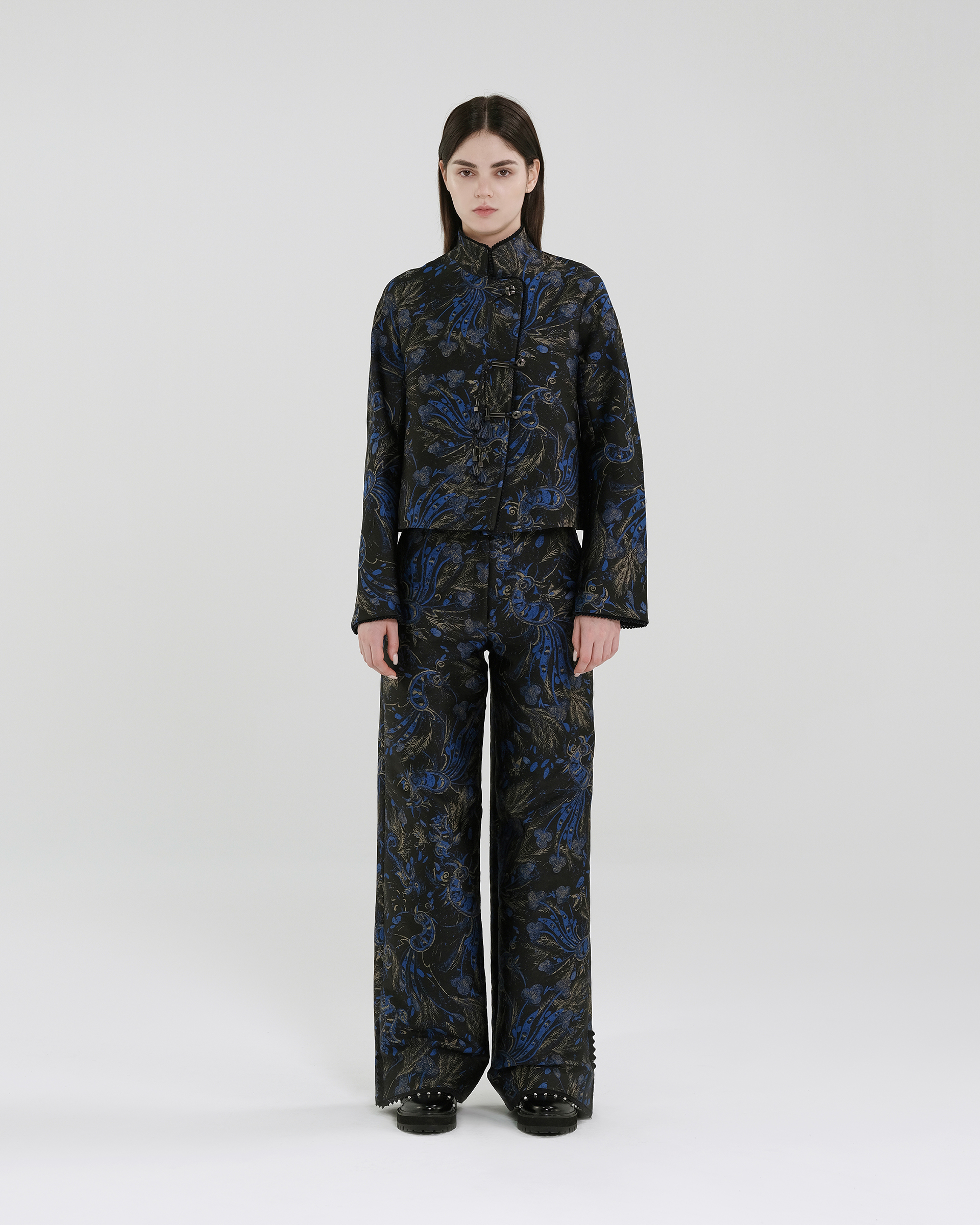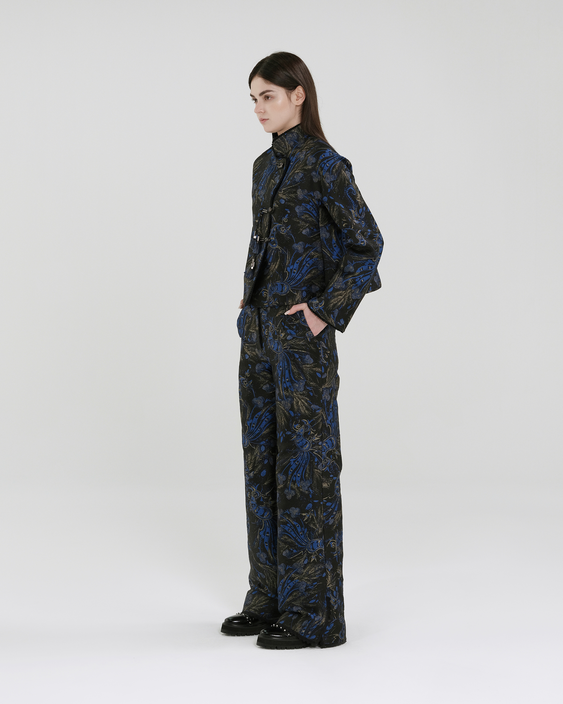 This season's opening print design draws inspiration from Miao totems and feathers, featuring a substantial jacquard fabric paired with slightly flared trousers for a structured silhouette.
