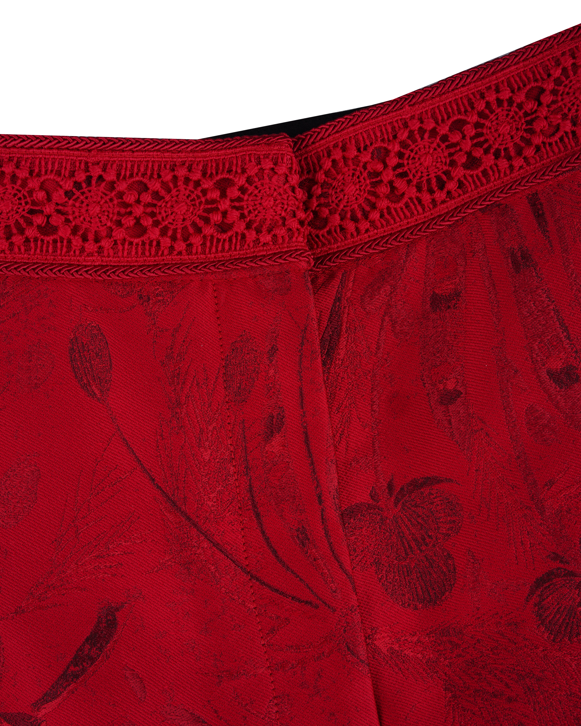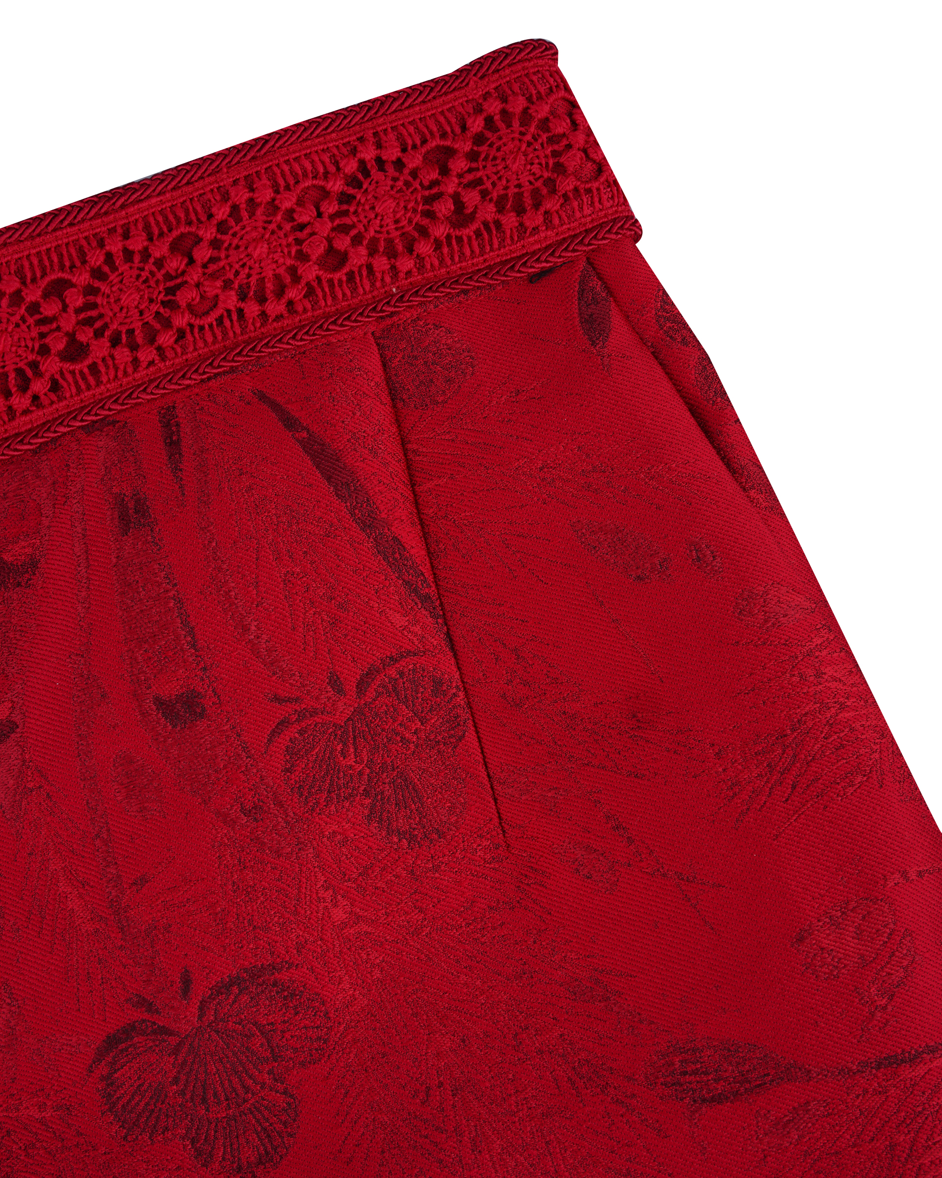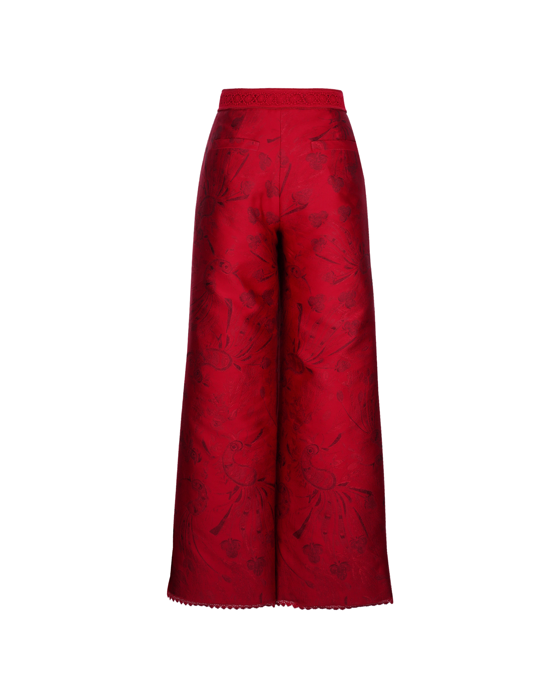 This season's opening print design draws inspiration from Miao totems and feathers, featuring a substantial jacquard fabric paired with slightly flared trousers for a structured silhouette.