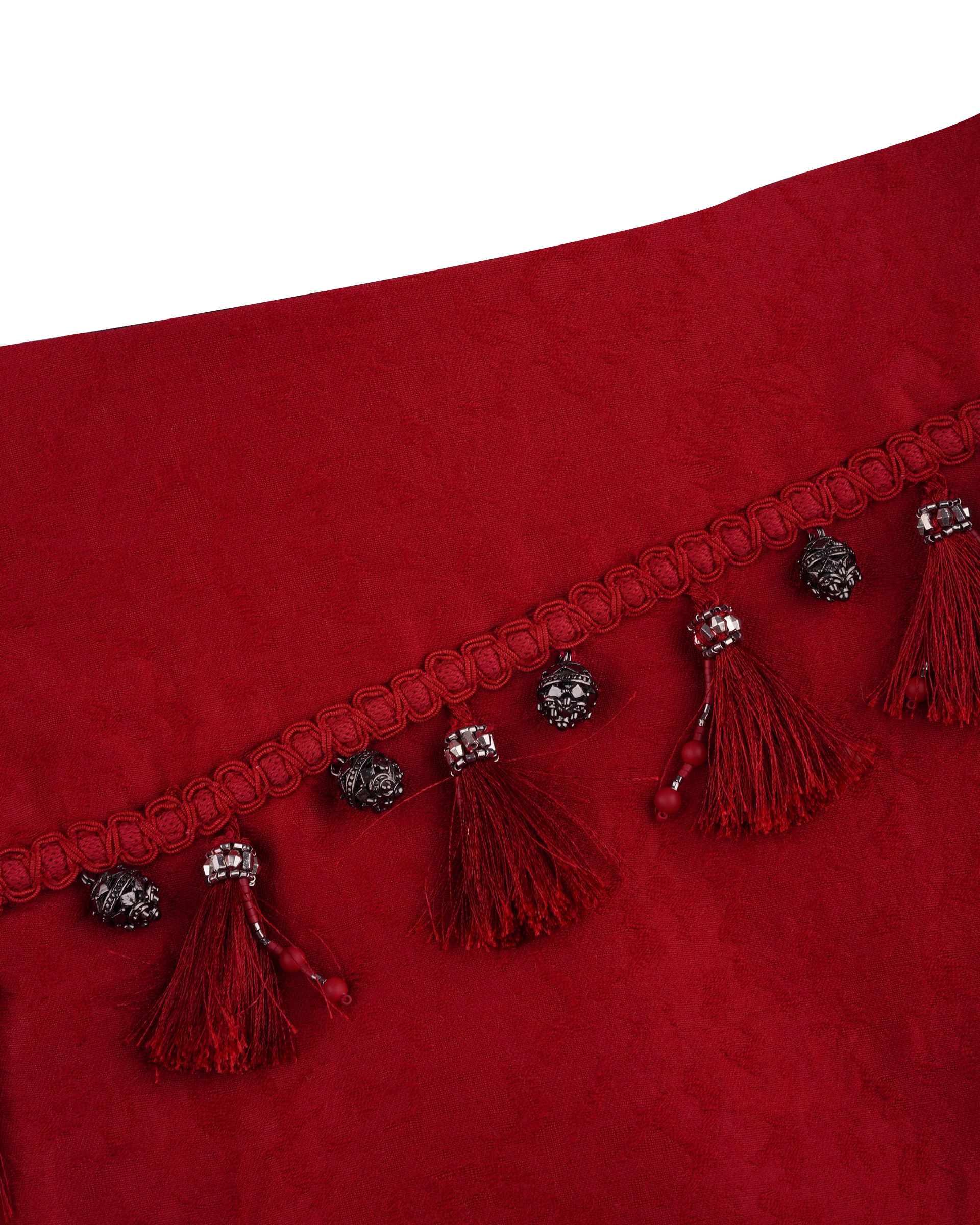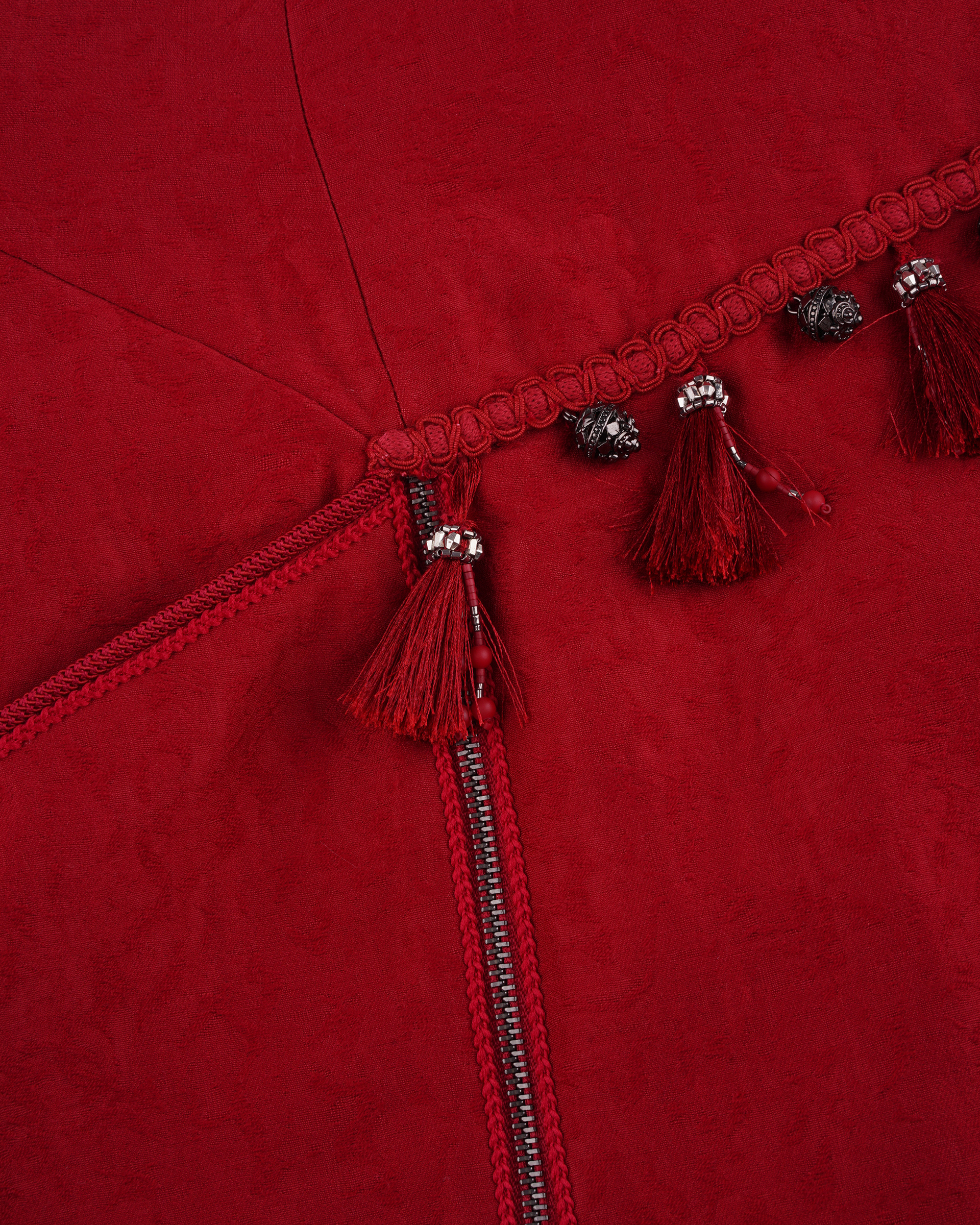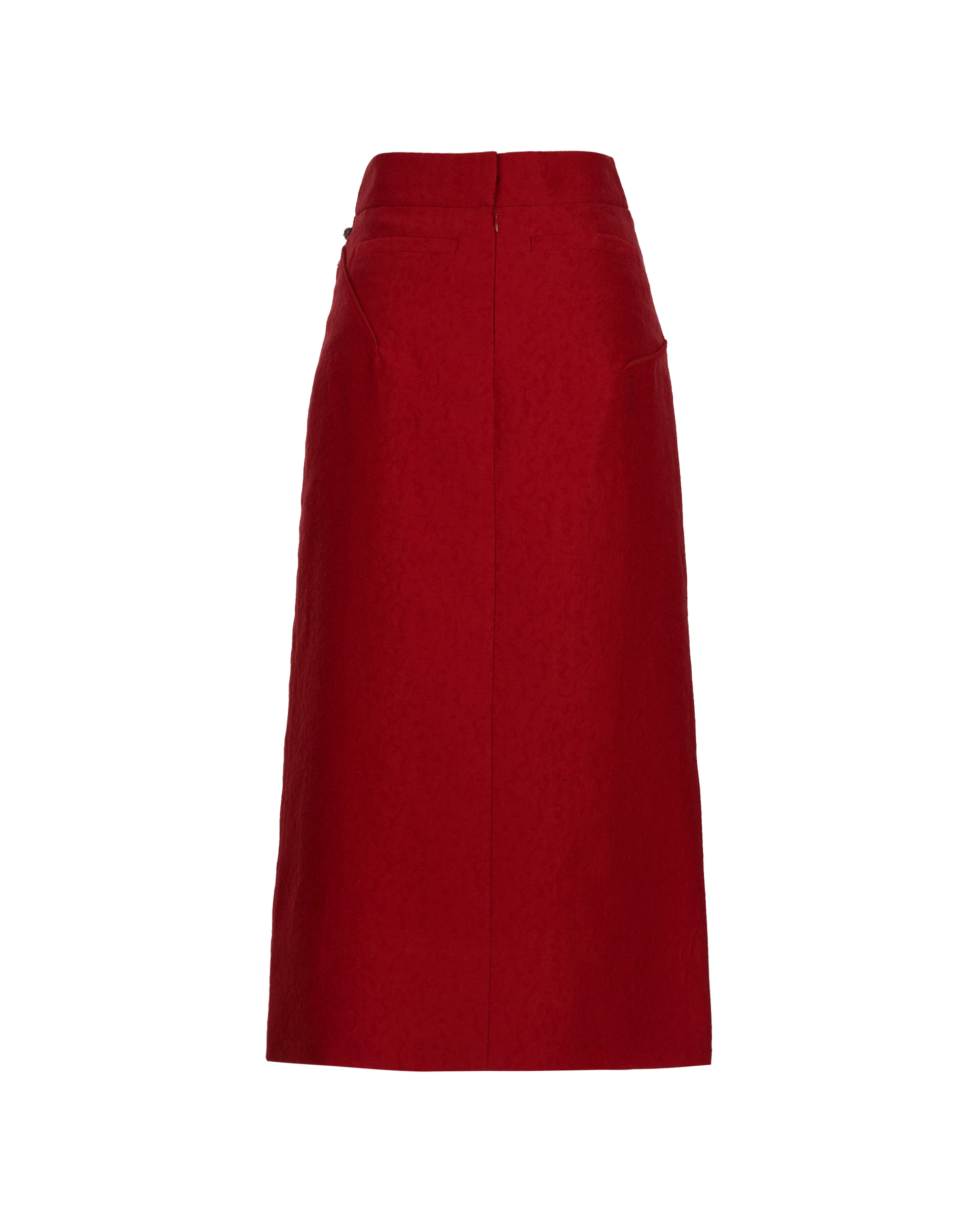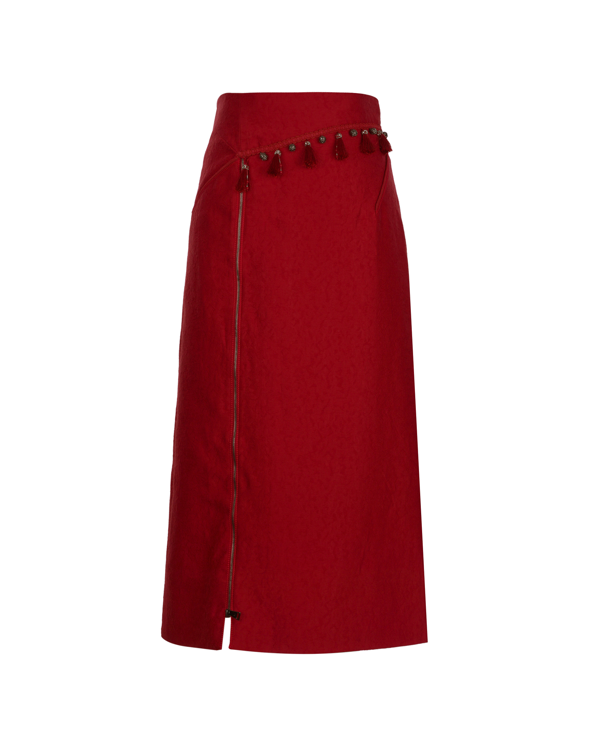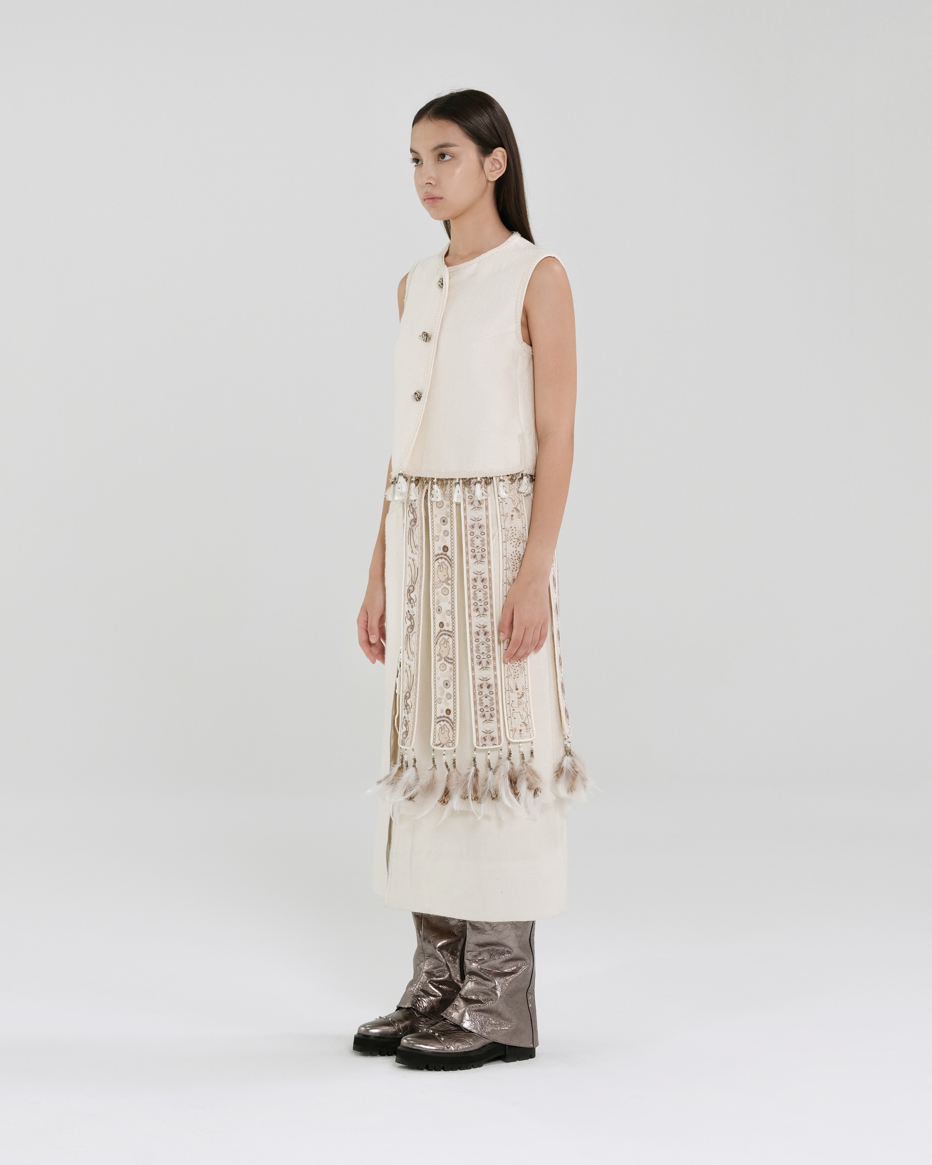 This piece features a straight silhouette crafted from a silk-wool blend fabric, accented with playful fringe details. The side zipper allows for adjustable slits, and it can be paired with the matching vest for a complete set.