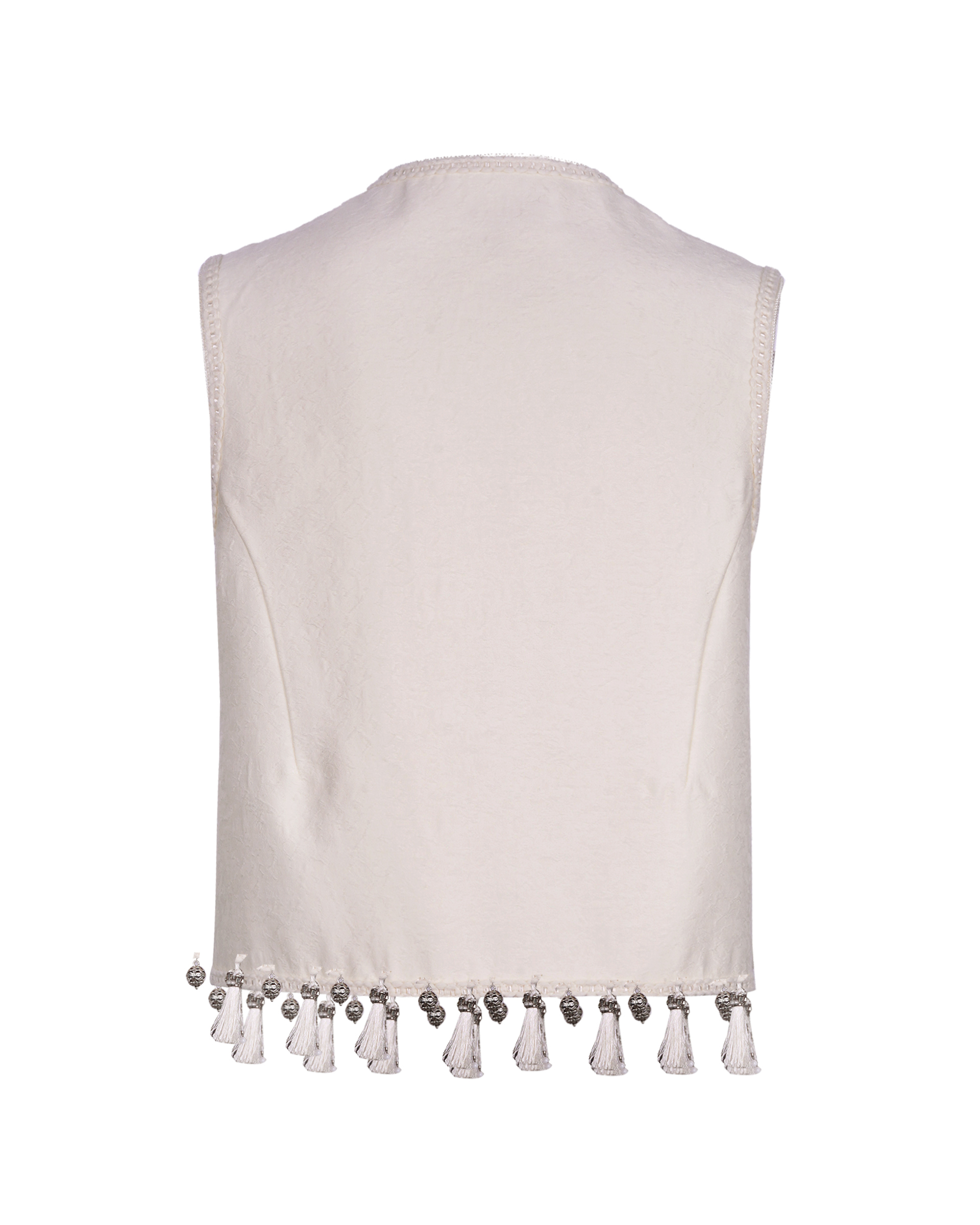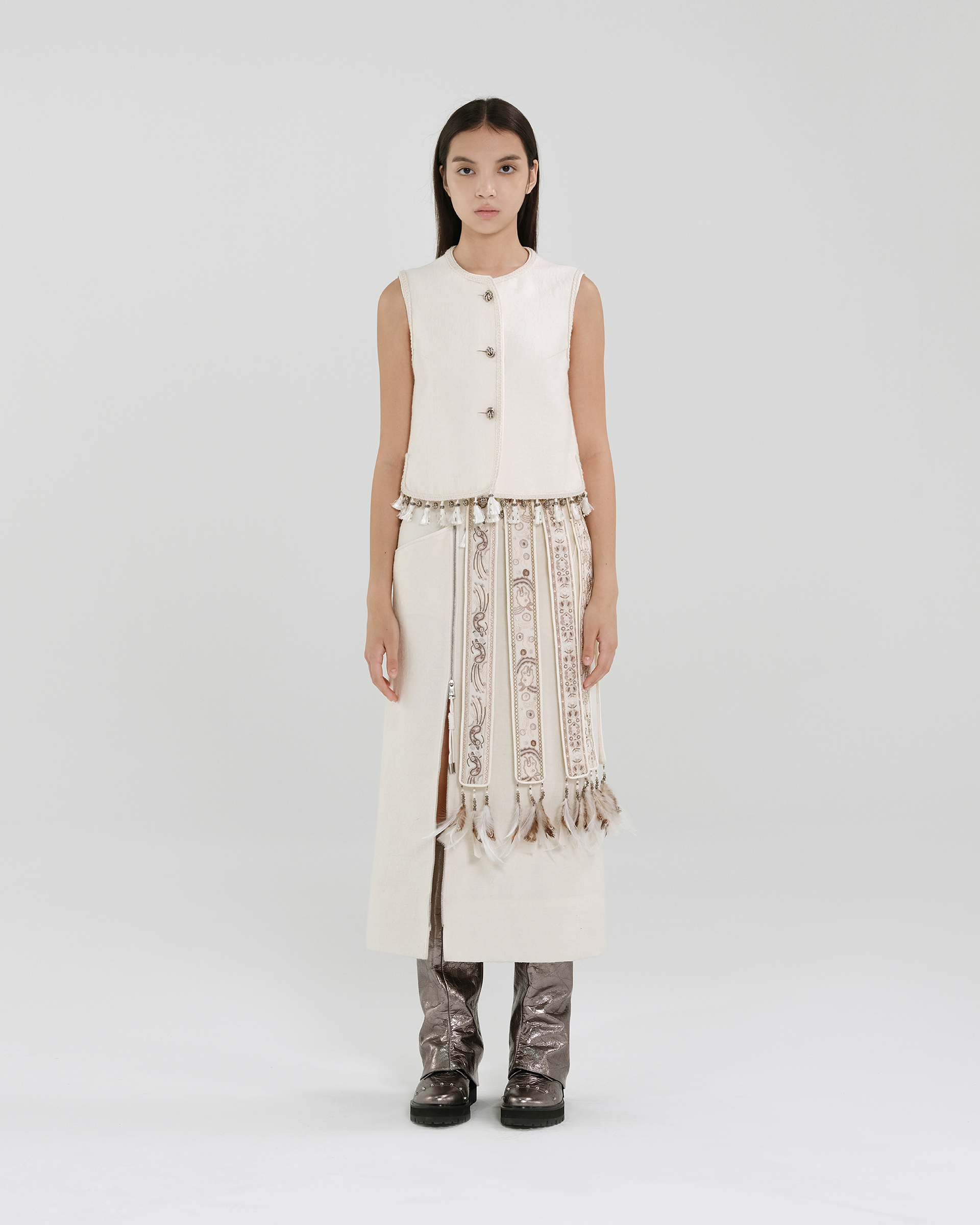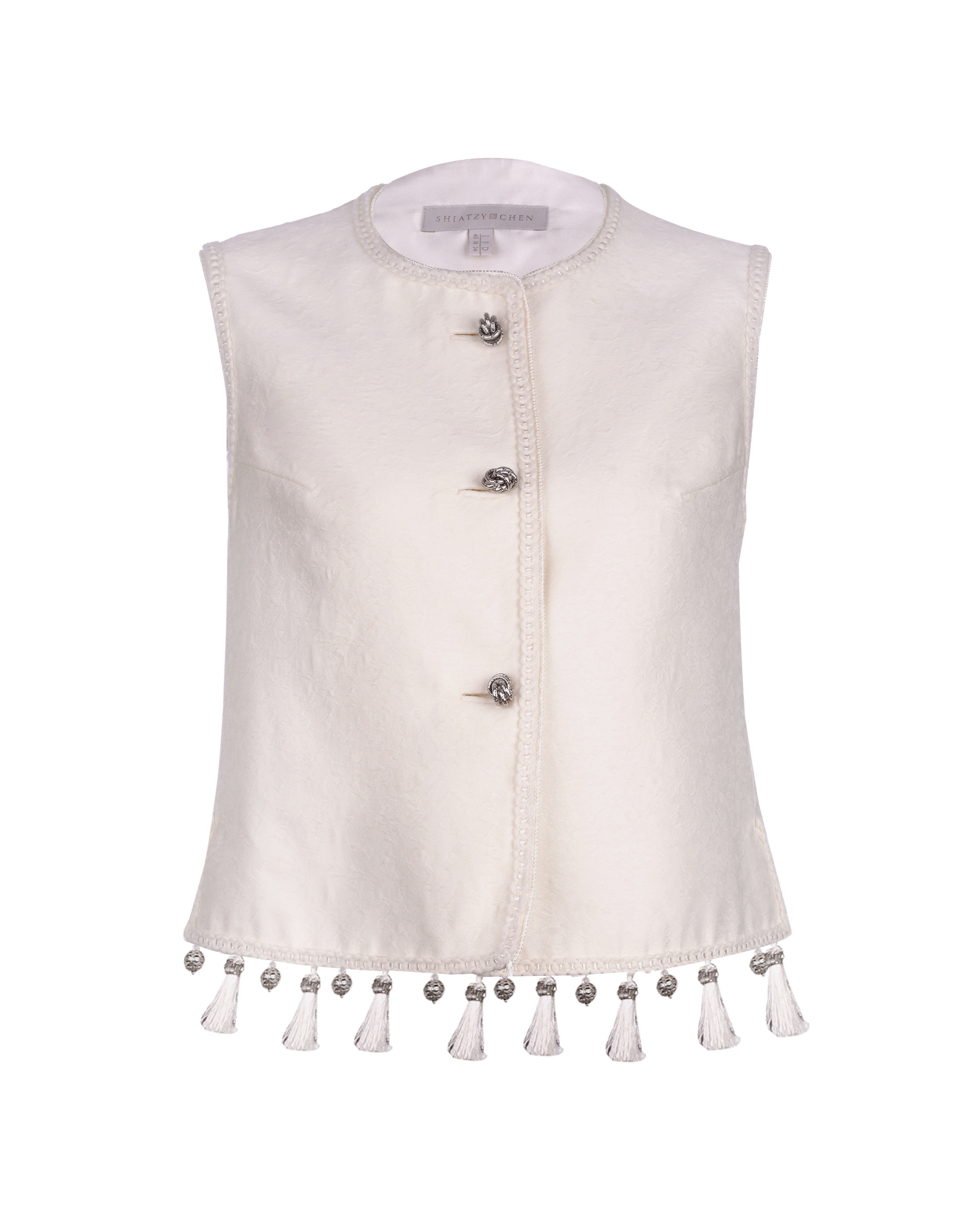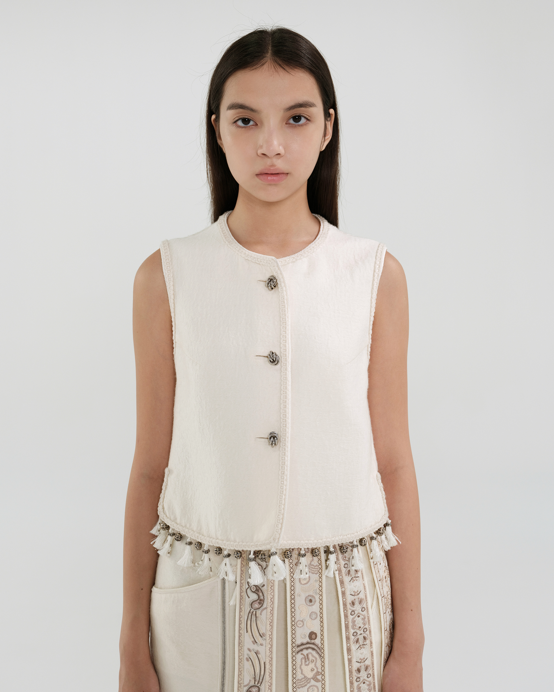 This piece is crafted from a silk-wool blend fabric, featuring delicate and dynamic fringe detailing at the hem.Pair it with the skirt from the same collection for a complete look.
