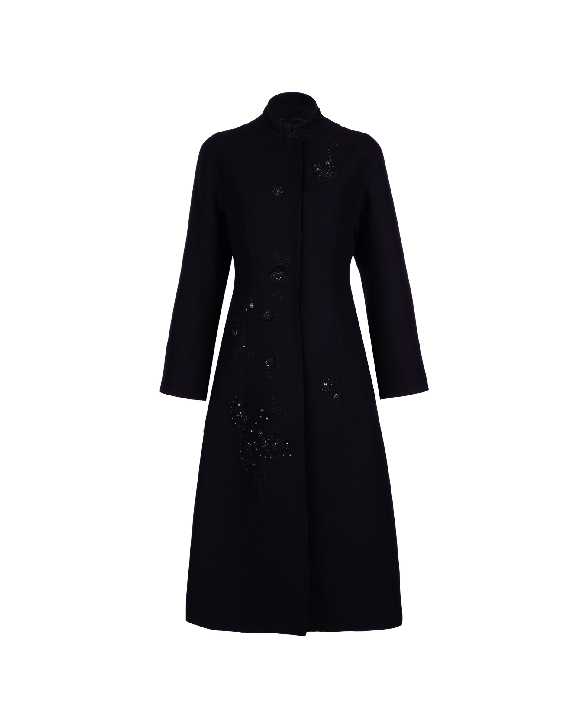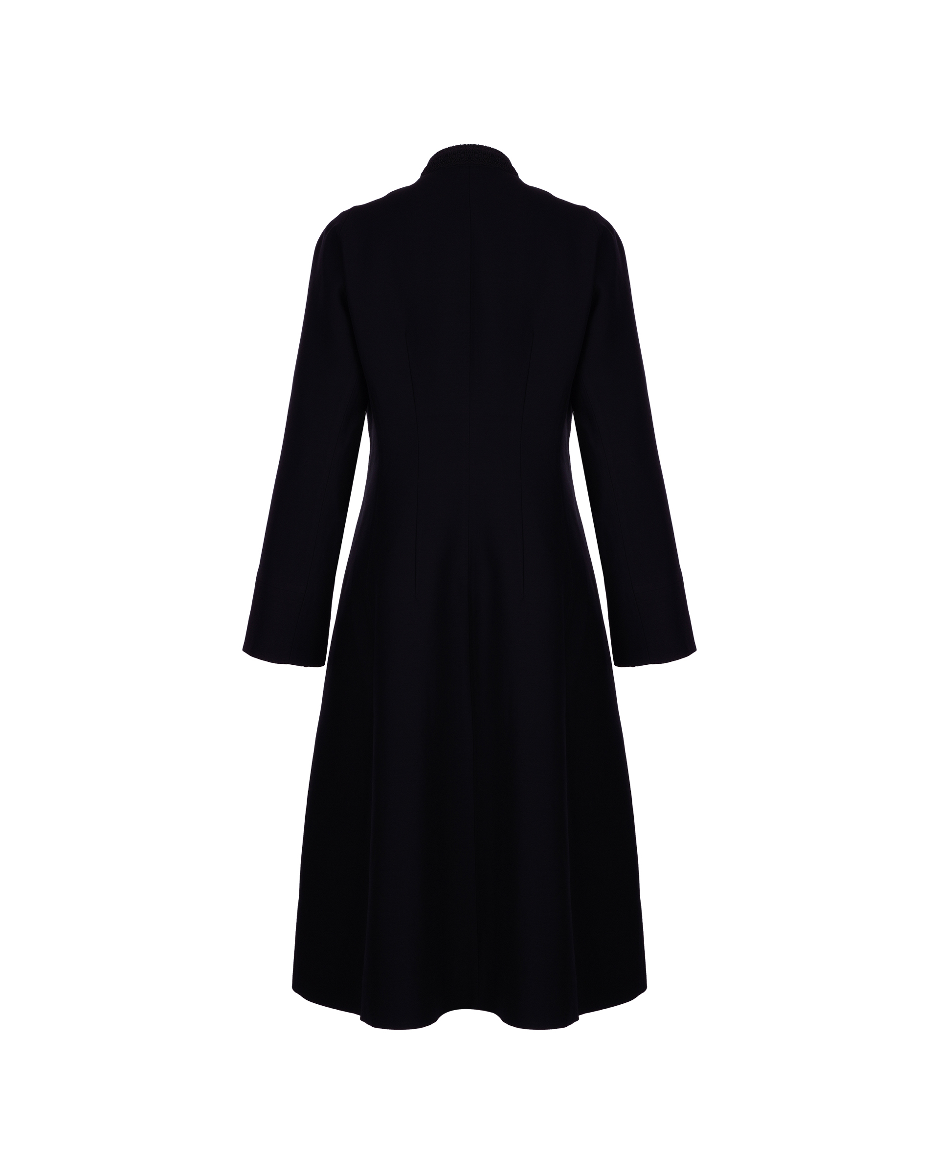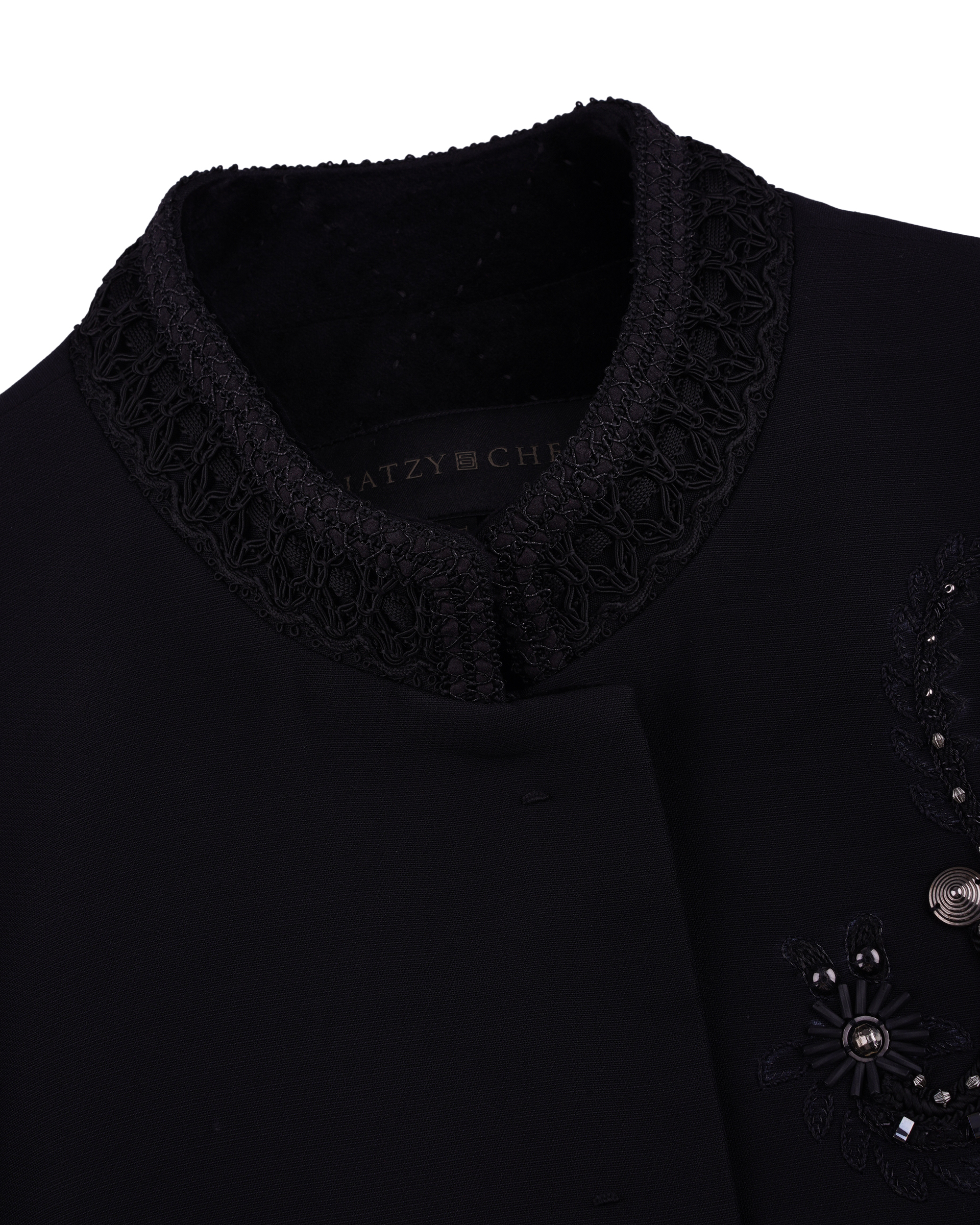 Miao embroidery outlines the totems of Miao mythology, while the neckline features precision-woven ribbon edging. The fitted A-line silhouette delivers a sharp, clean look.