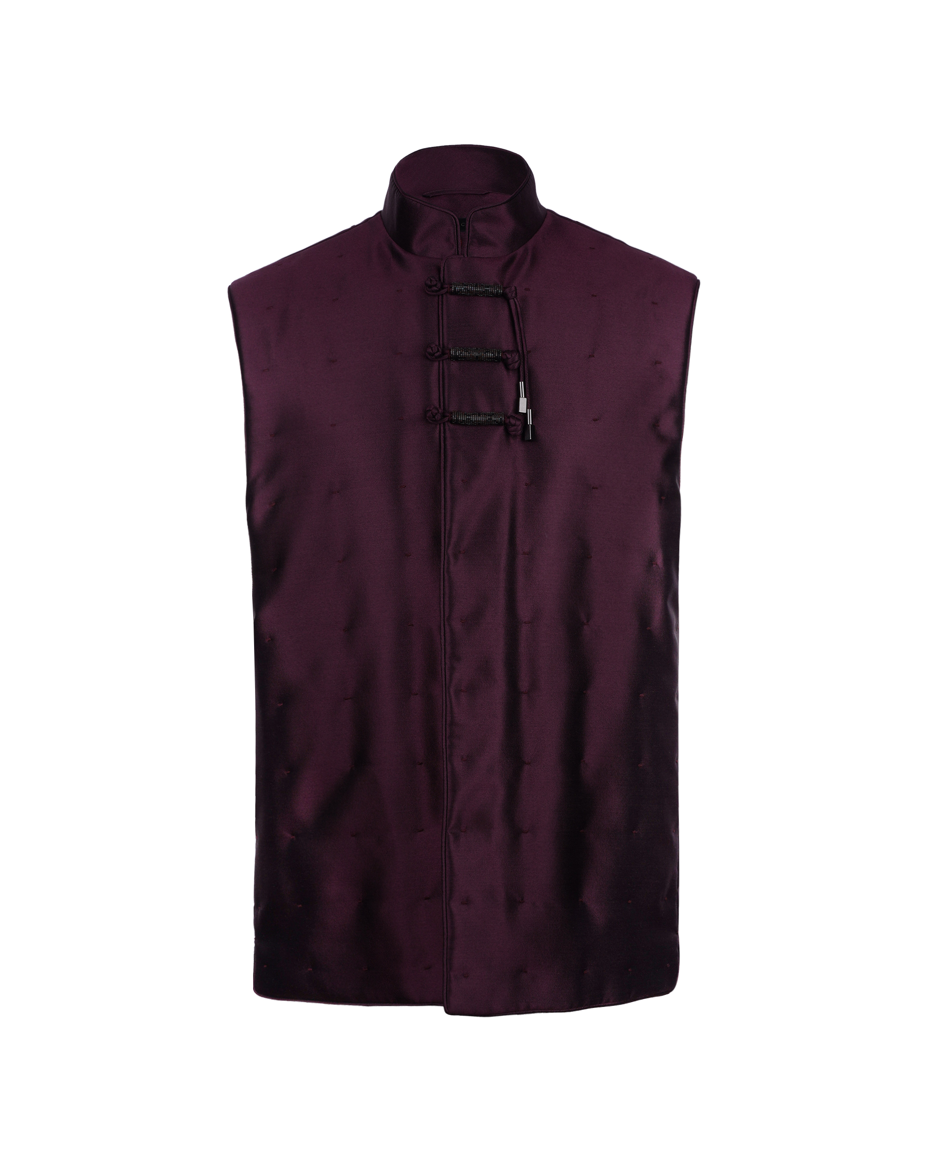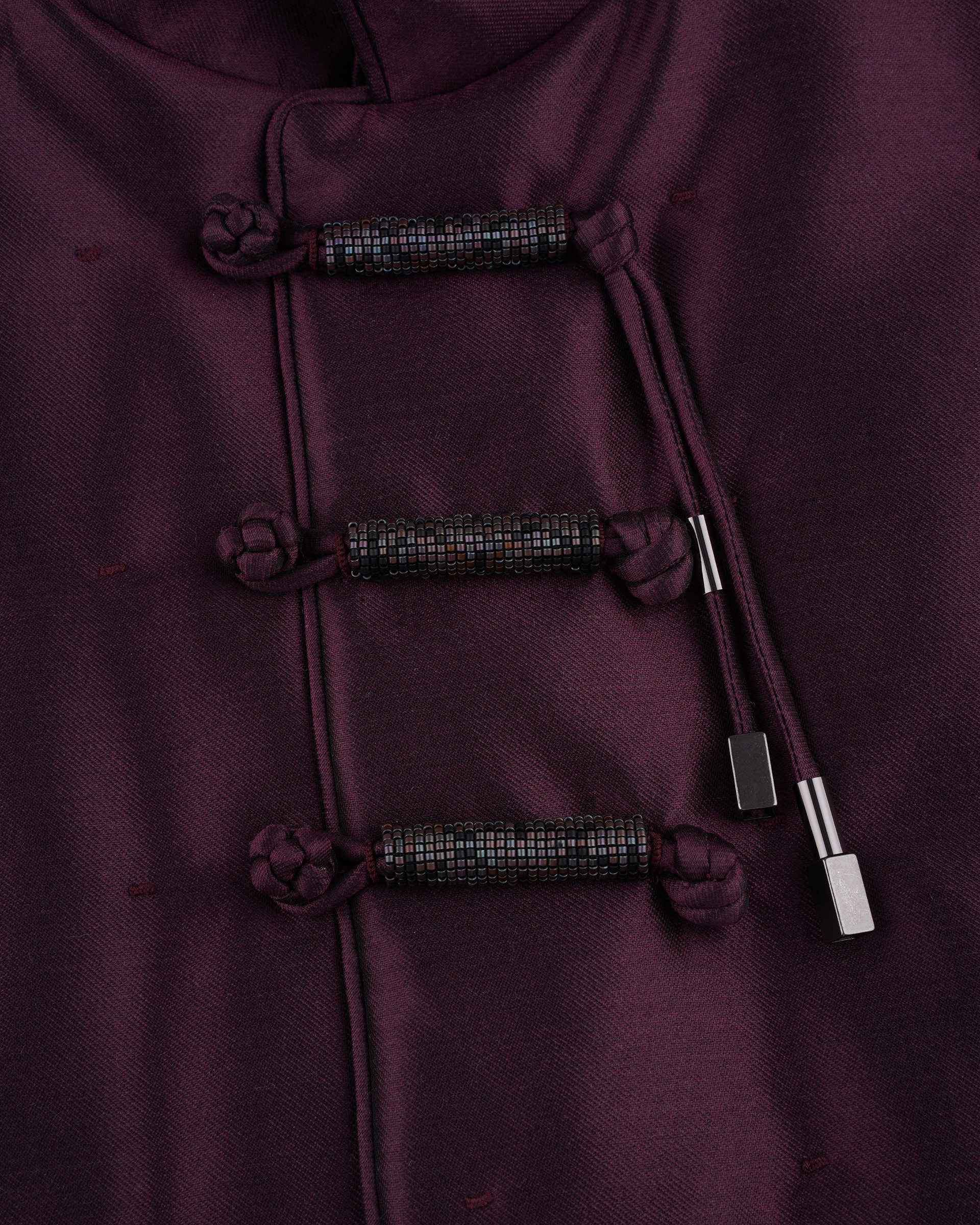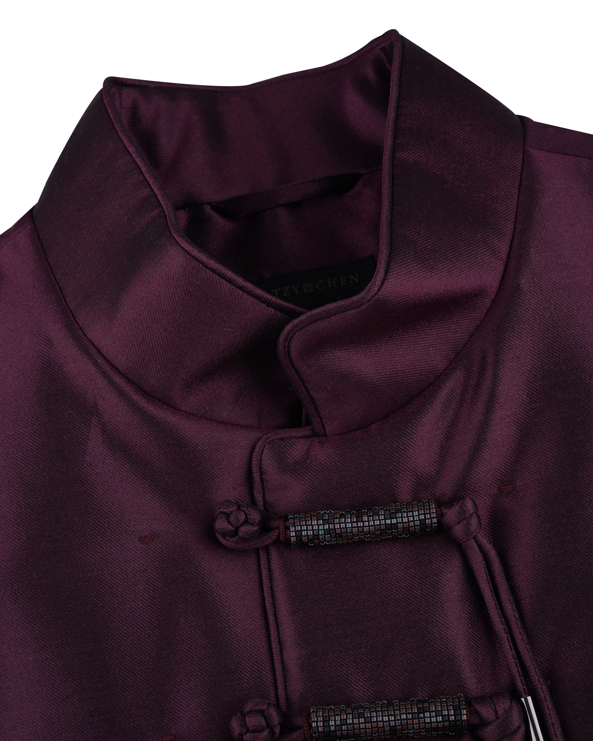 This piece is crafted from a silk-wool blend fabric, featuring a stand-up collar paired with hand-strung beaded buttons—a fusion of tradition and ethnic flair.
