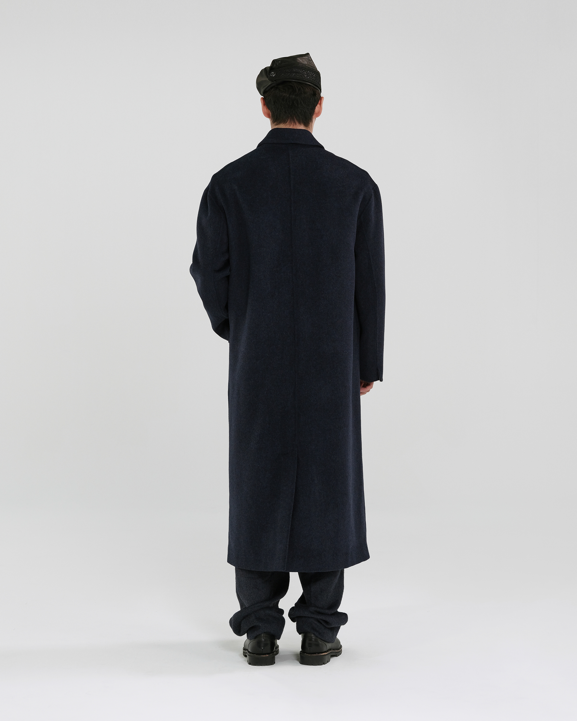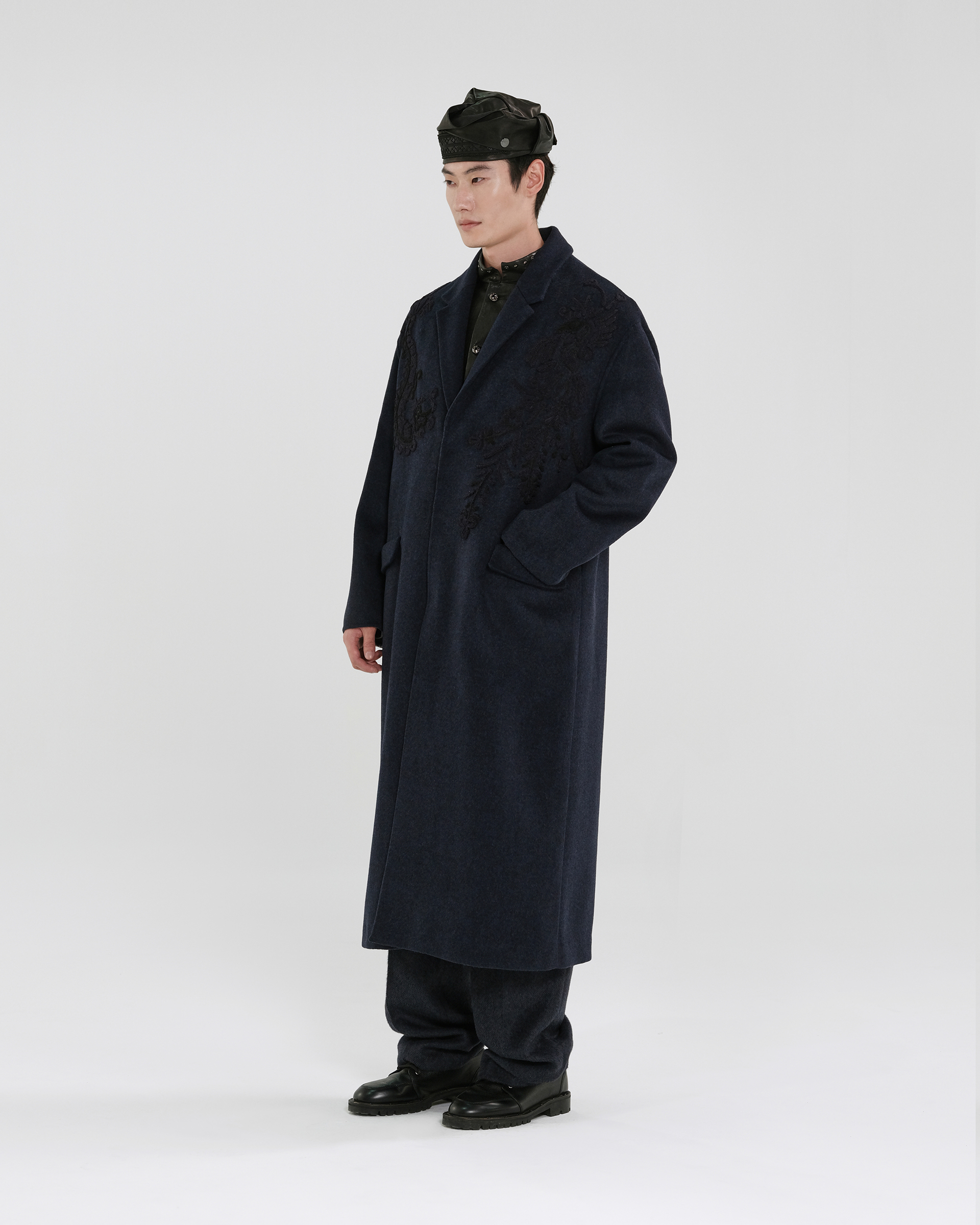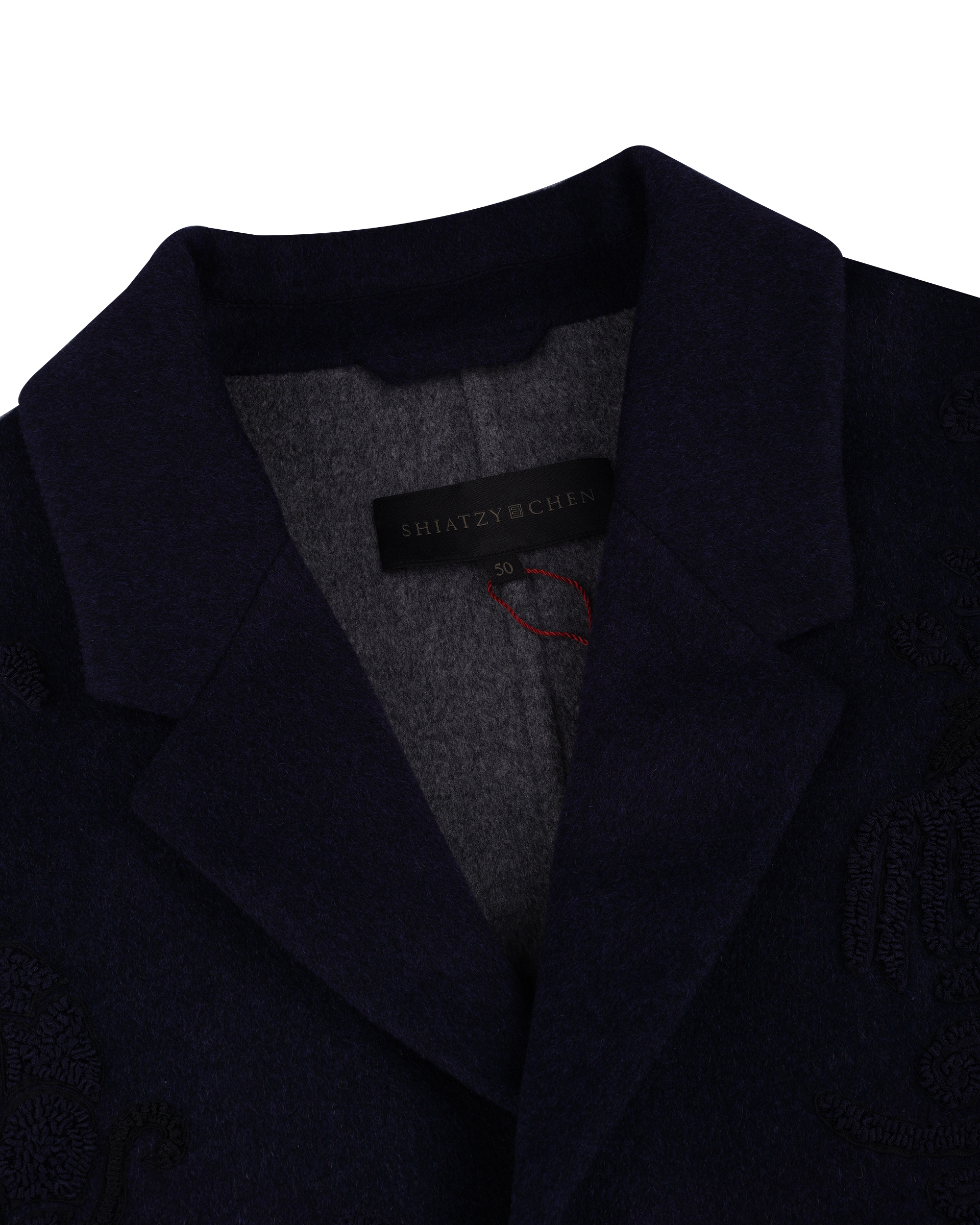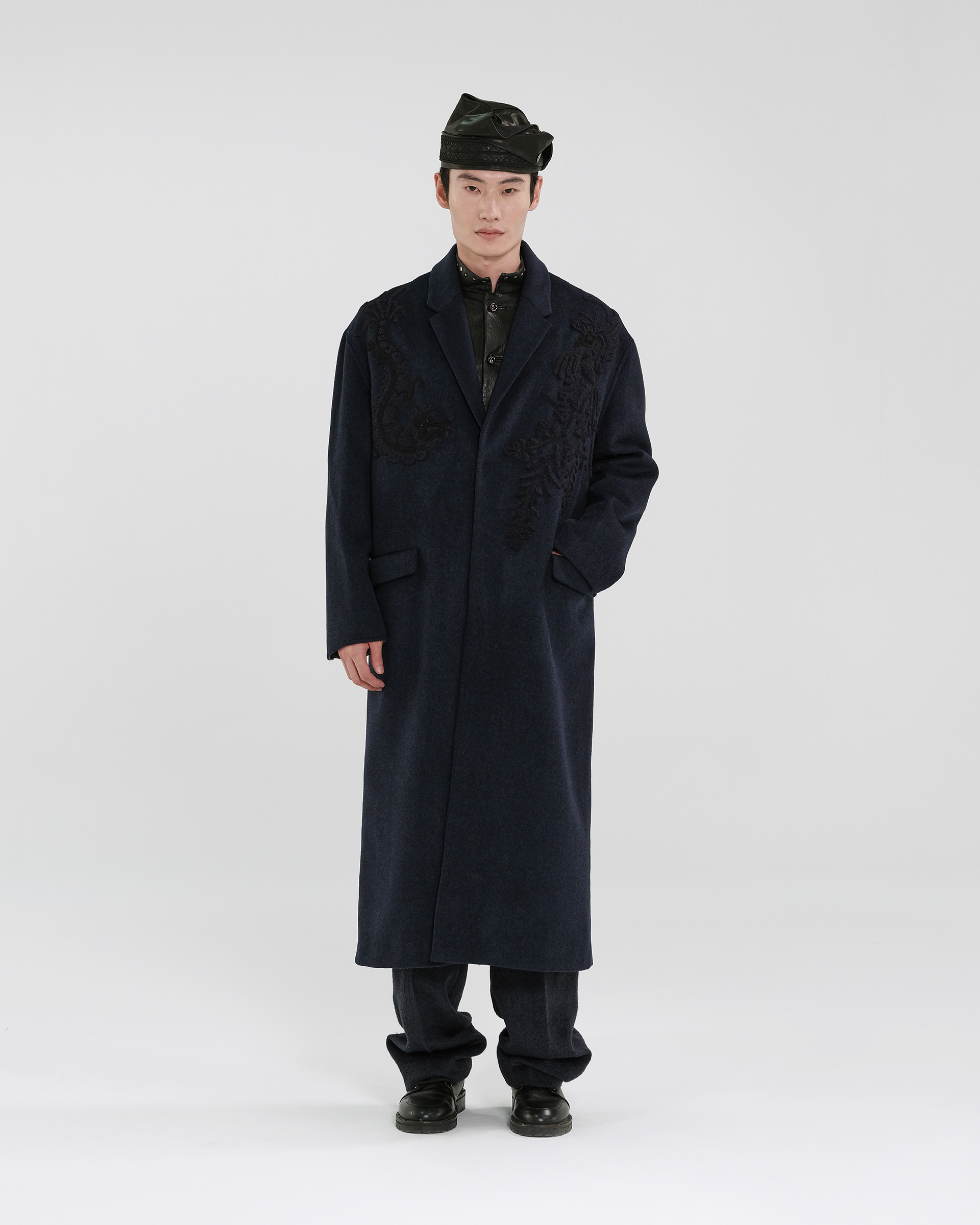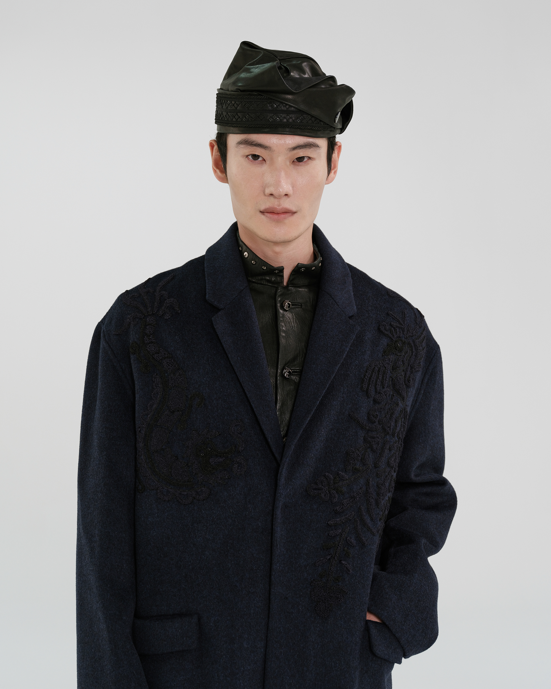 This piece achieves rich textures through varying fabric blends; the tailored collar features embroidered Miao mythological motifs, exuding a quiet, dignified elegance.