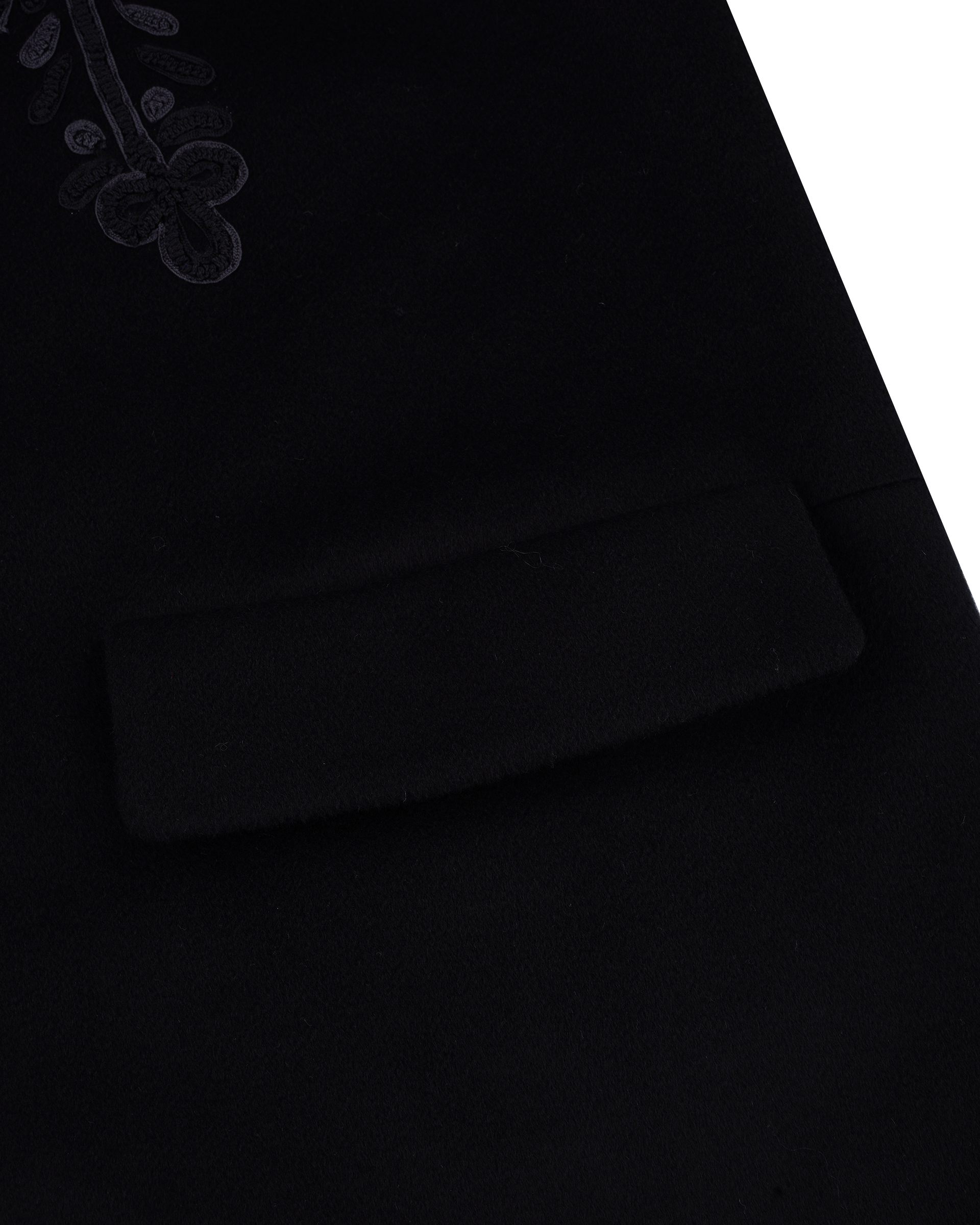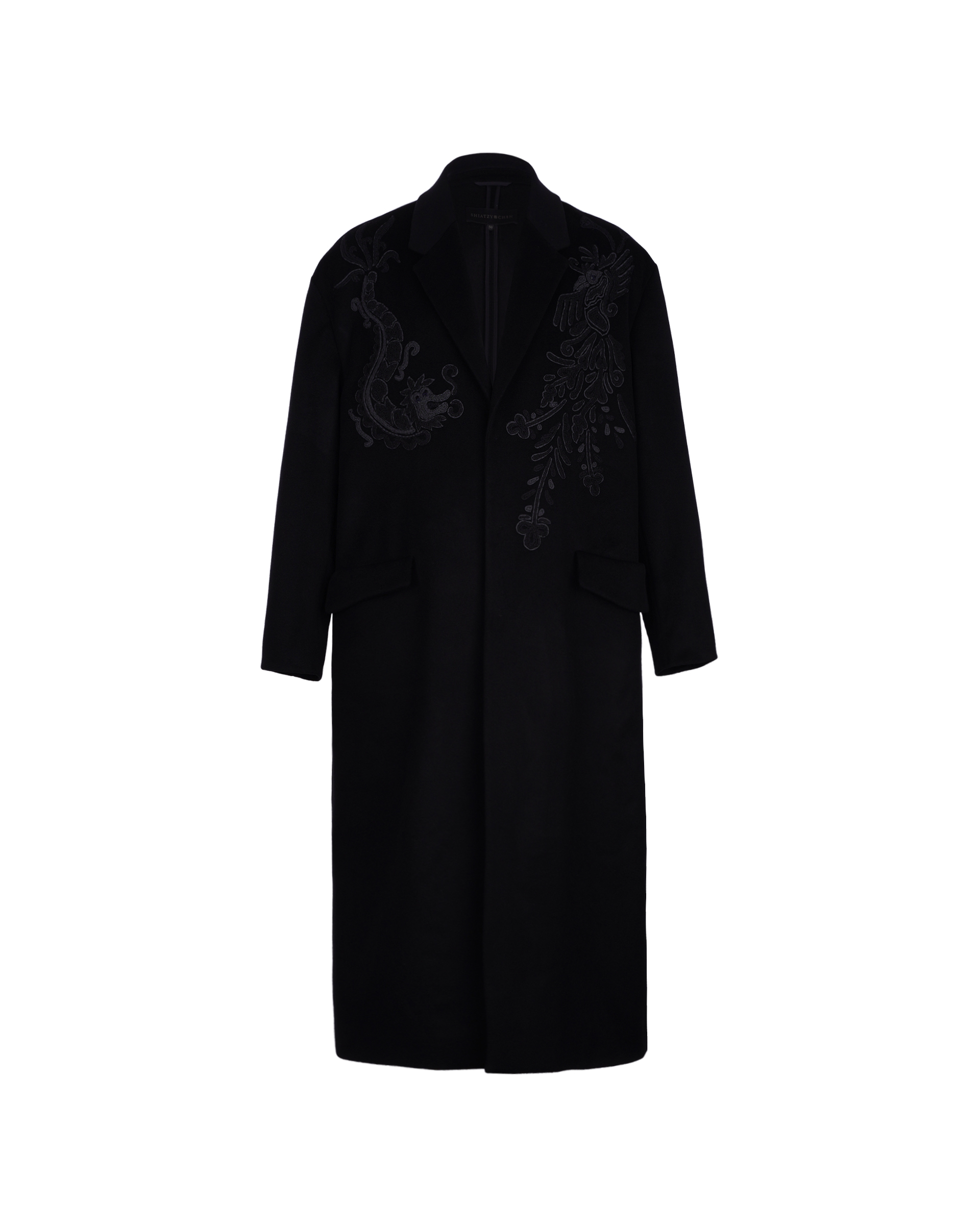 This piece achieves rich textures through varying fabric blends; the tailored collar features embroidered Miao mythological motifs, exuding a quiet, dignified elegance.