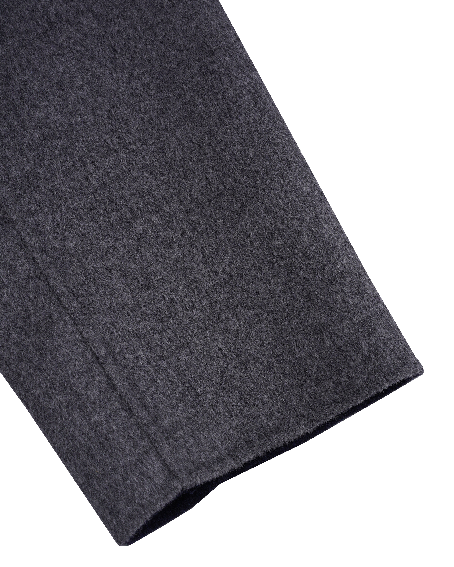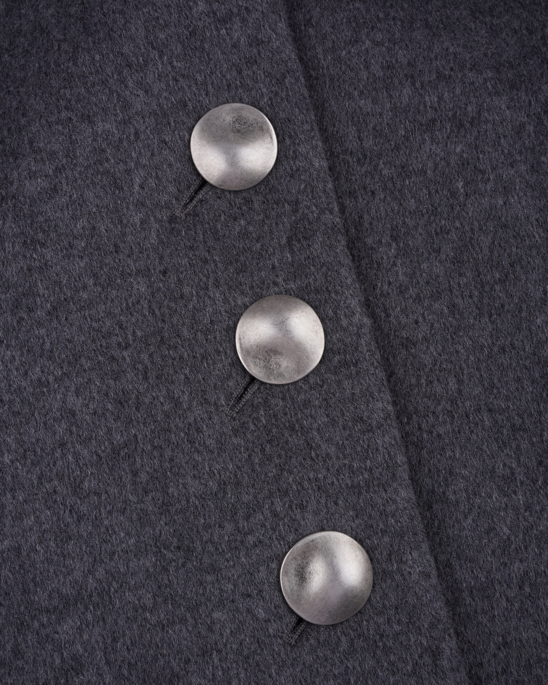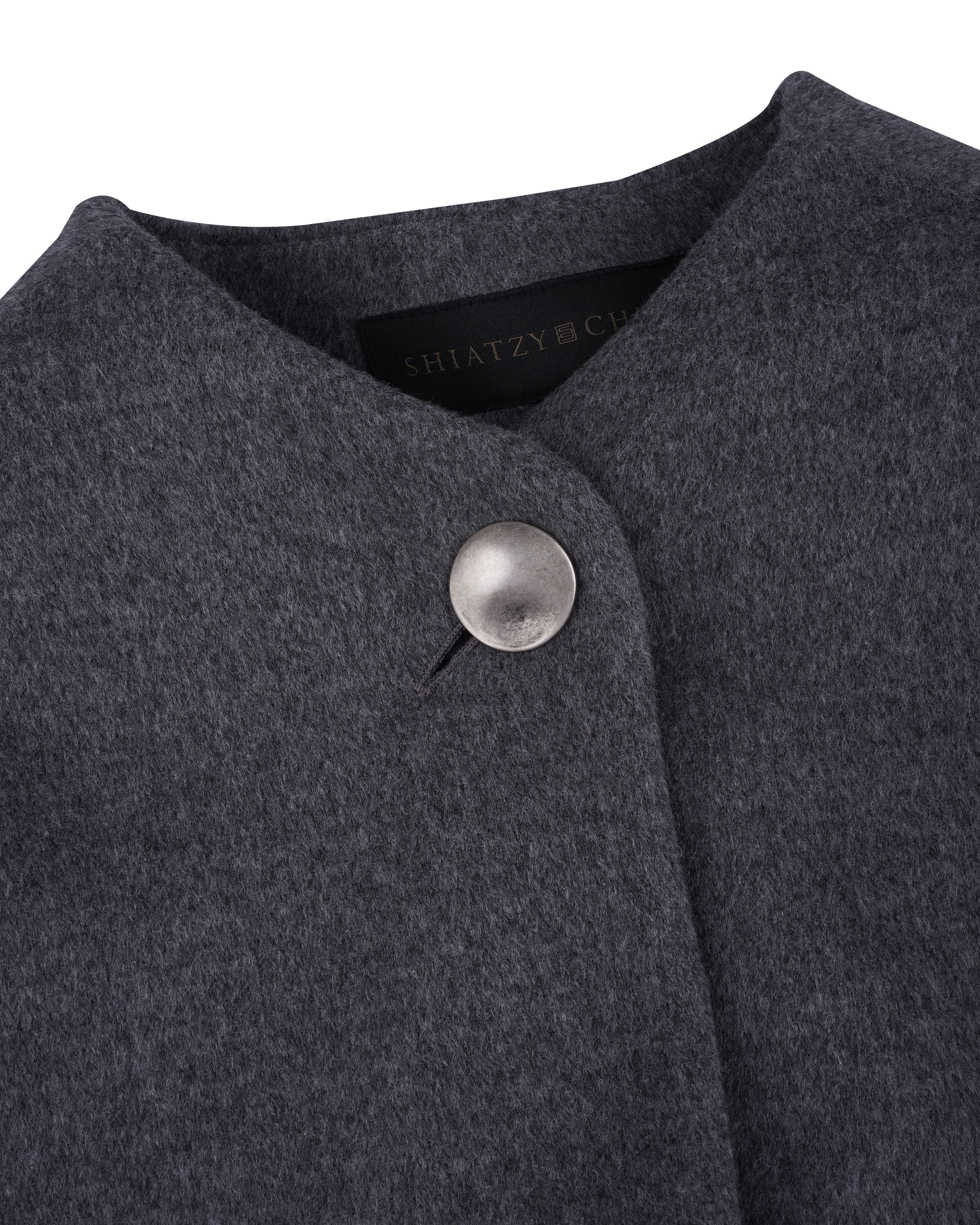 This piece is crafted from a wool blend fabric, featuring a solid-color clean silhouette accented with silver-tone round buttons. Its wide-cut design paired with a belt offers versatile styling options.