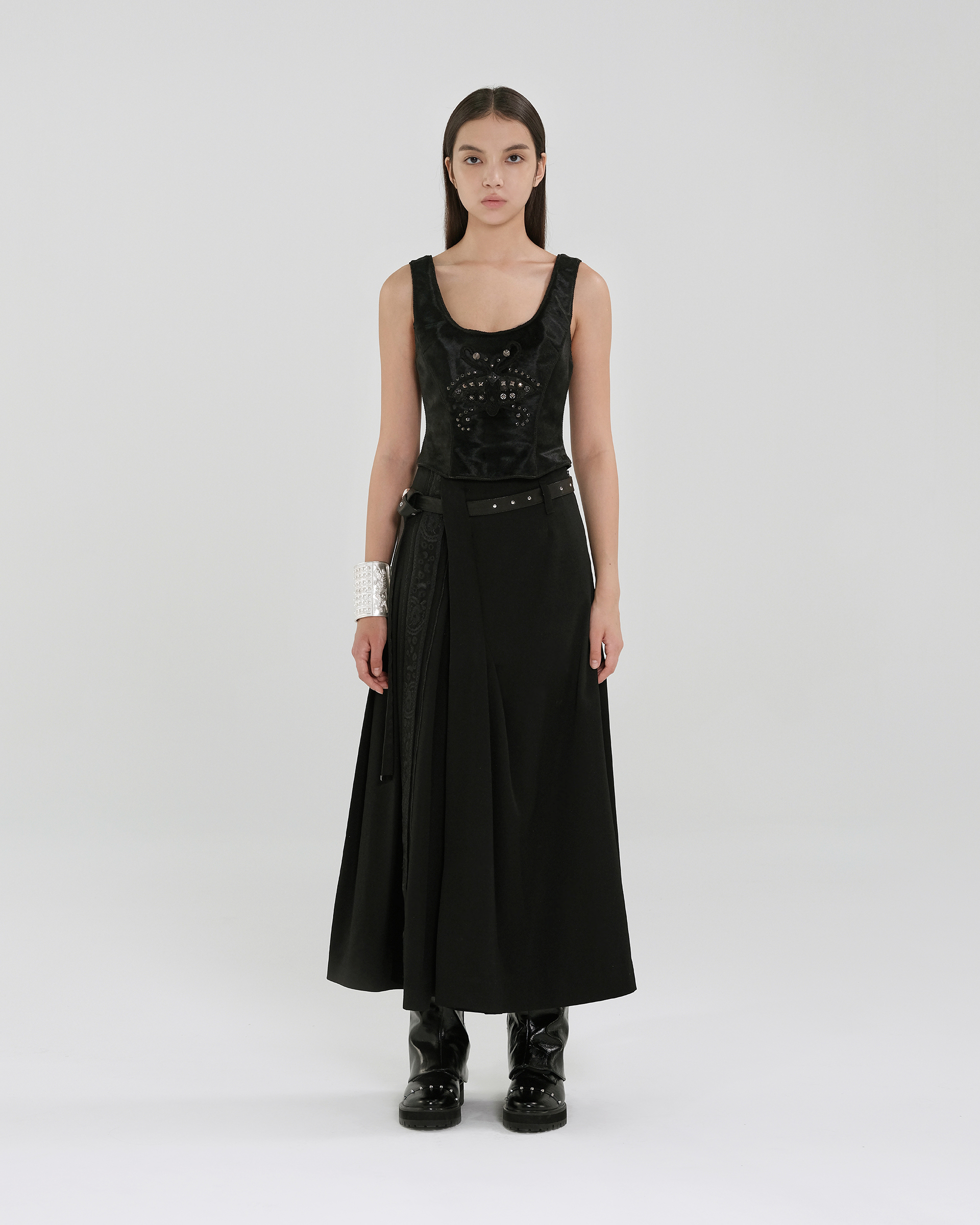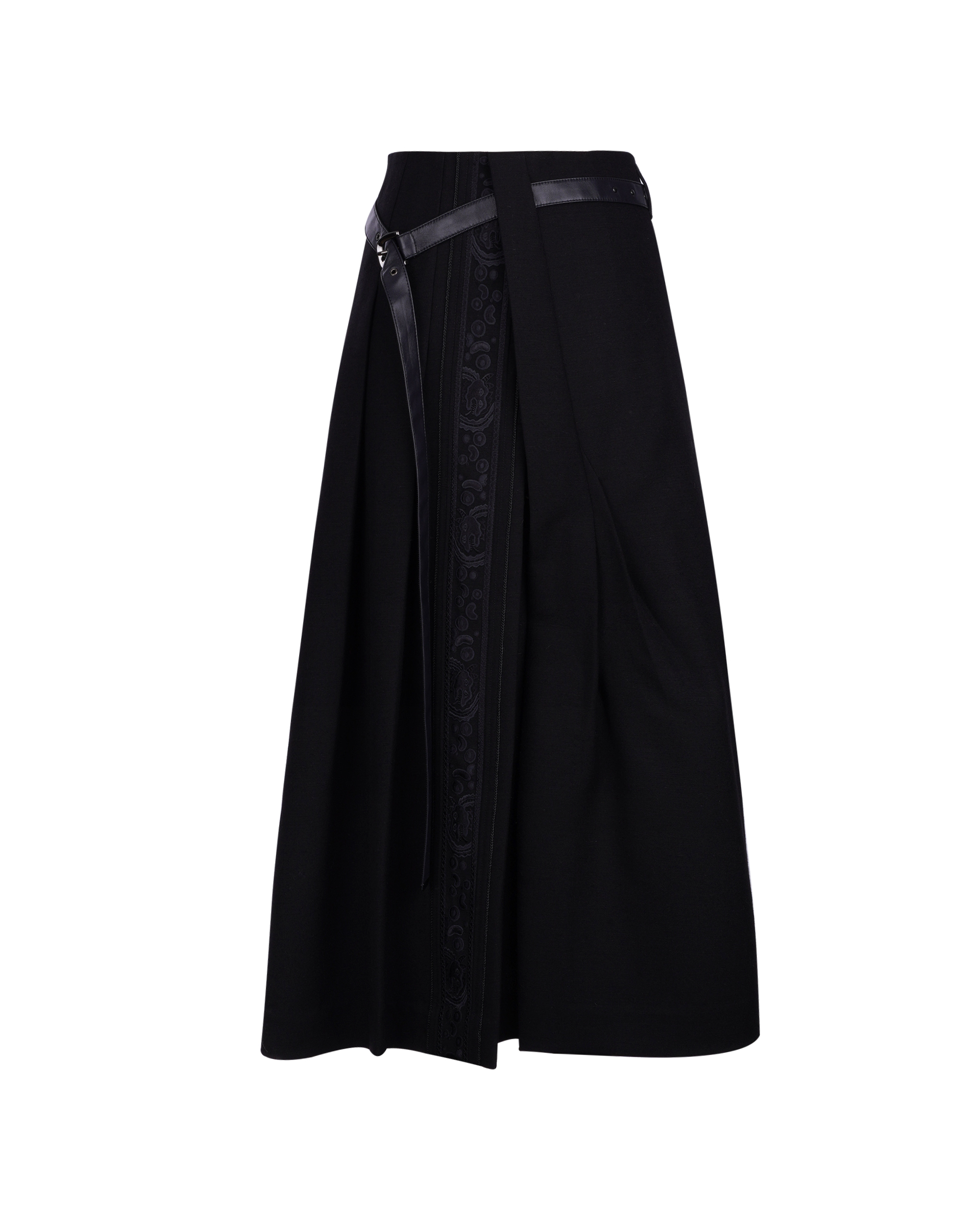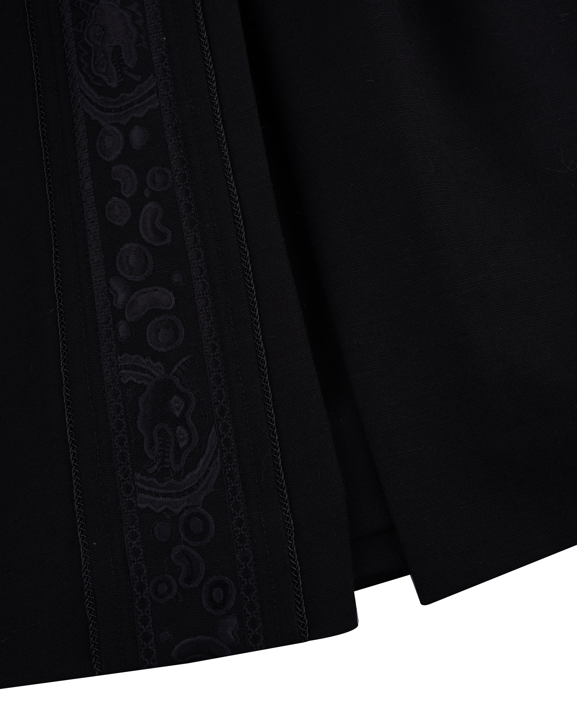 This piece is crafted from a wool blend fabric, featuring an A-line pleated design. The hem is adorned with embroidered Miao mythological totems that sway with every step, creating a flowing, ethereal effect.