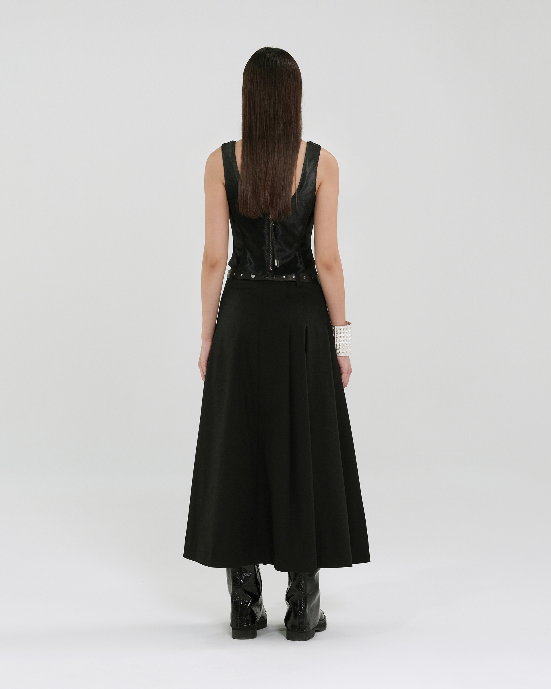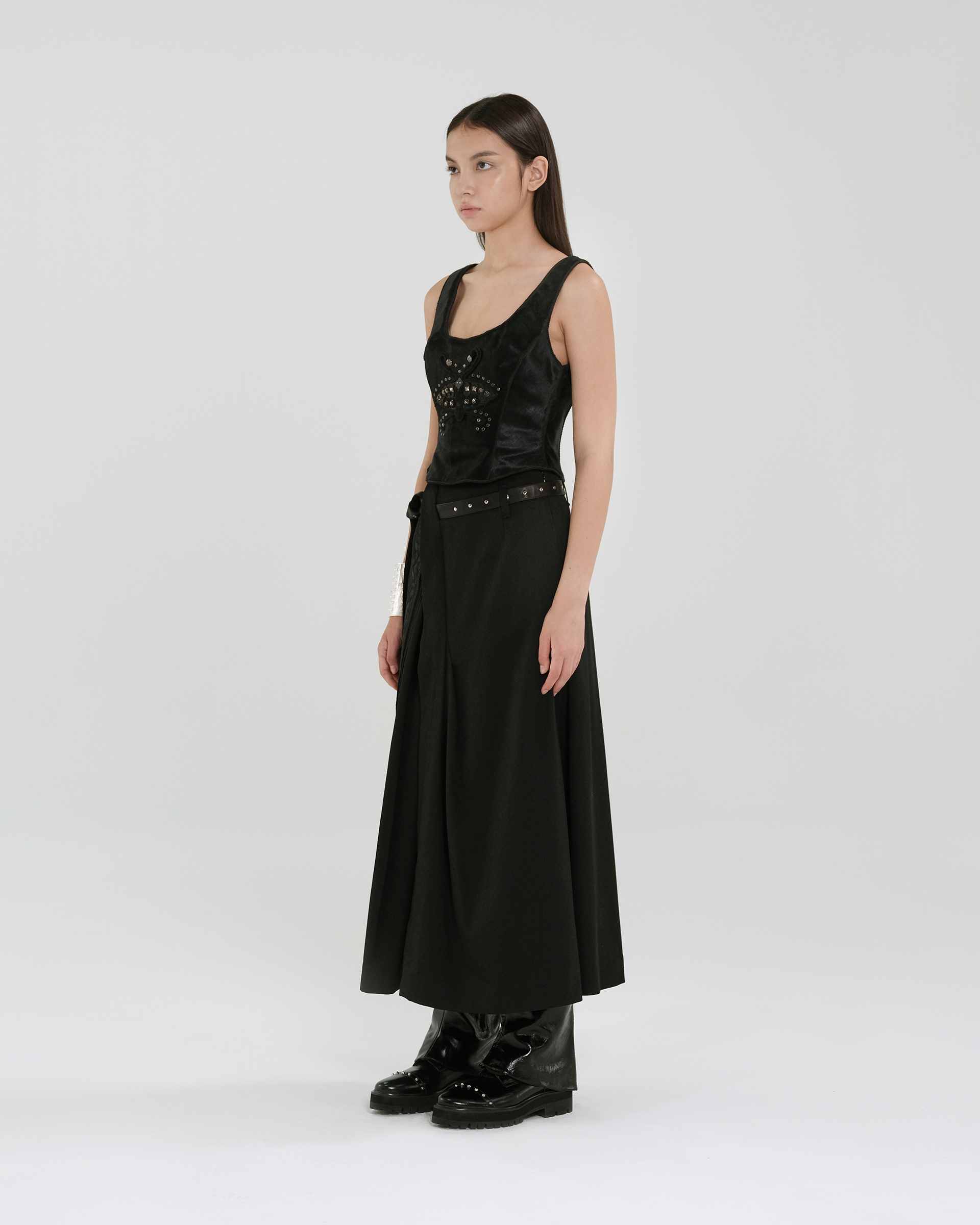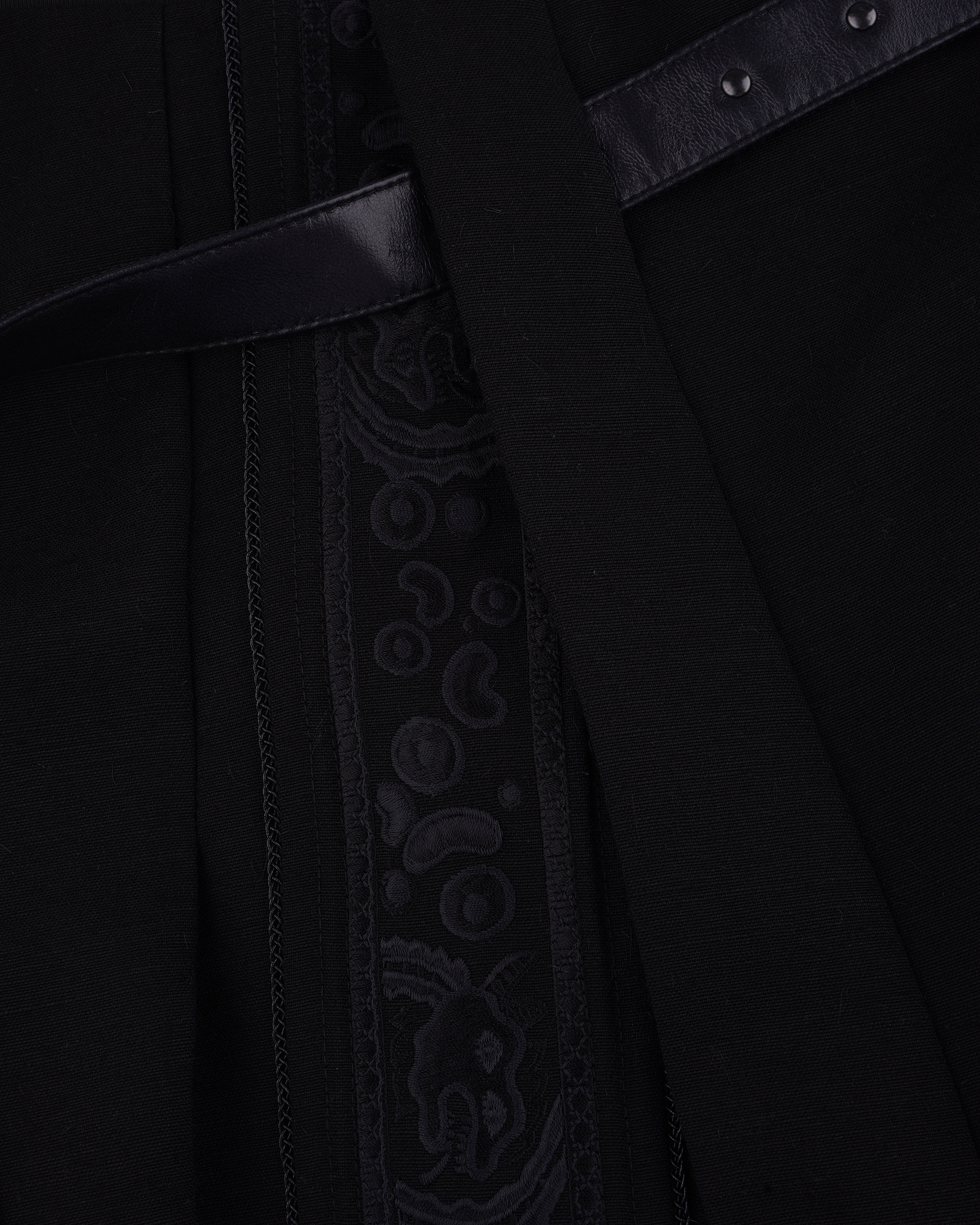 This piece is crafted from a wool blend fabric, featuring an A-line pleated design. The hem is adorned with embroidered Miao mythological totems that sway with every step, creating a flowing, ethereal effect.