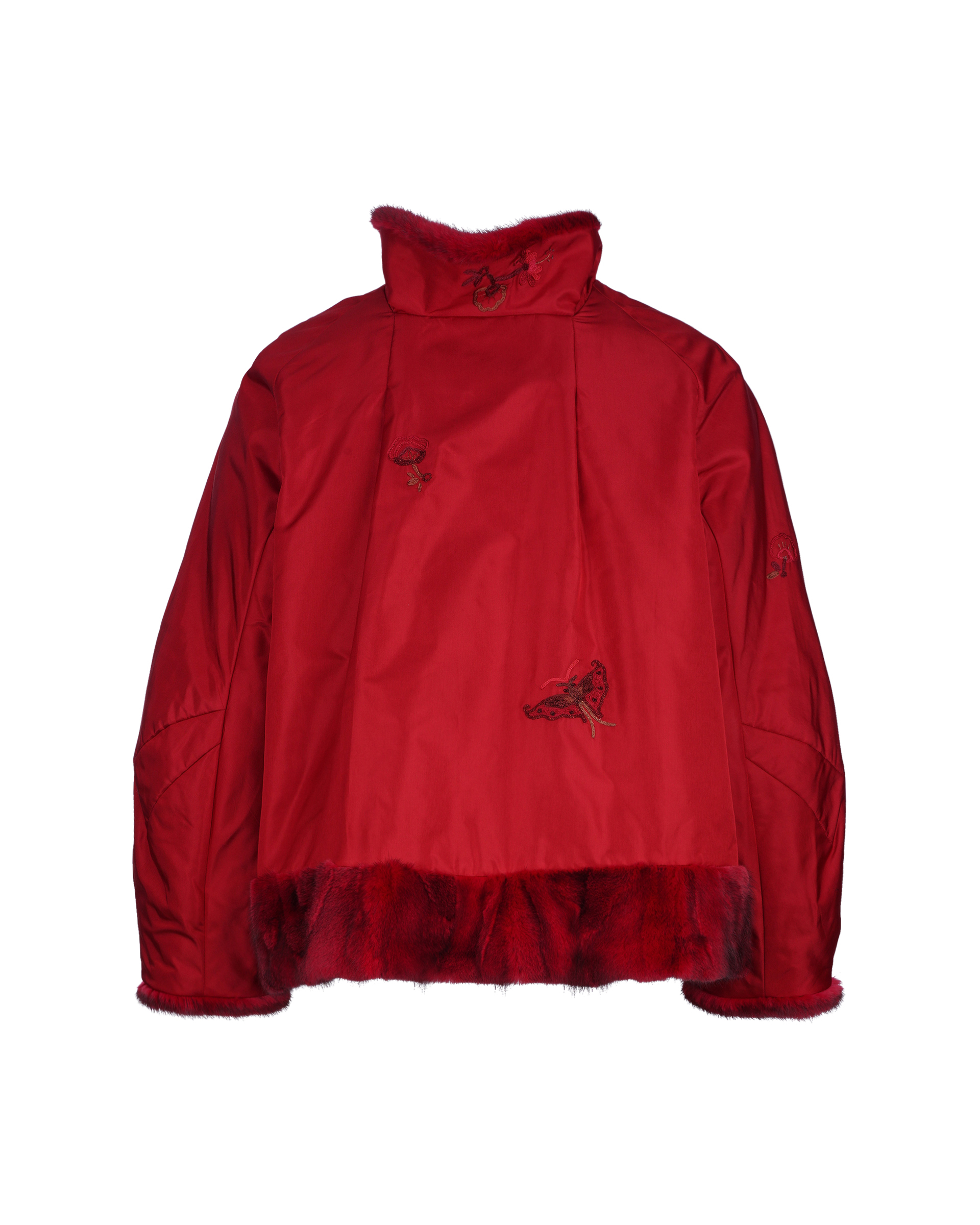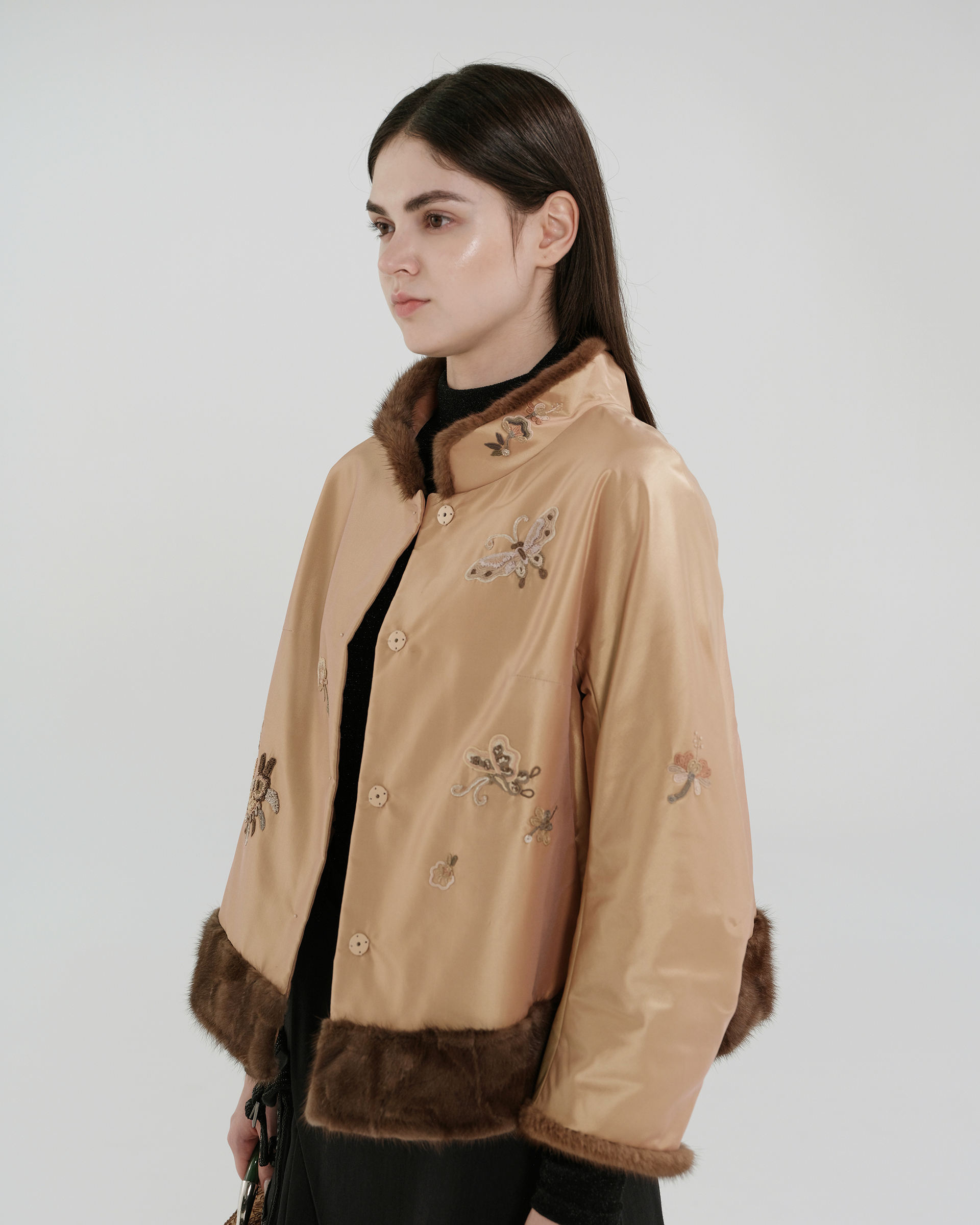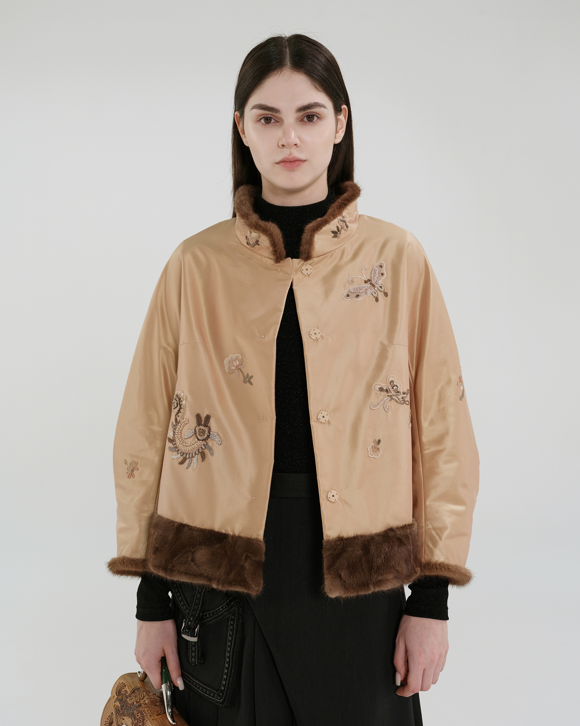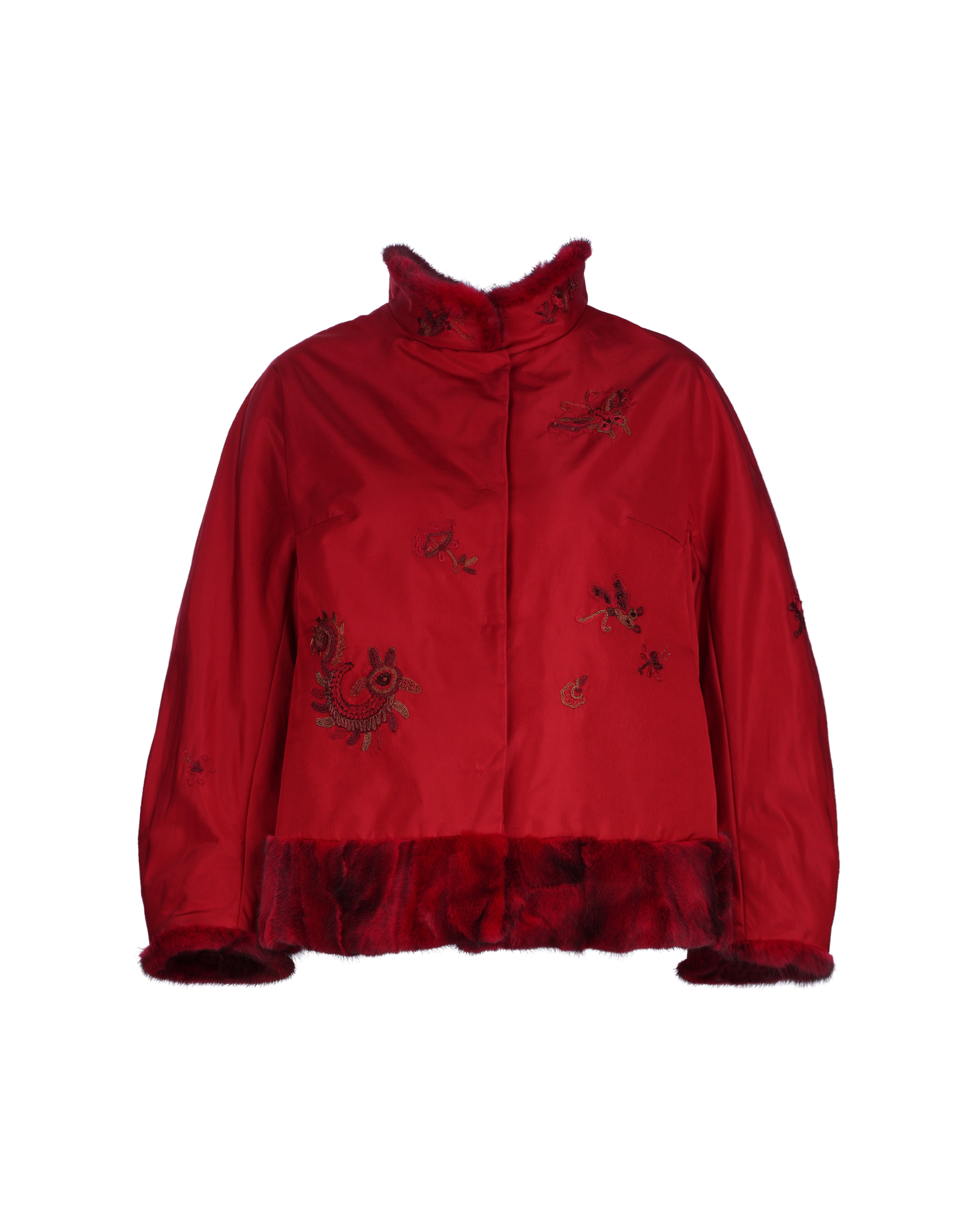 This design features embroidered Miao mythological totems, with fur trim at the collar, cuffs, and hem. Paired with a cropped, structured silhouette, it radiates an air of regal elegance.