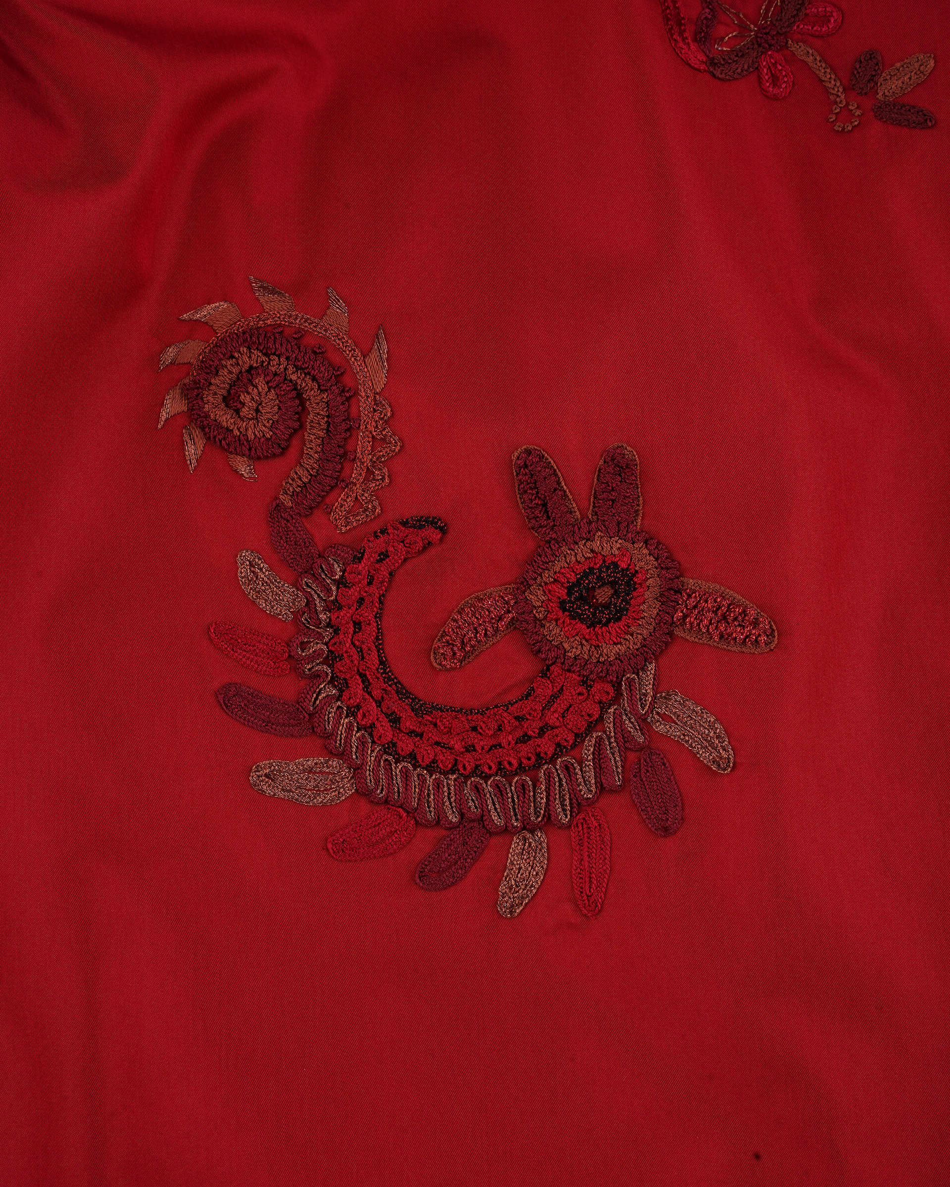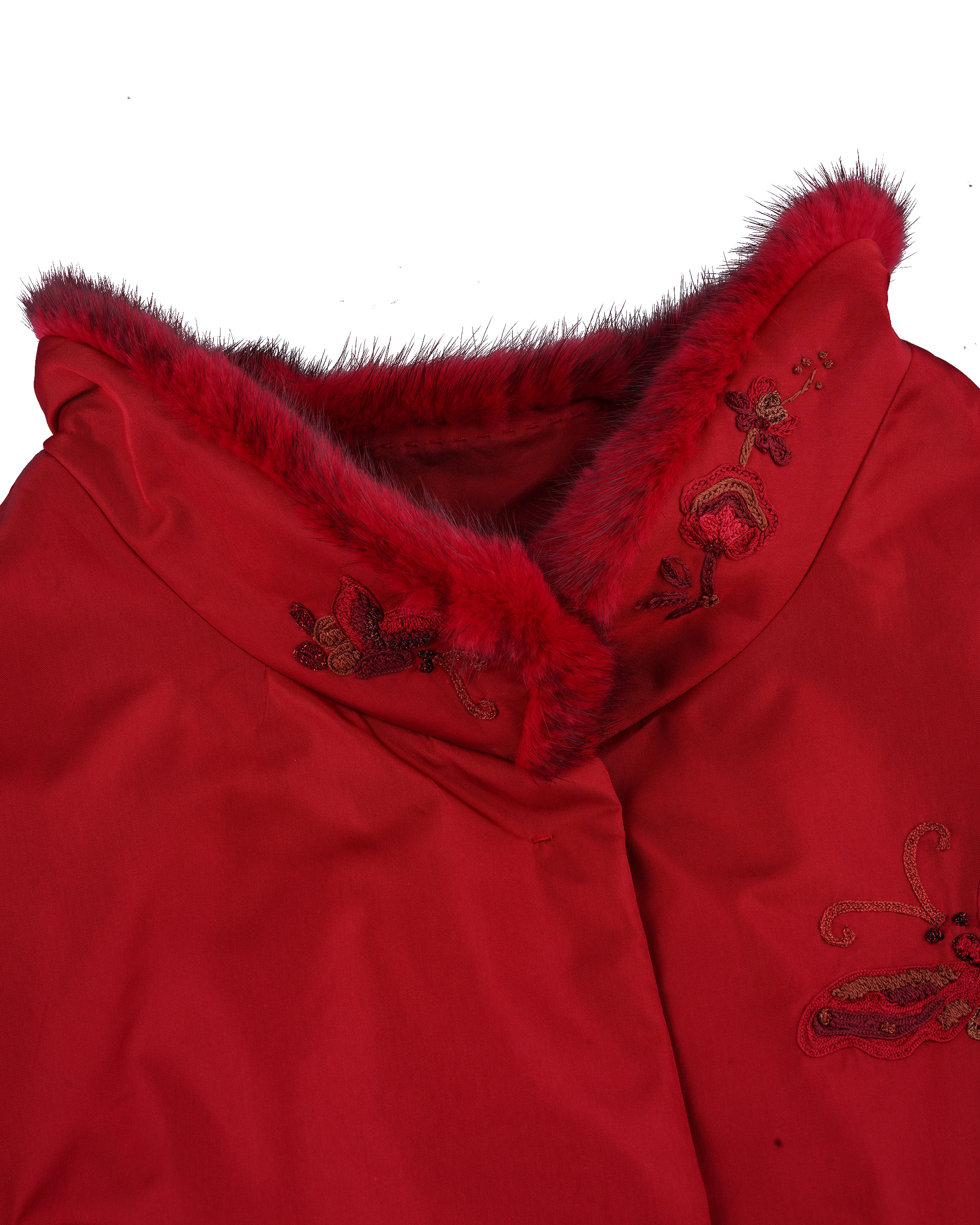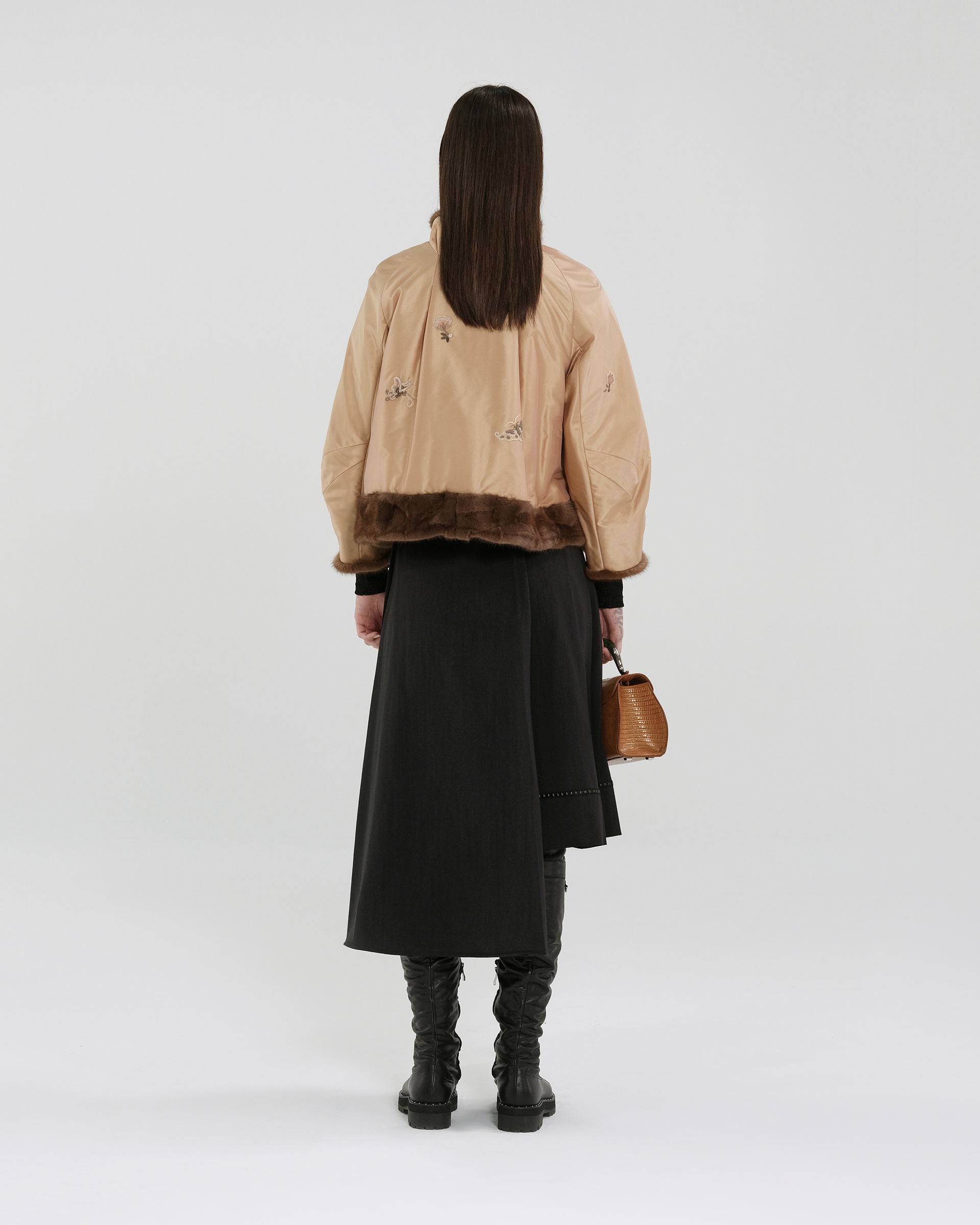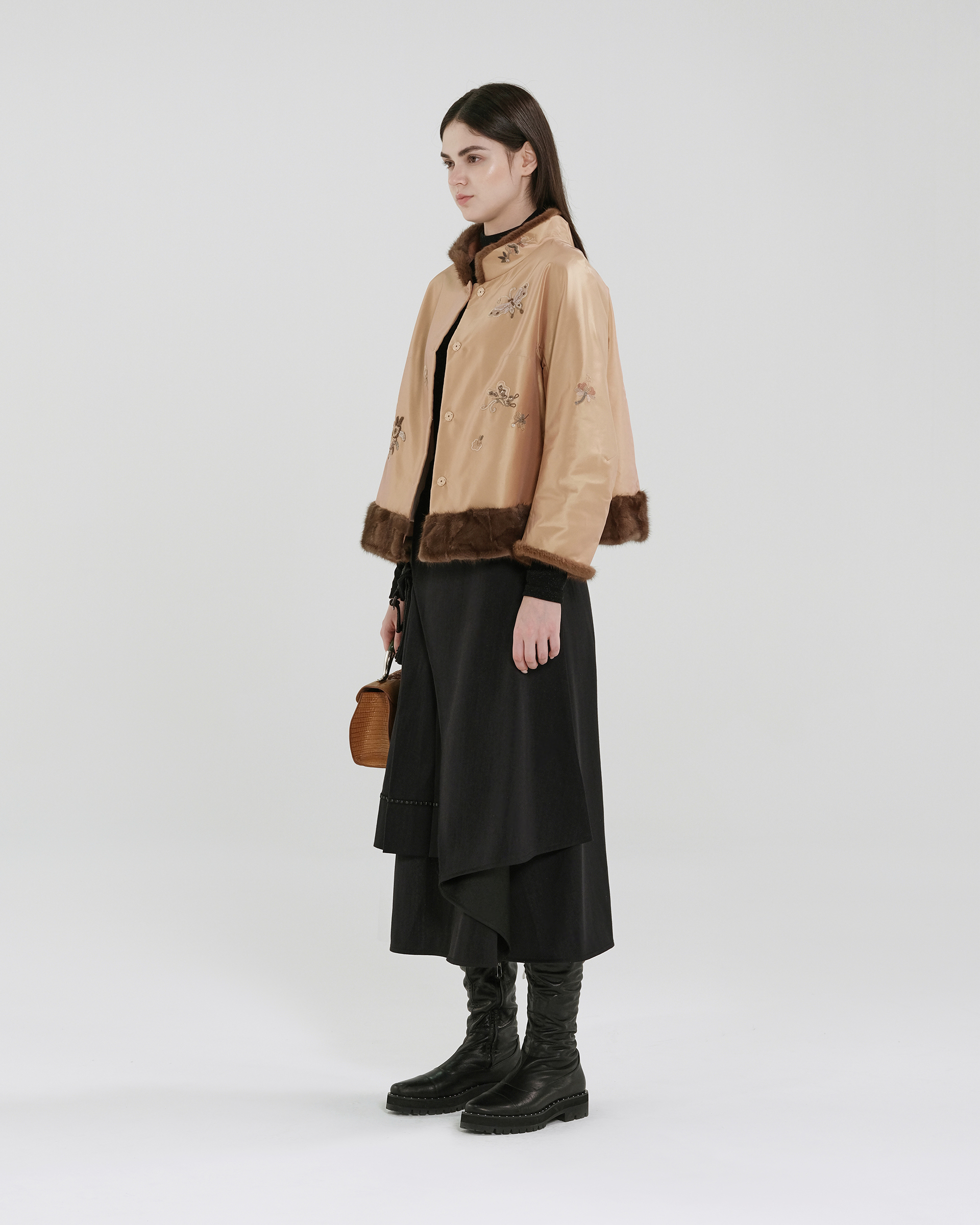 This design features embroidered Miao mythological totems, with fur trim at the collar, cuffs, and hem. Paired with a cropped, structured silhouette, it radiates an air of regal elegance.