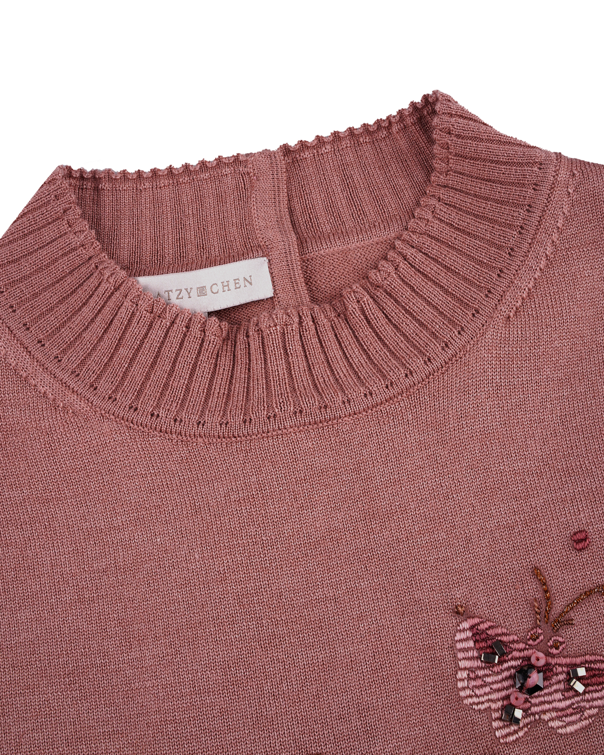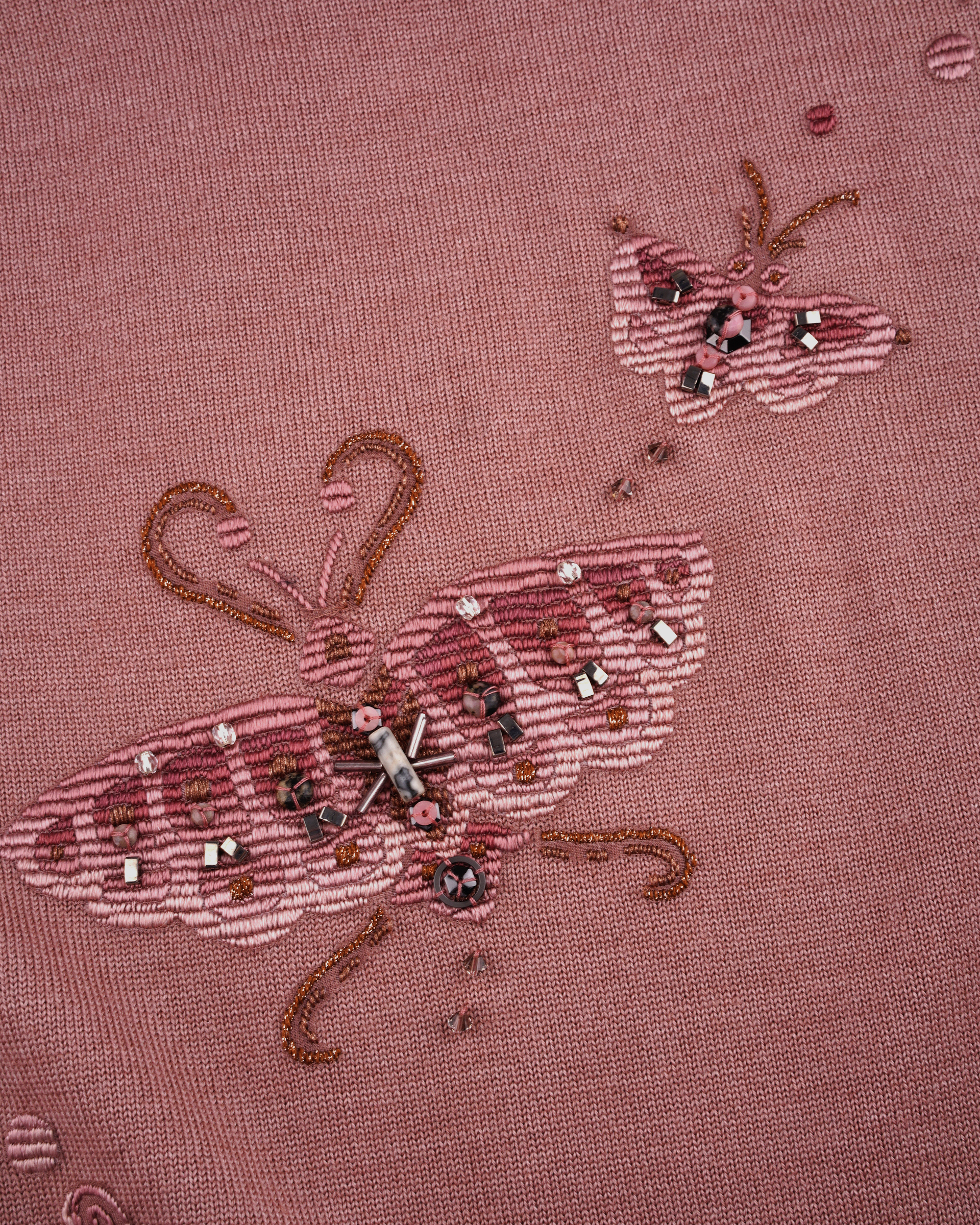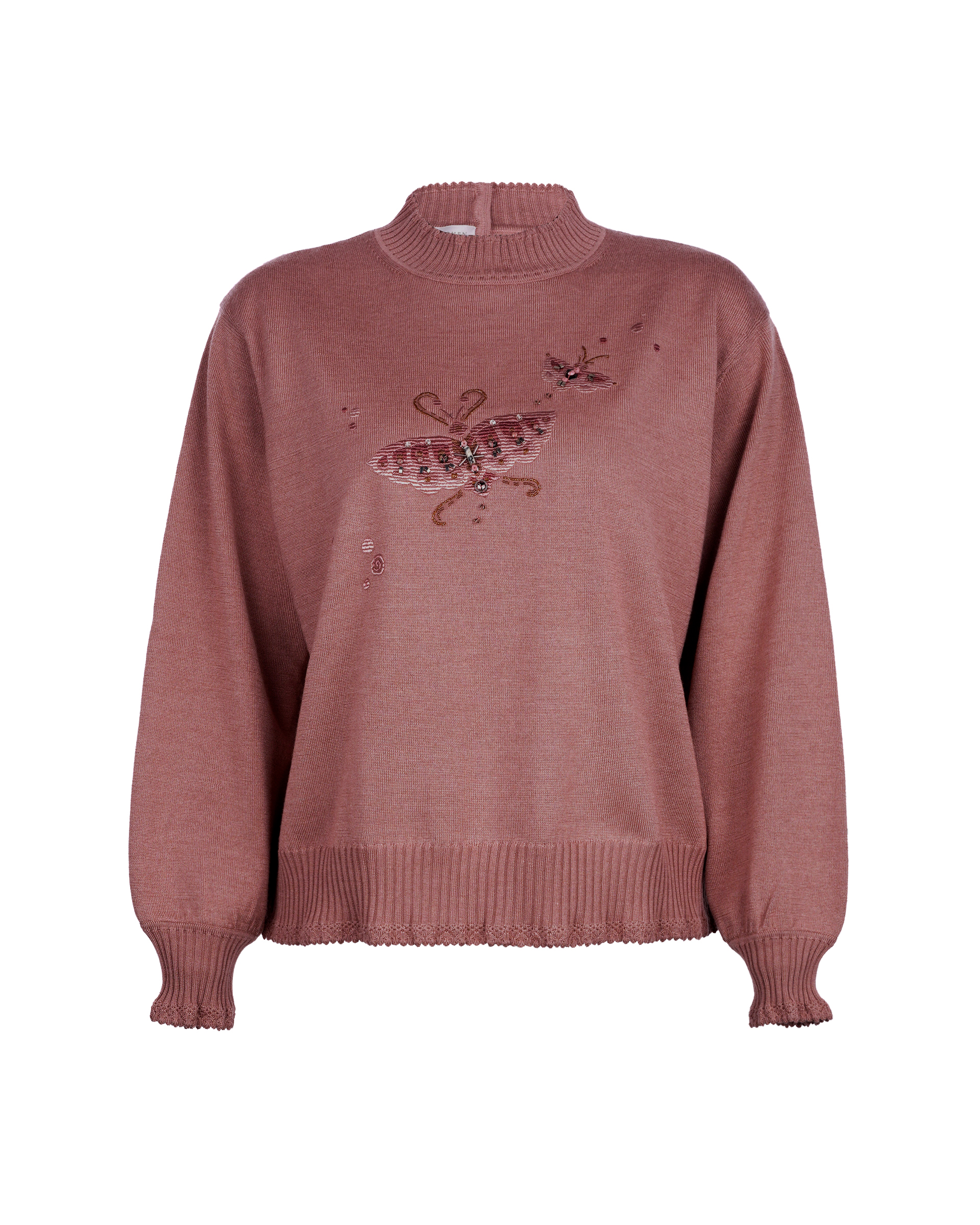 This piece is crafted from a silk-wool blend fabric, featuring delicate embroidery that outlines this season's butterfly motif. A casual knitwear piece for daily look.