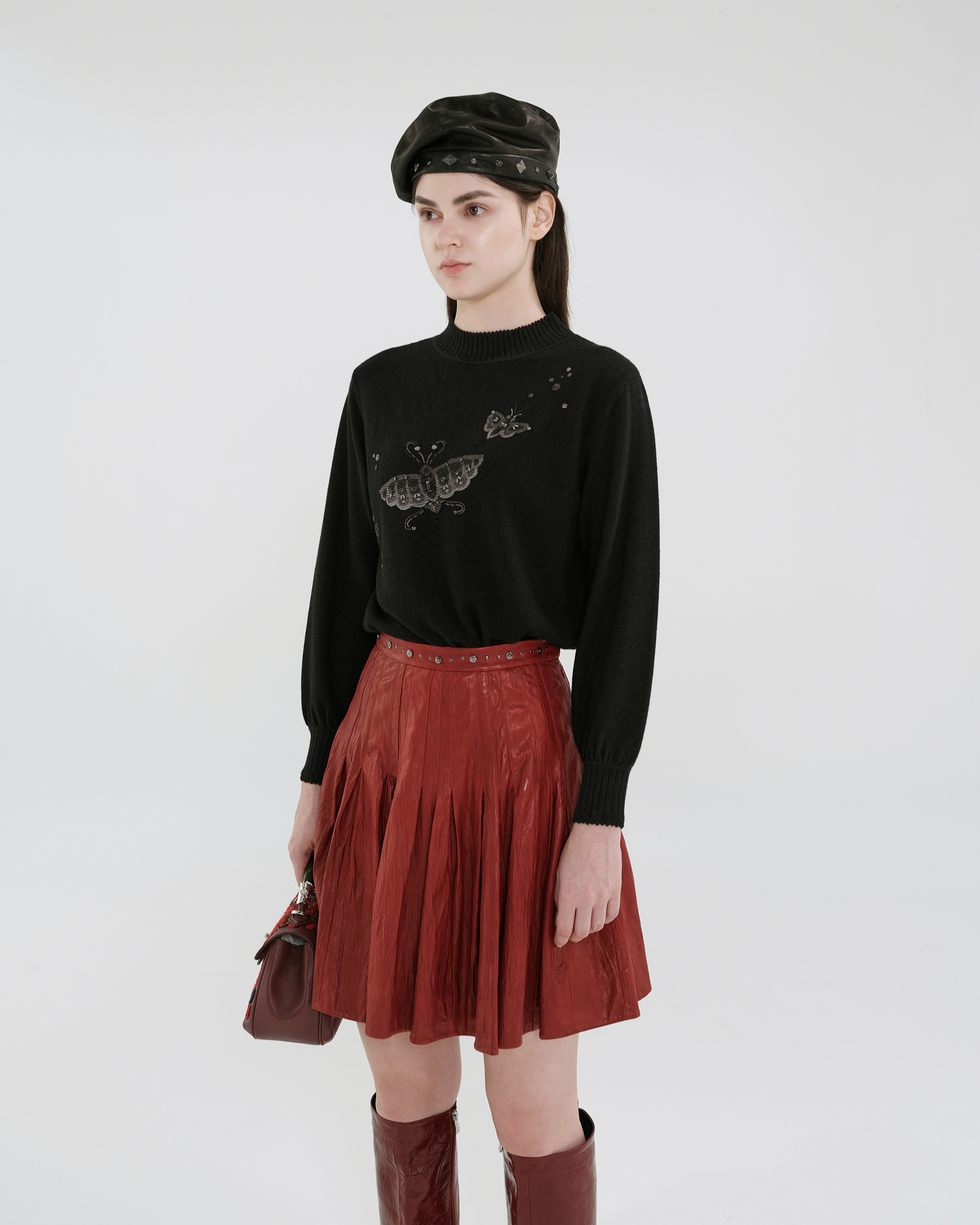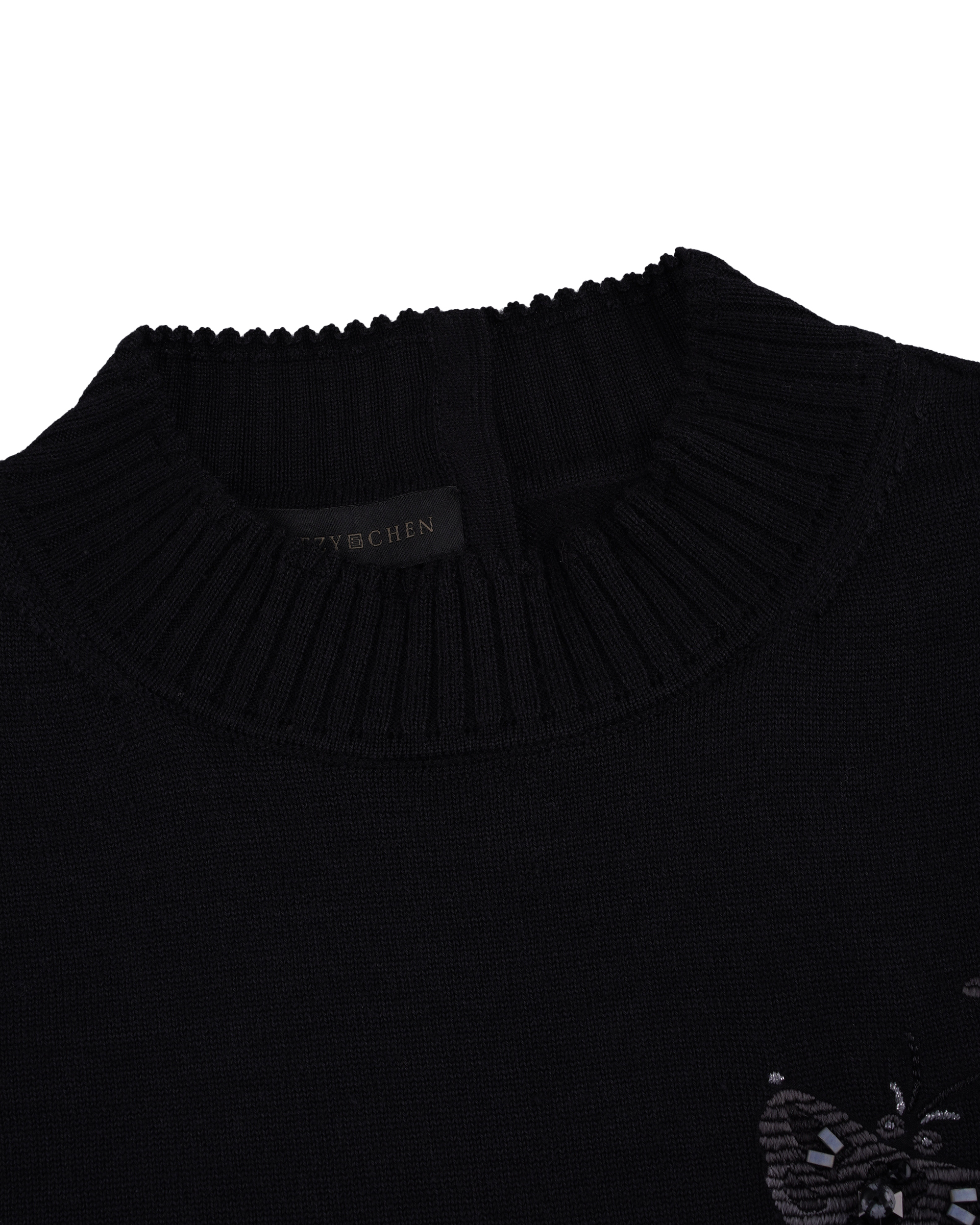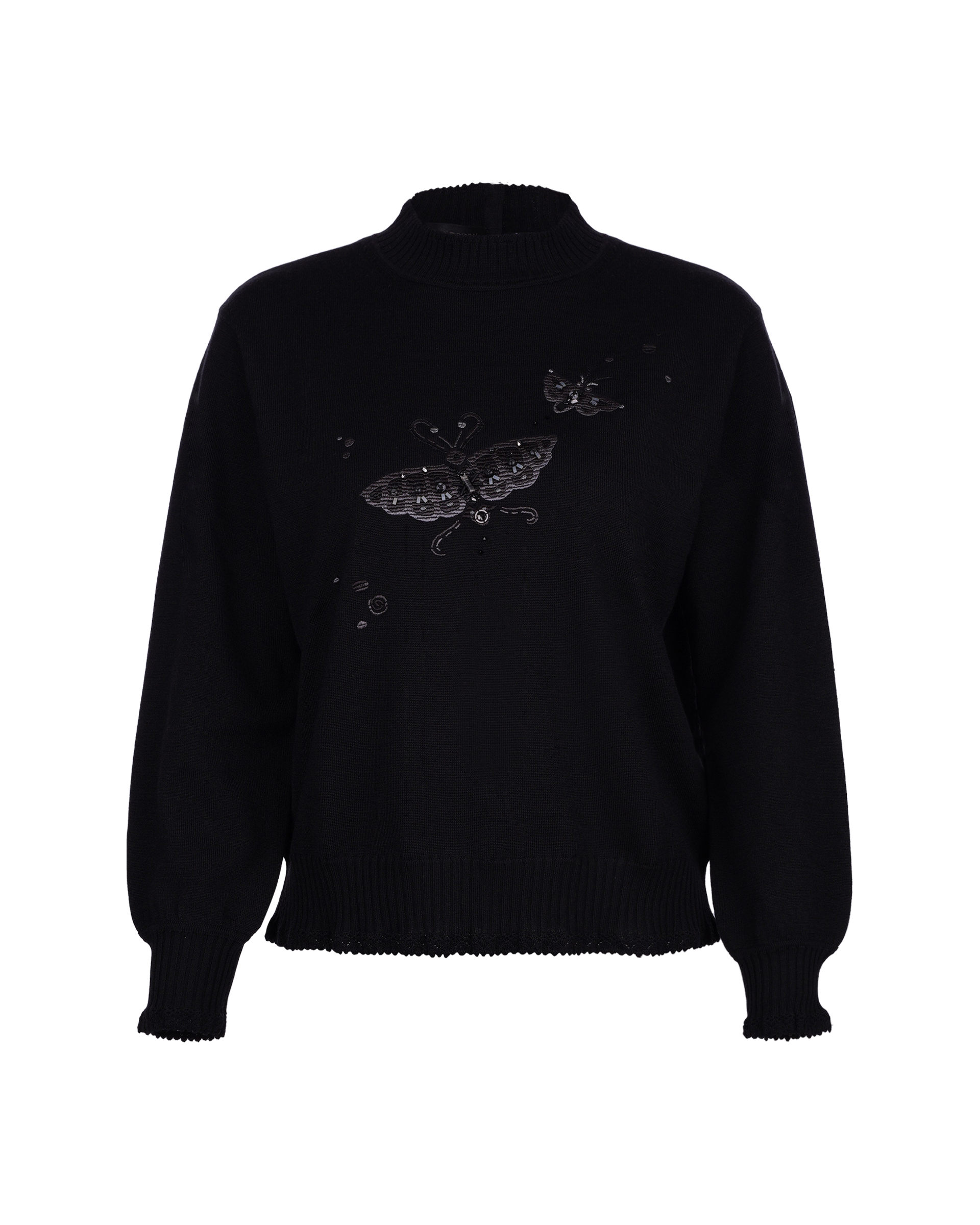 This piece is crafted from a silk-wool blend fabric, featuring delicate embroidery that outlines this season's butterfly motif. A casual knitwear piece for daily look.