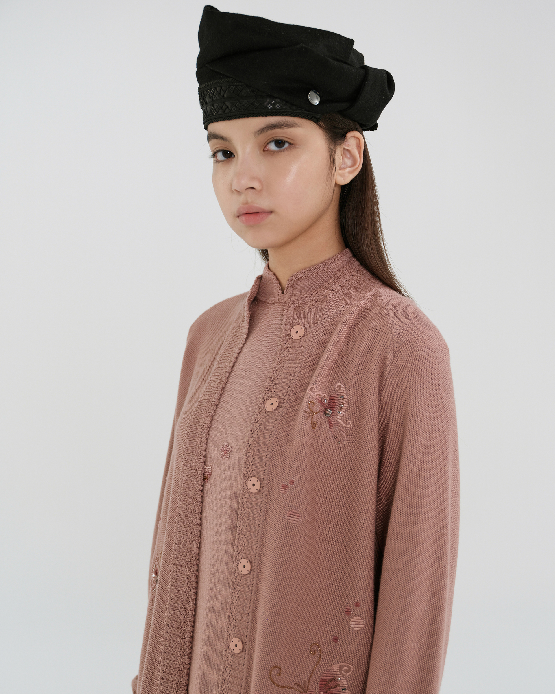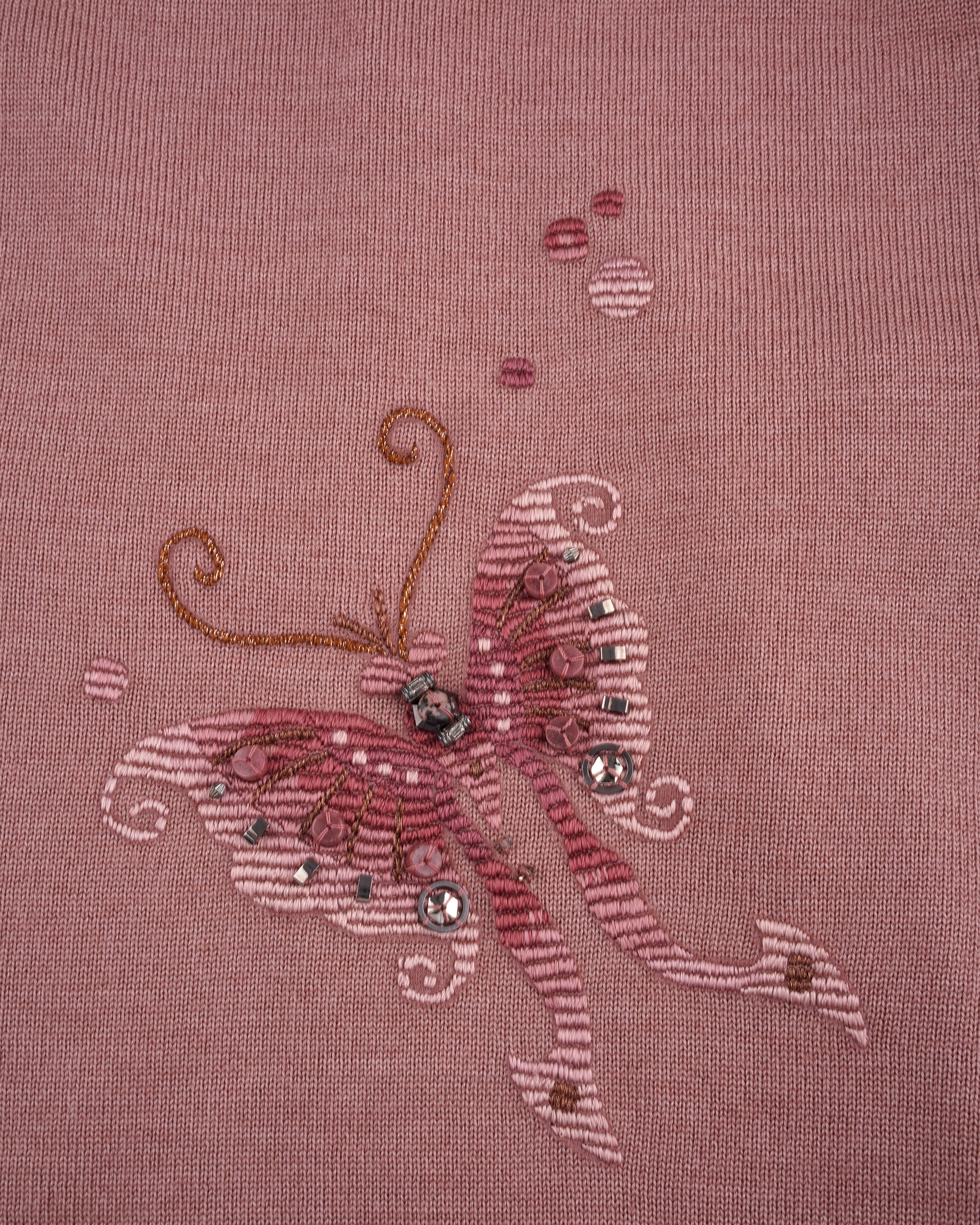 This piece is crafted from a silk-wool blend fabric, featuring delicate embroidery that outlines this season's butterfly motif; it is a simple yet classic knitwear item.