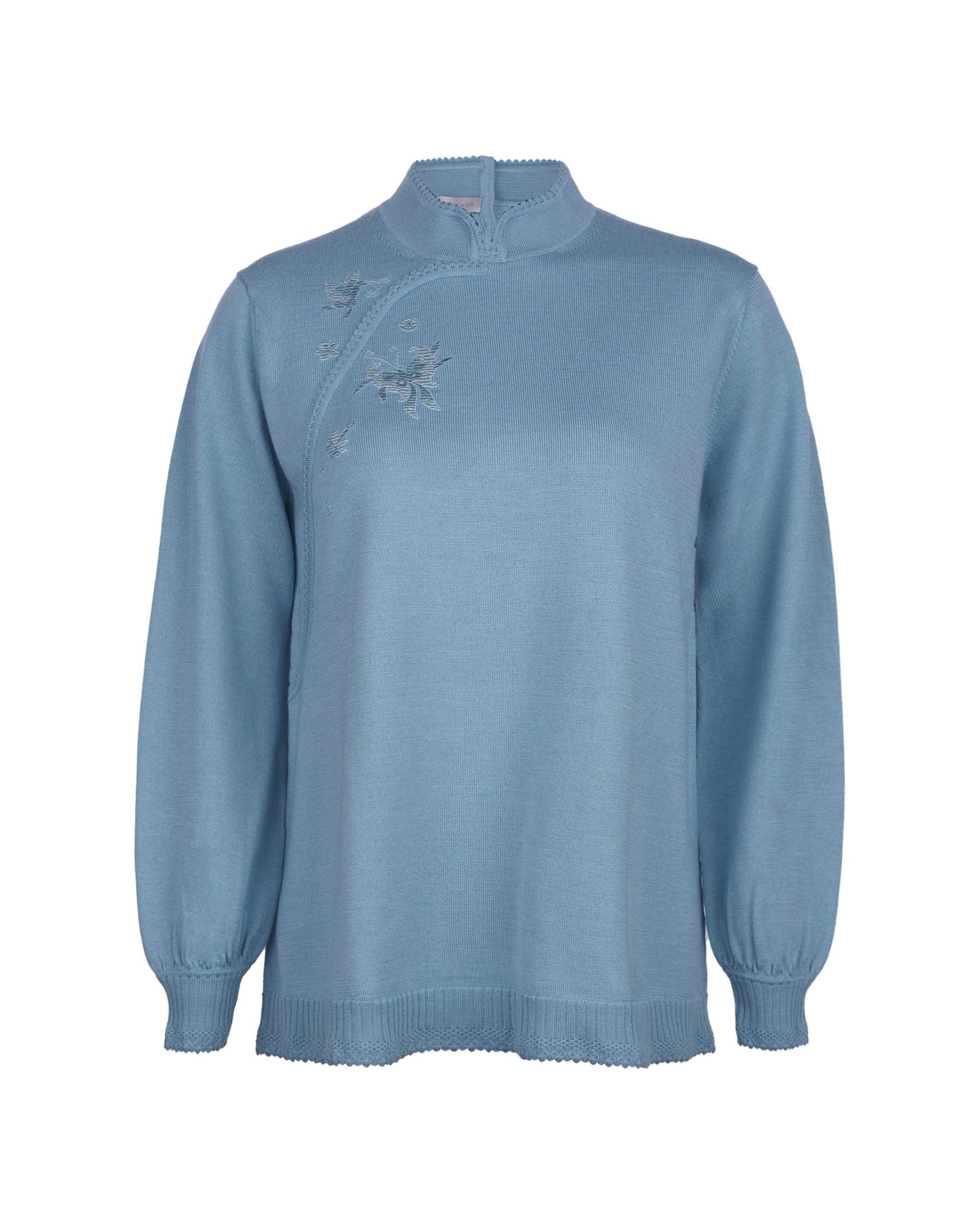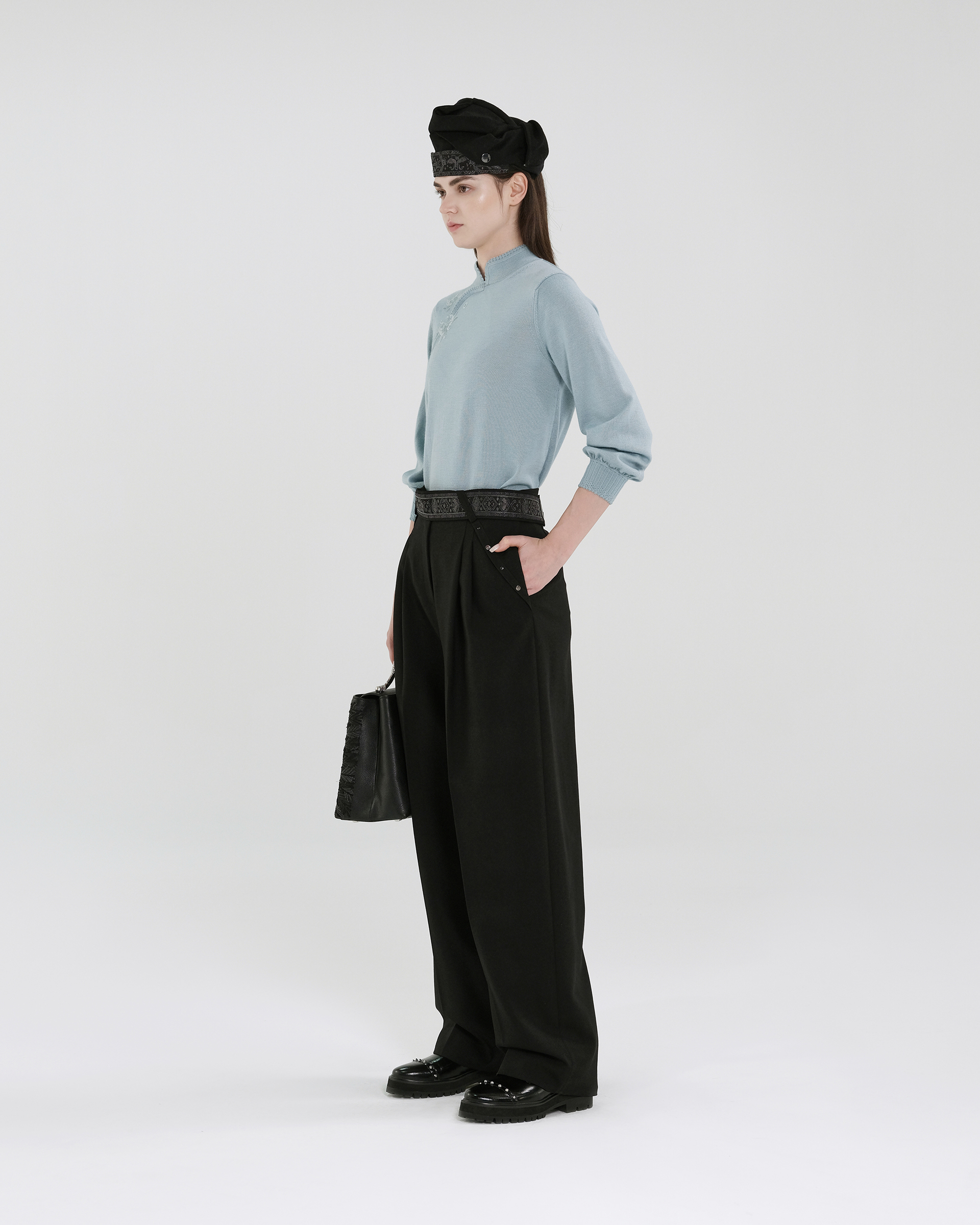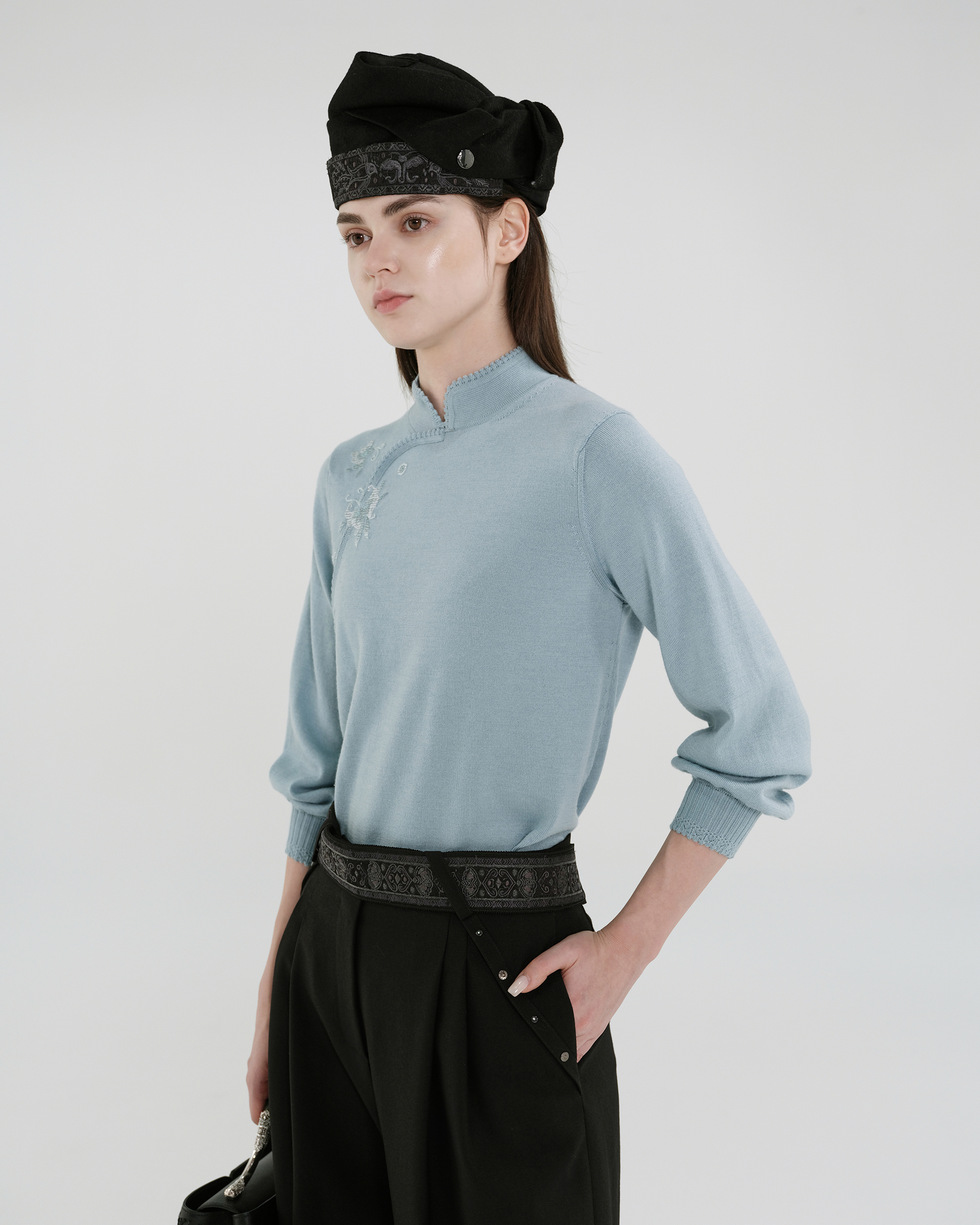 This piece is crafted from a silk-wool blend fabric, where delicate embroidery and subtle tones combine to create an elegant aesthetic.