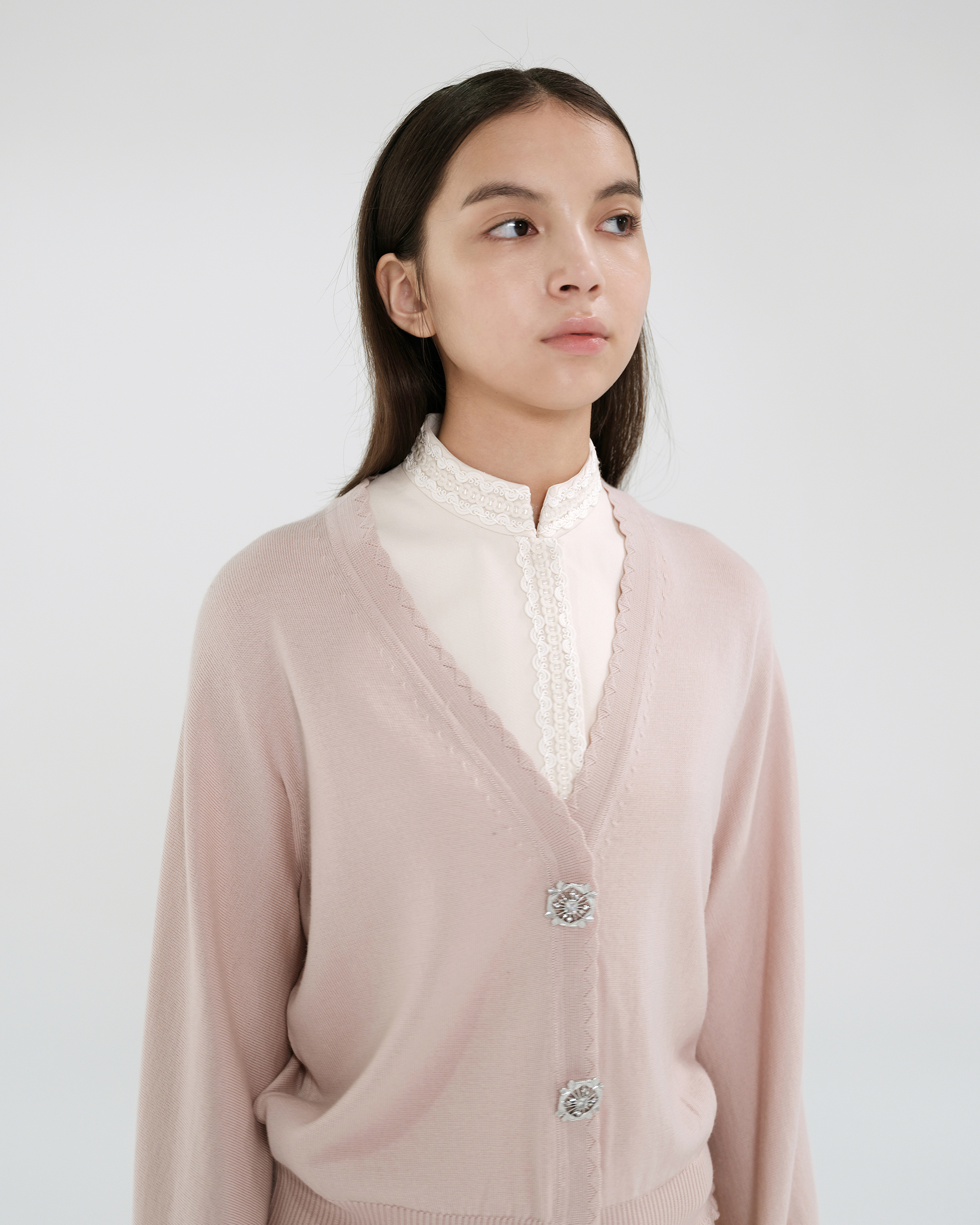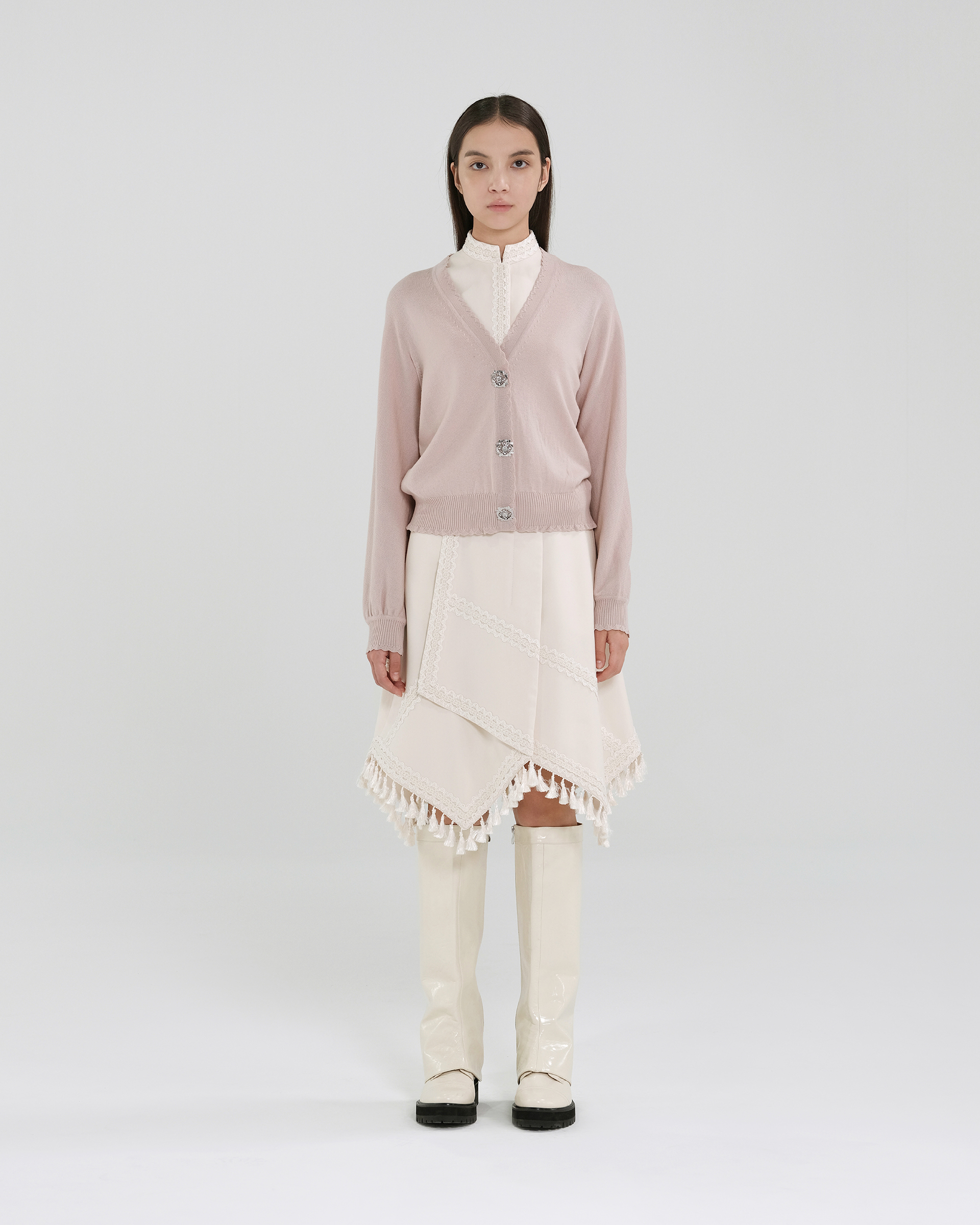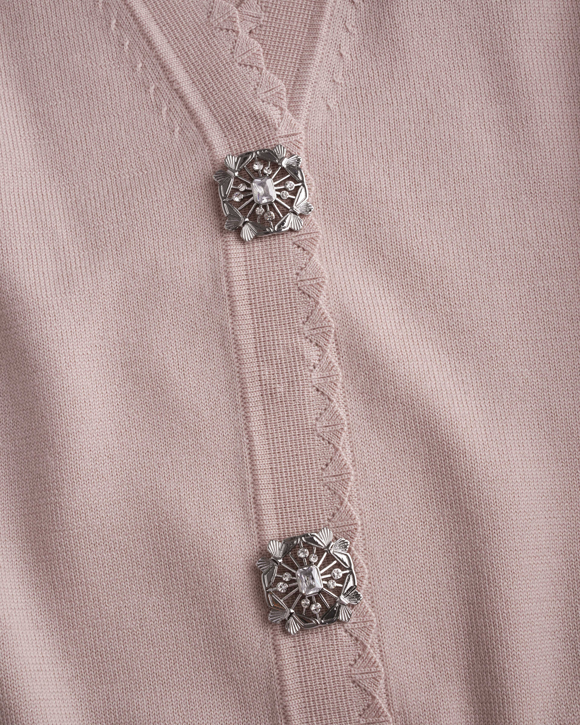 This piece is crafted from wool fabric, featuring a V-neckline paired with butterfly-wing buttons for a touch of playful creativity.