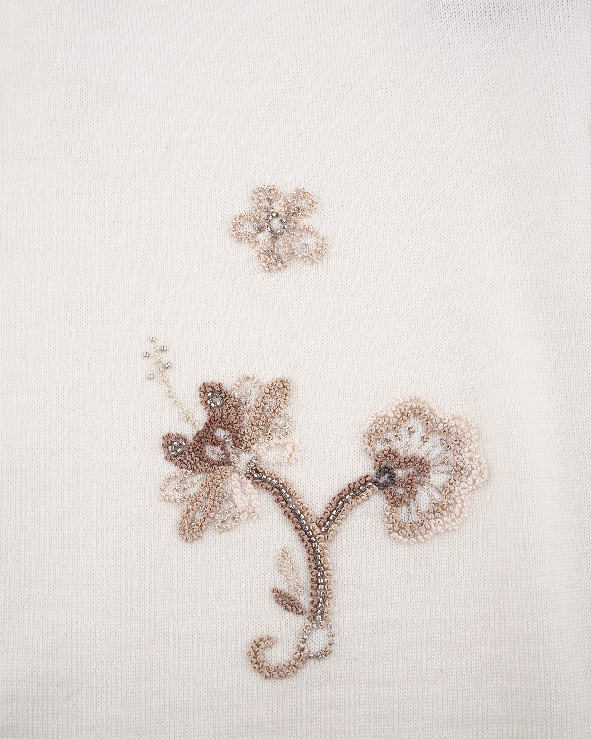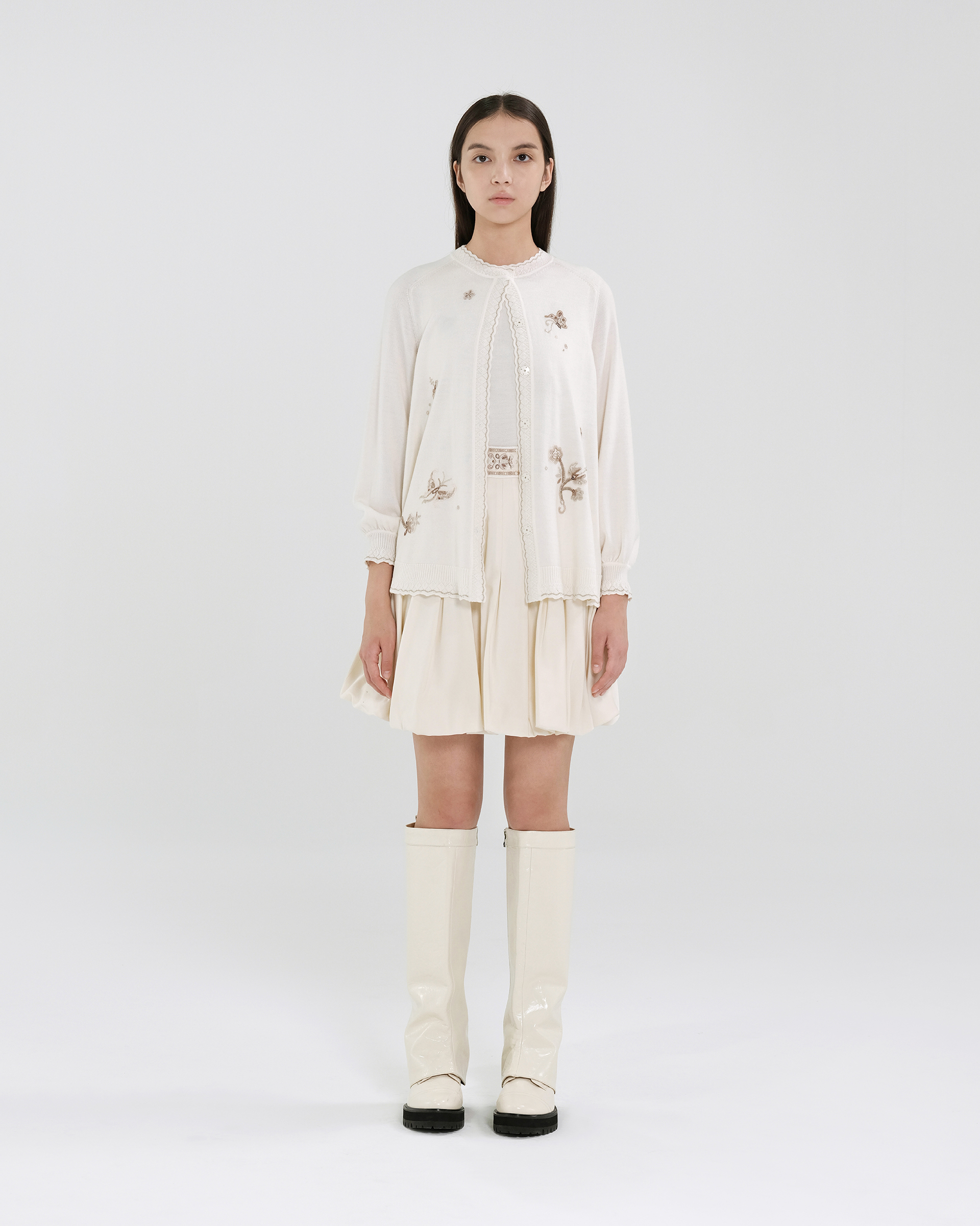 This piece is crafted from wool fabric, with delicate seed stitch embroidery outlining this season's butterfly motif. The tailored silhouette accentuates the beautiful weave.
