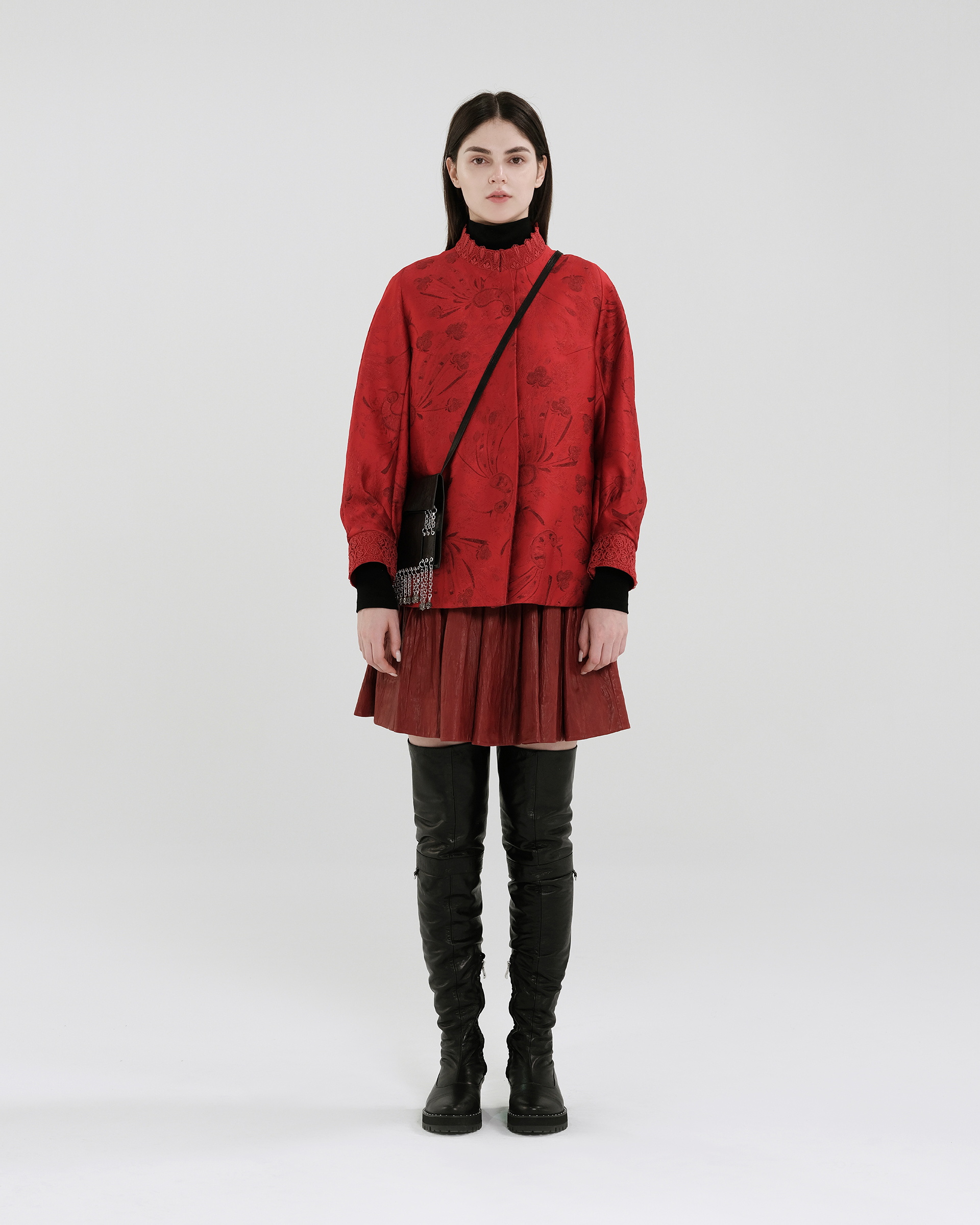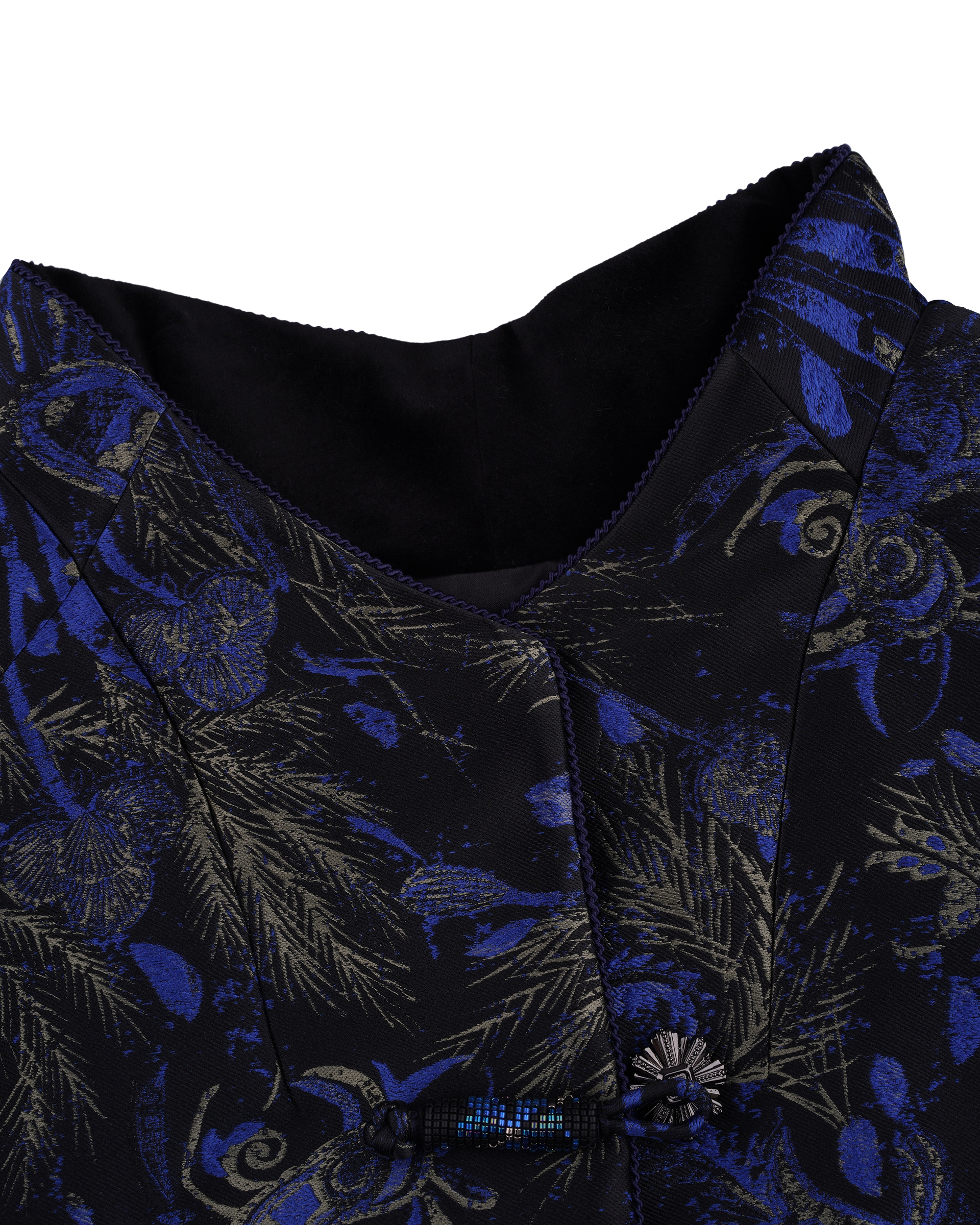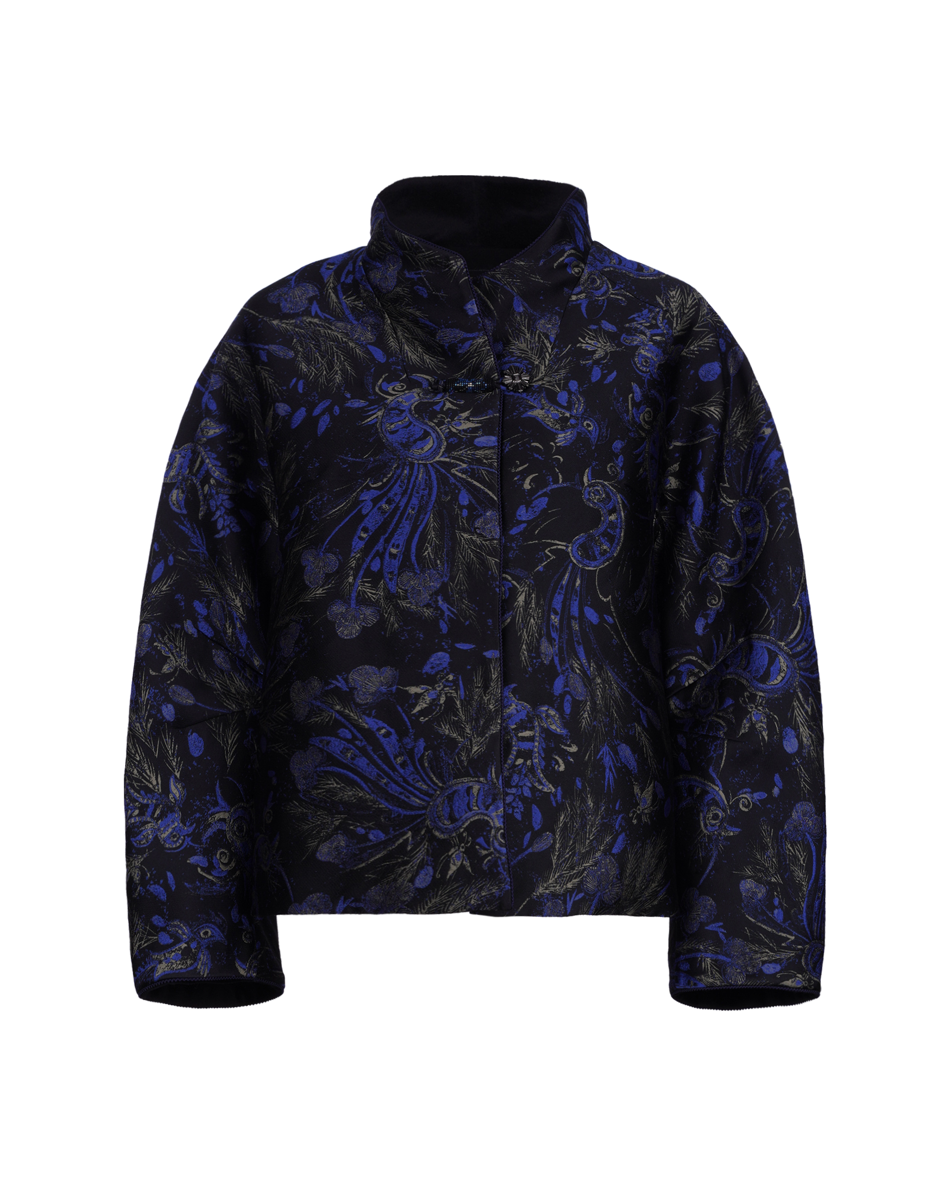 This season's opening print design draws inspiration from Miao totems and feather motifs, featuring jacquard fabric with a quilted lining for elegant warmth.