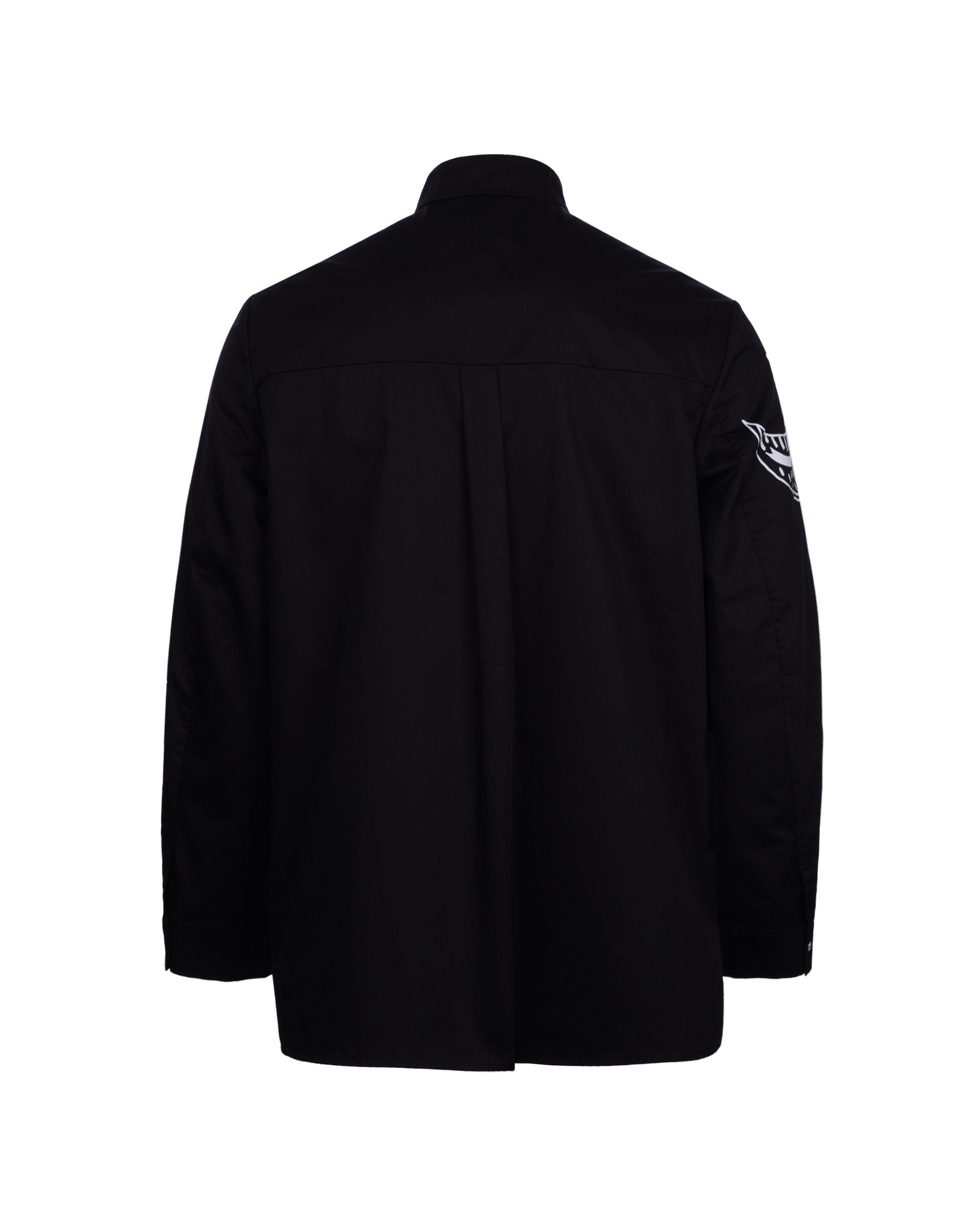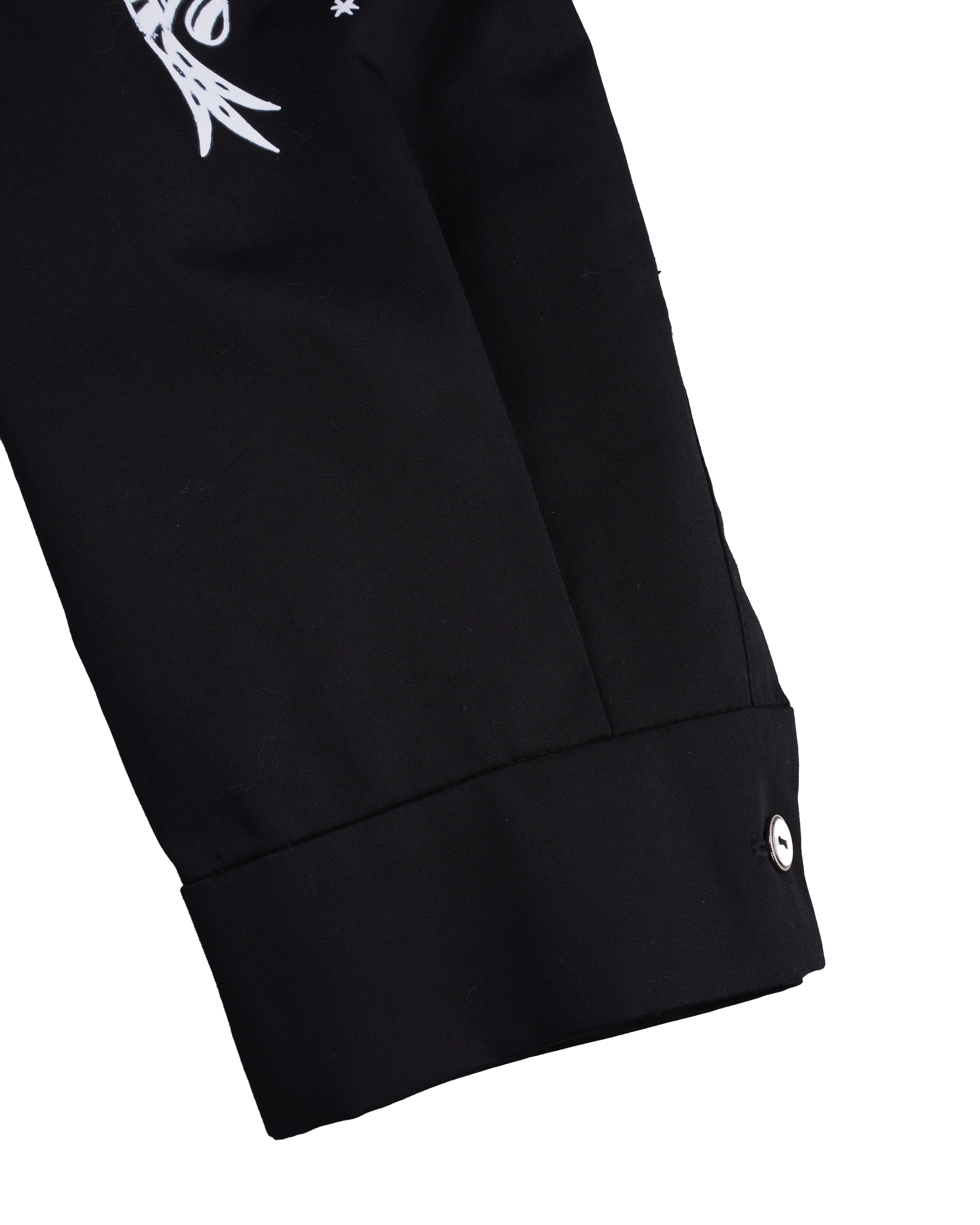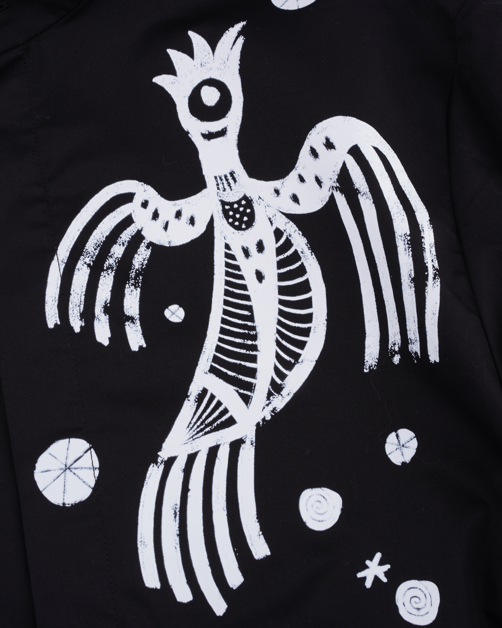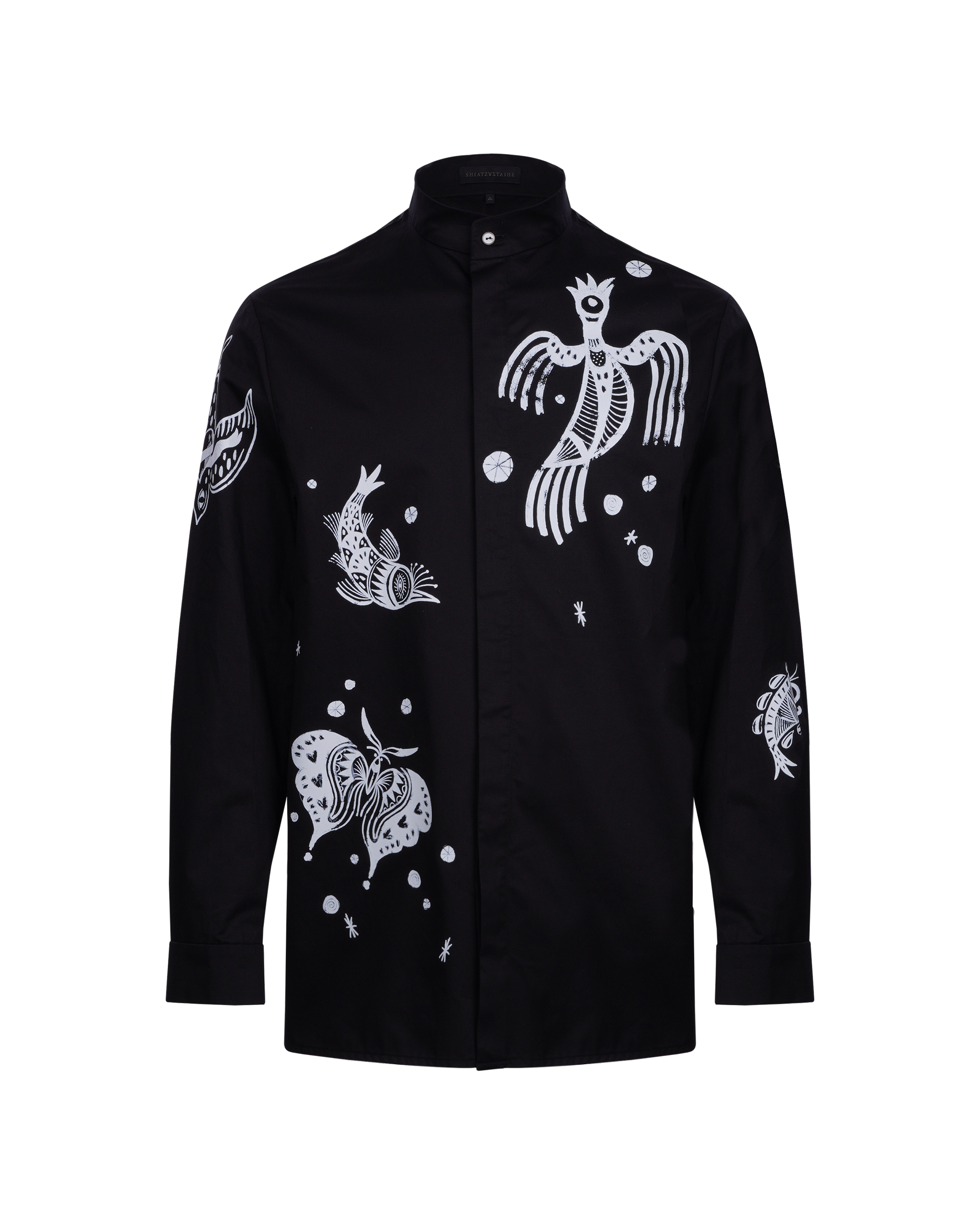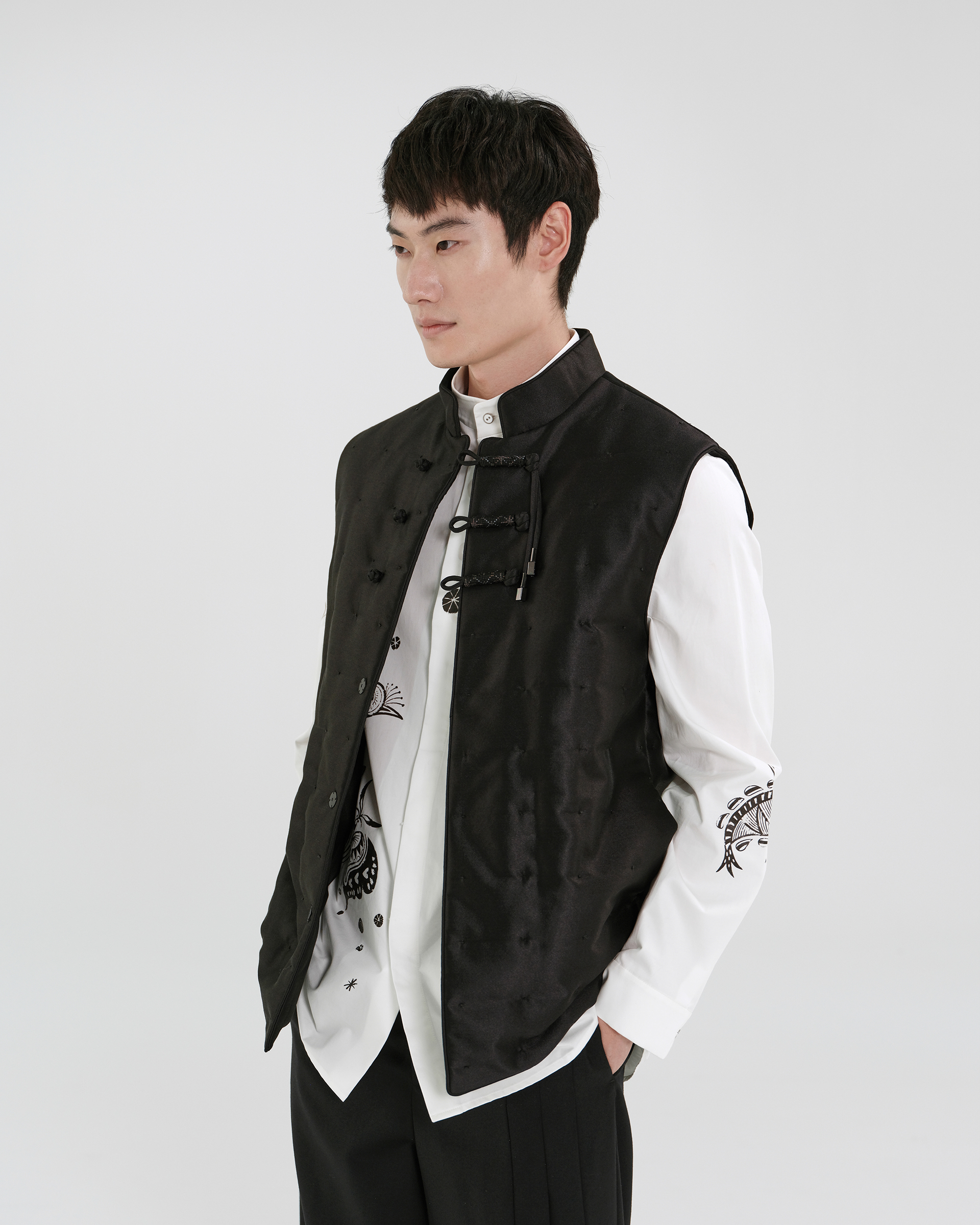 This piece is crafted from 100% cotton fabric, featuring a mandarin collar paired with Miao ethnic mythological totem prints, blending traditional and contemporary men's style.