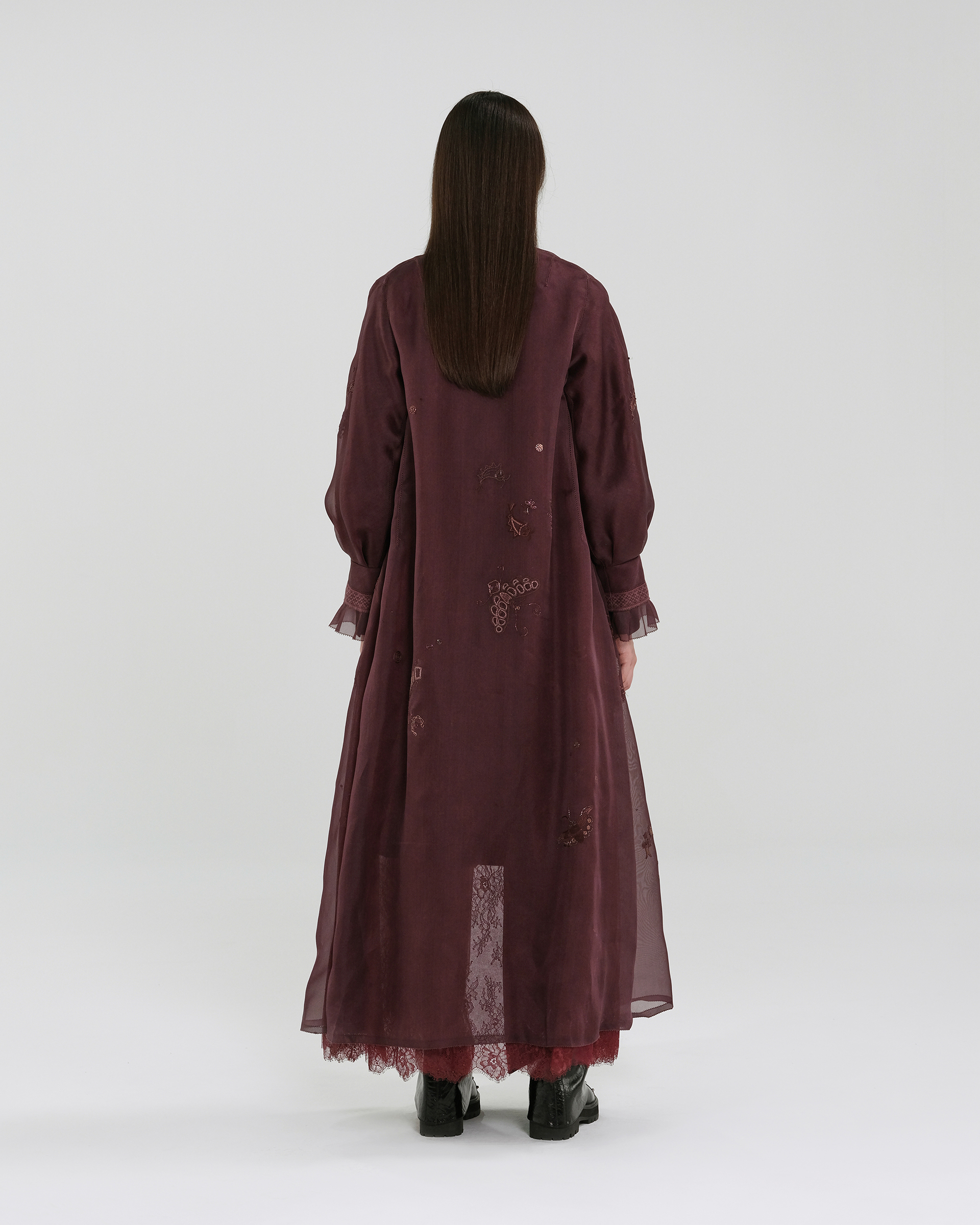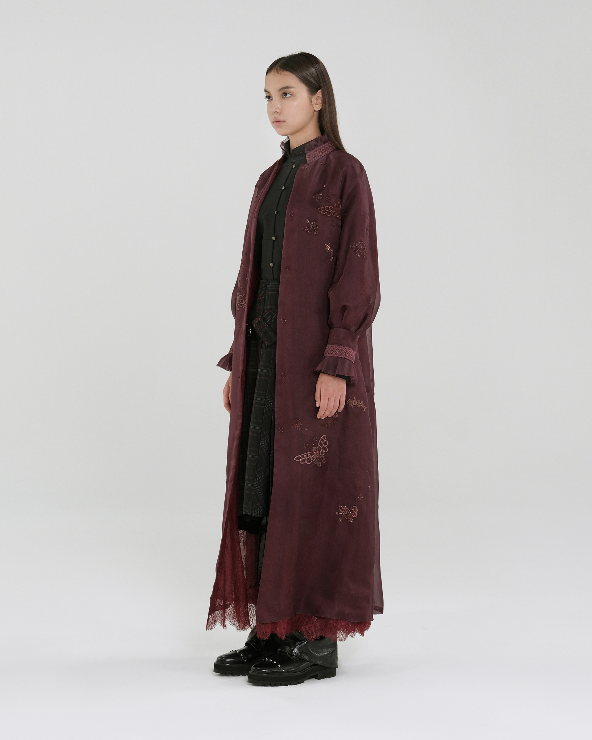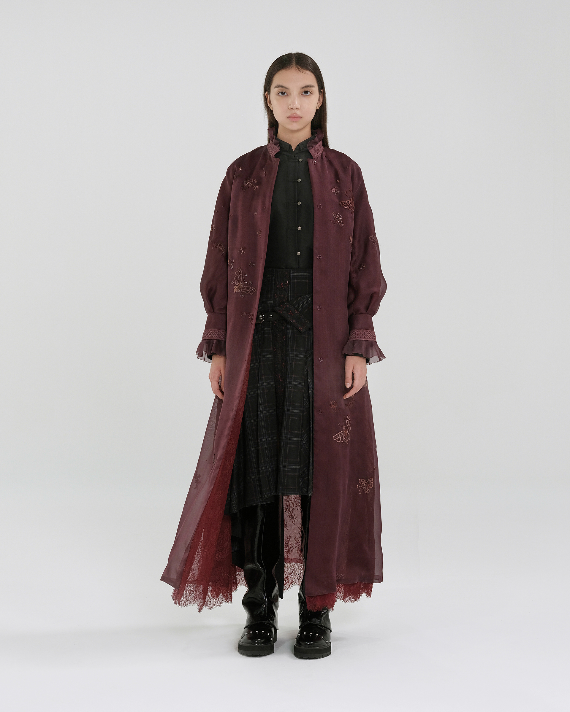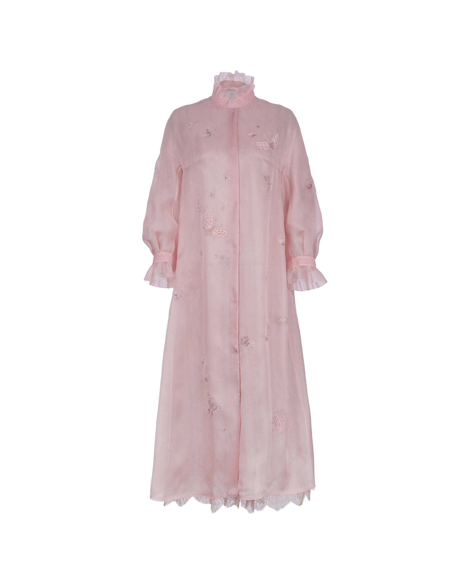 Shell: Mulberry silk 100% Lining:Mulberry silk 100% Washing Instructions: Recommend "Dryclean, Petroleum Solvent" To Preserve The Color And Style Made In ShanghaiSizes listed are French sizes Model is in size 38FR 38 - Length:122cm (measured from neckline), Bust Girth:105cm, Sleeve Length:67.5cmFR 40 - Length:123cm (measured from neckline), Bust Girth:110cm, Sleeve Length:68.5cmFR 42 - Length:124cm (measured from neckline), Bust Girth:115cm, Sleeve Length:69.5cmFR 44 - Length:124.5cm (measured from neckline), Bust Girth:120cm, Sleeve Length:70cm
