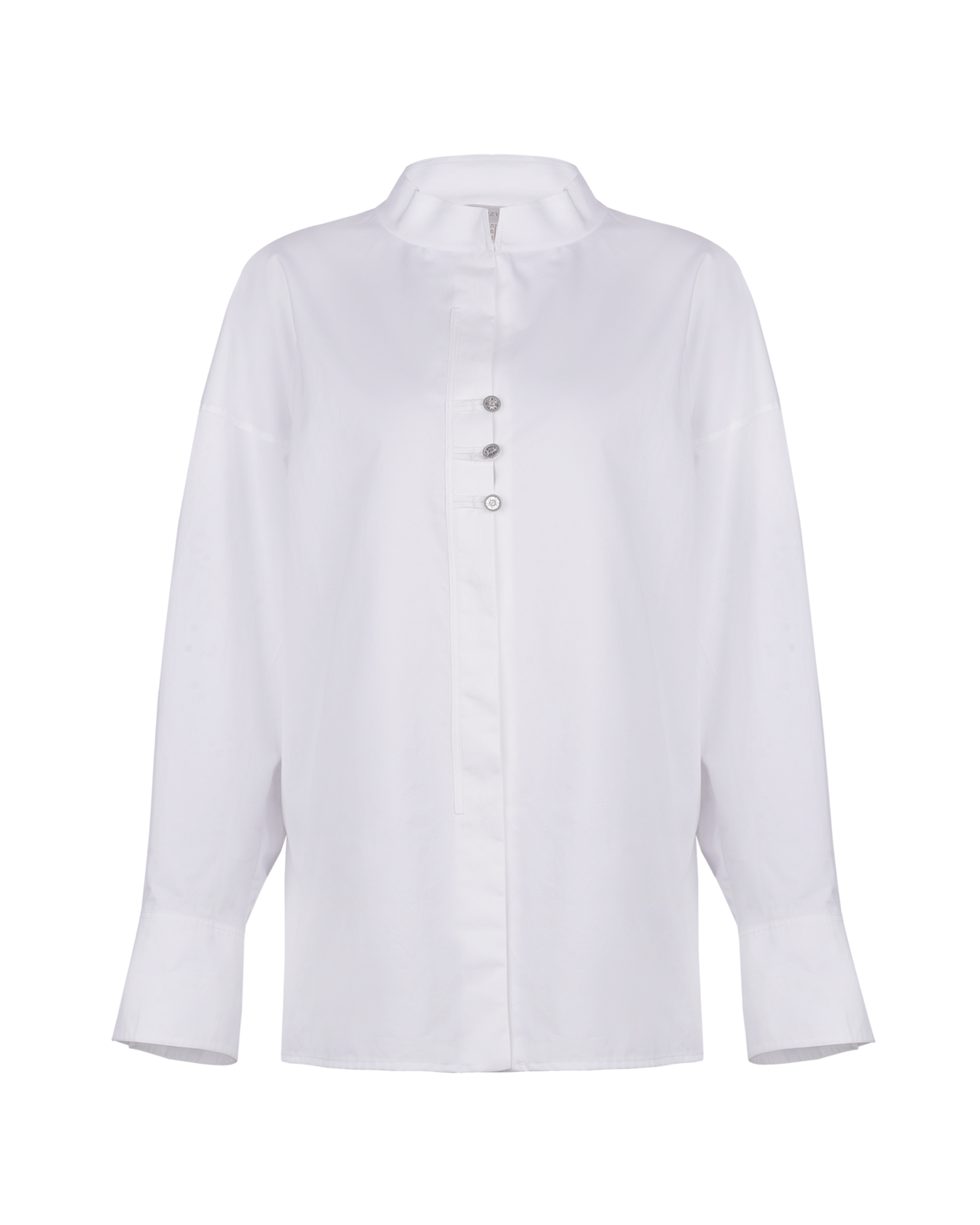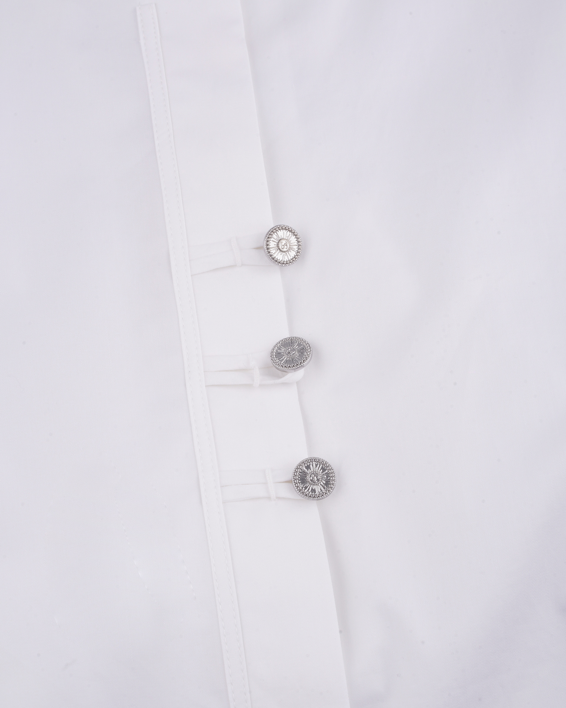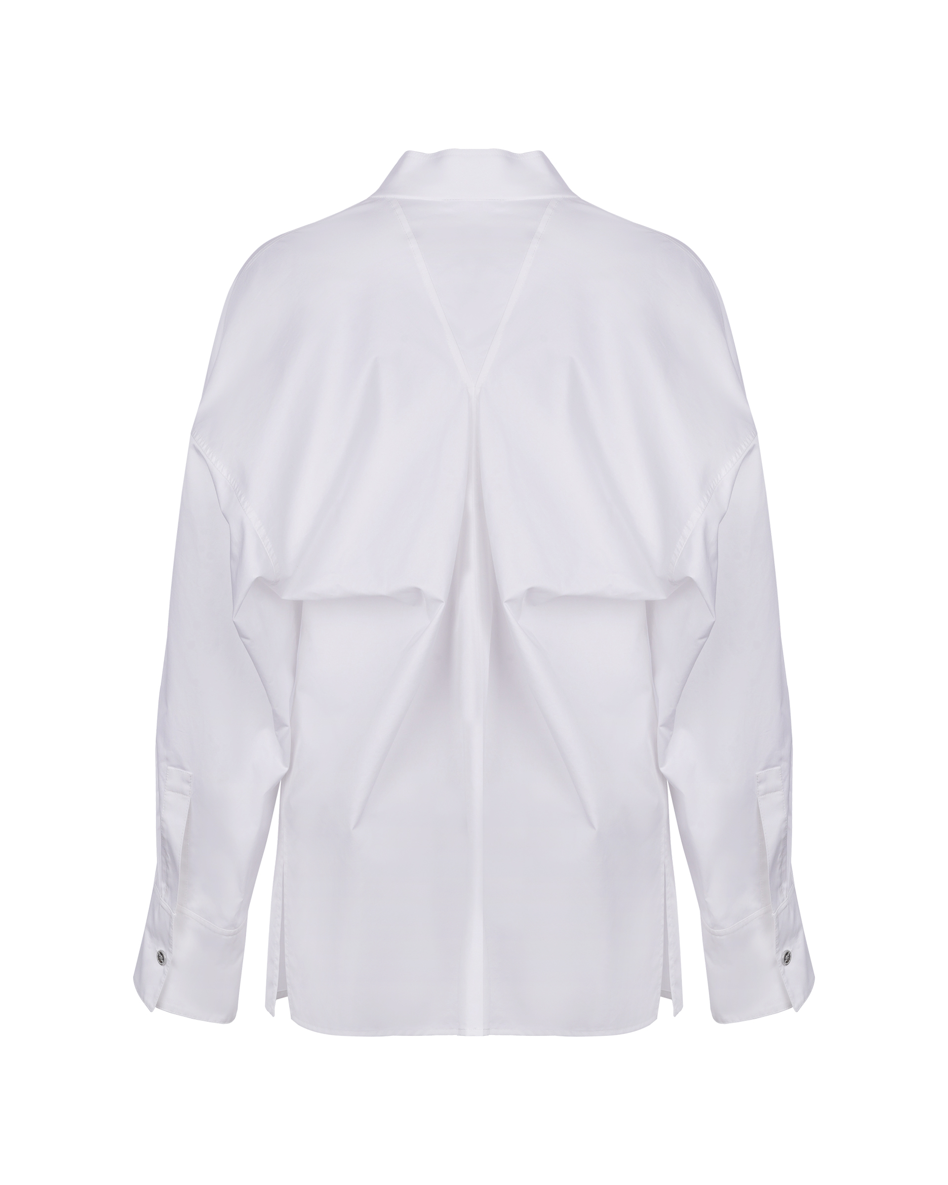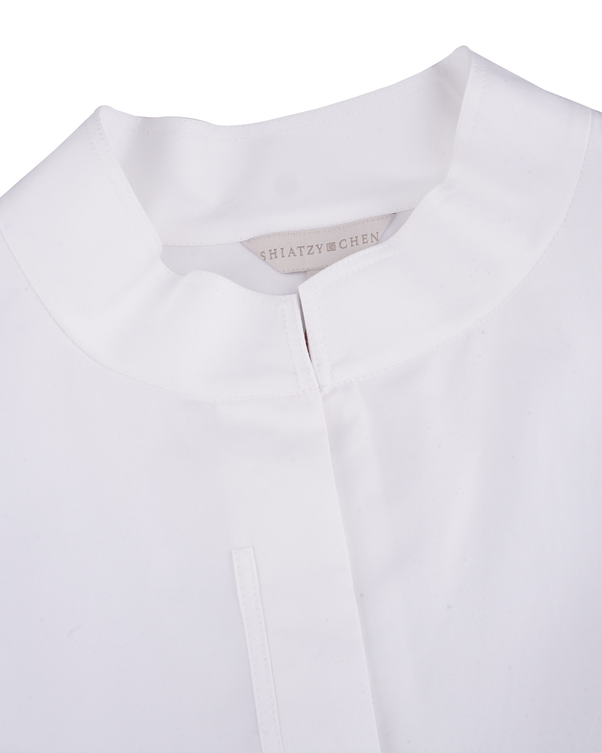 This piece is crafted from 100% cotton fabric, featuring a back design with overlapping pleats that mimic butterfly wings. The simple stand-up collar design preserves an artistic and elegant aesthetic.