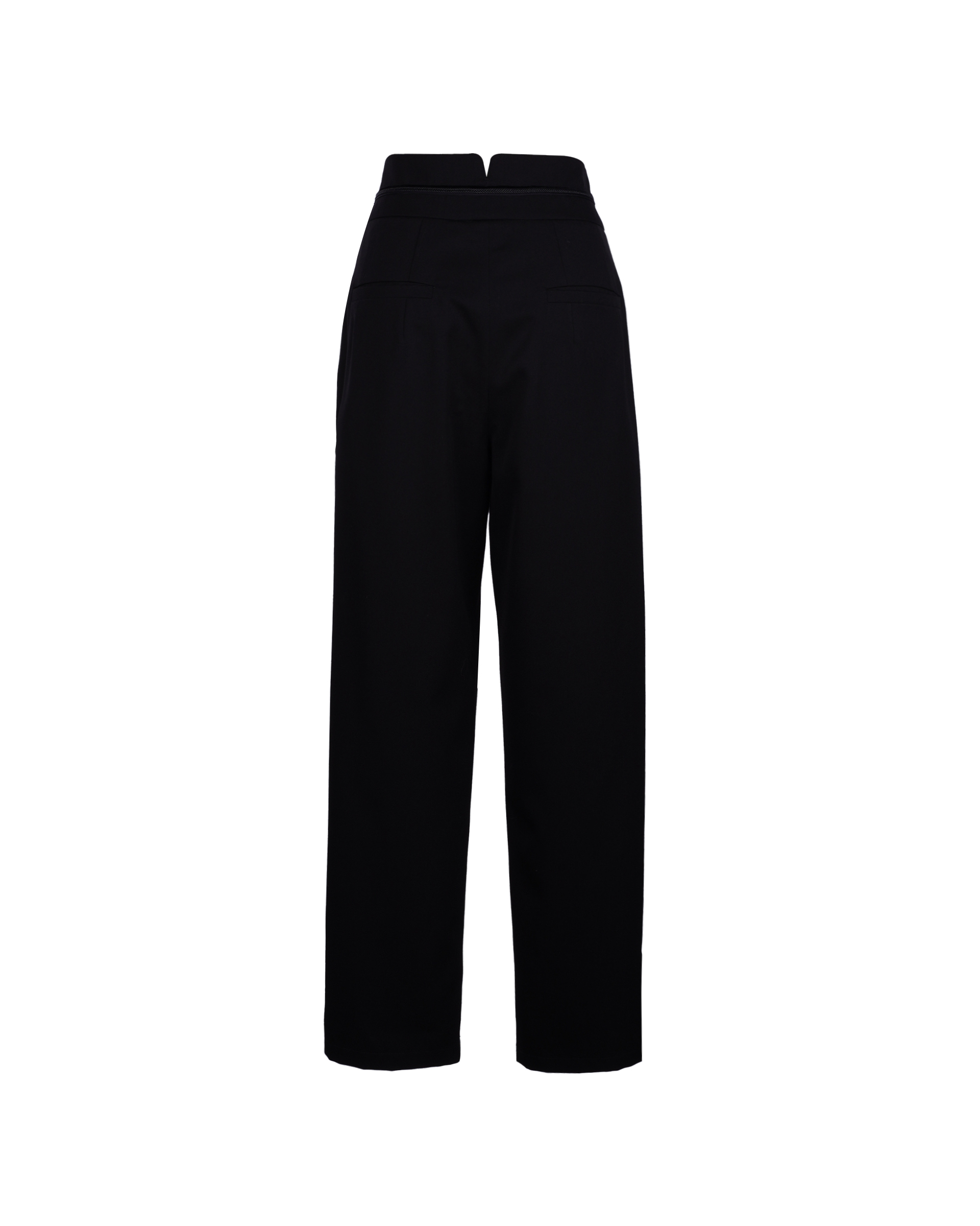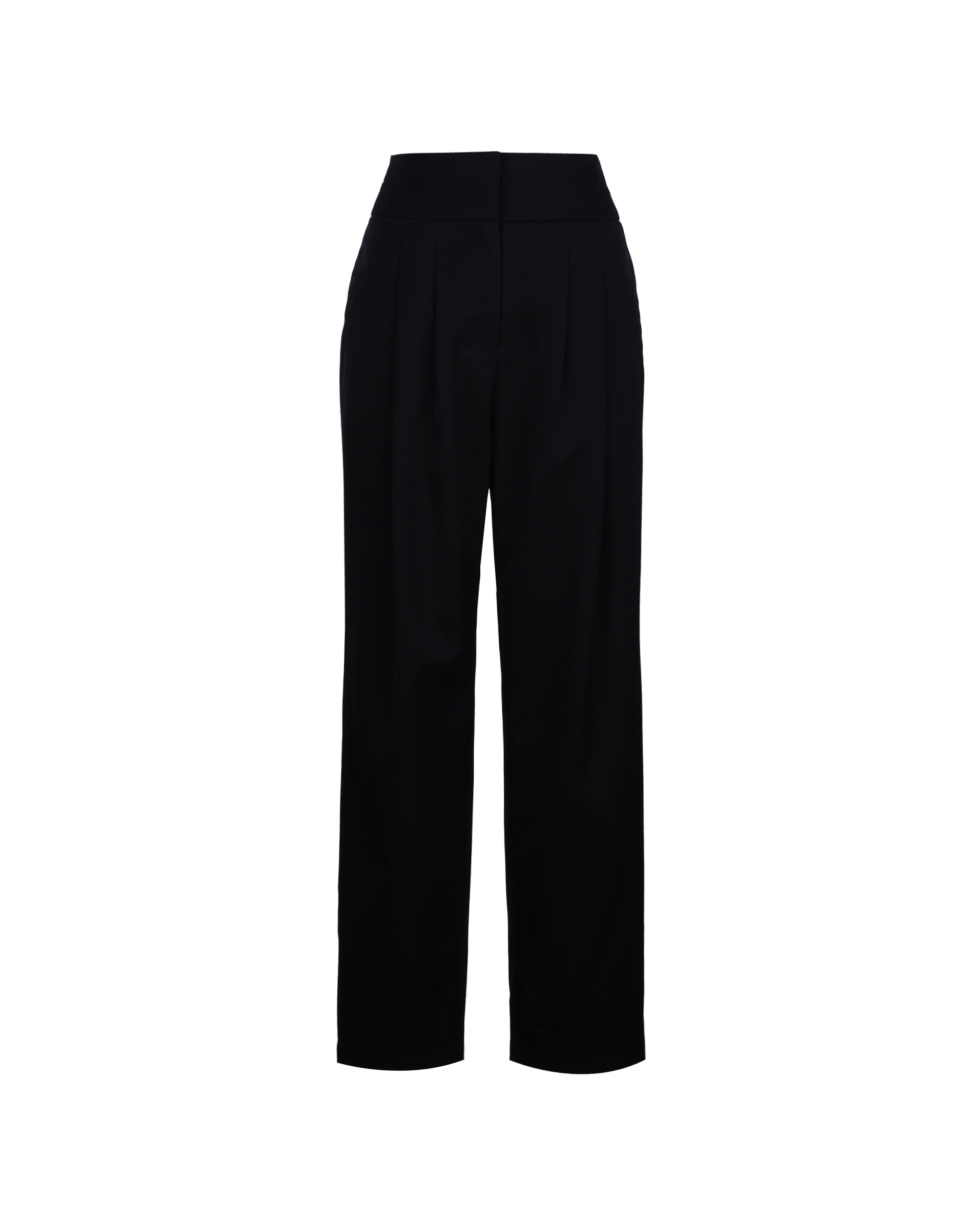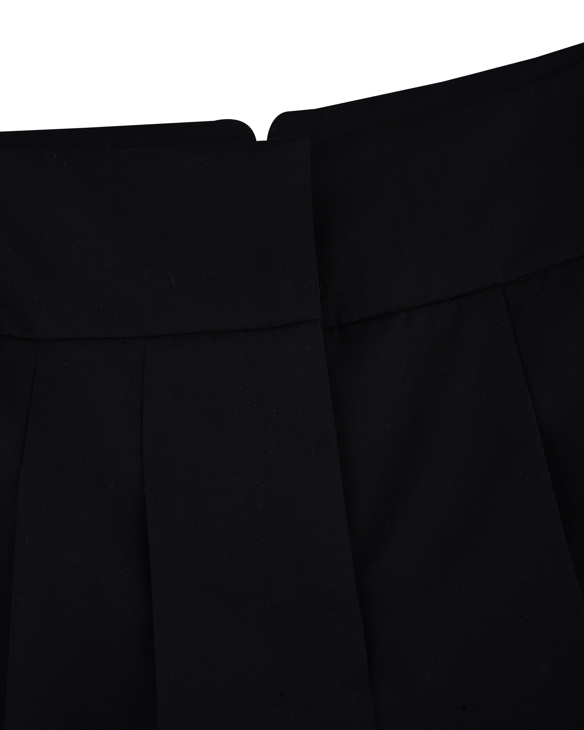 Crafted from 100% wool fabric, this piece features a drapey yet substantial texture. Its wide waistband visually elongates the silhouette, making it a versatile staple for both casual outings and workwear.