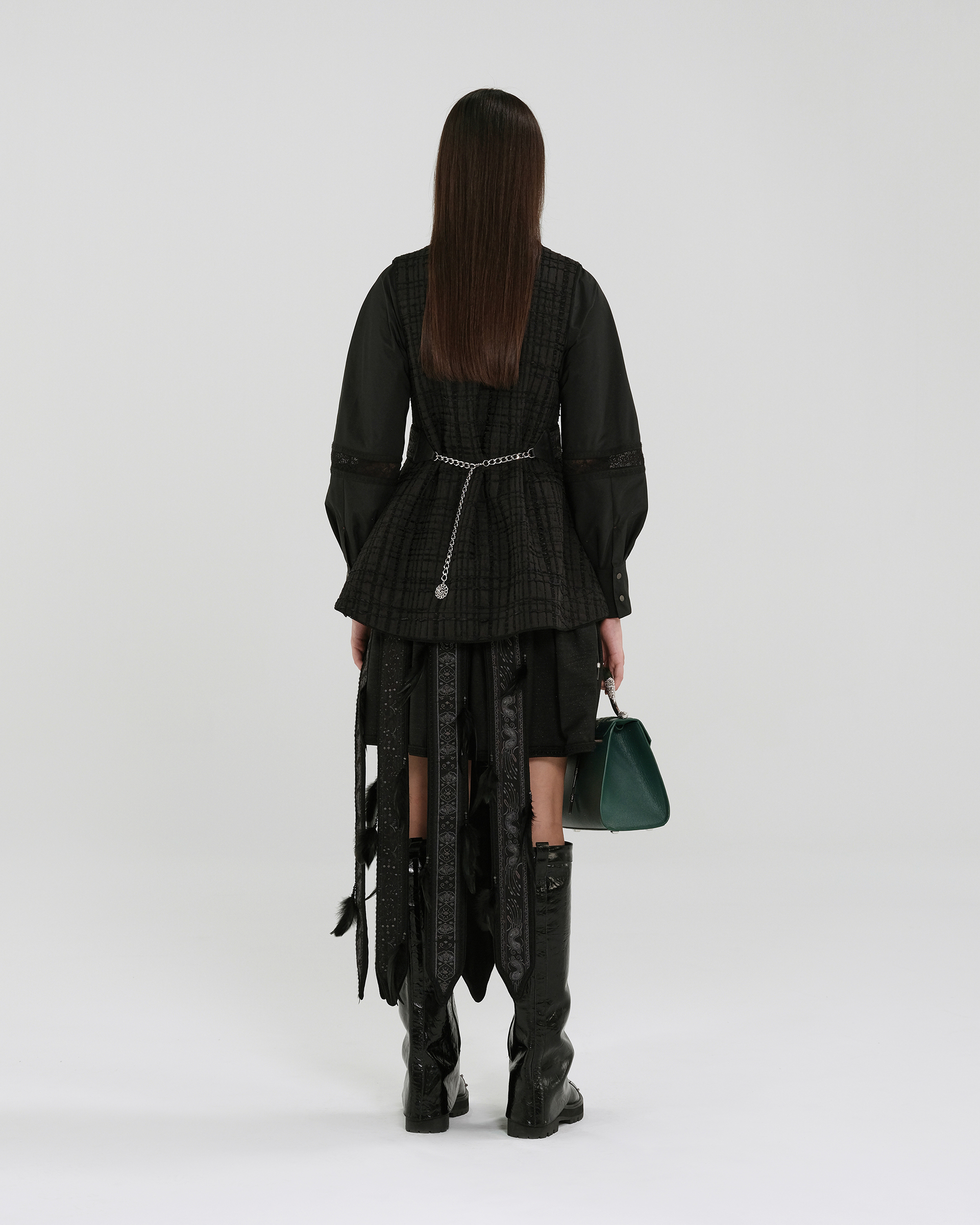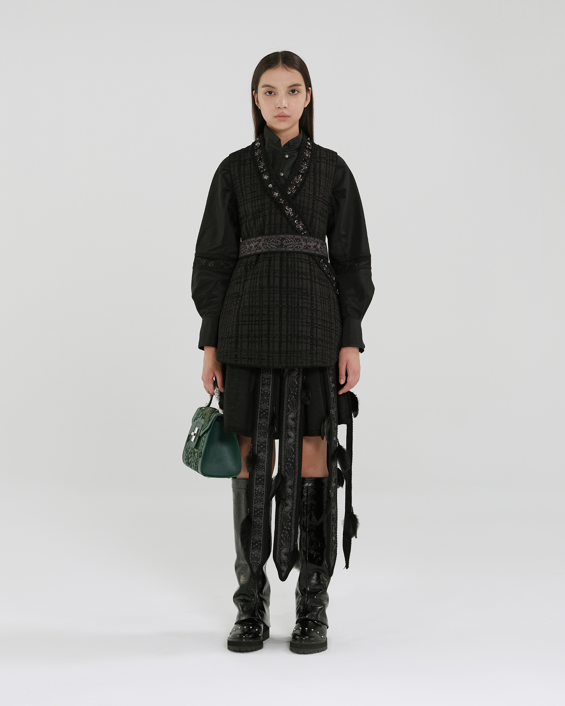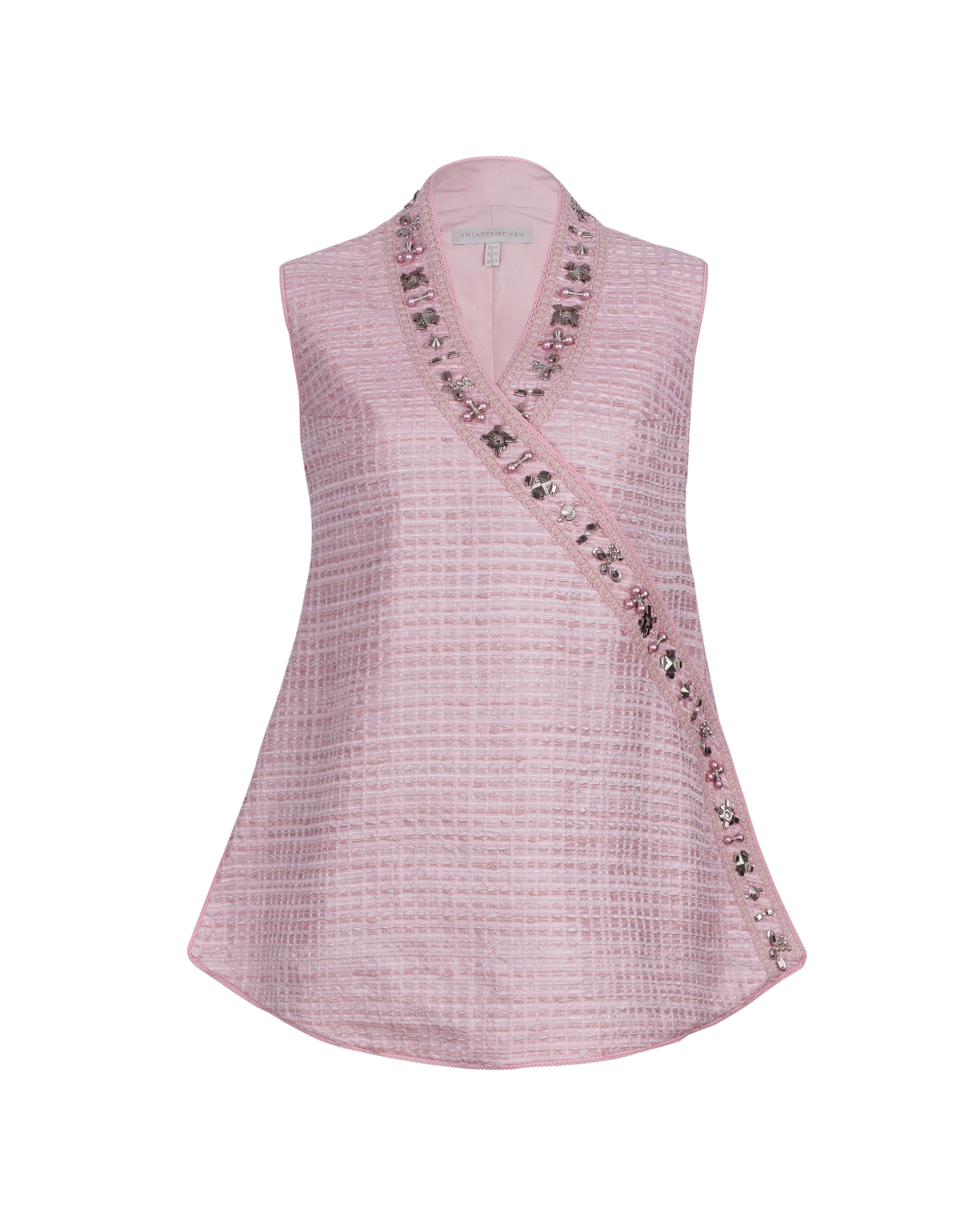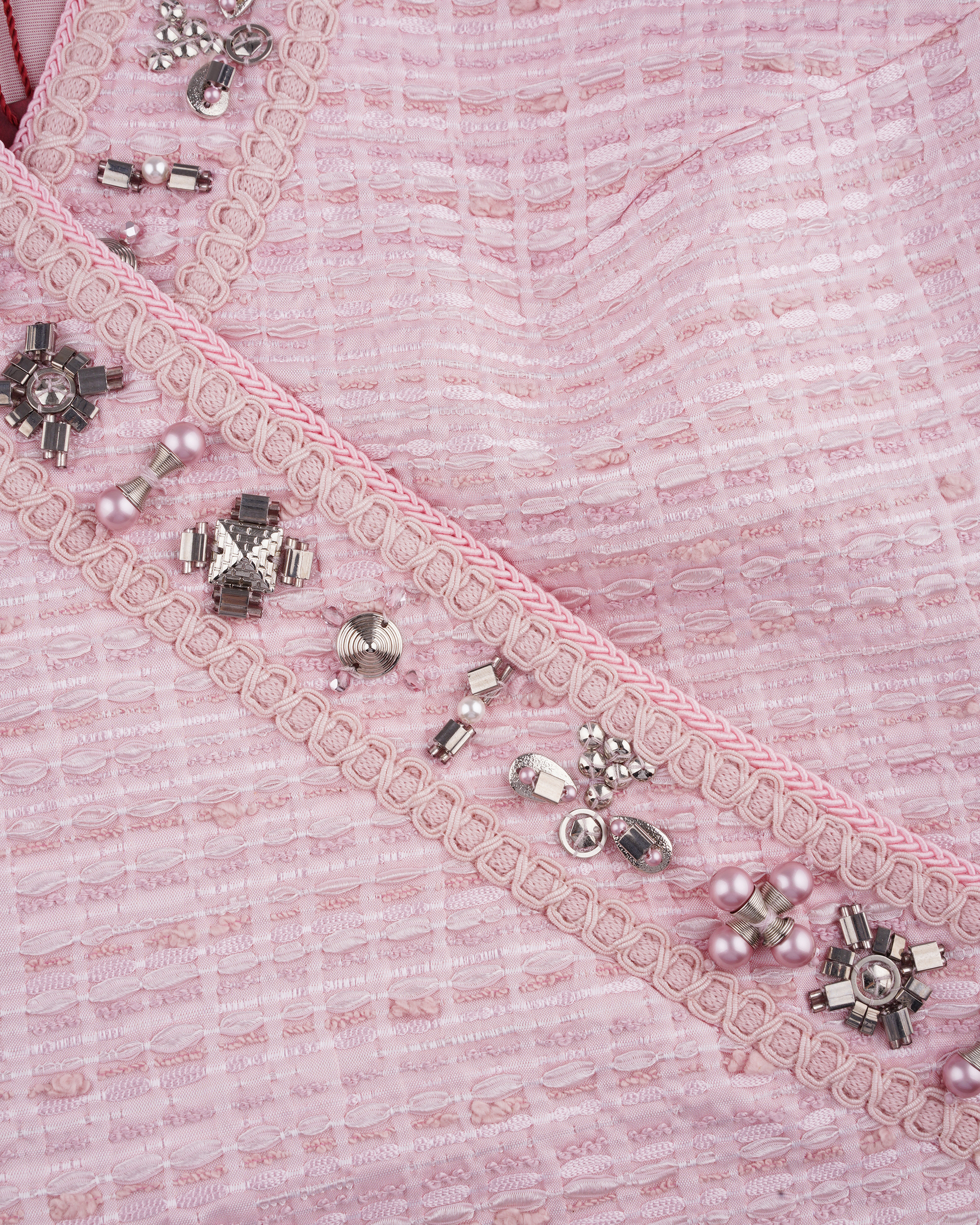 Crafted from a woven-textured fabric, this piece features a cross-over front adorned with tone-on-tone beads and studs, making it a uniquely ethnic-inspired accessory.
