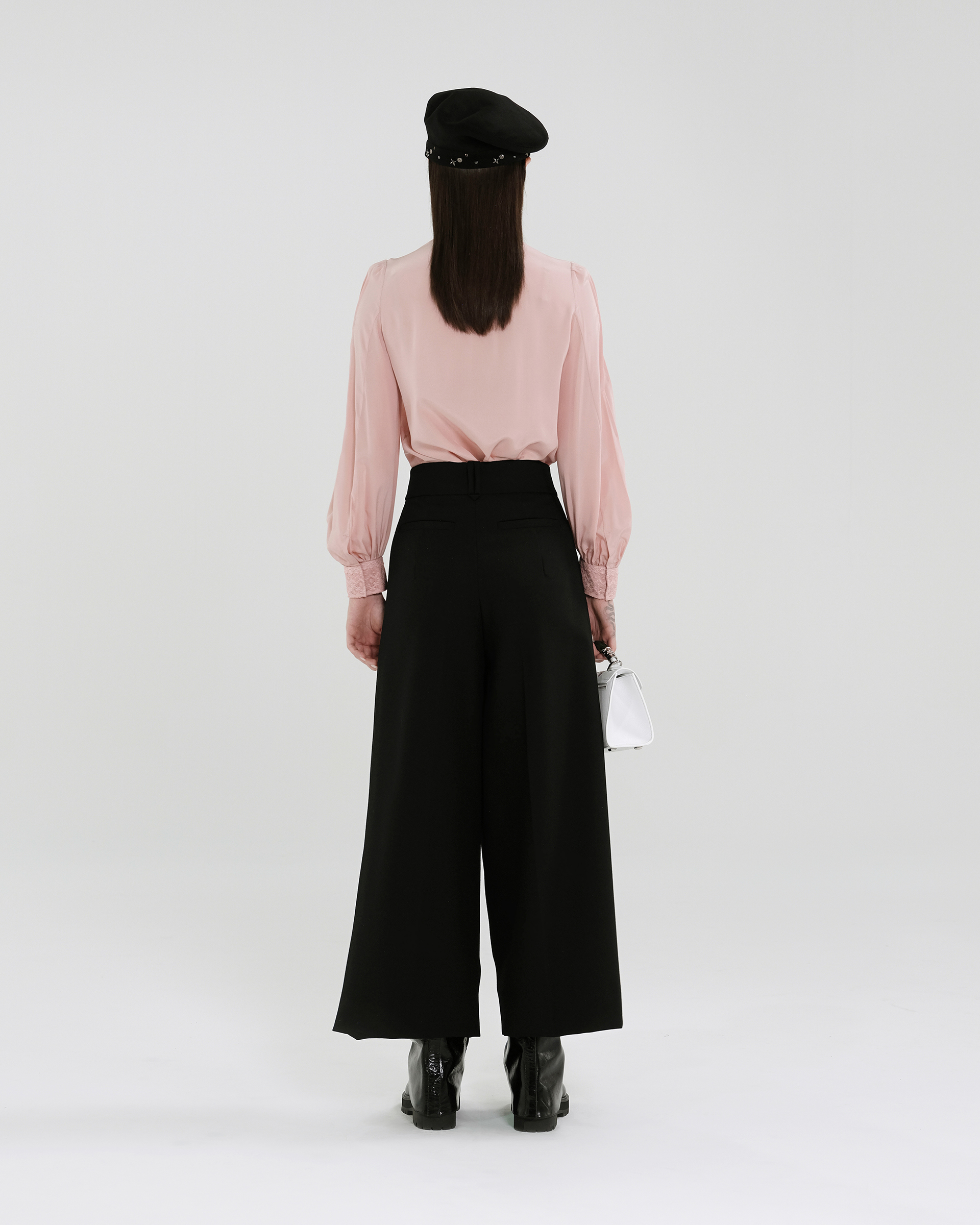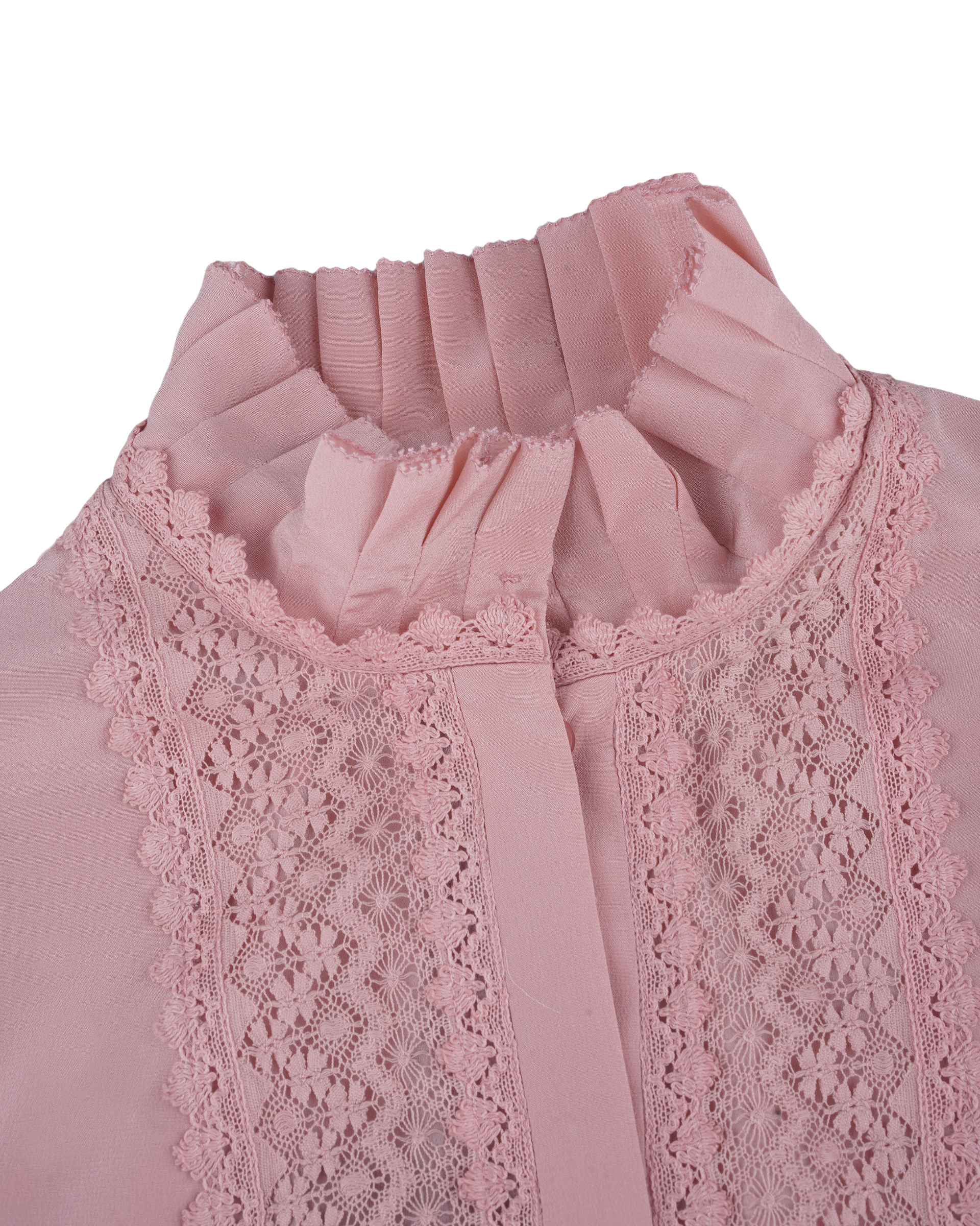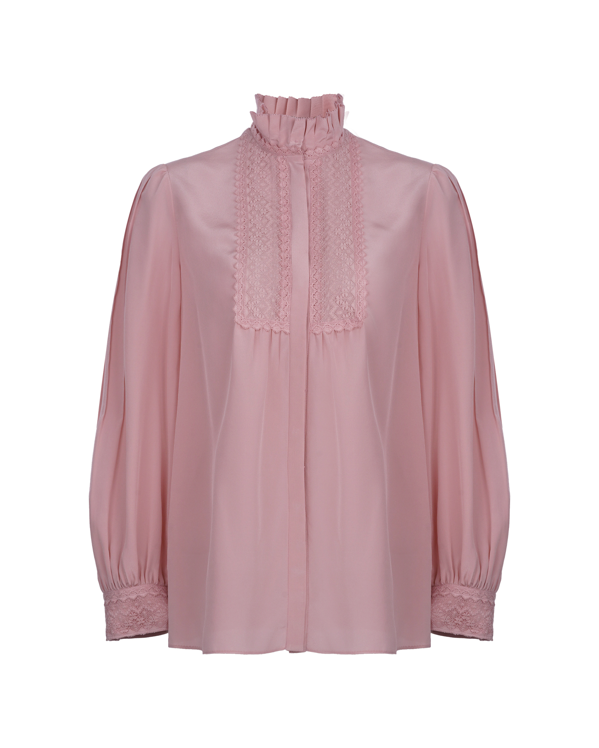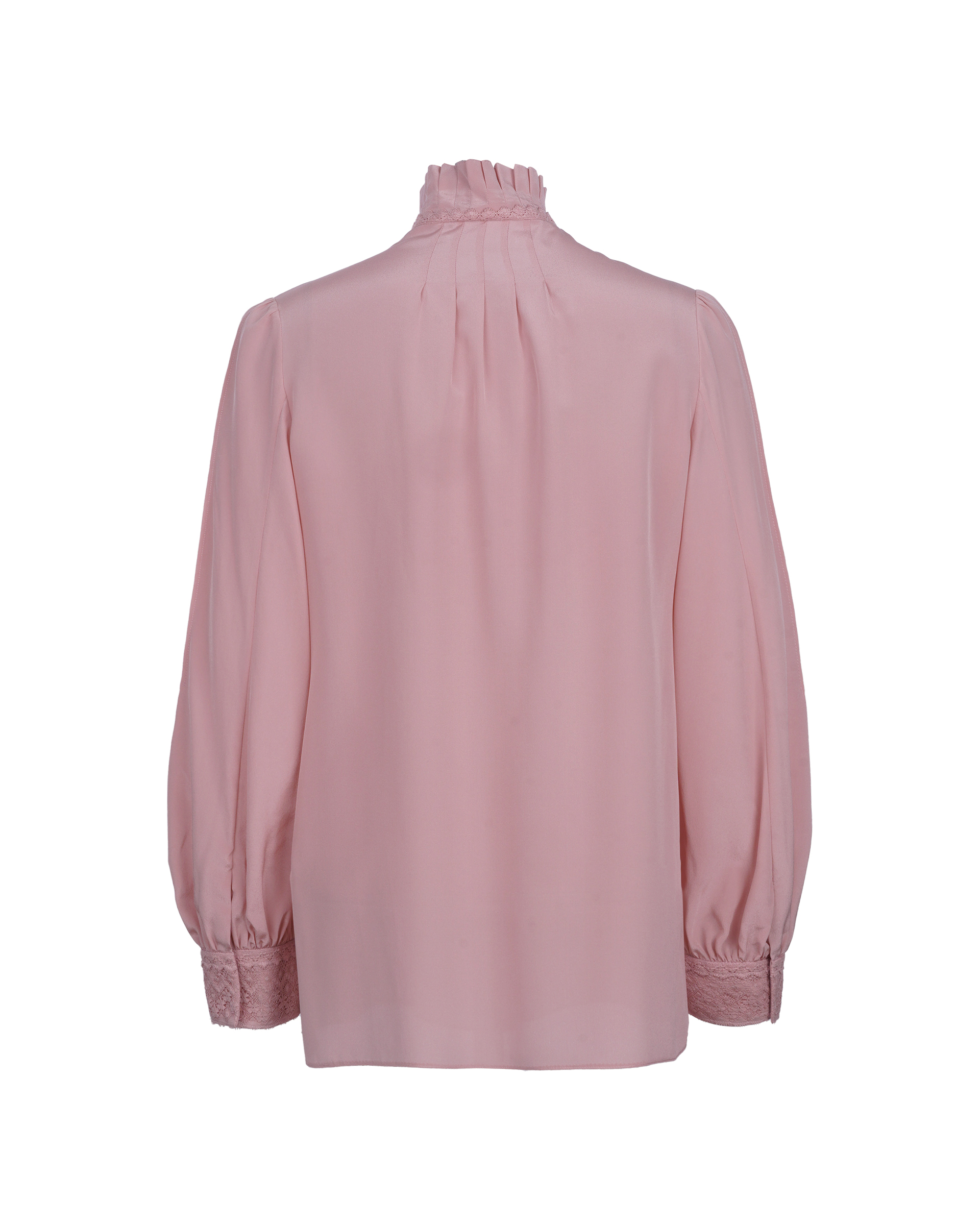 This piece is crafted from 100% mulberry silk fabric, featuring a pleated stand collar that complements the lace detailing at the chest. It pairs effortlessly with various bottoms to create a relaxed, everyday look.