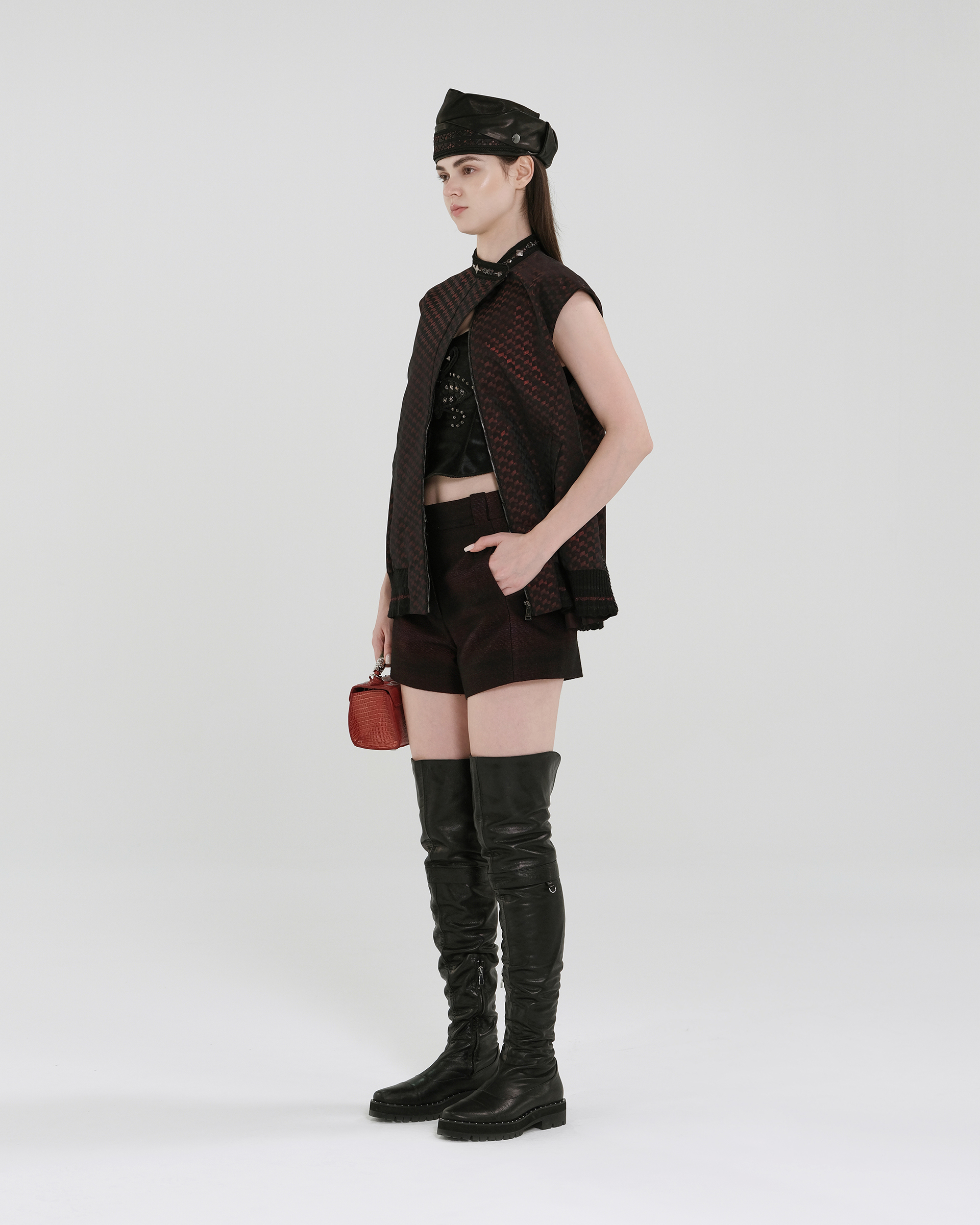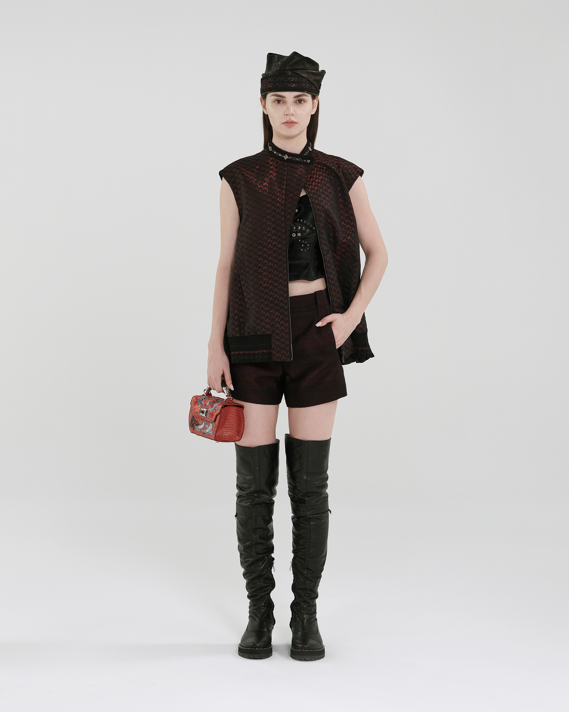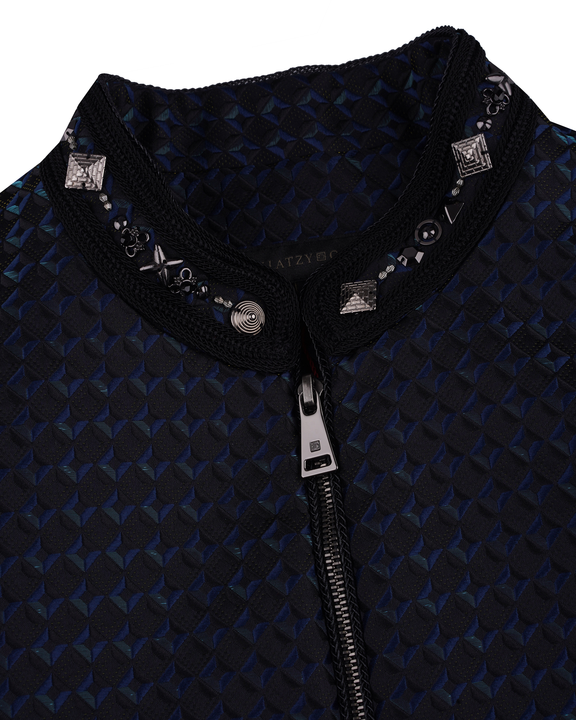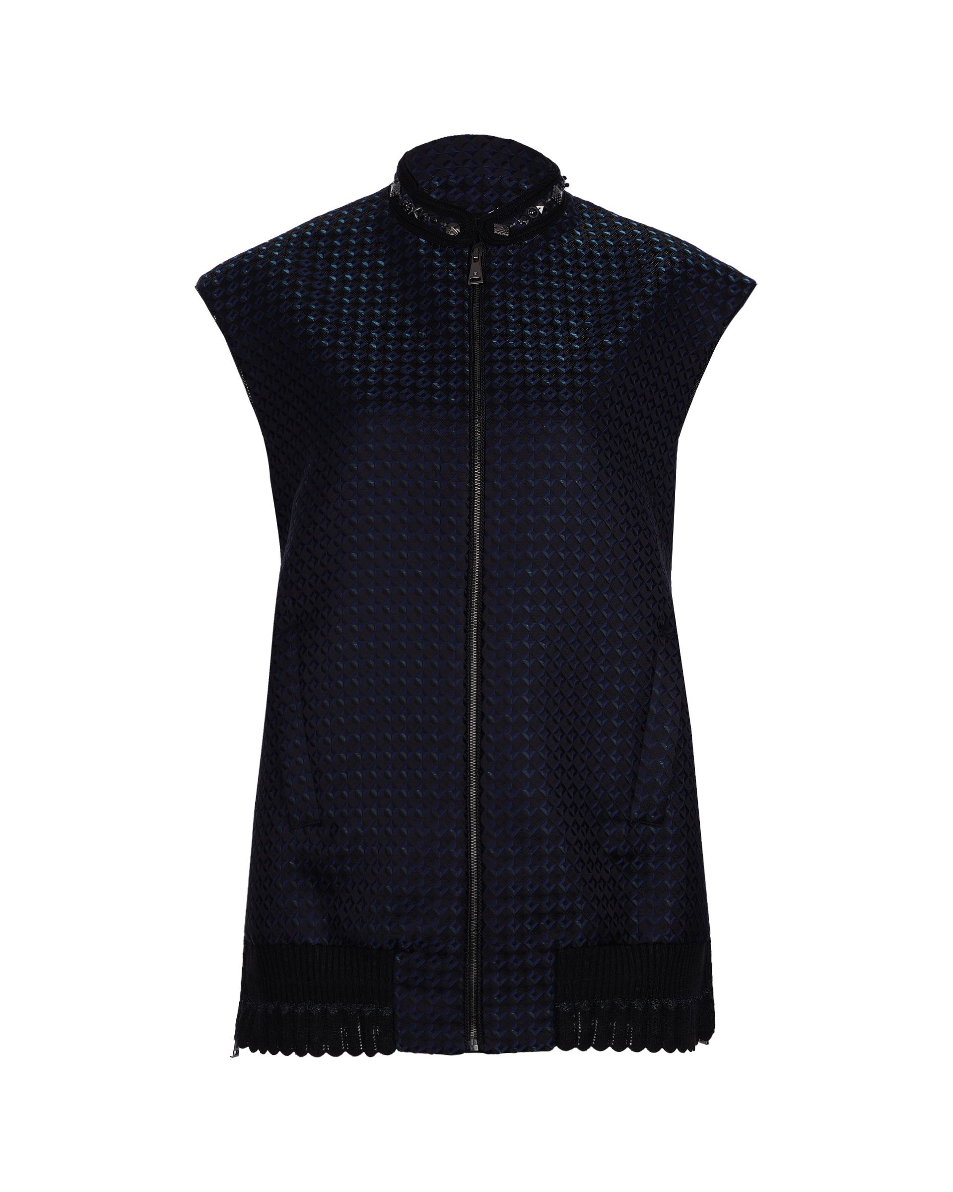 This piece is crafted from geometric jacquard fabric, featuring studded detailing at the neckline. The cap sleeves combine with an elasticated hem for a flattering, non-bulky silhouette.